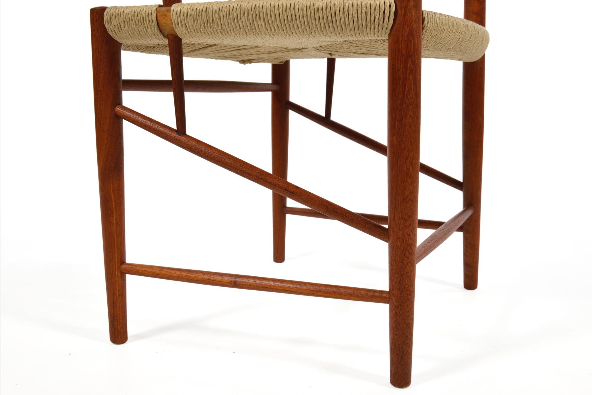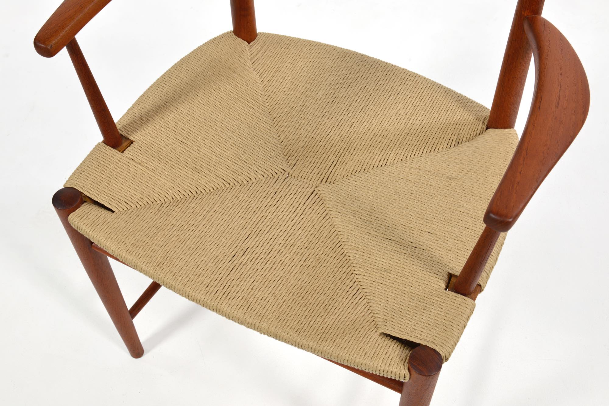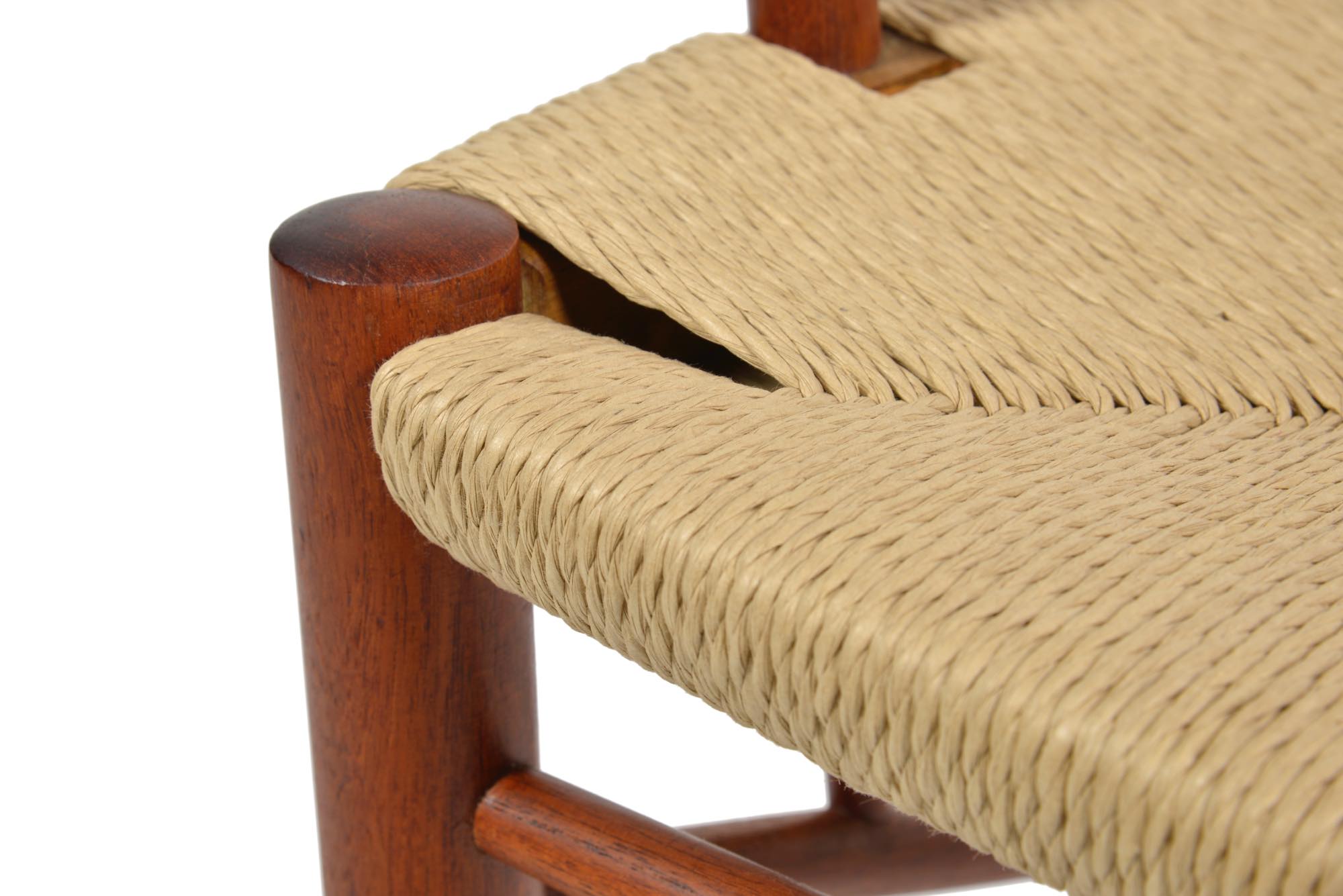 ピーター・ヴィッツとオルラ・ミュルゴー・ニールセンによってデザインされたアームチェアです。垂直に伸びる構造と、有機的に削り出されたアームが魅力です。チーク材の中でも最上とされるタイ国原産のものが使われているようです。座面のペーパーコードは新たに張替えました。