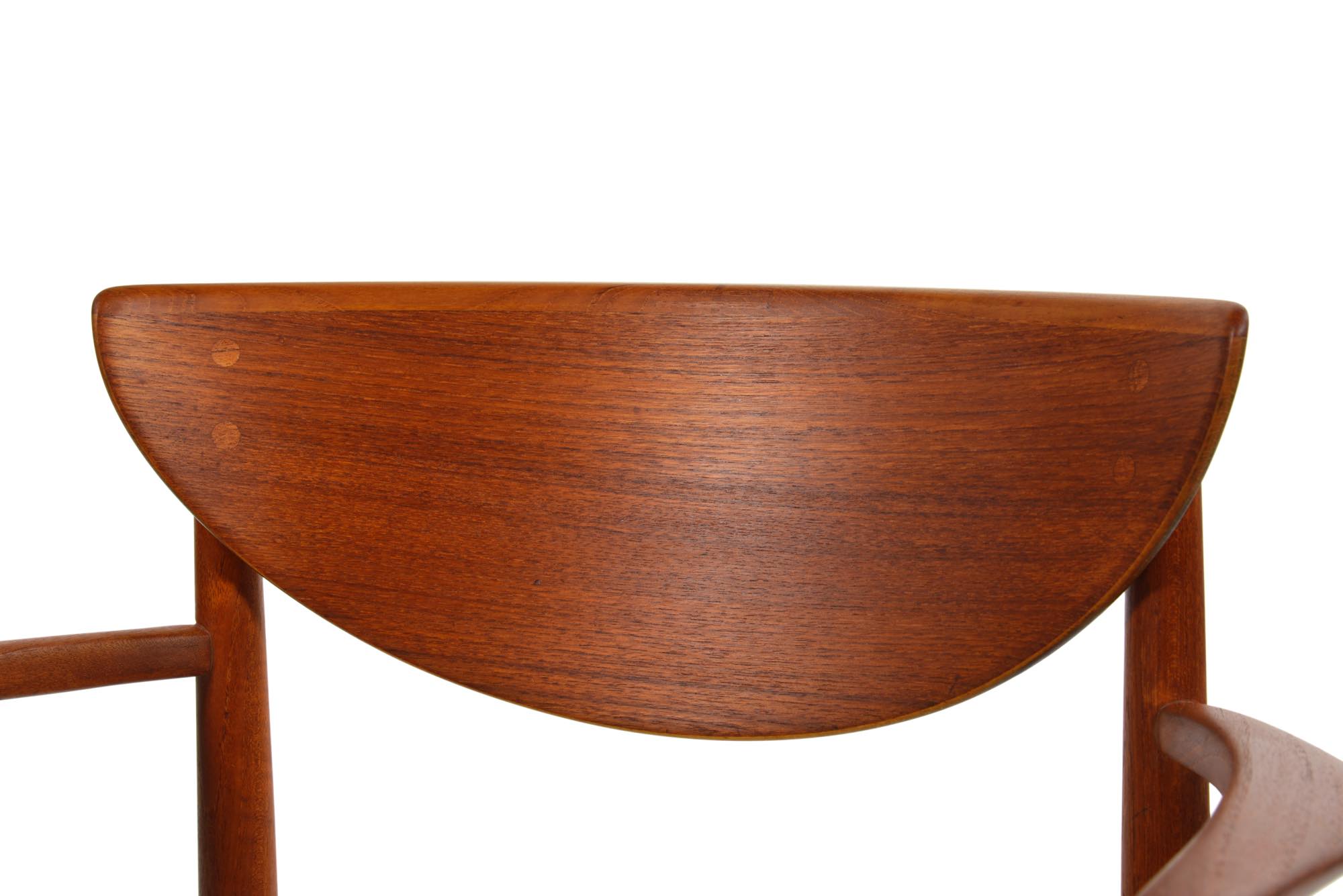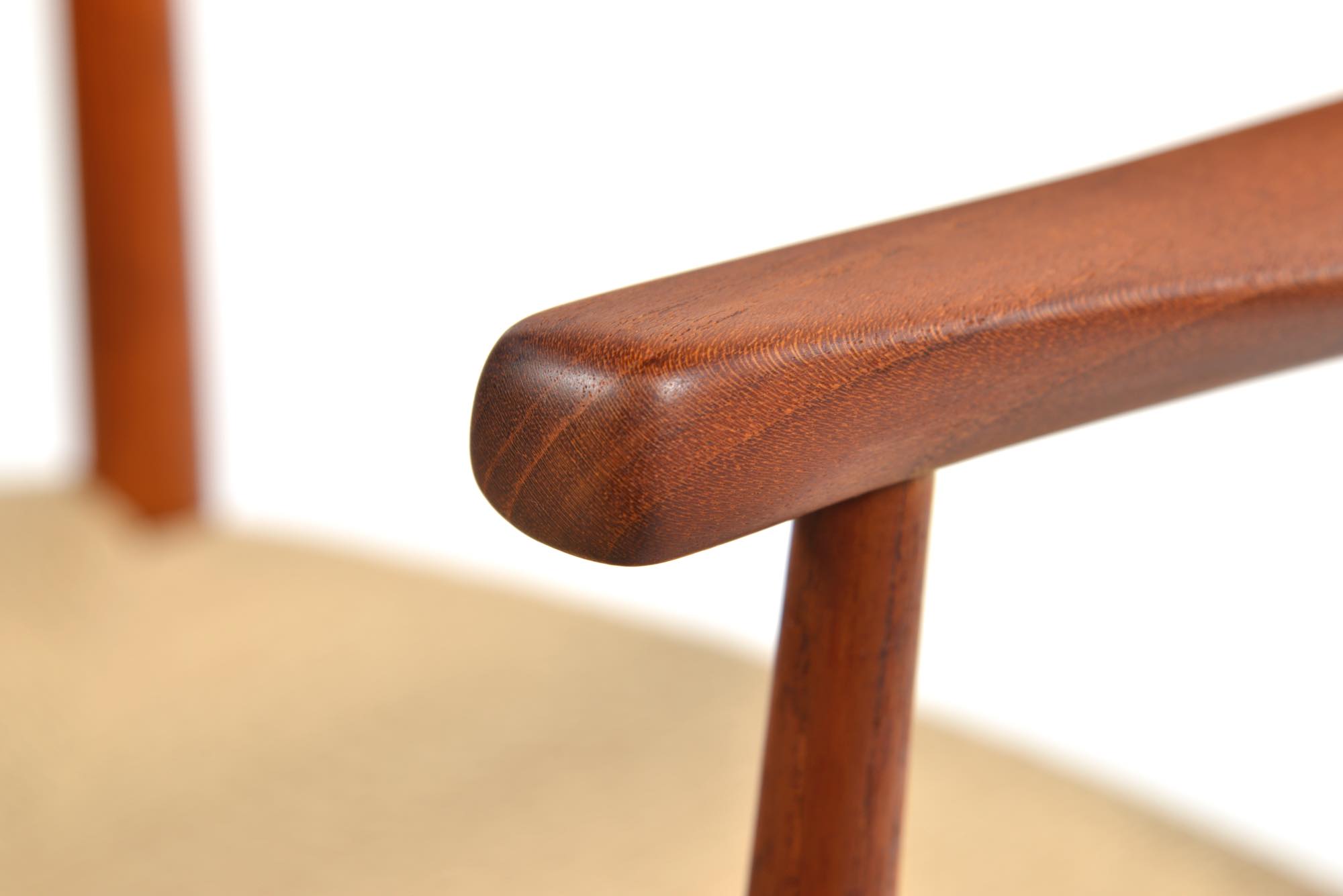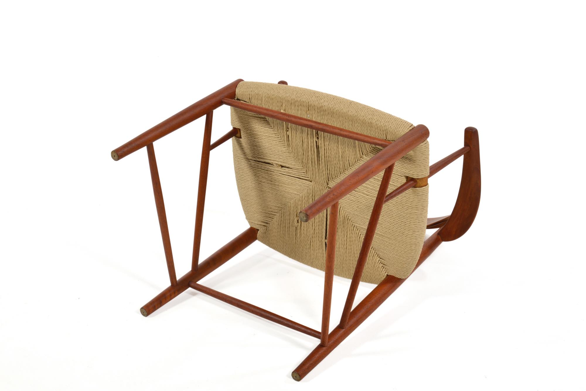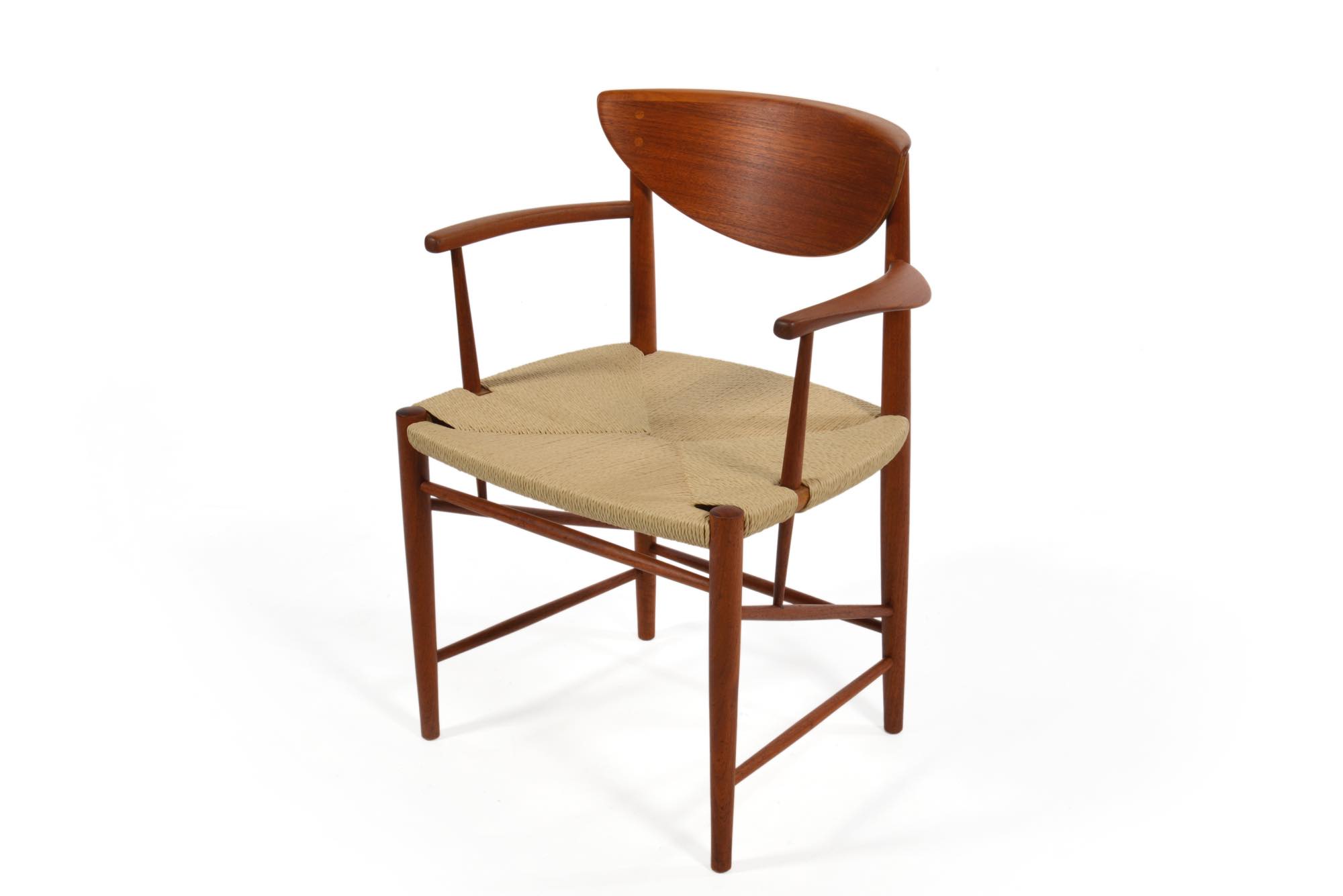 ピーター・ヴィッツとオルラ・ミュルゴー・ニールセンによってデザインされたアームチェアです。垂直に伸びる構造と、有機的に削り出されたアームが魅力です。チーク材の中でも最上とされるタイ国原産のものが使われているようです。座面のペーパーコードは新たに張替えました。