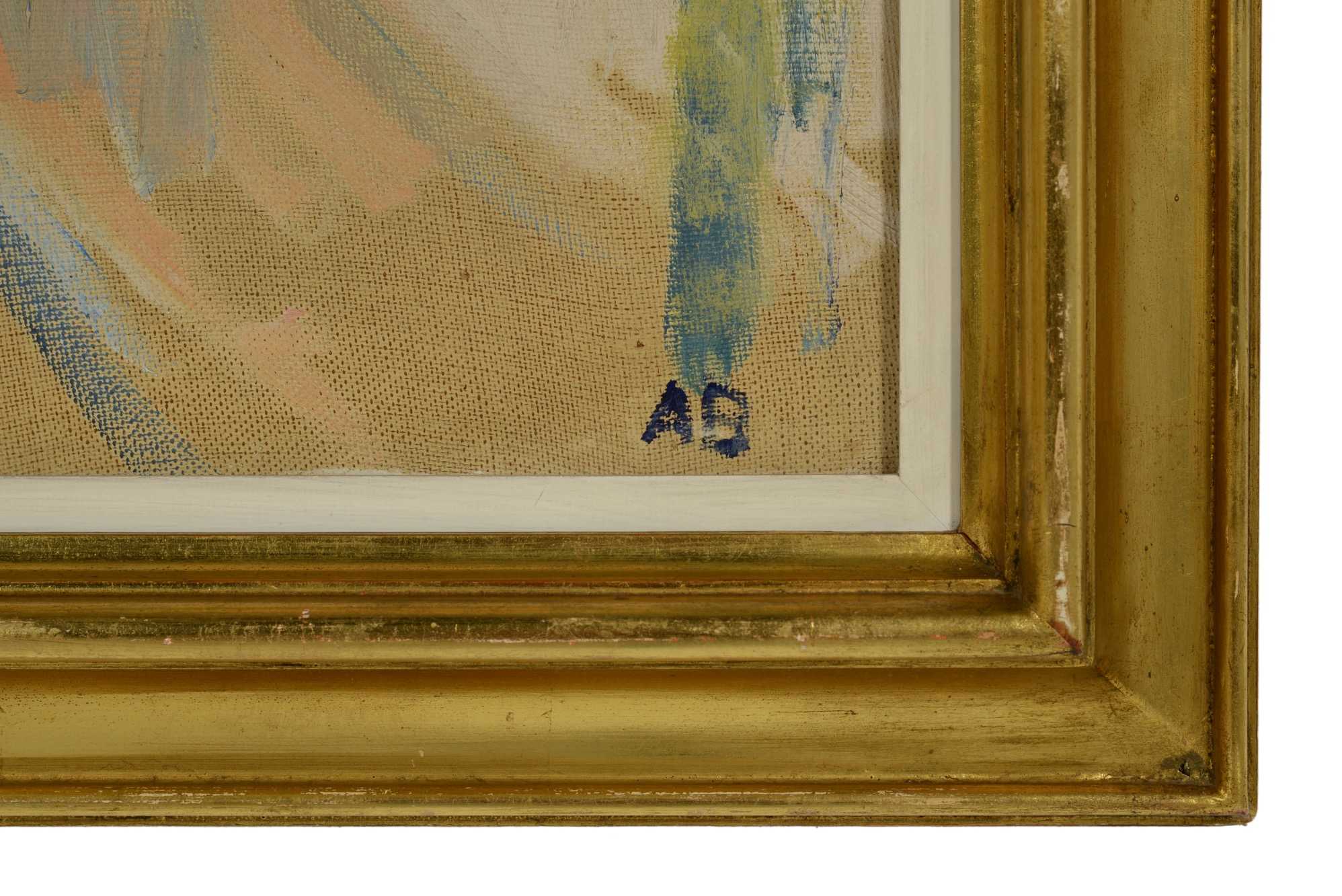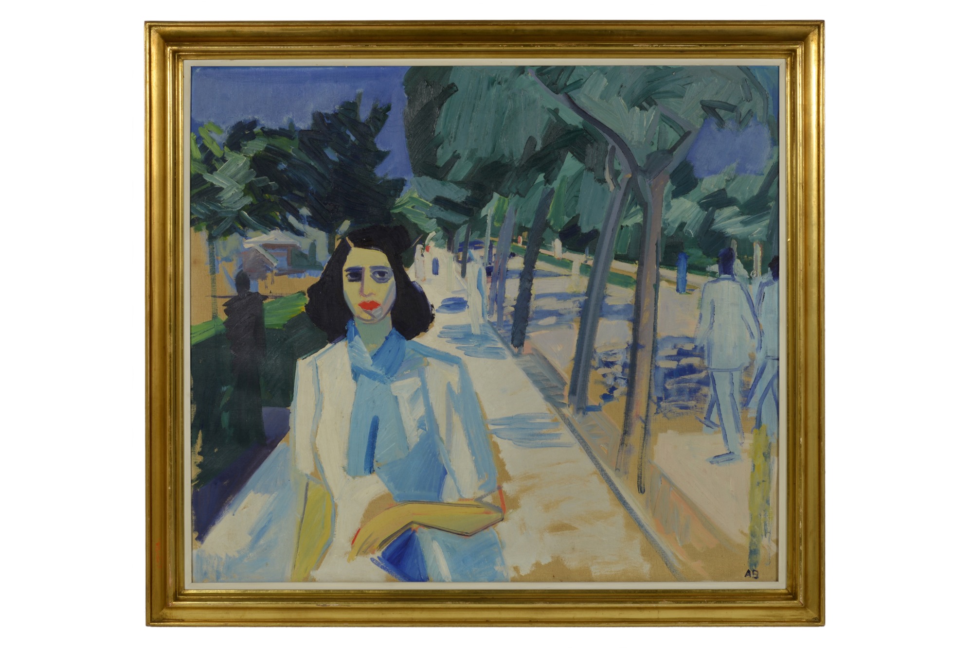 デンマークの画家、アクセル・ベンツェンによる油彩作品です。氏の旅行先でしょうか、ベニスのLido島にて描いたもので、すれ違う女性のインパクトが強かったのだろうと思われます。1938年にオーフスにて行われた作品展に出品された経歴が記されています。