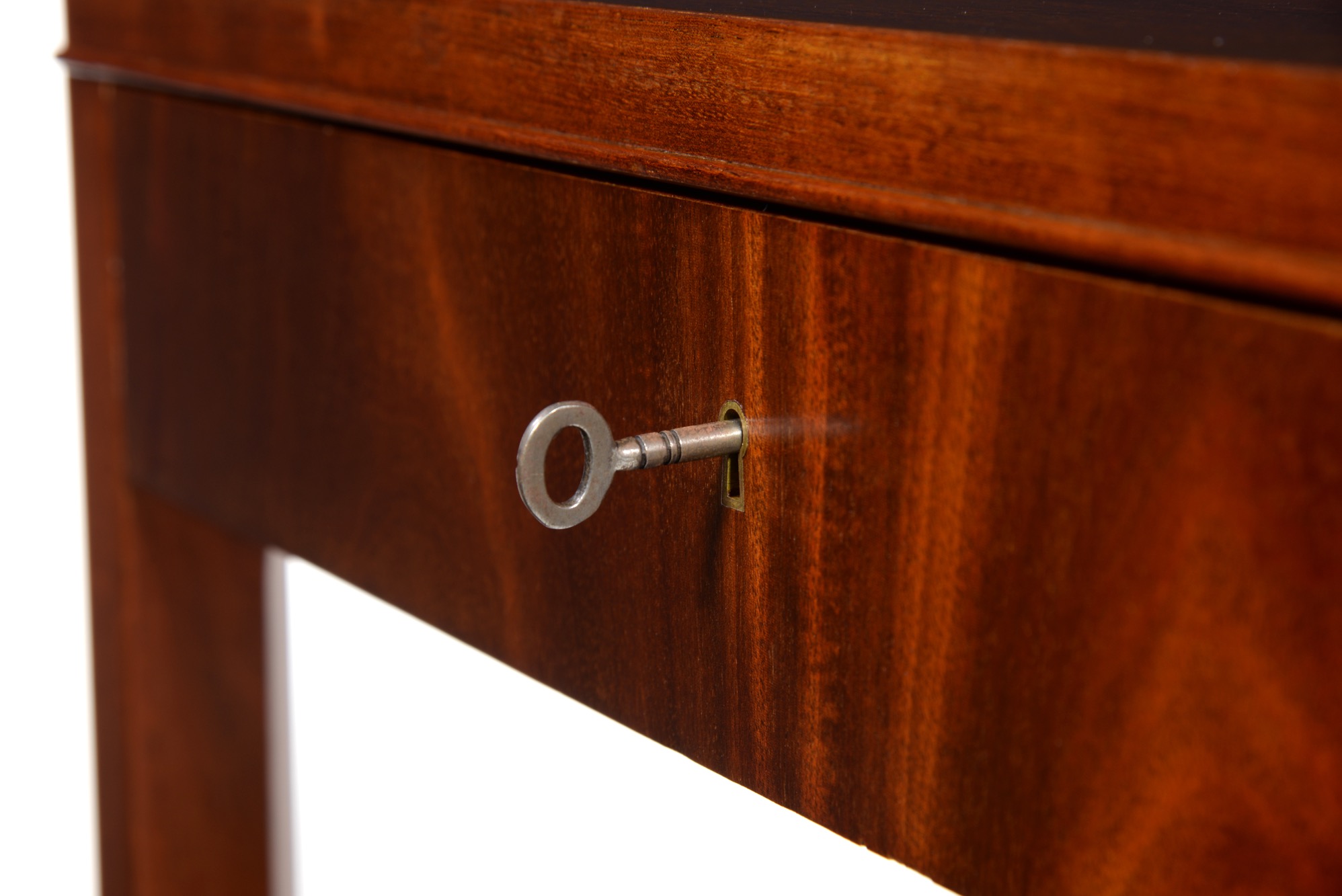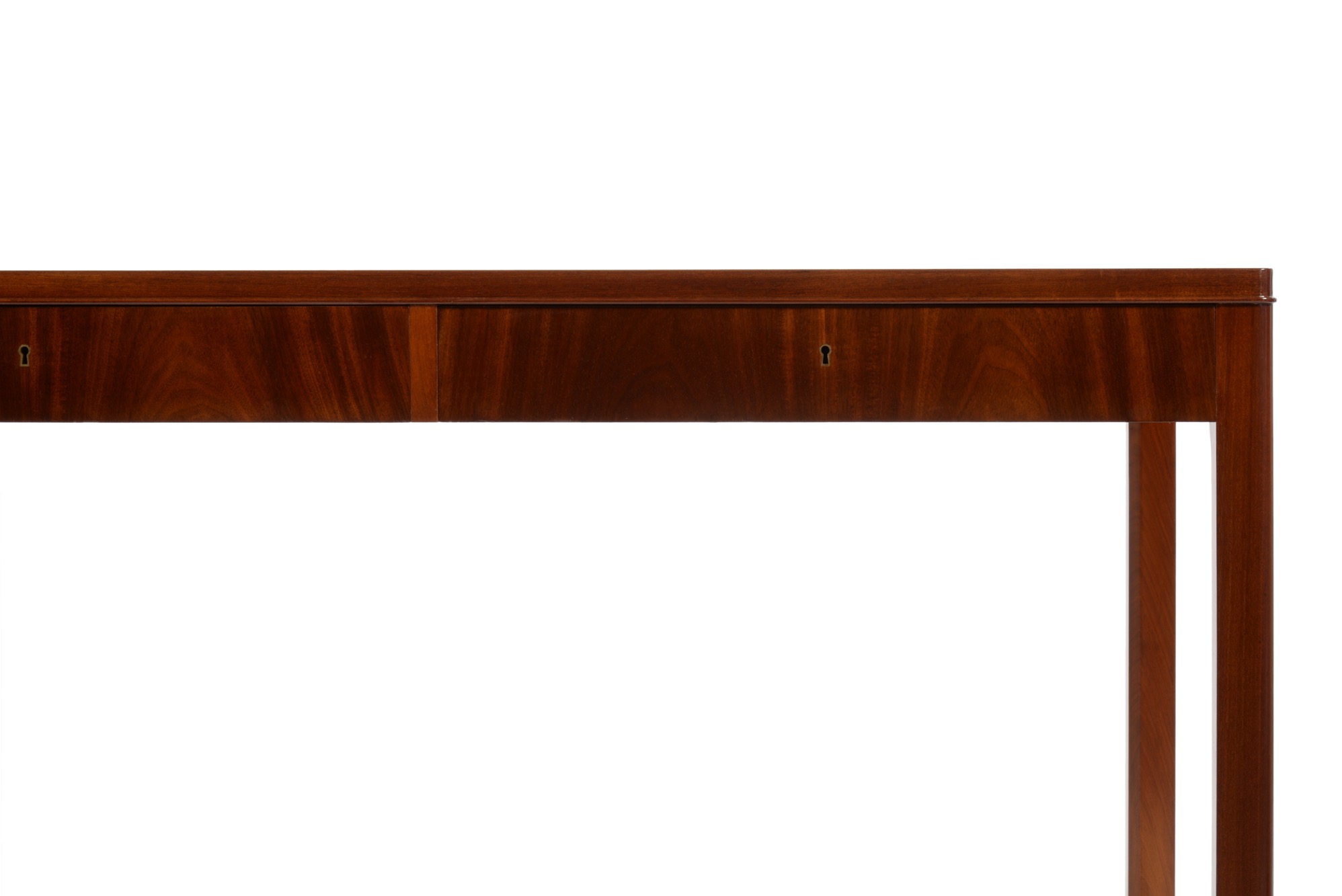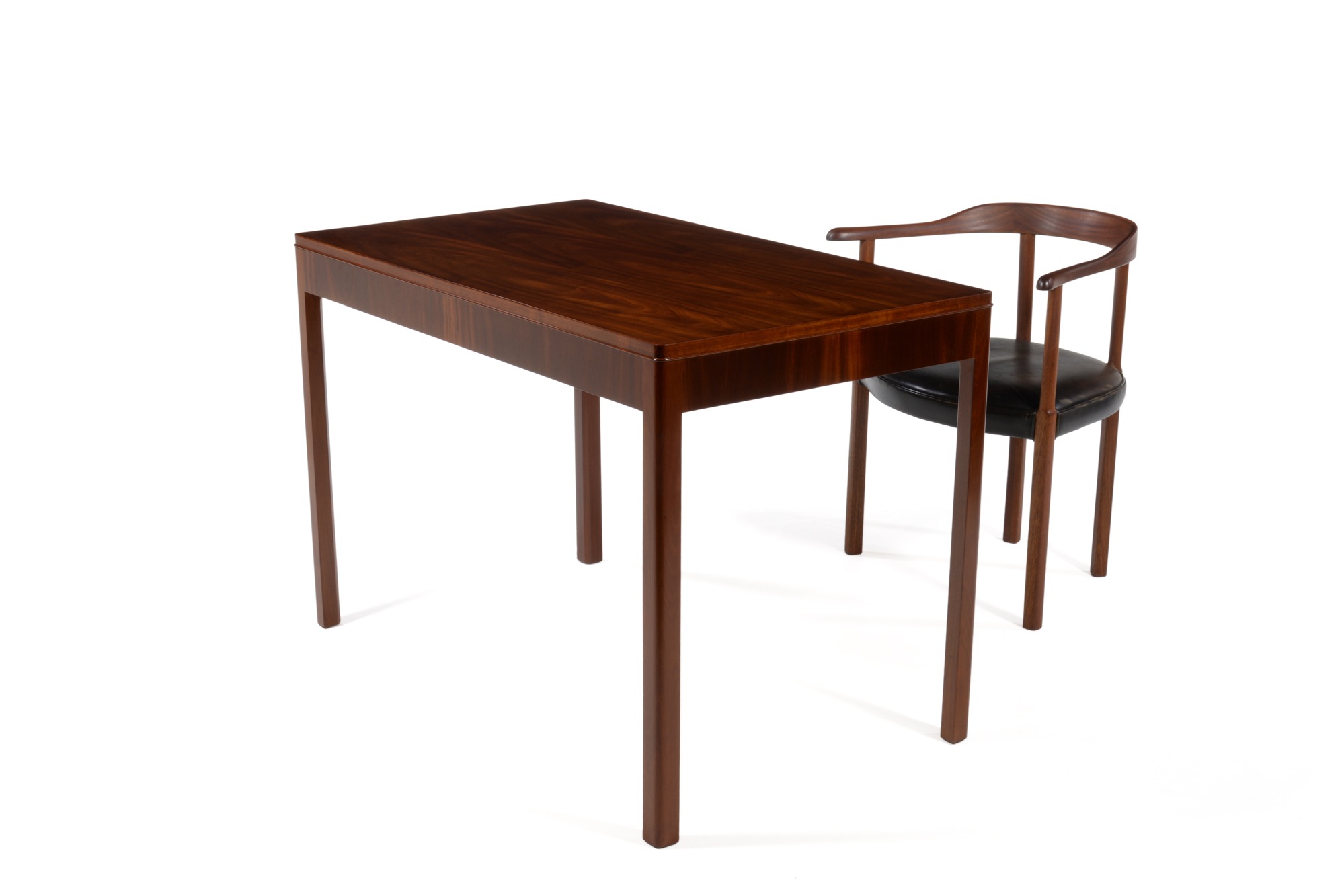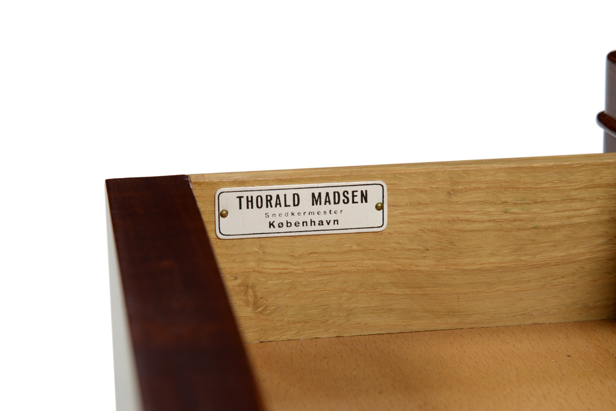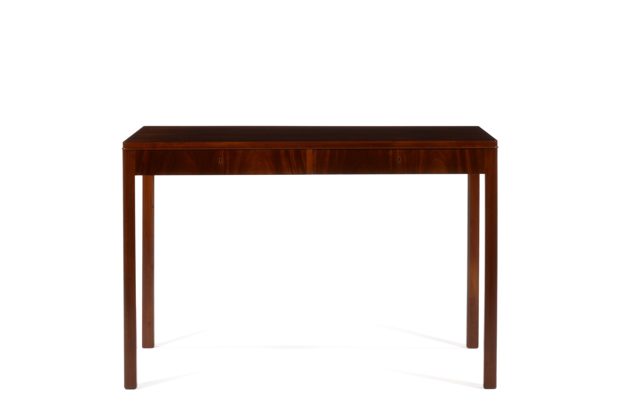 デンマークのキャビネットメーカー、Thorald Madsen工房によるレディースデスク、おそらくマホガニー材かと思われます。1930~40年代頃に作られたものでしょう。デンマークに於けるレディースデスクとは、抽斗が袖のように下がらず、天板下に横並びに配置されたスタイルを指すようです。抽斗の一部に呼継補修が見られますが、構造の問題はなくコンディションは良好です。鍵が1本付属いたします。