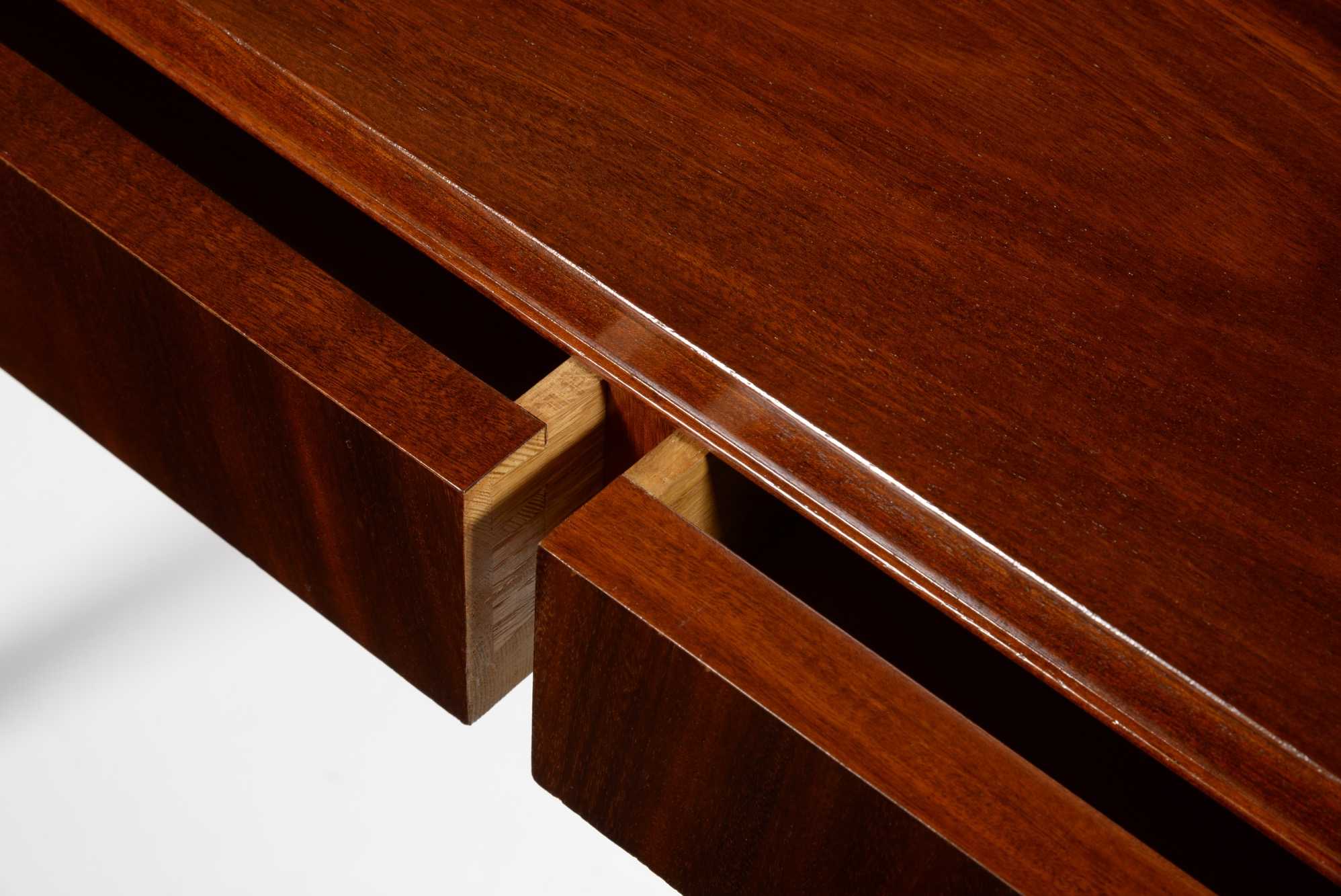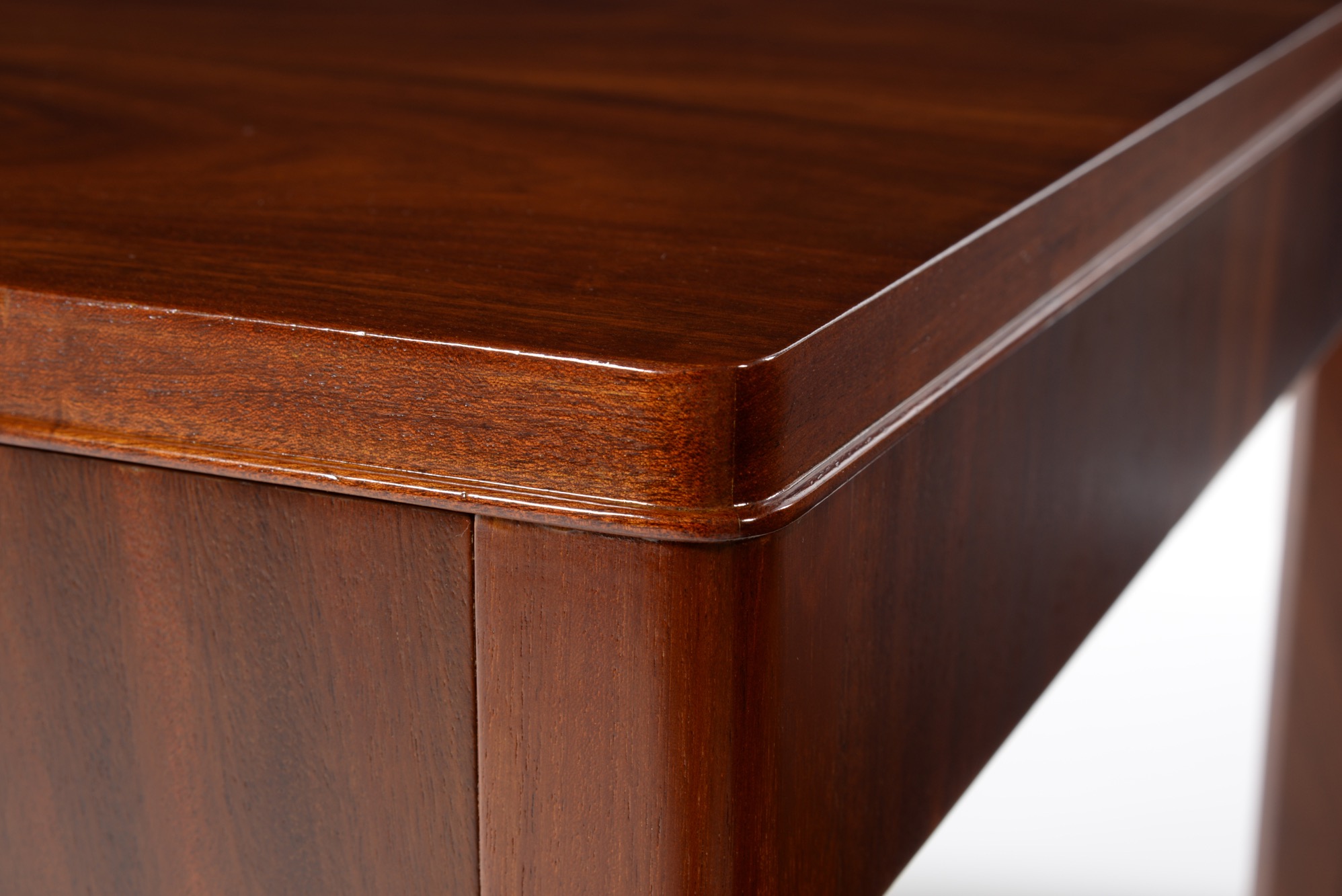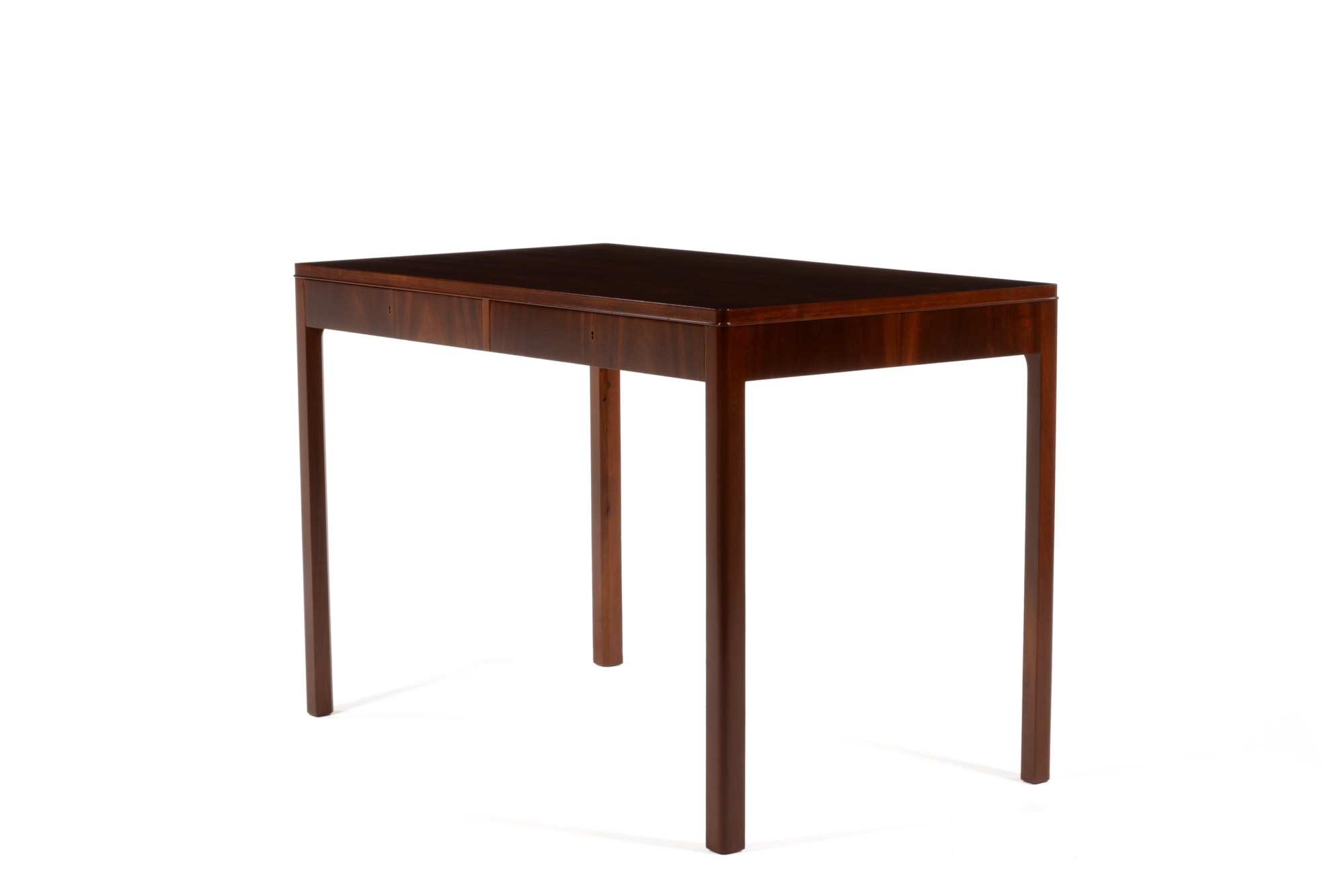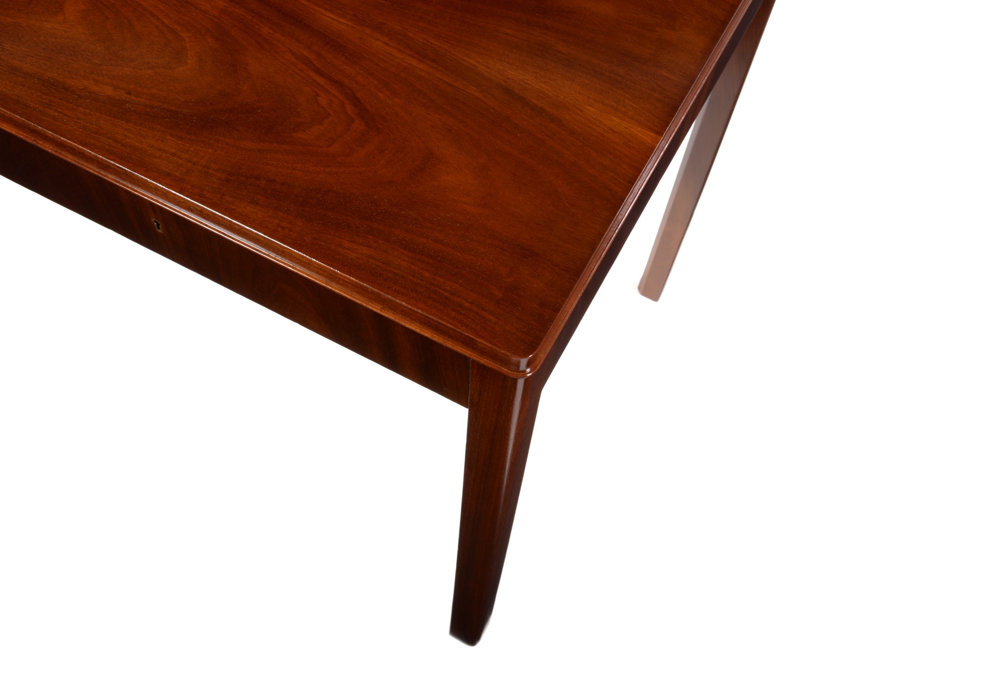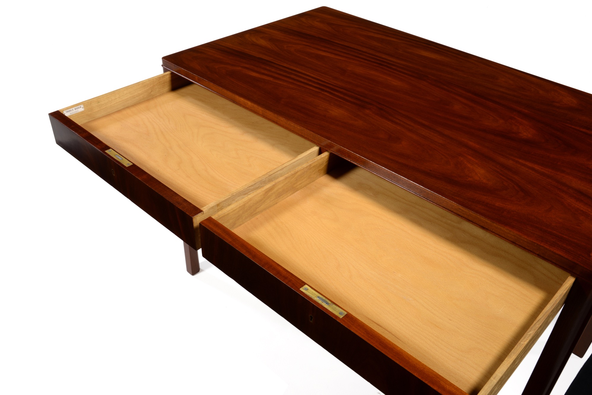 デンマークのキャビネットメーカー、Thorald Madsen工房によるレディースデスク、おそらくマホガニー材かと思われます。1930~40年代頃に作られたものでしょう。デンマークに於けるレディースデスクとは、抽斗が袖のように下がらず、天板下に横並びに配置されたスタイルを指すようです。抽斗の一部に呼継補修が見られますが、構造の問題はなくコンディションは良好です。鍵が1本付属いたします。