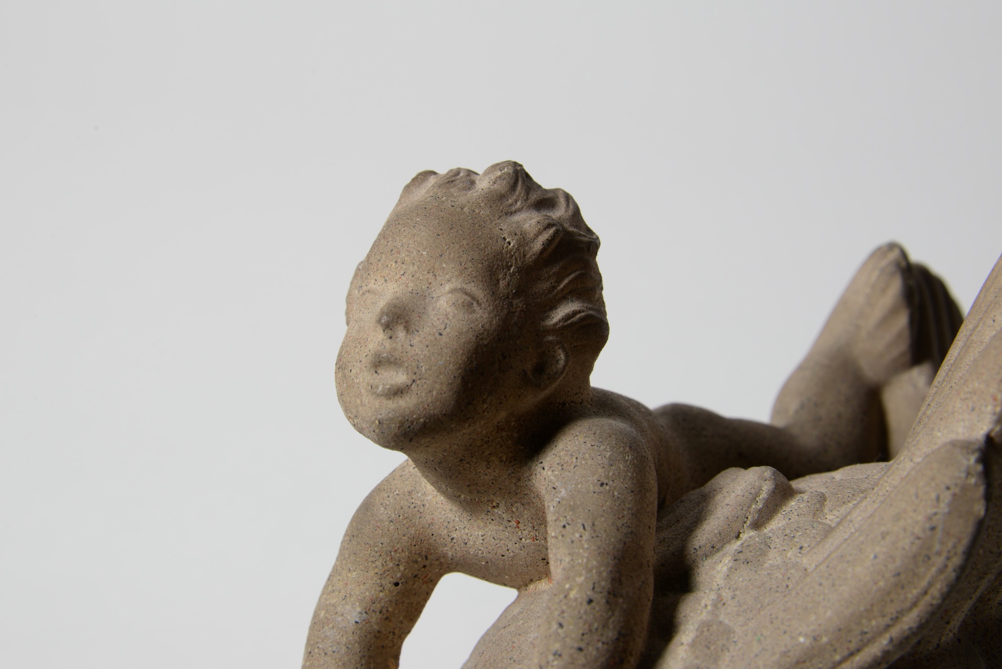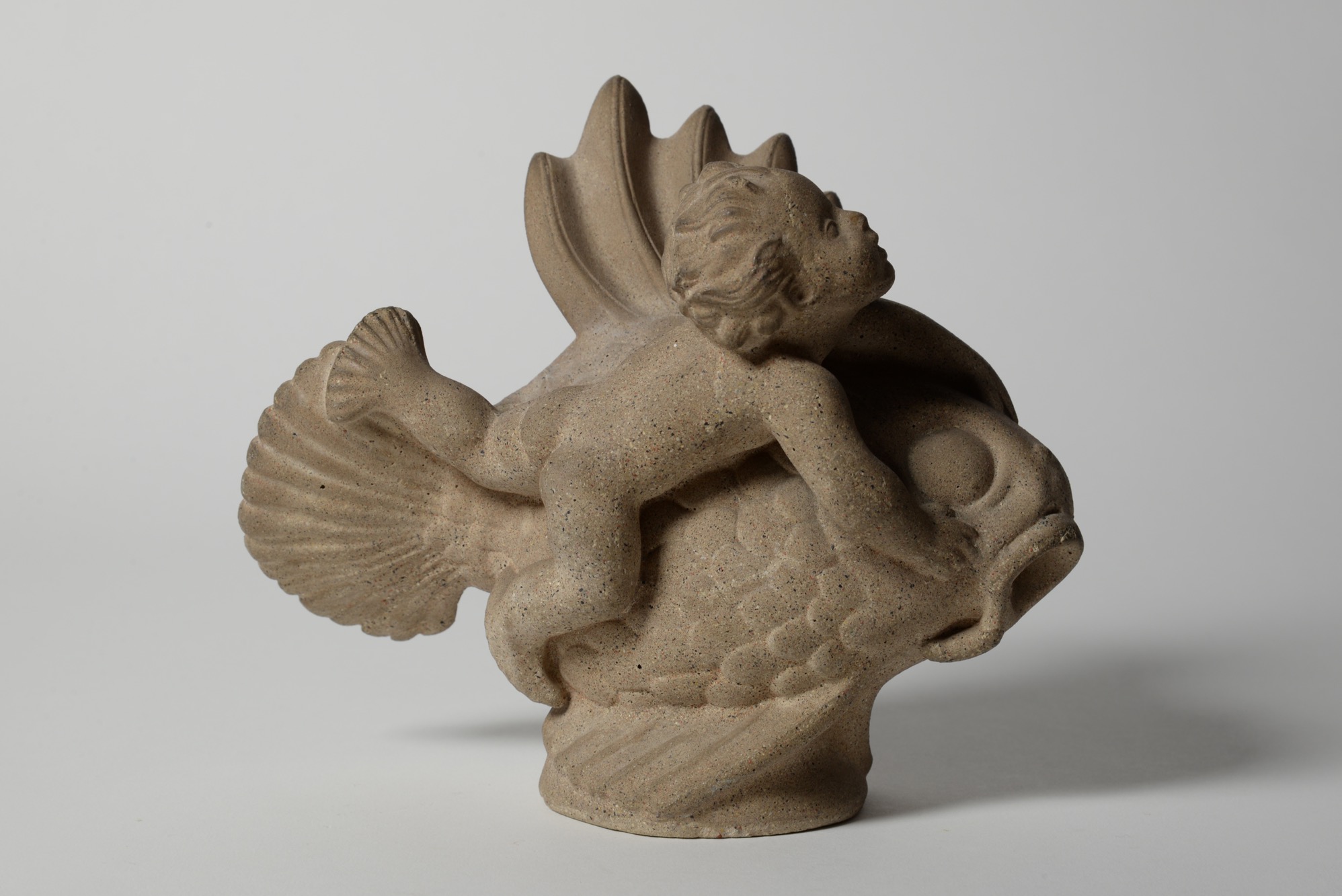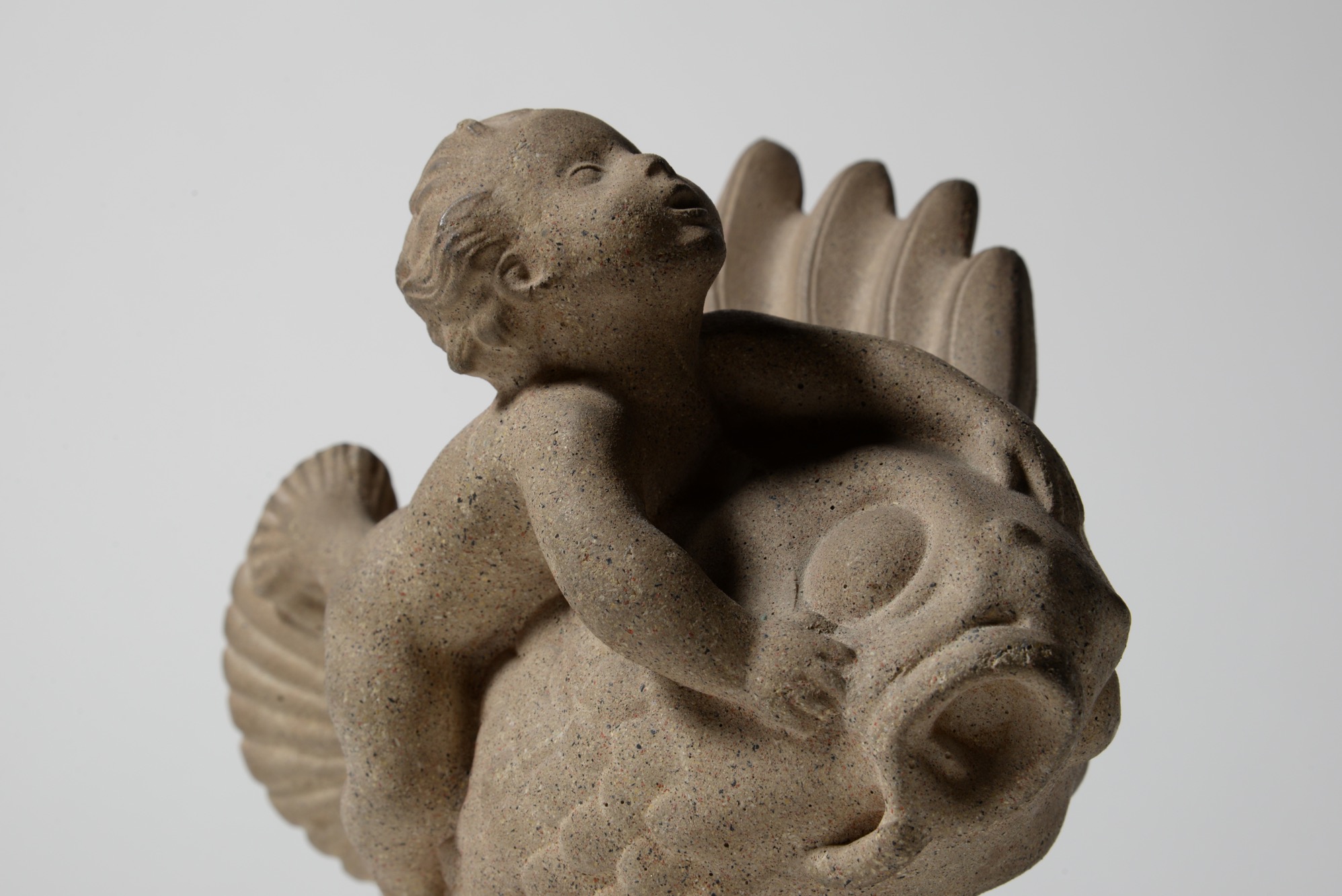 デンマークの金工作家、Just Andersen/ユスト・アナセンによるNexøsten/サンドストーン作品です。魚にしがみつく少年が愛らしく表現されています。
