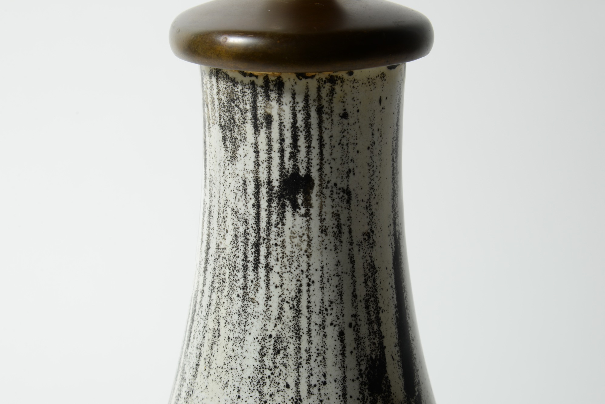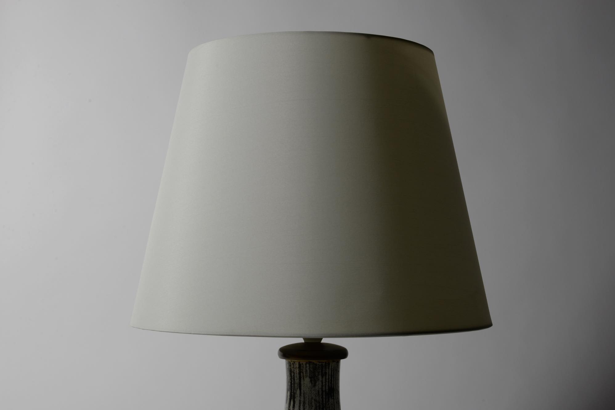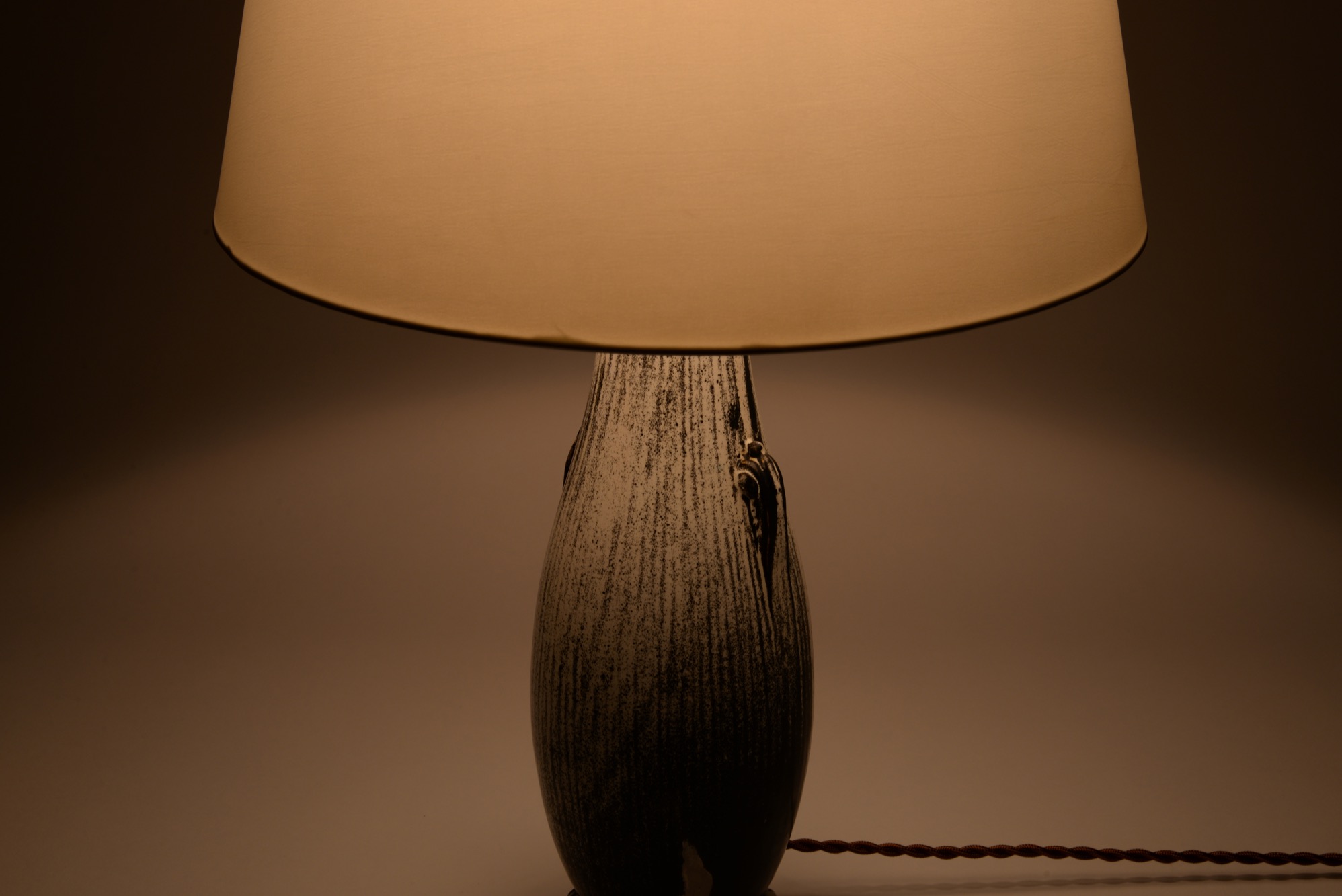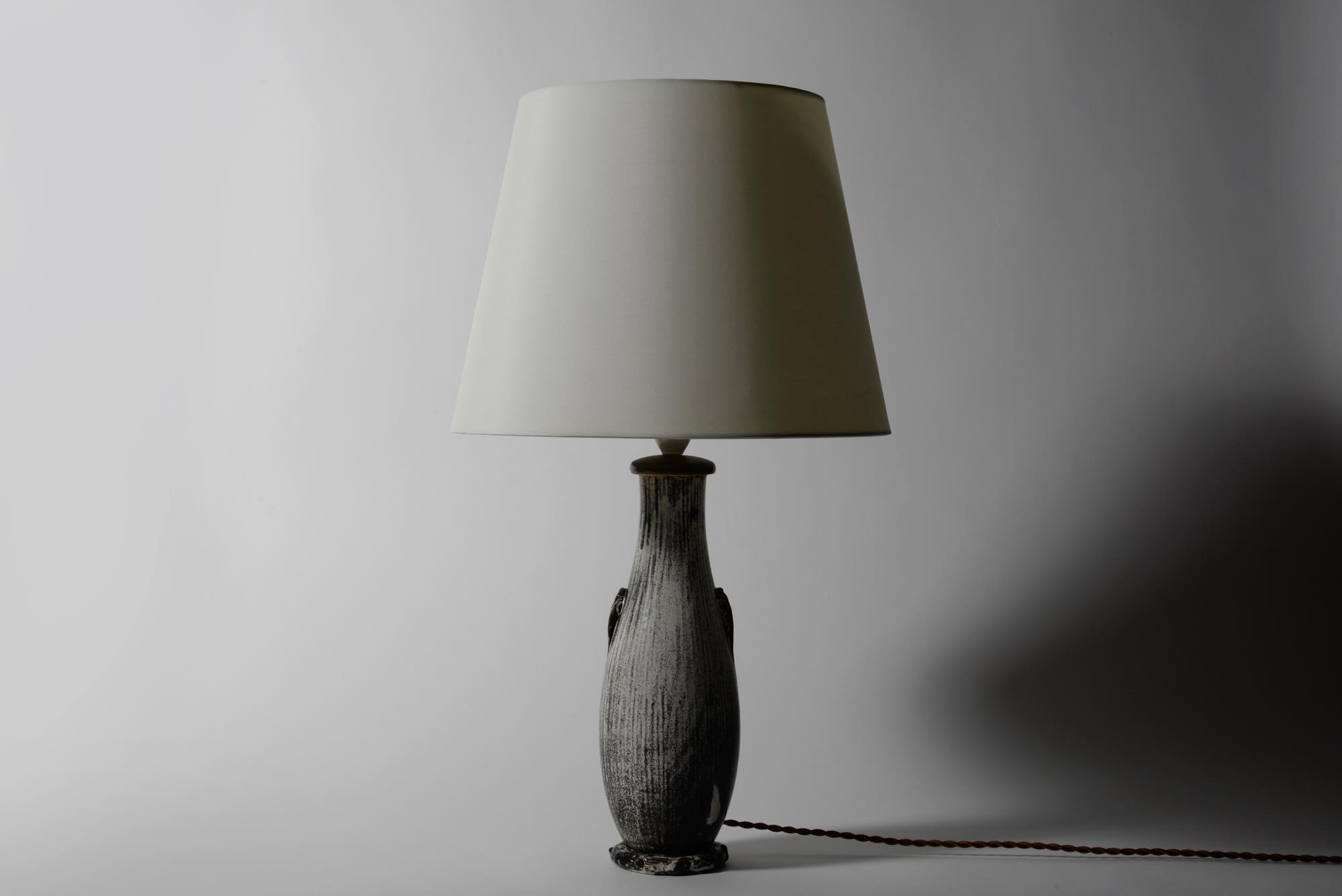 デンマークの陶芸家、スヴェン・ハマスホイによるテーブルランプです。錫を主成分とするモノクロームの釉は、戦前に作られたものでありながらモダンで現代的な雰囲気を醸しています。頸に備わる一双の耳に、虫喰い(焼成時に陶体と釉の収縮率の差から生じる釉の剥落)が見られ、ちょっとした景色となっています。シェードは近年差し替えられているようです。
