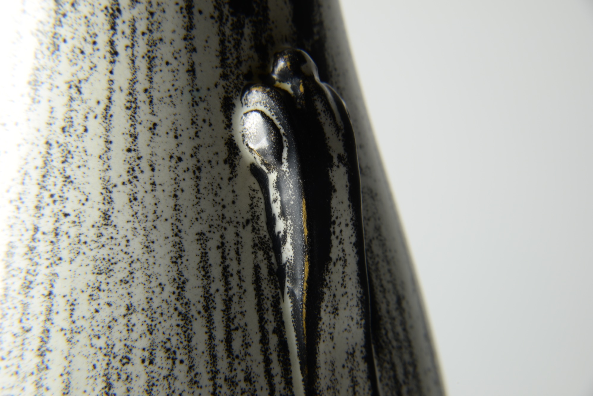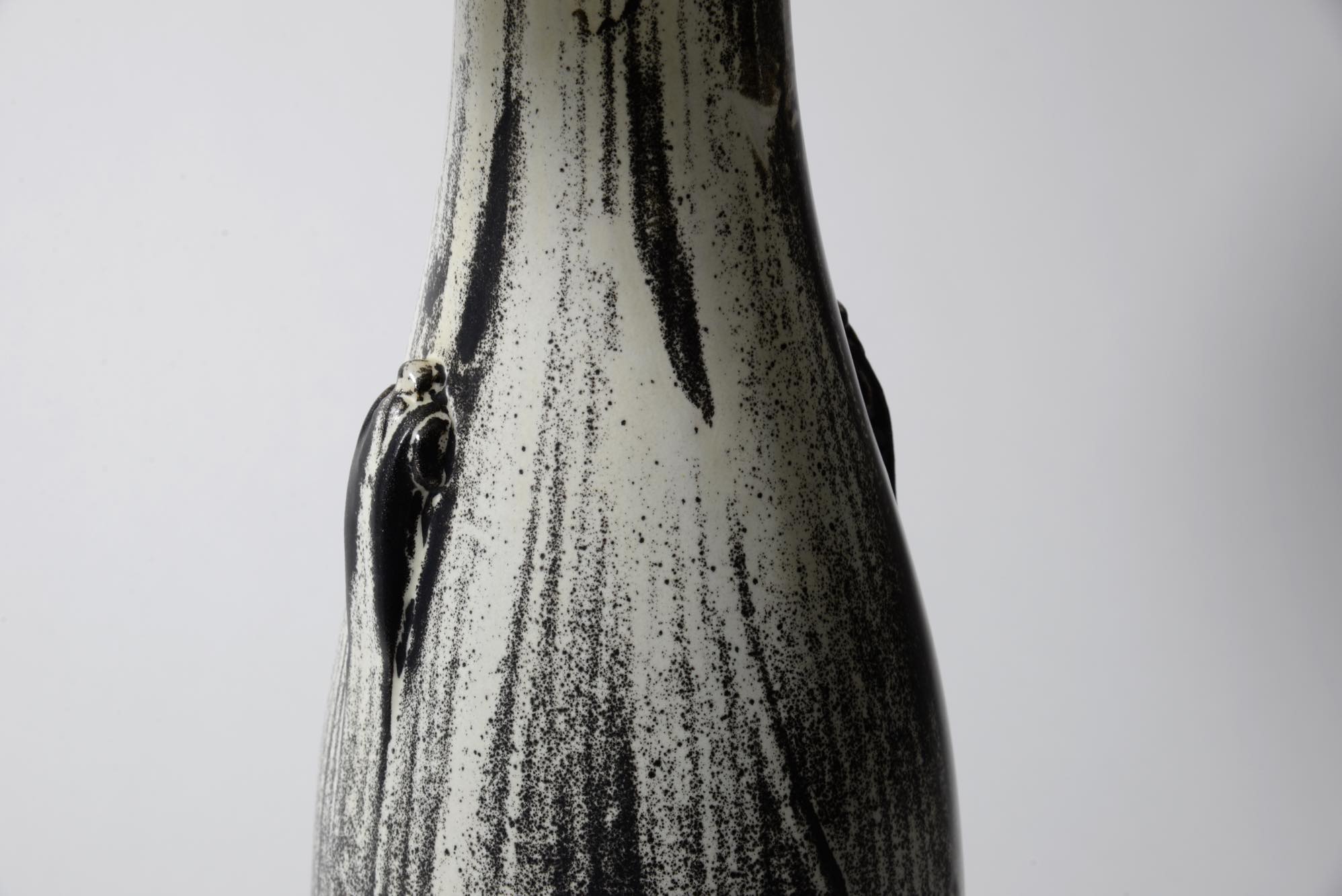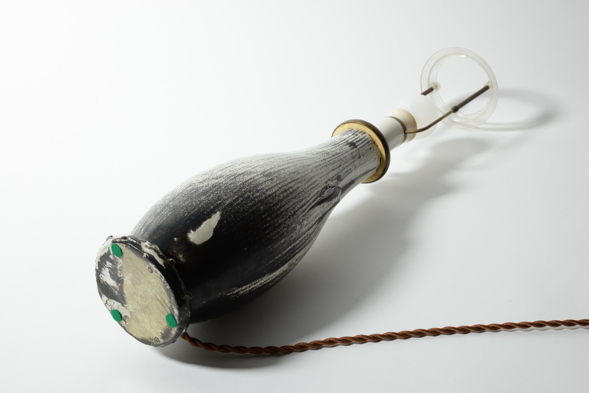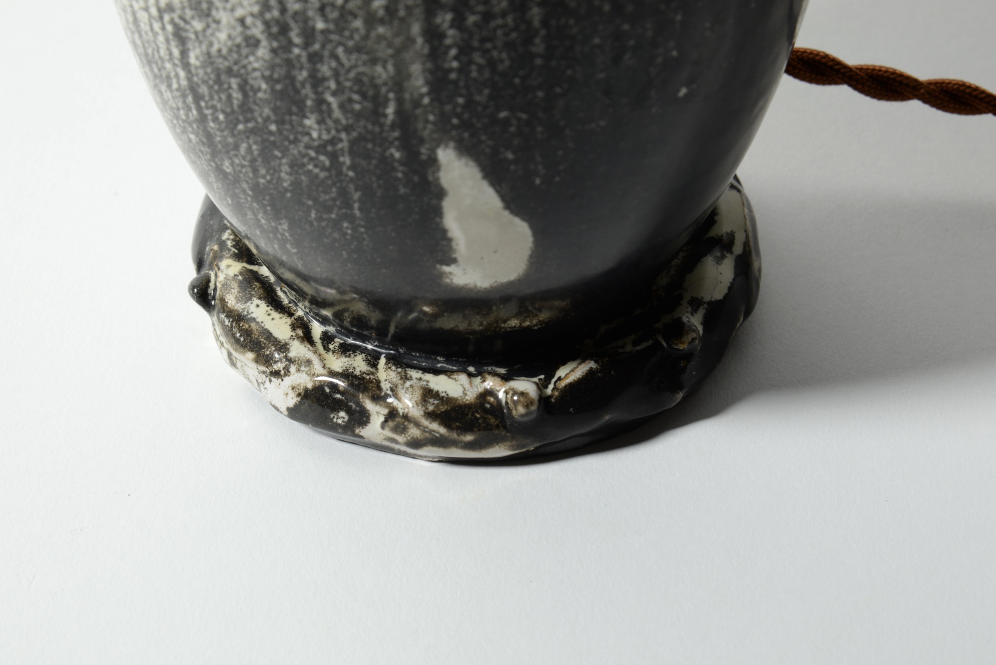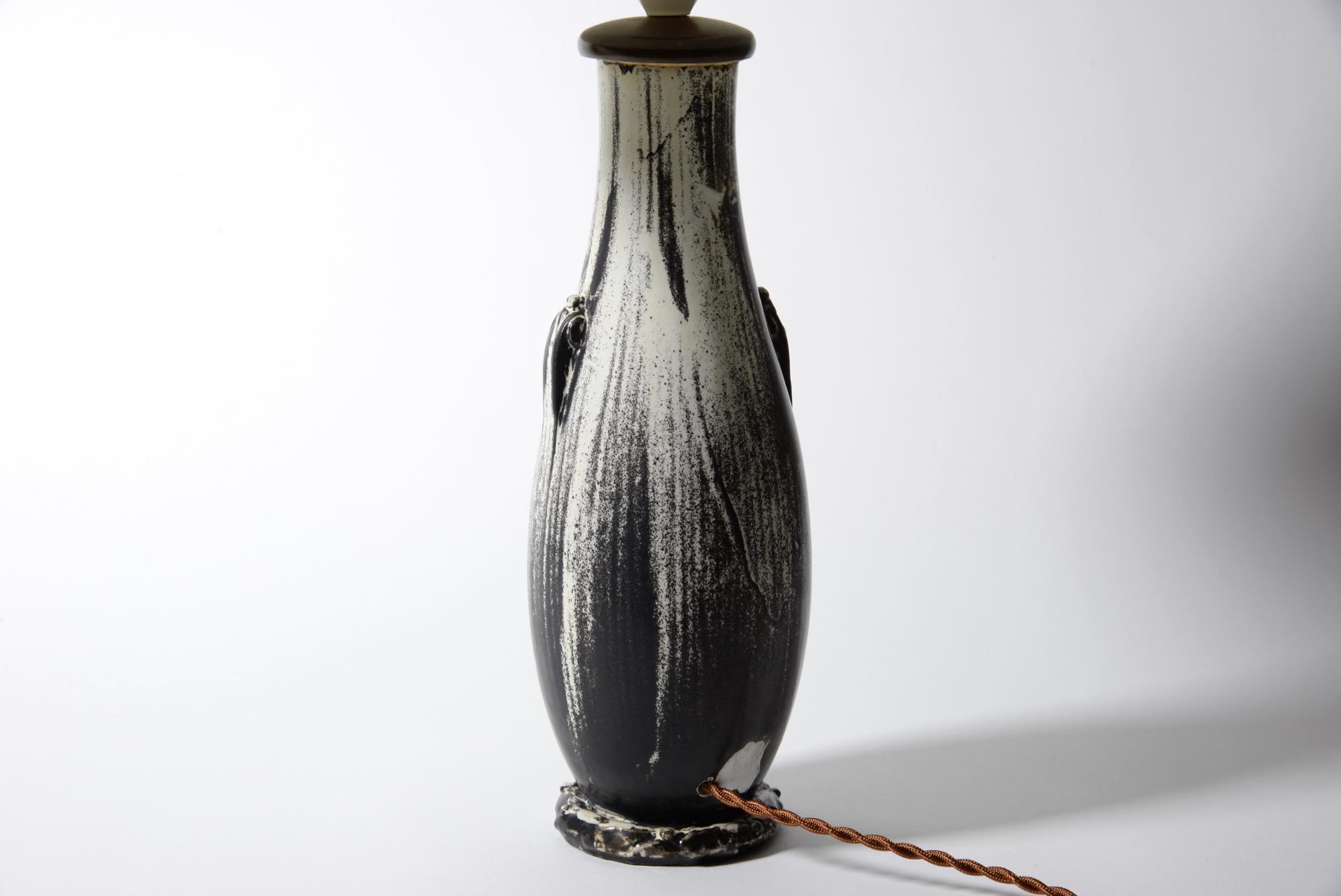 デンマークの陶芸家、スヴェン・ハマスホイによるテーブルランプです。錫を主成分とするモノクロームの釉は、戦前に作られたものでありながらモダンで現代的な雰囲気を醸しています。頸に備わる一双の耳に、虫喰い(焼成時に陶体と釉の収縮率の差から生じる釉の剥落)が見られ、ちょっとした景色となっています。シェードは近年差し替えられているようです。