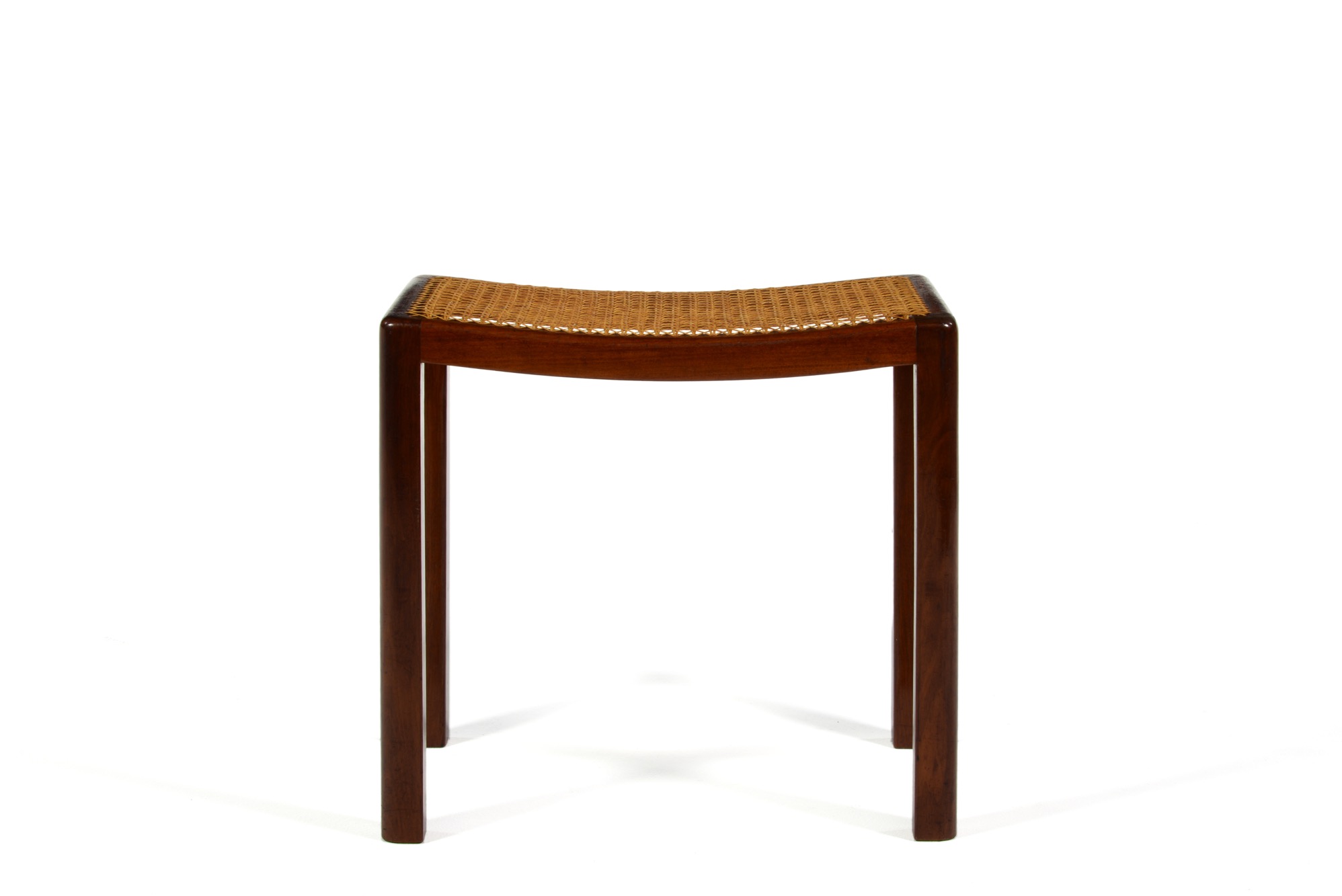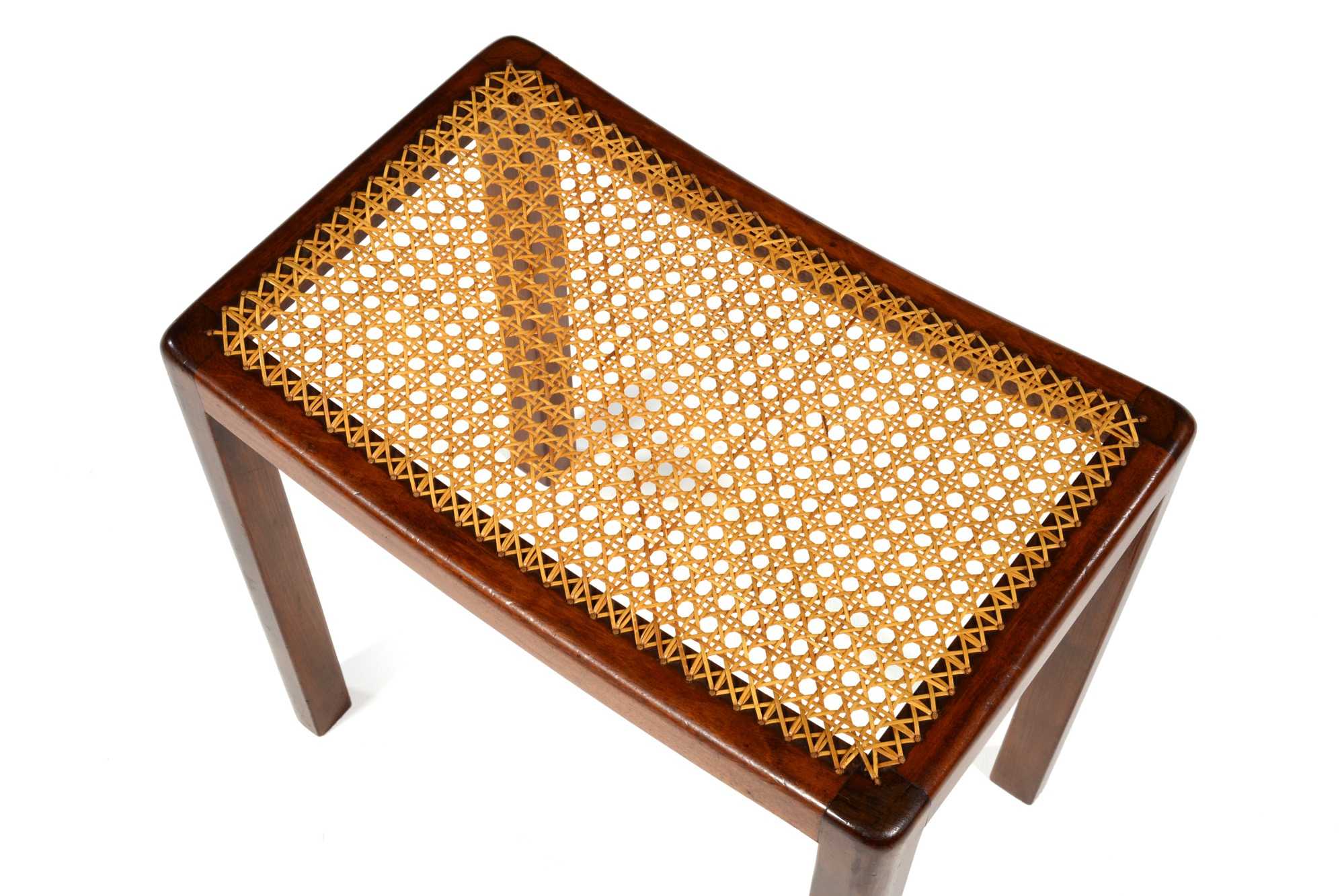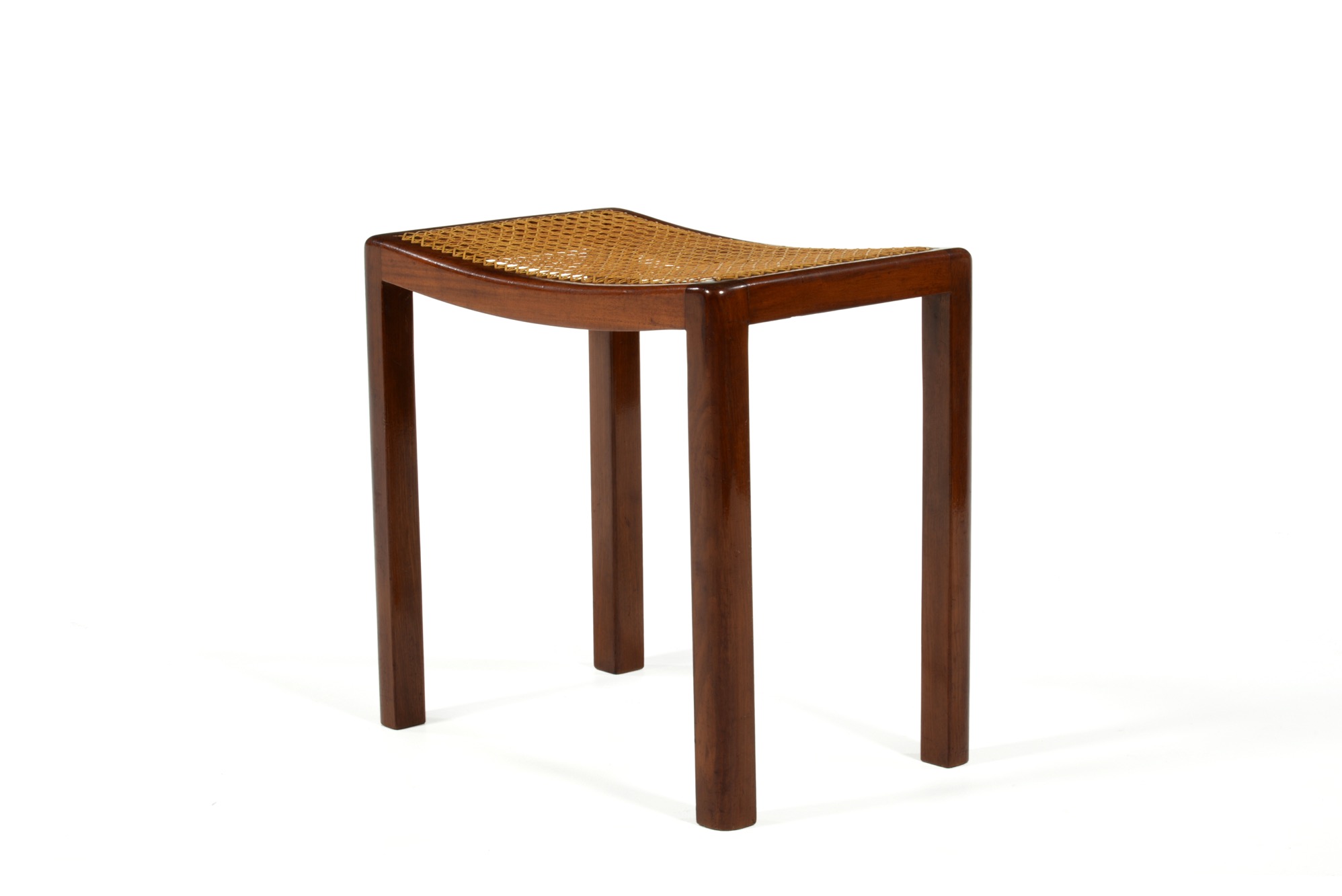 キューバンマホガニーと思しき材を用いた籐張りのスツールです。工房などの詳細はわかっておりませんが、1940年代頃のものと思われます。手編みの籐は古くオリジナルのようですが、柔軟性があり劣化や硬化は感じられず、当面はこのままお使い頂けそうです。