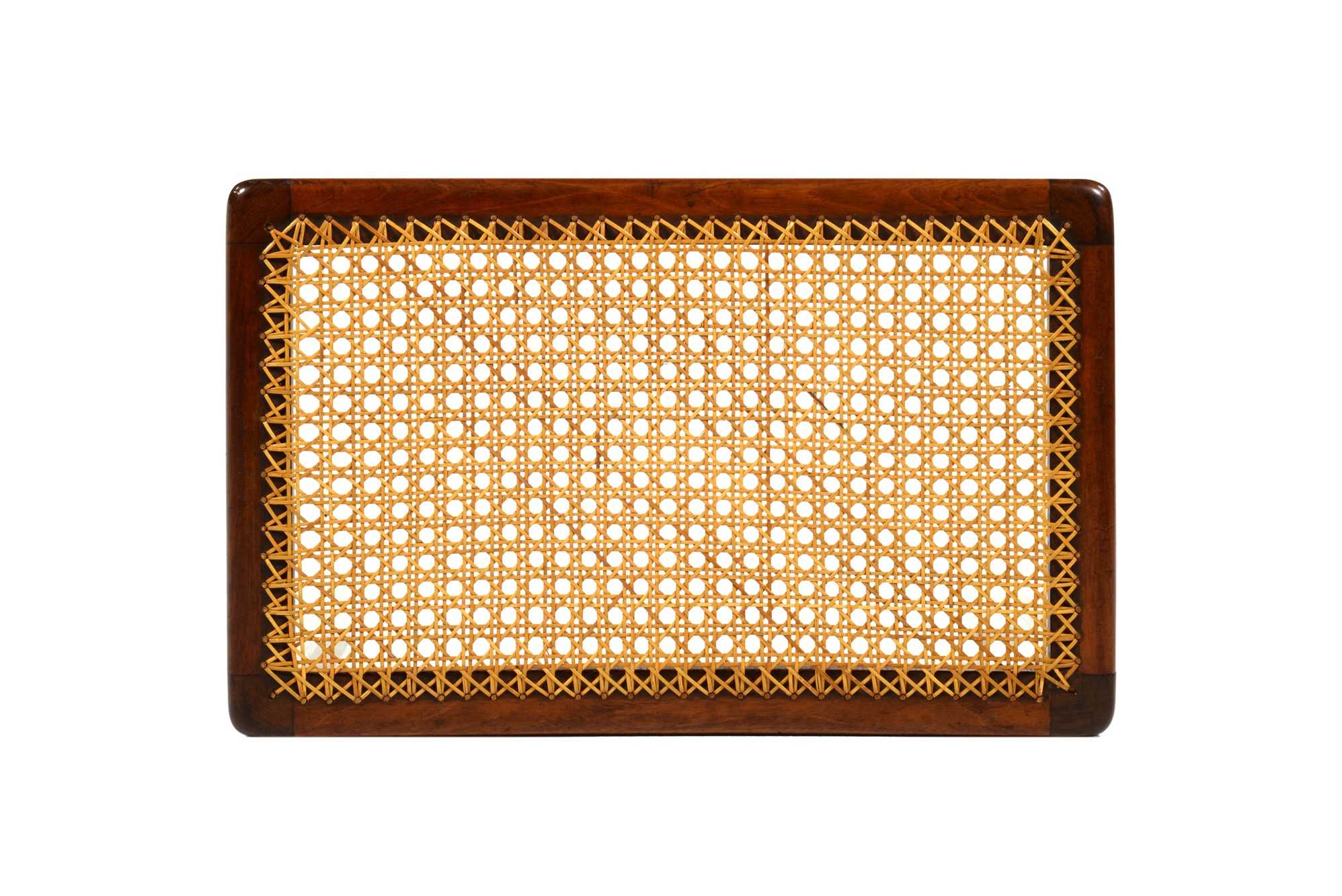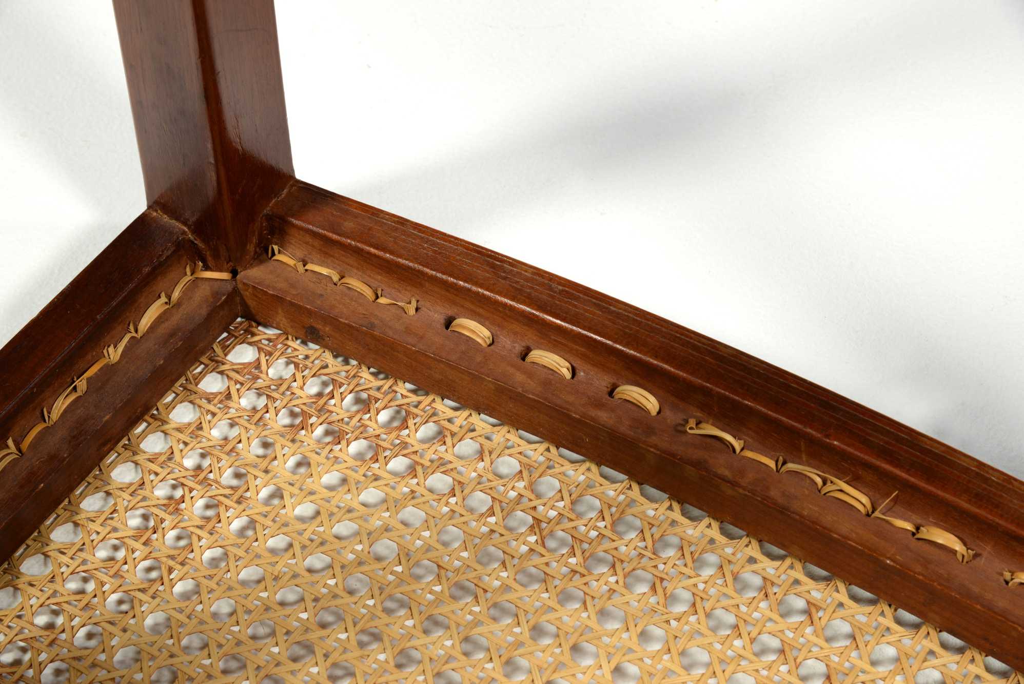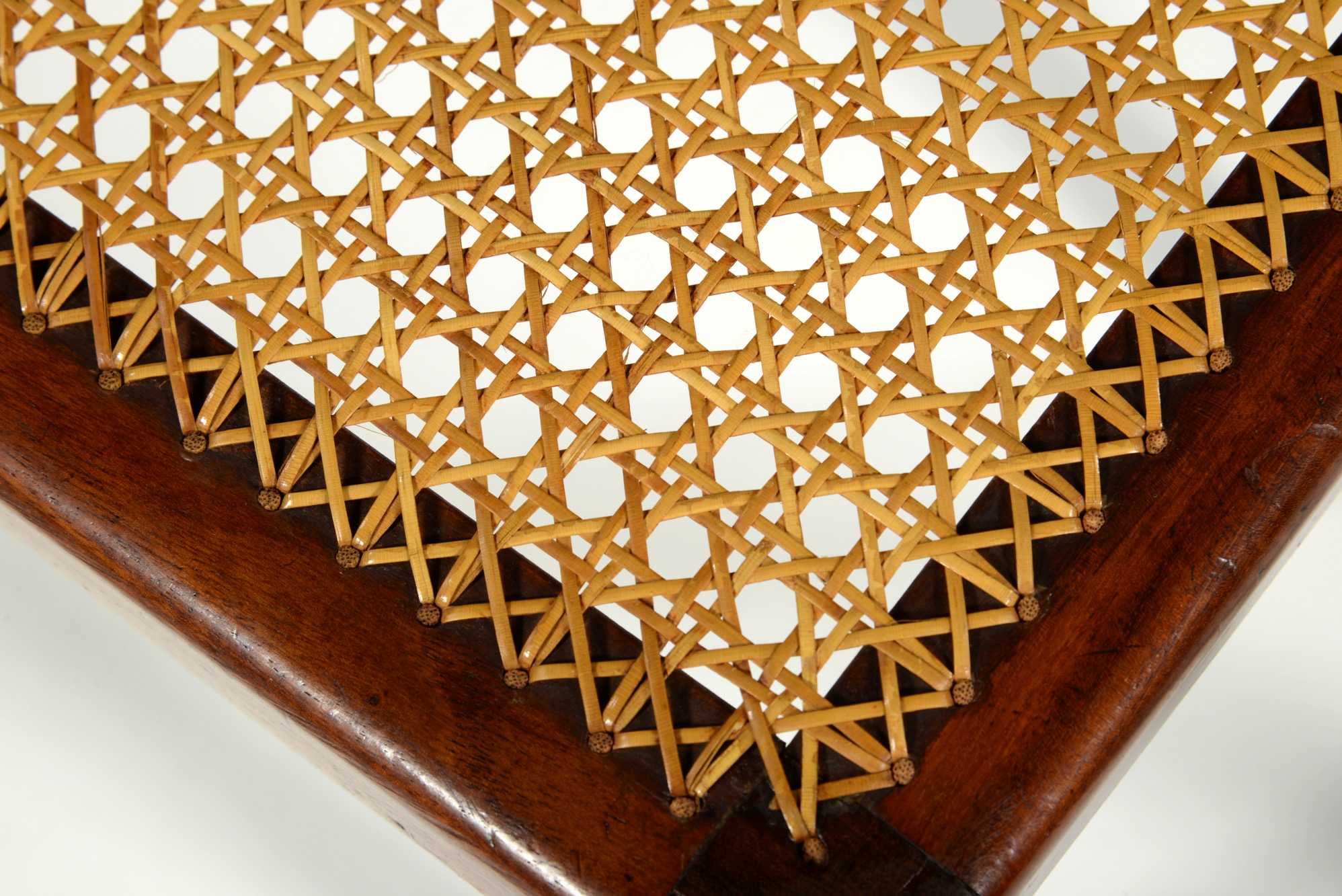 キューバンマホガニーと思しき材を用いた籐張りのスツールです。工房などの詳細はわかっておりませんが、1940年代頃のものと思われます。手編みの籐は古くオリジナルのようですが、柔軟性があり劣化や硬化は感じられず、当面はこのままお使い頂けそうです。