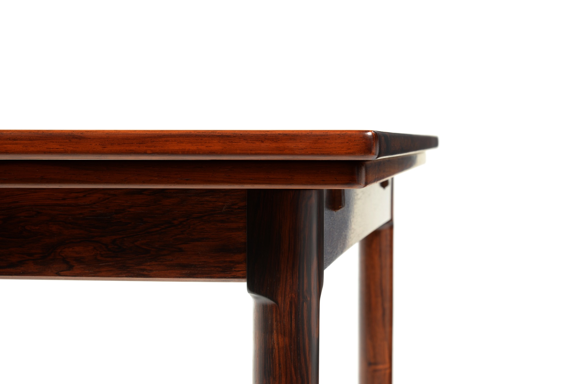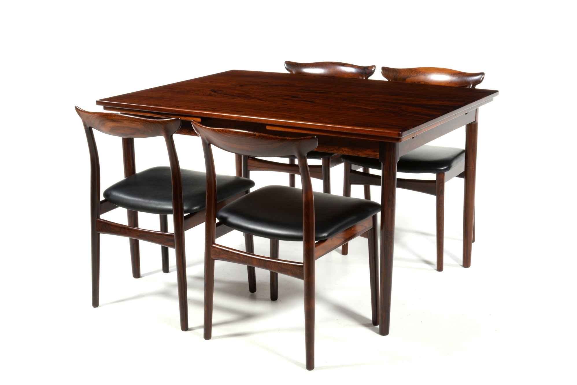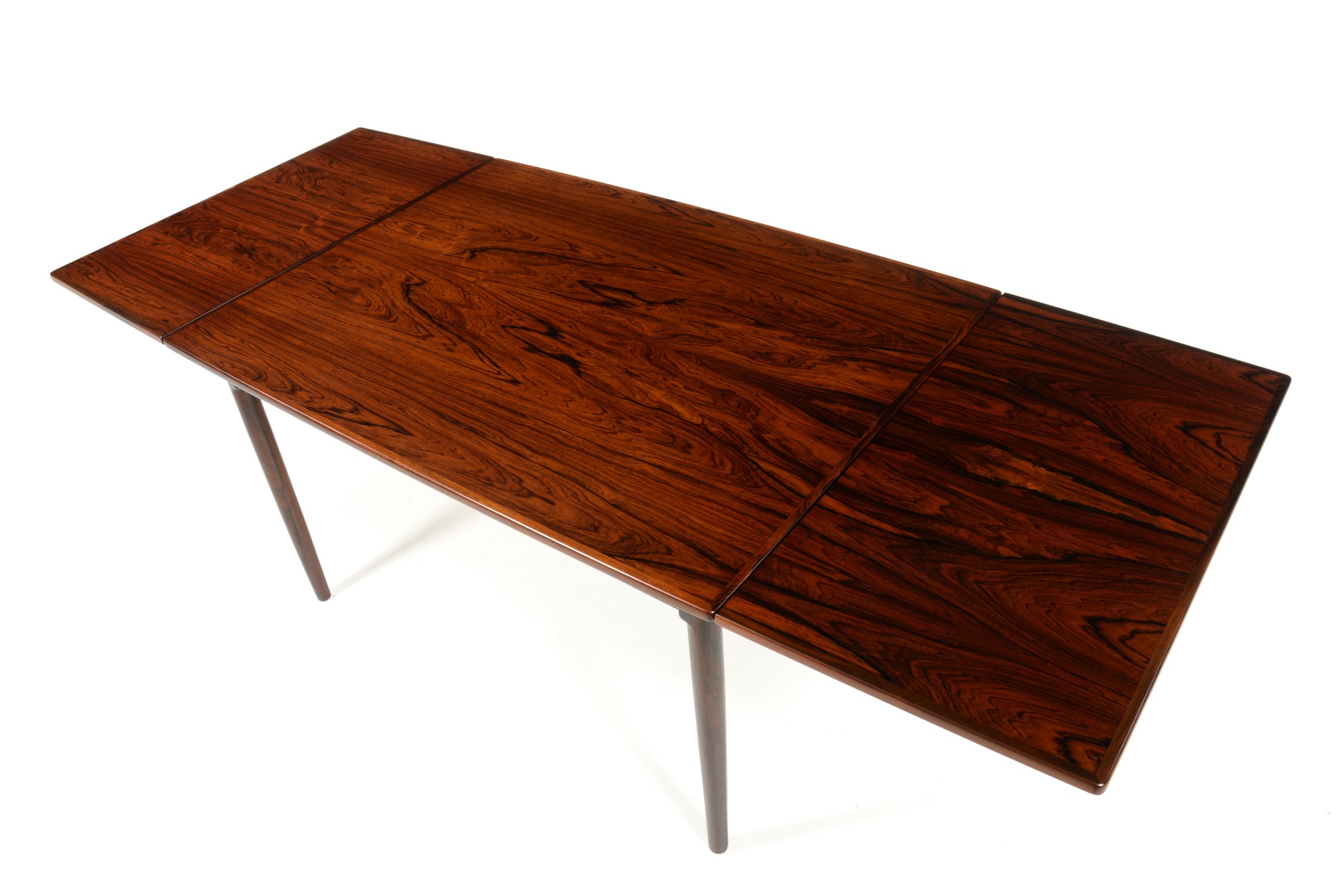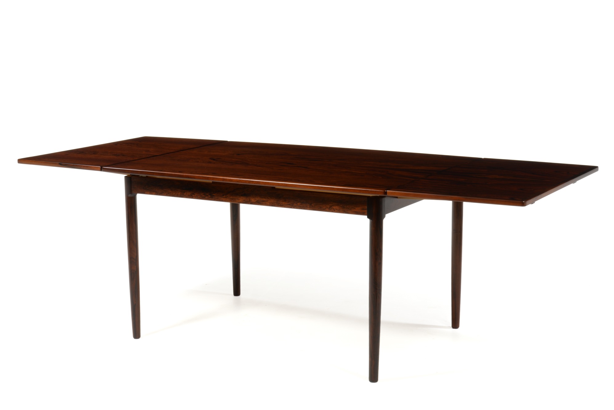 デンマーク製、1960年代に作られたエクステンション式のダイニングテーブルです。わずかに船形にシェイプされた天板は優雅な雰囲気のものです。主天板の両側面から伸張板を引き出し、天板面積を拡張することが可能です。工房等はわかっておりませんが、良い作りのテーブルです。