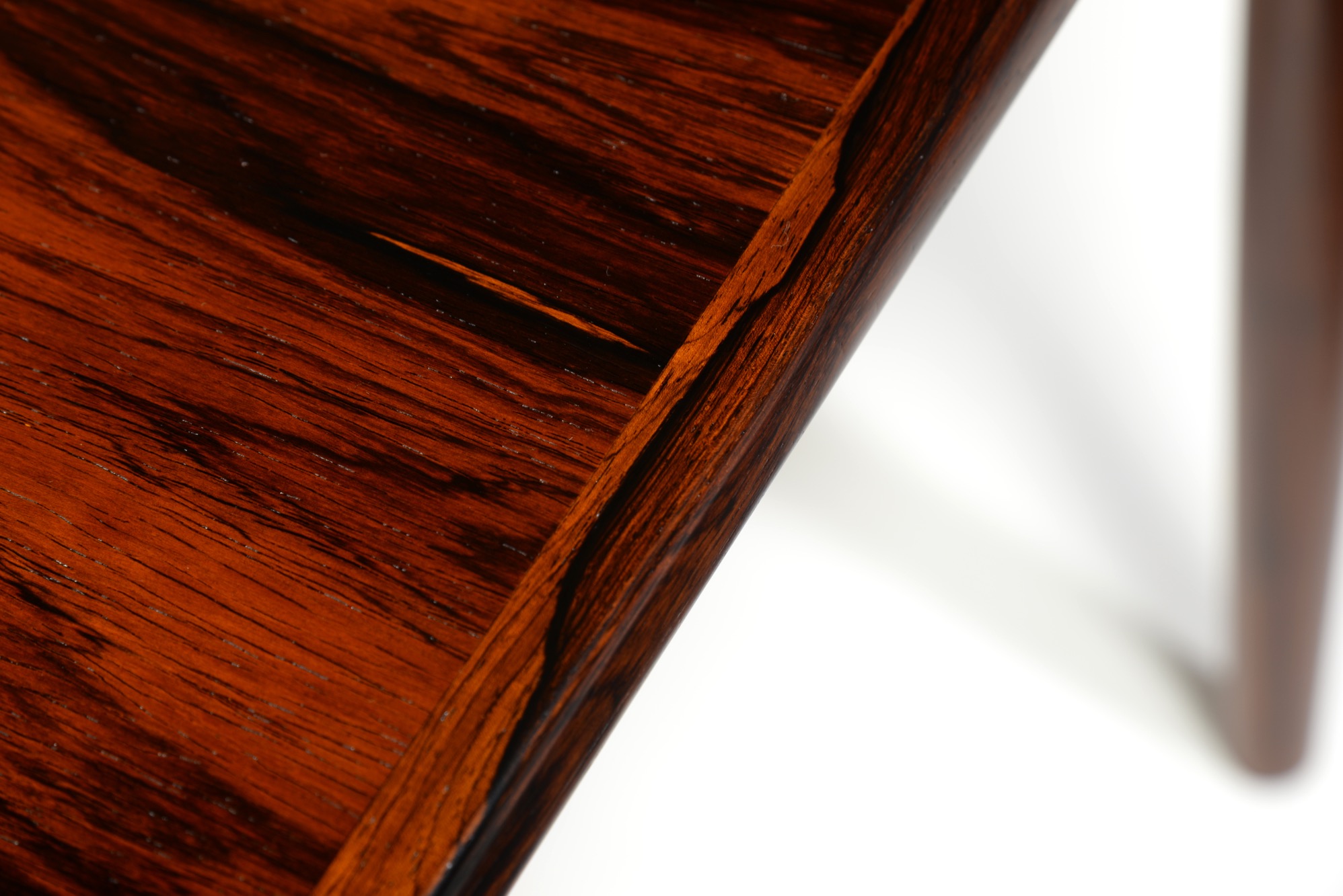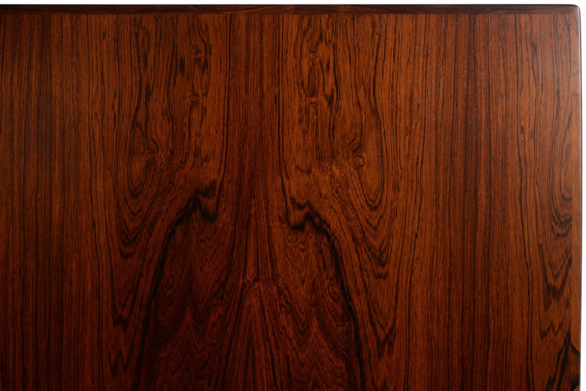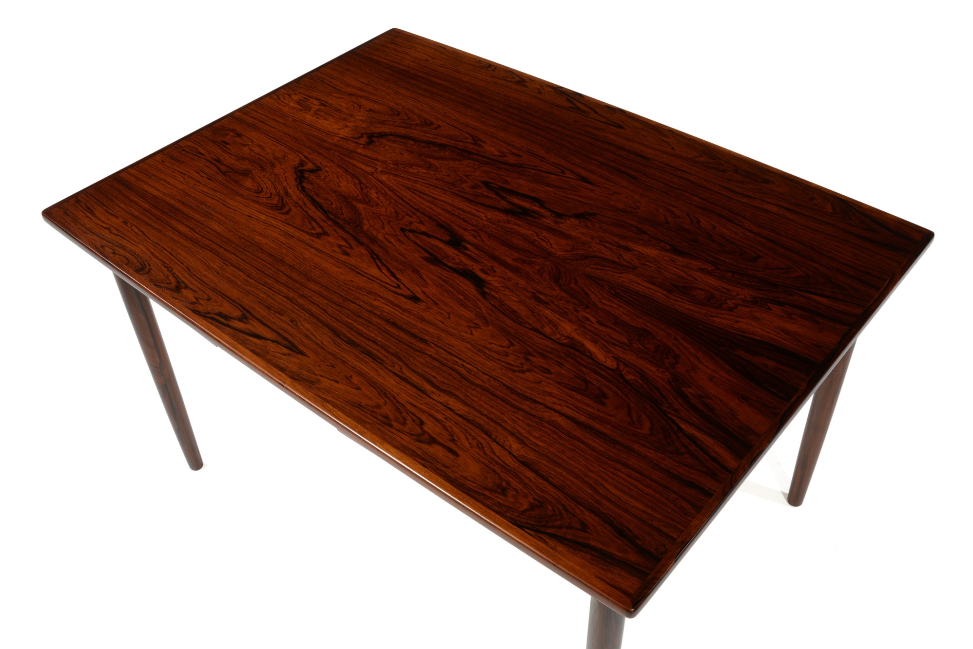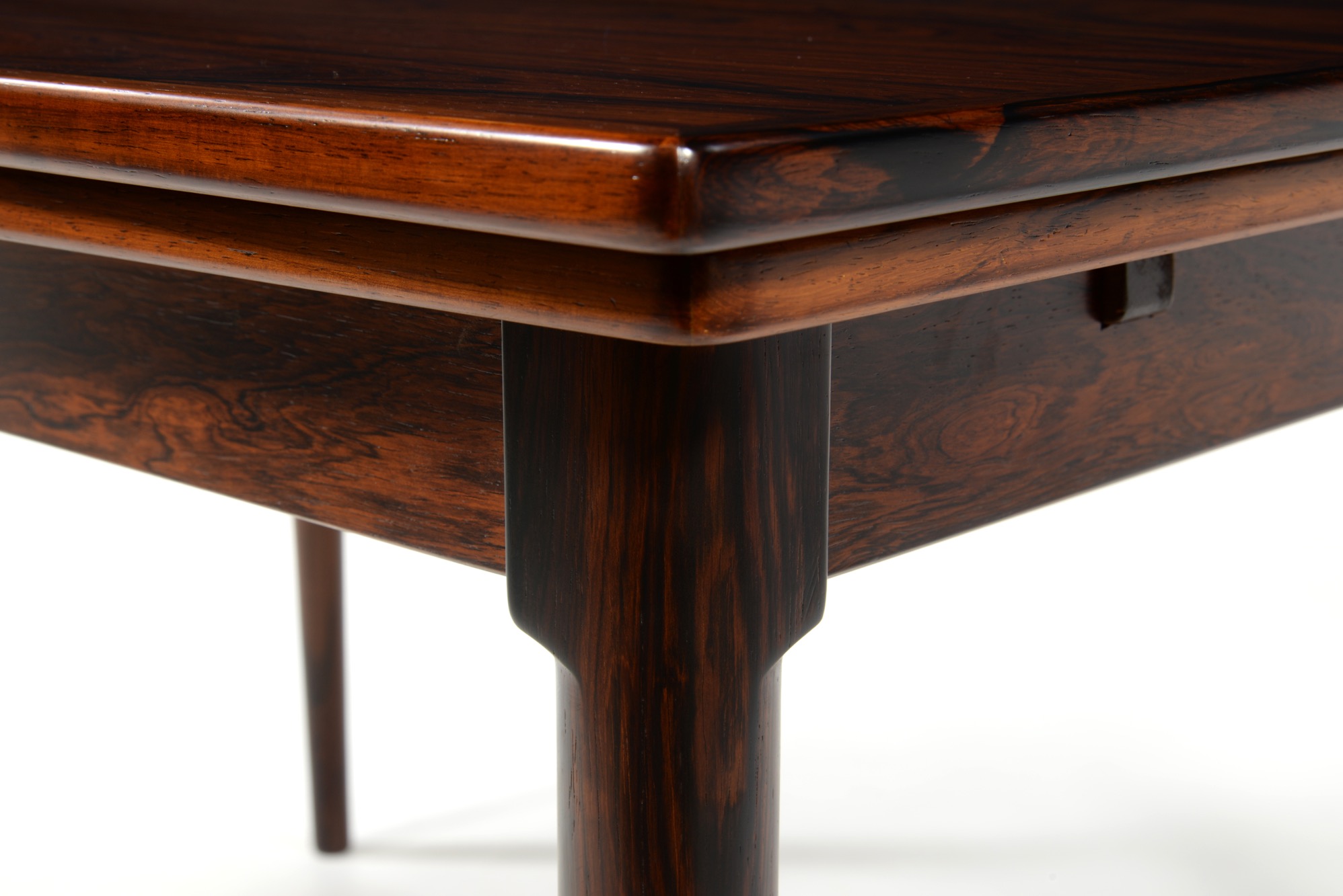 デンマーク製、1960年代に作られたエクステンション式のダイニングテーブルです。わずかに船形にシェイプされた天板は優雅な雰囲気のものです。主天板の両側面から伸張板を引き出し、天板面積を拡張することが可能です。工房等はわかっておりませんが、良い作りのテーブルです。