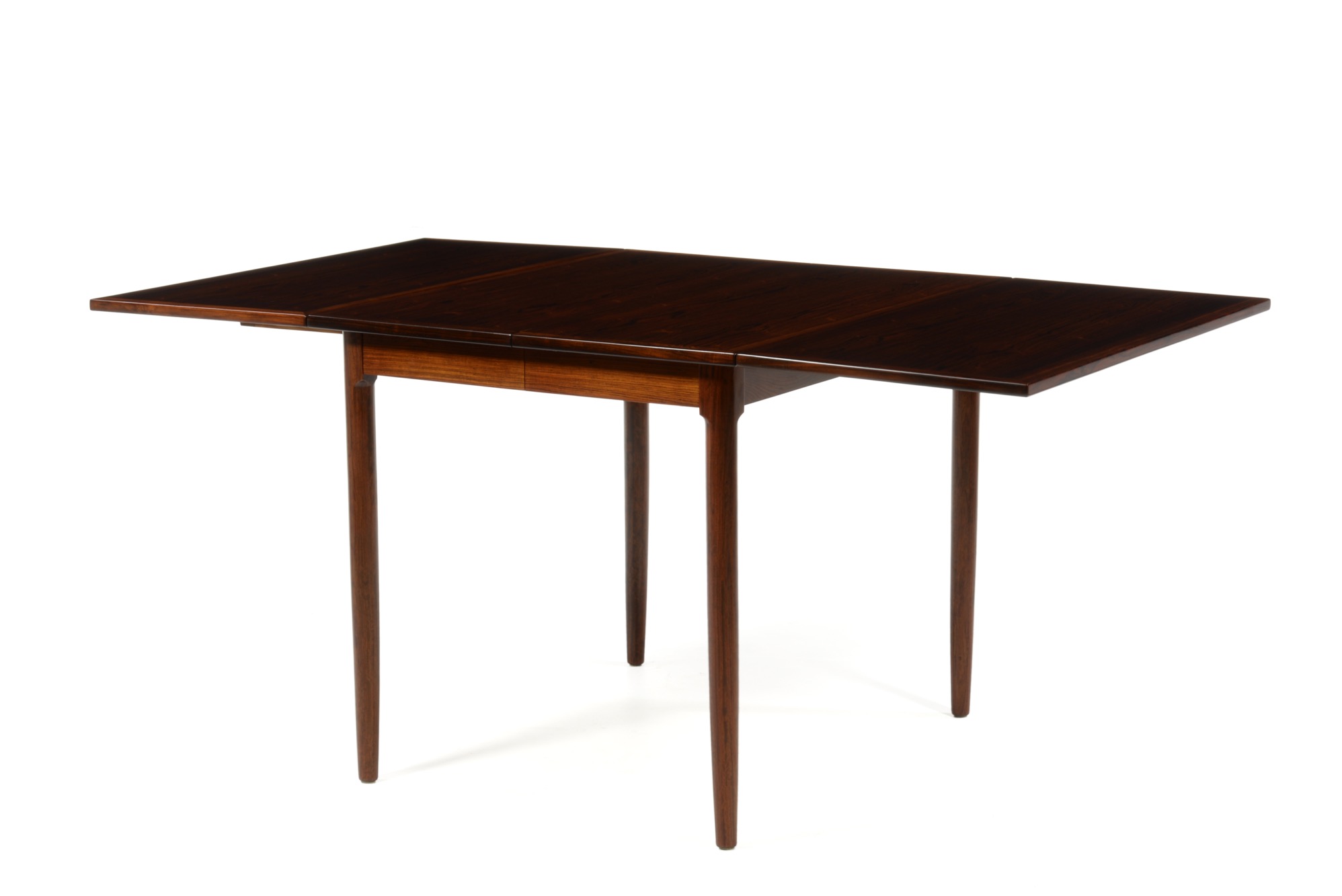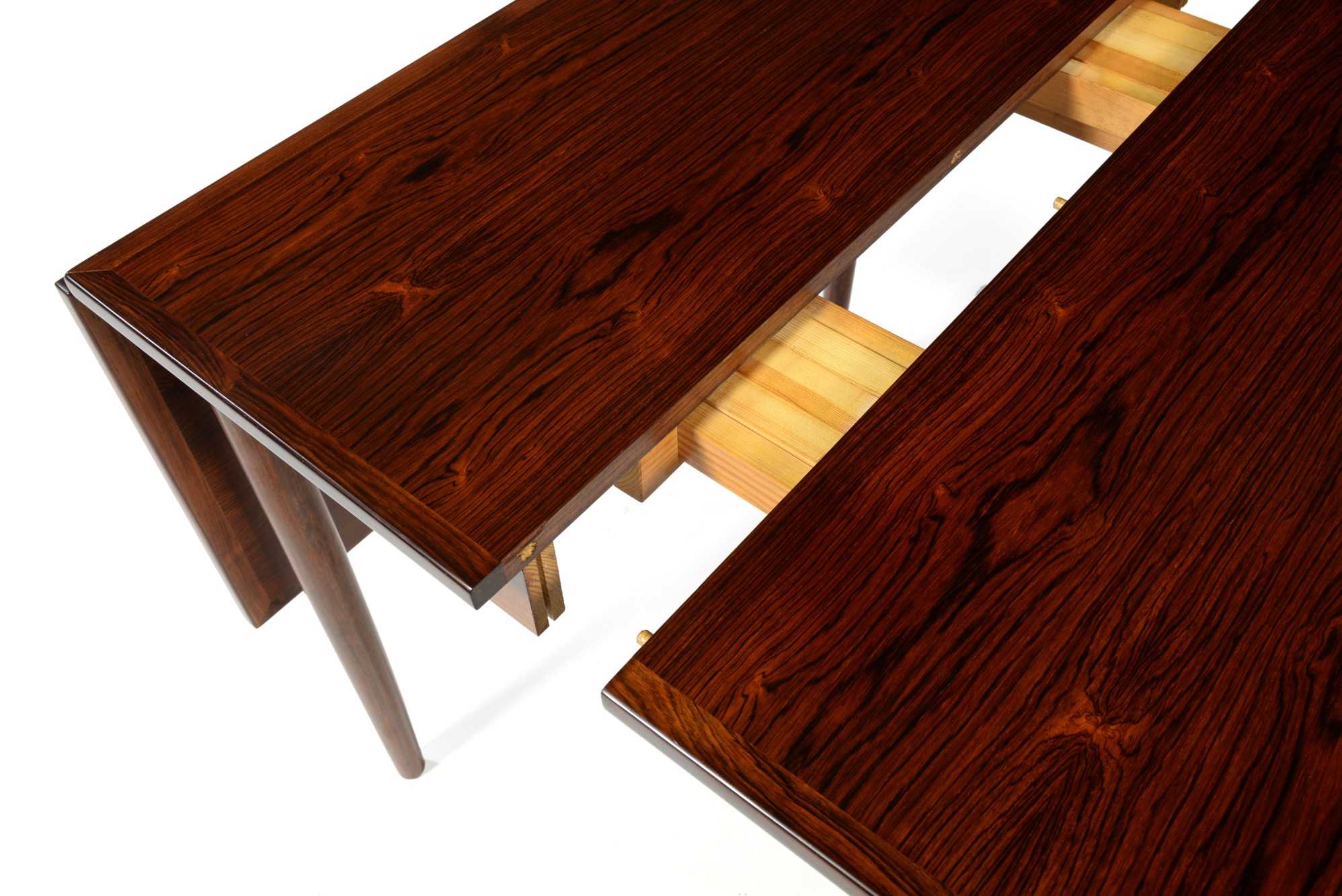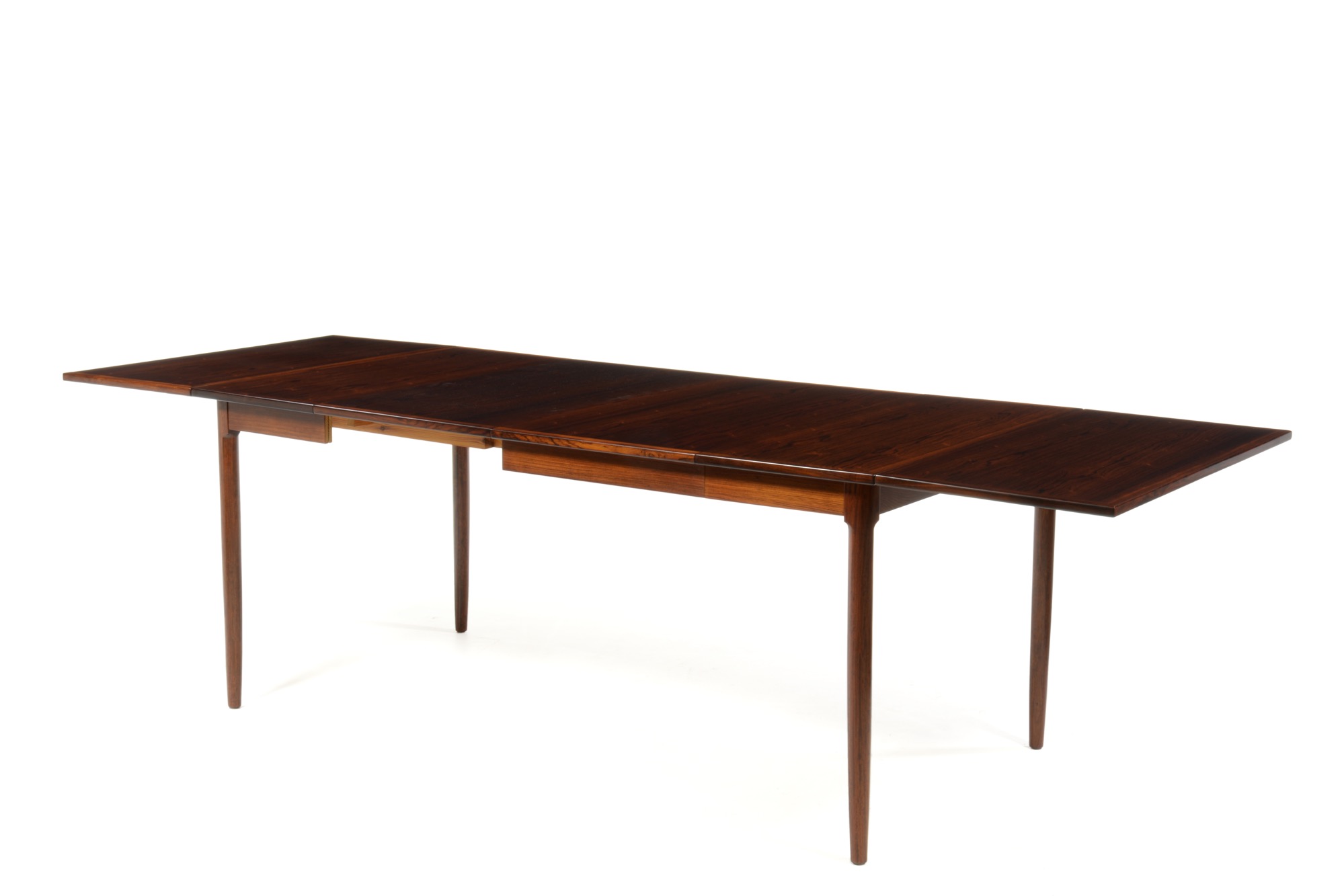 デンマーク製、1960年代に作られたバタフライ伸張式のダイニングテーブルです。両側面に跳ね上げ式の伸張板が備わり、手軽に伸張が可能、不要な際には取り外すことも可能です。また、天板の中心にも伸張板が二枚付属し、最大で253センチまで伸ばすことができます。名のある工房が手がけたと思われる、作りの良いテーブルです。