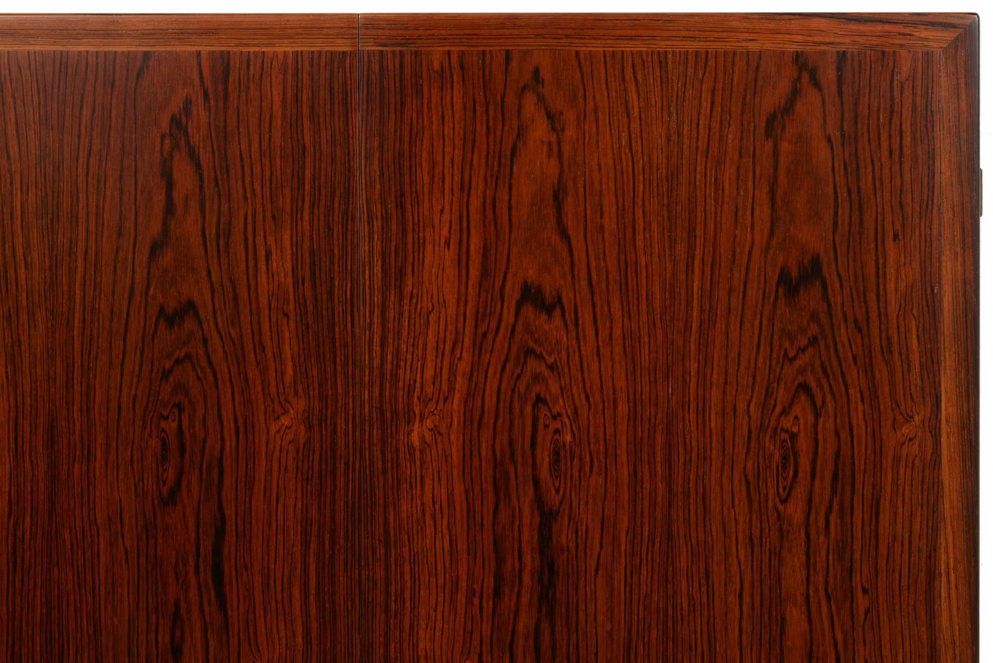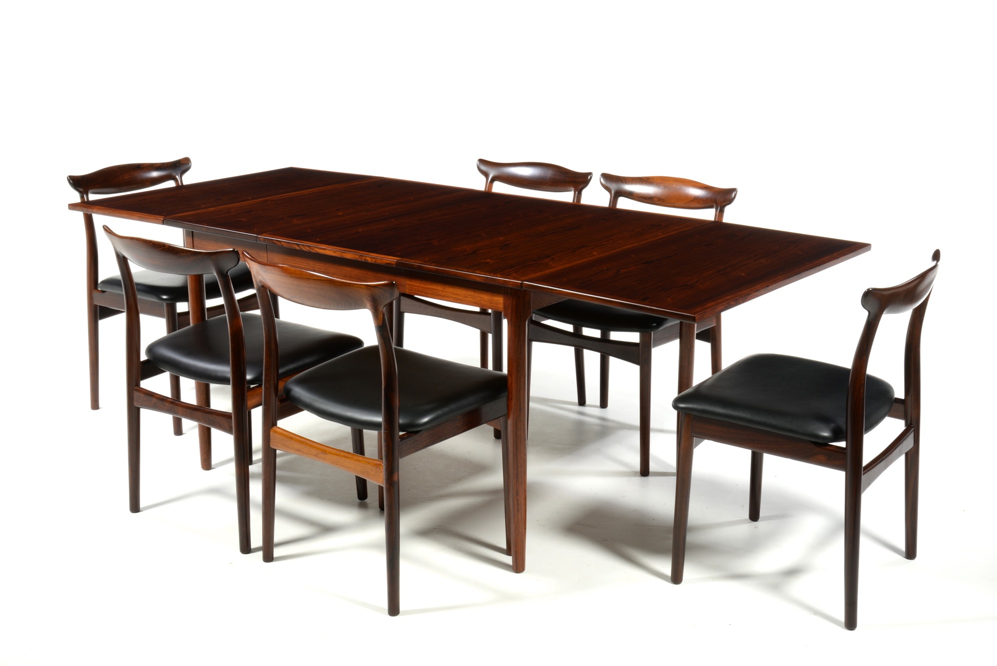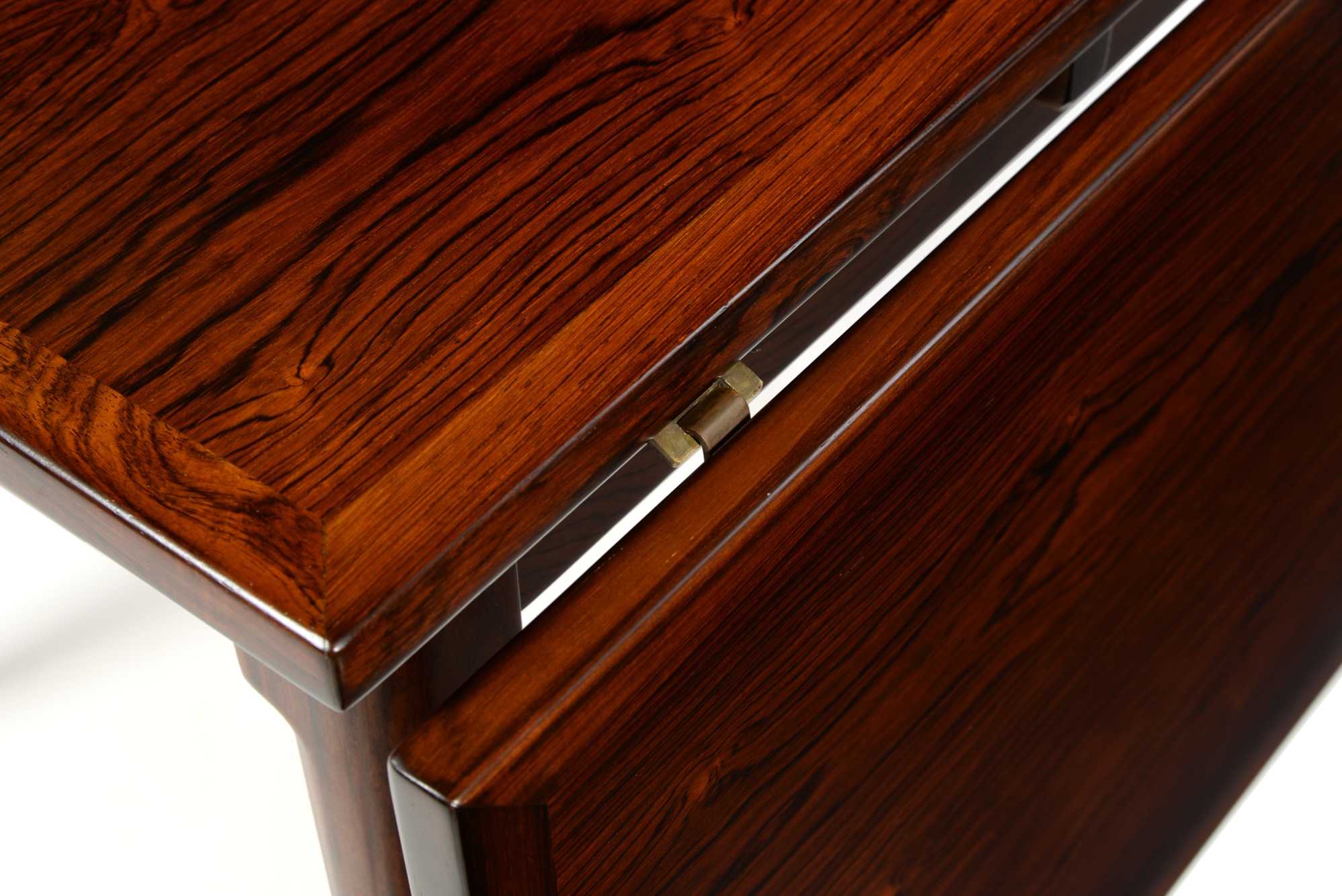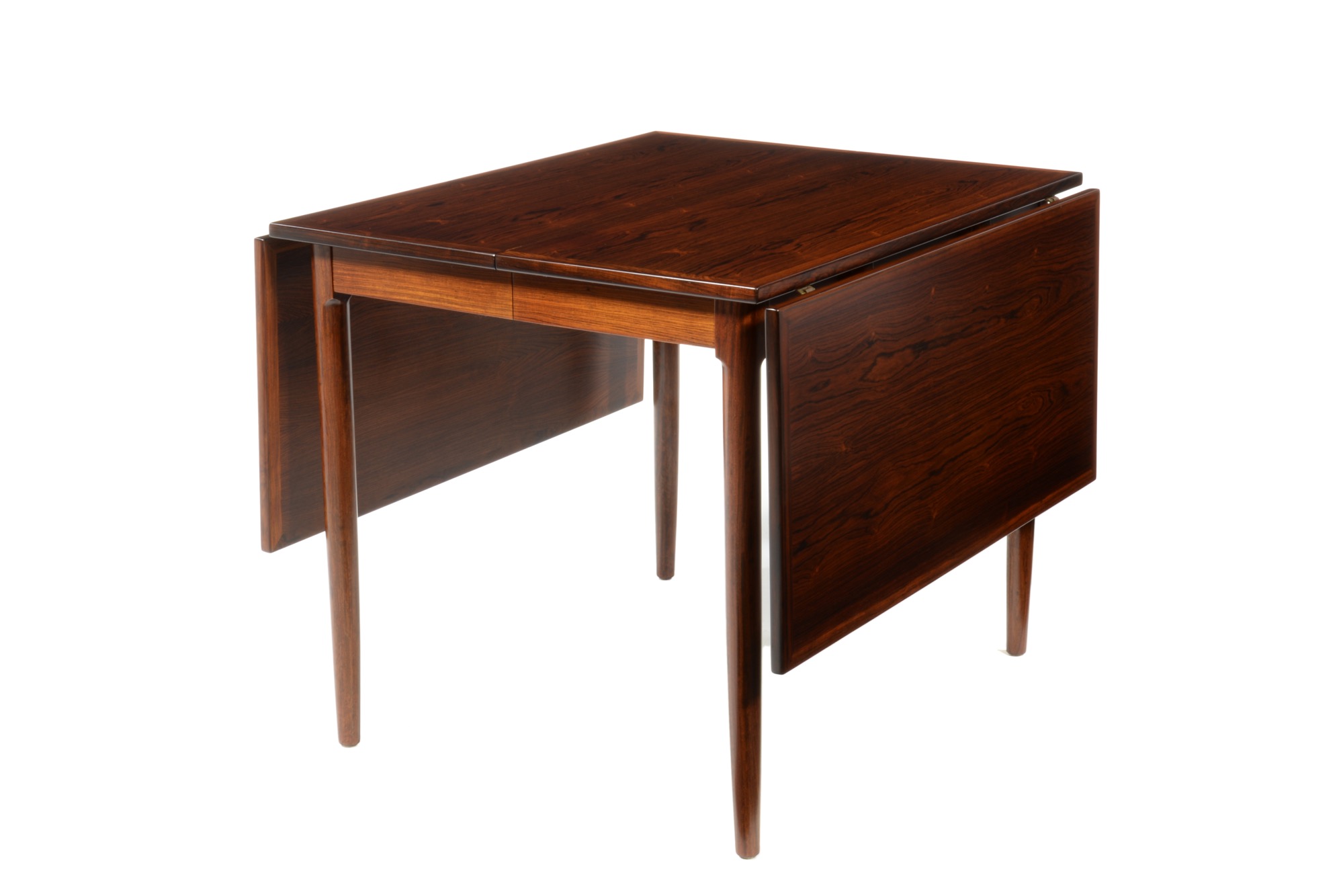 デンマーク製、1960年代に作られたバタフライ伸張式のダイニングテーブルです。両側面に跳ね上げ式の伸張板が備わり、手軽に伸張が可能、不要な際には取り外すことも可能です。また、天板の中心にも伸張板が二枚付属し、最大で253センチまで伸ばすことができます。名のある工房が手がけたと思われる、作りの良いテーブルです。