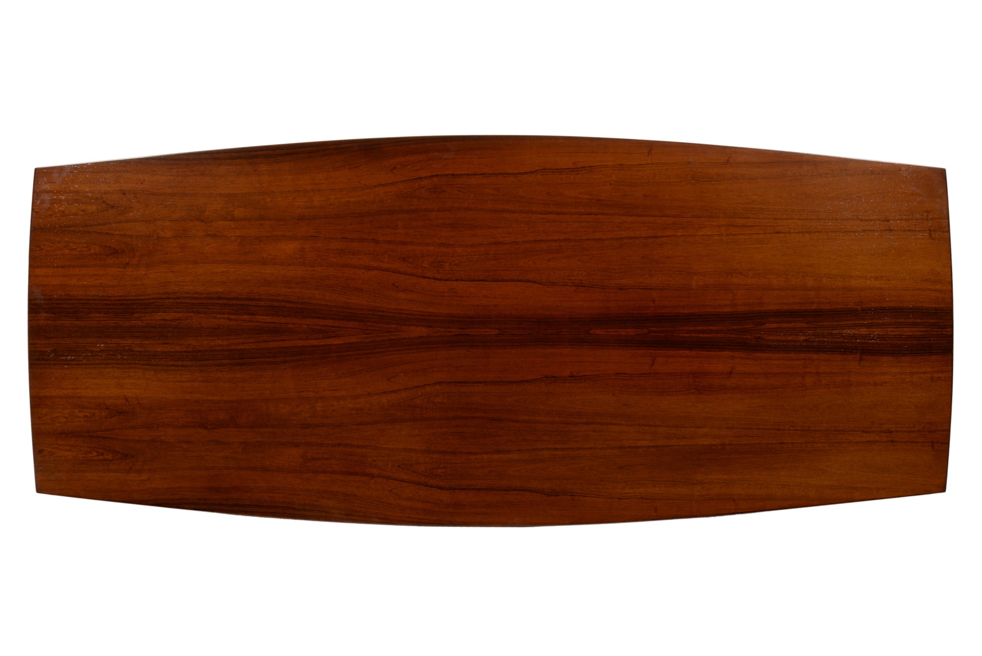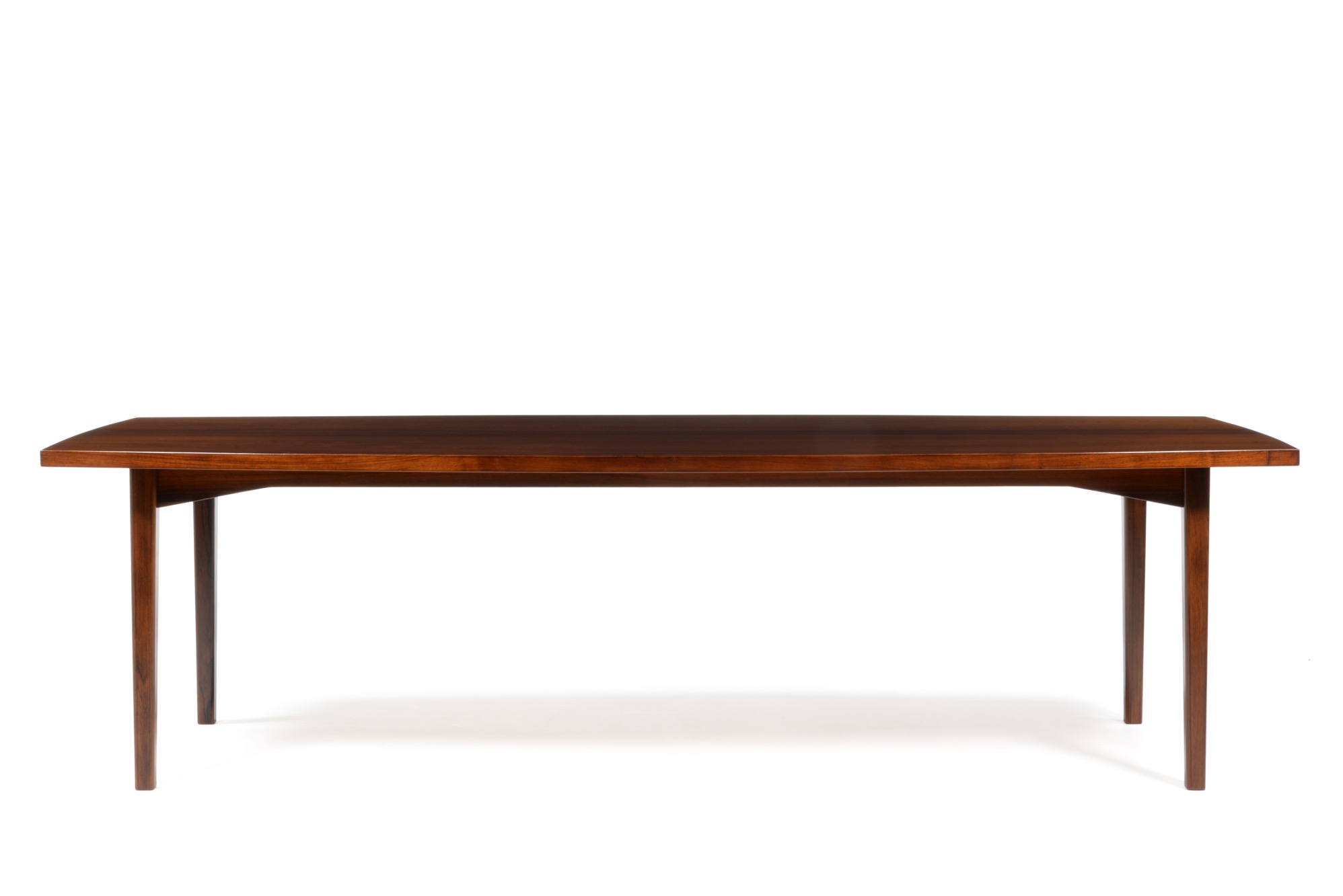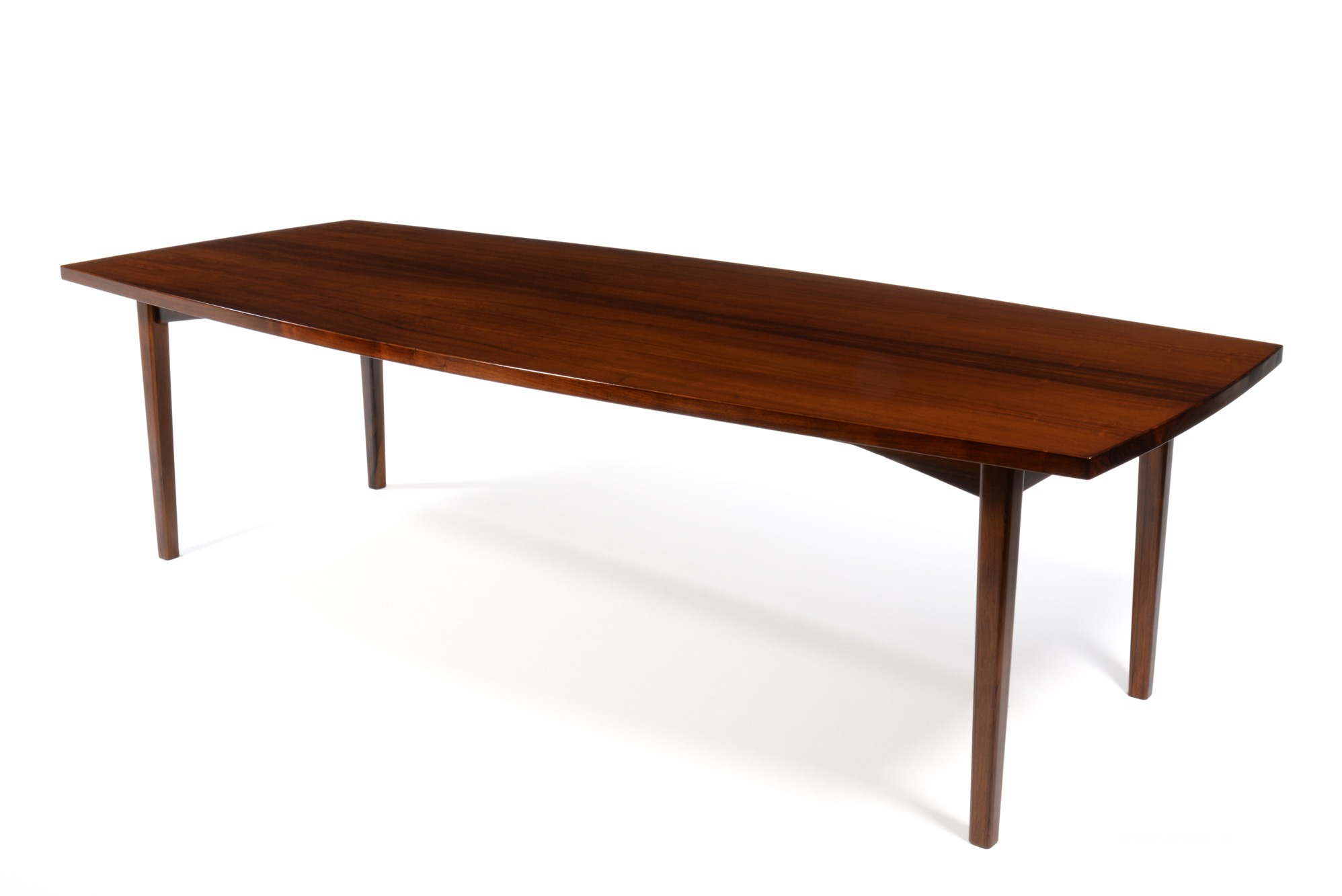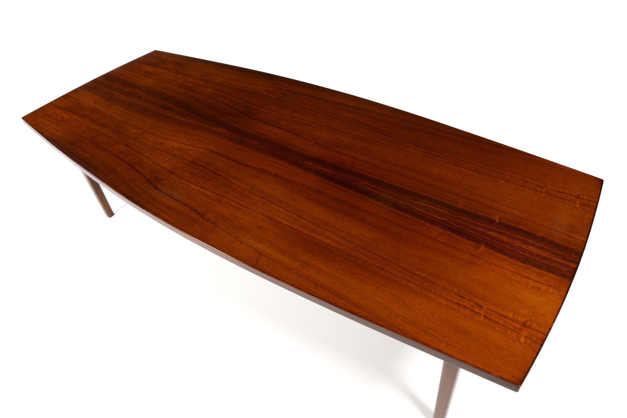エクストラロングのダイニングテーブルです。エクステンション式ではなく天板に継ぎはありません。天板は突き板、脚は無垢材です。情報に乏しく工房など詳細はわかっておりませんが、1960年代頃に作られたものでしょう。大きさ的に受注等で生産されたものと思われます。天板に現れた細かい年輪のローズウッドに見応えがあります。
