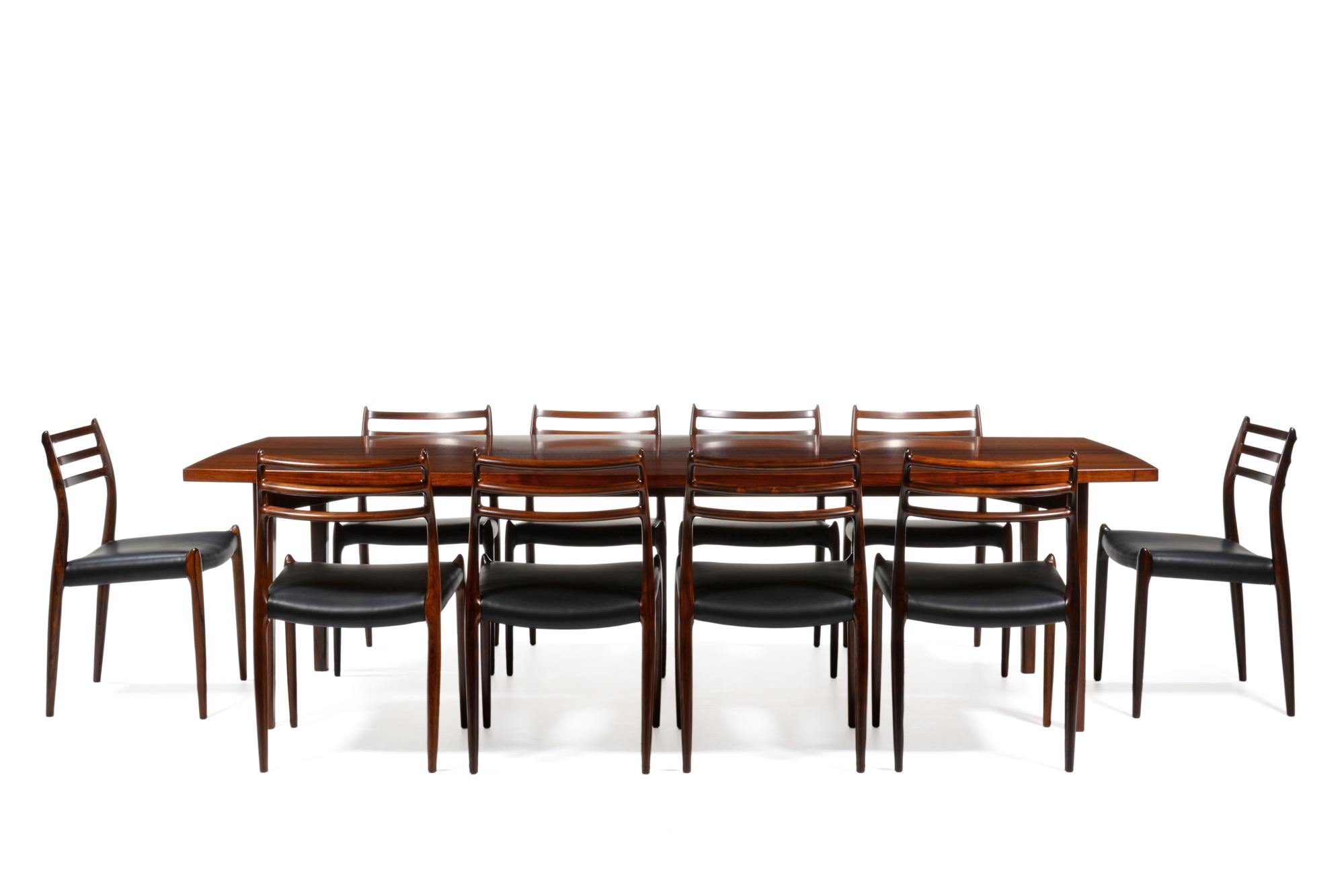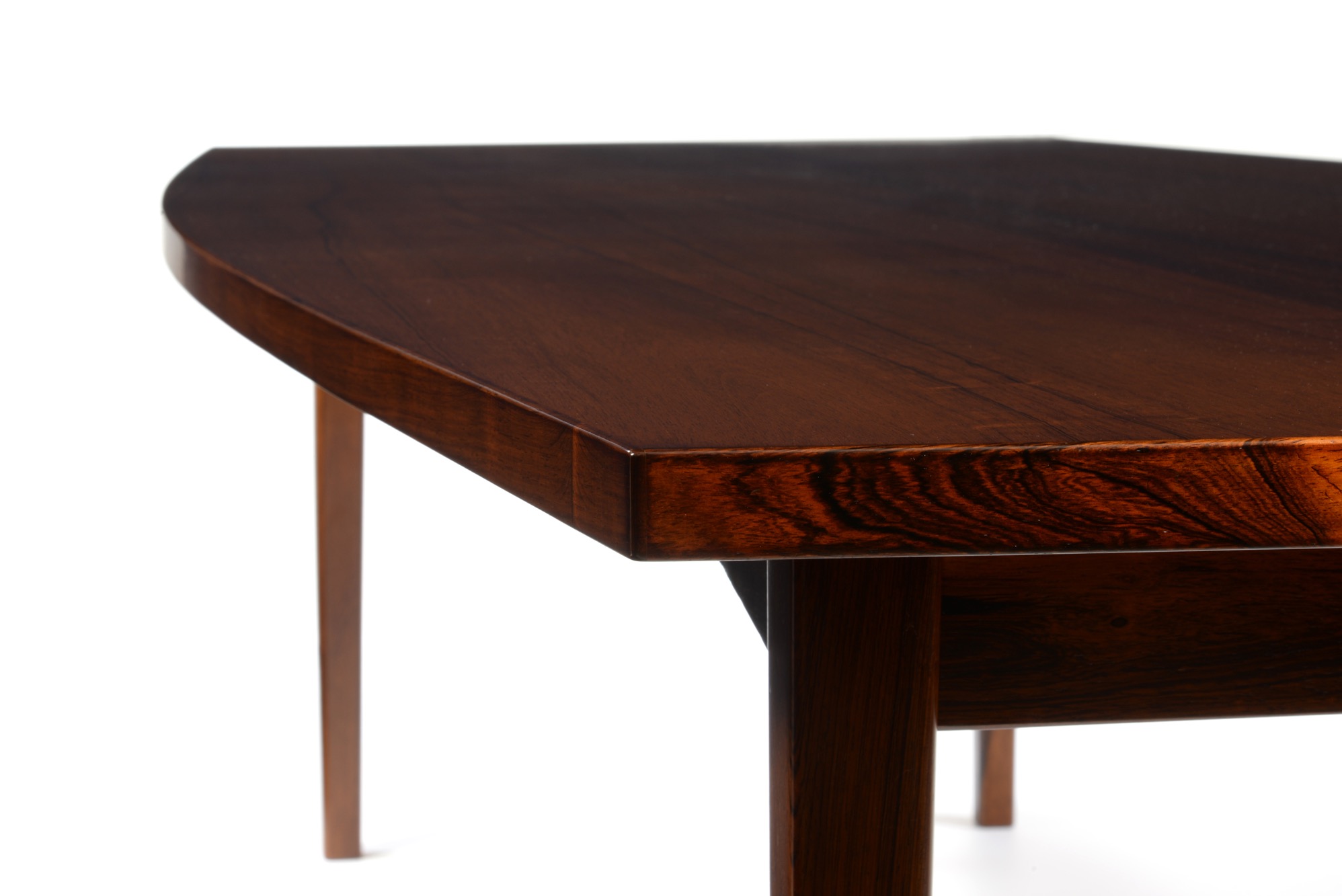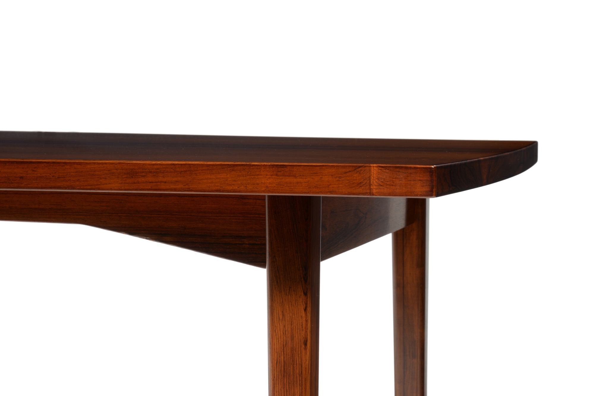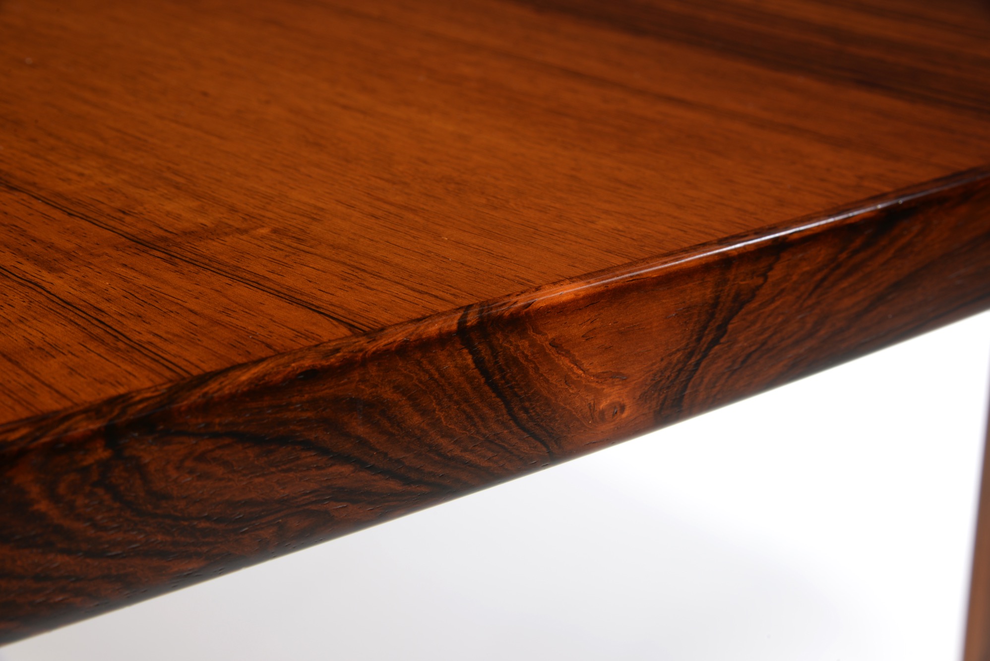 エクストラロングのダイニングテーブルです。エクステンション式ではなく天板に継ぎはありません。天板は突き板、脚は無垢材です。情報に乏しく工房など詳細はわかっておりませんが、1960年代頃に作られたものでしょう。大きさ的に受注等で生産されたものと思われます。天板に現れた細かい年輪のローズウッドに見応えがあります。