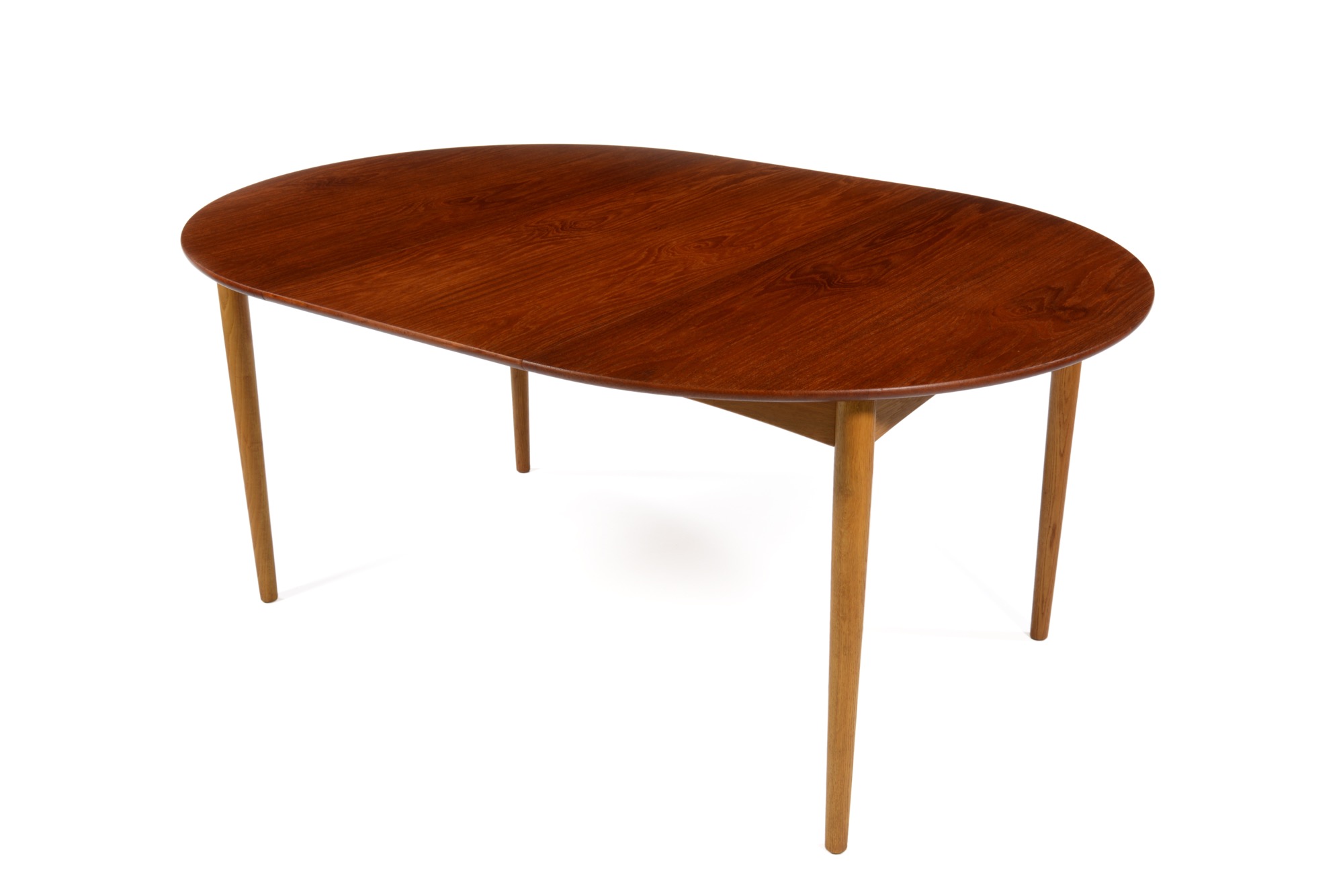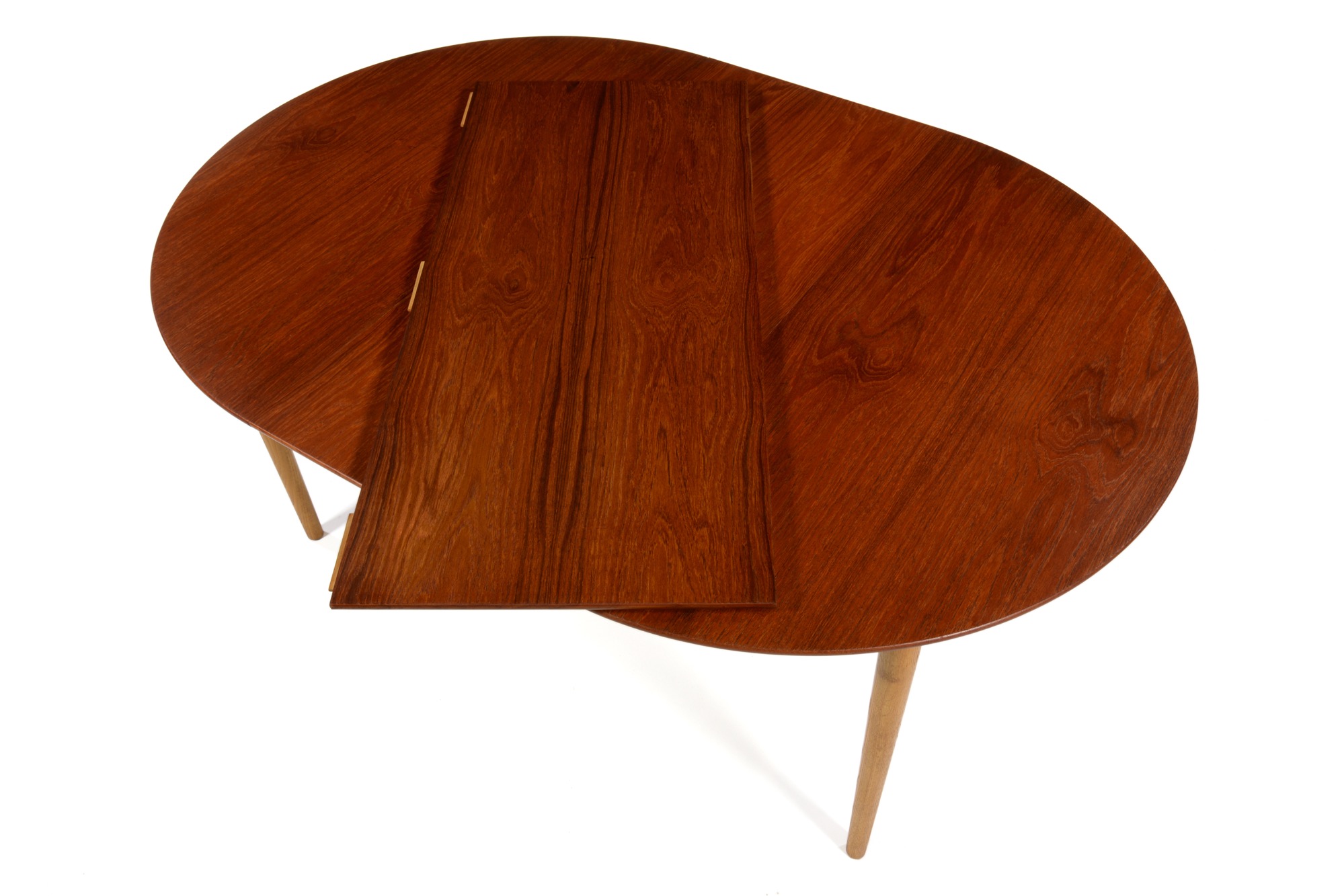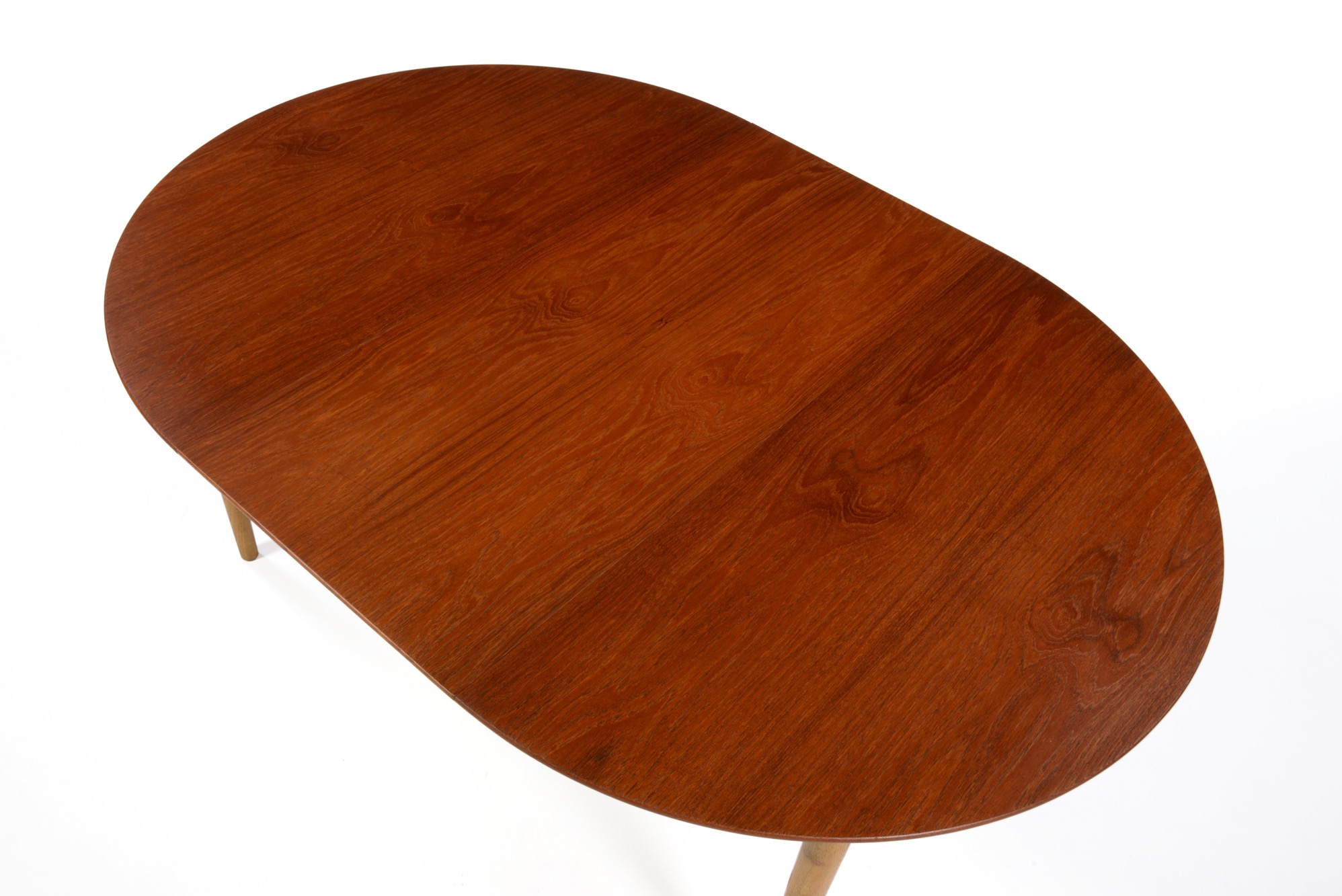 デンマークのデザイナー、Poul M. Volther/ポール・M・ヴォルザーによるものと思われますが、資料等に乏しく詳細はわかっておりません。作行きはしっかりとしており何れにしても遜色のないものです。1950年代頃に作られたもので、天板にチーク材、脚部にはオーク材を用いており、時代の様式が反映されています。伸張板が二枚付属し天板の面積が拡張できます。