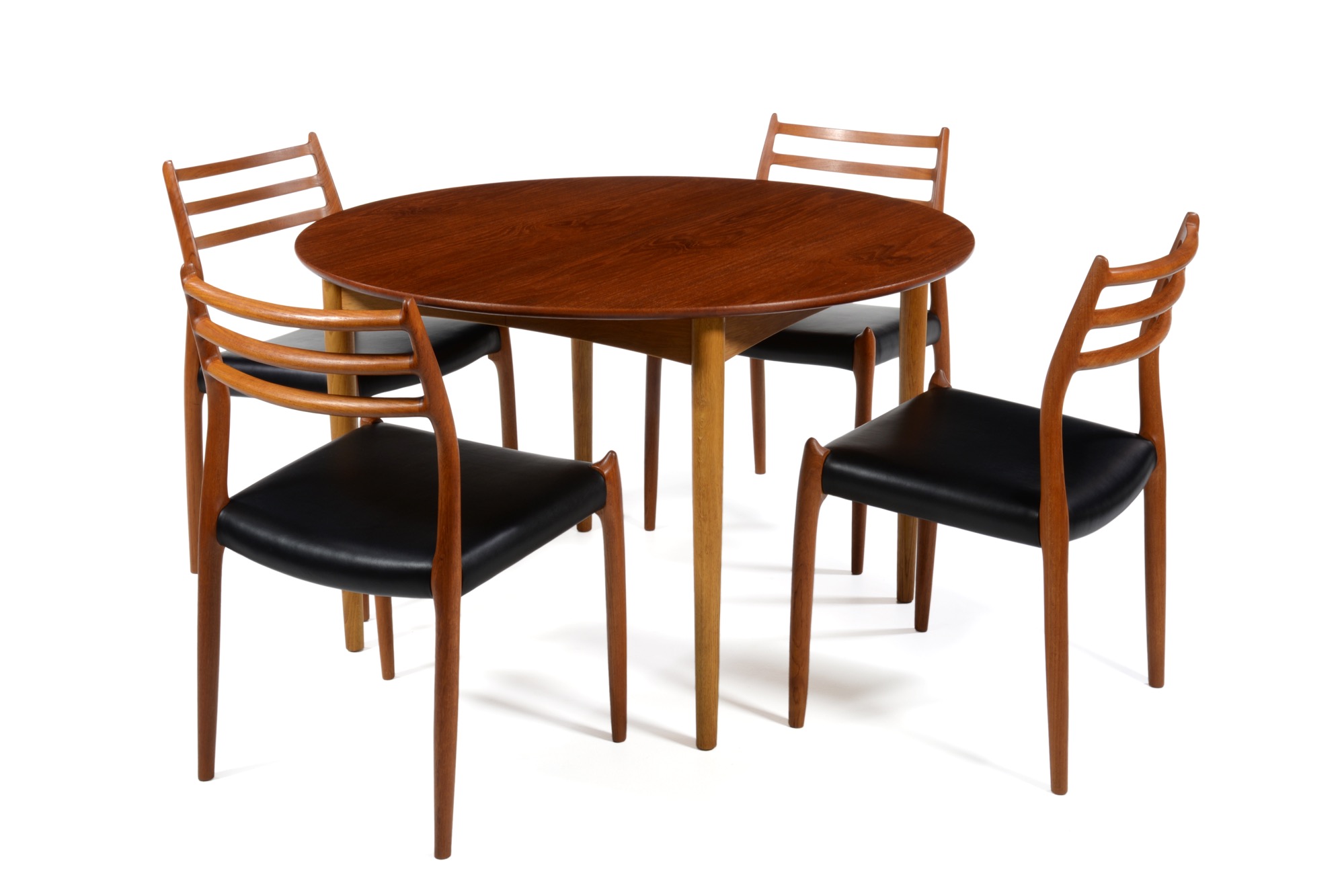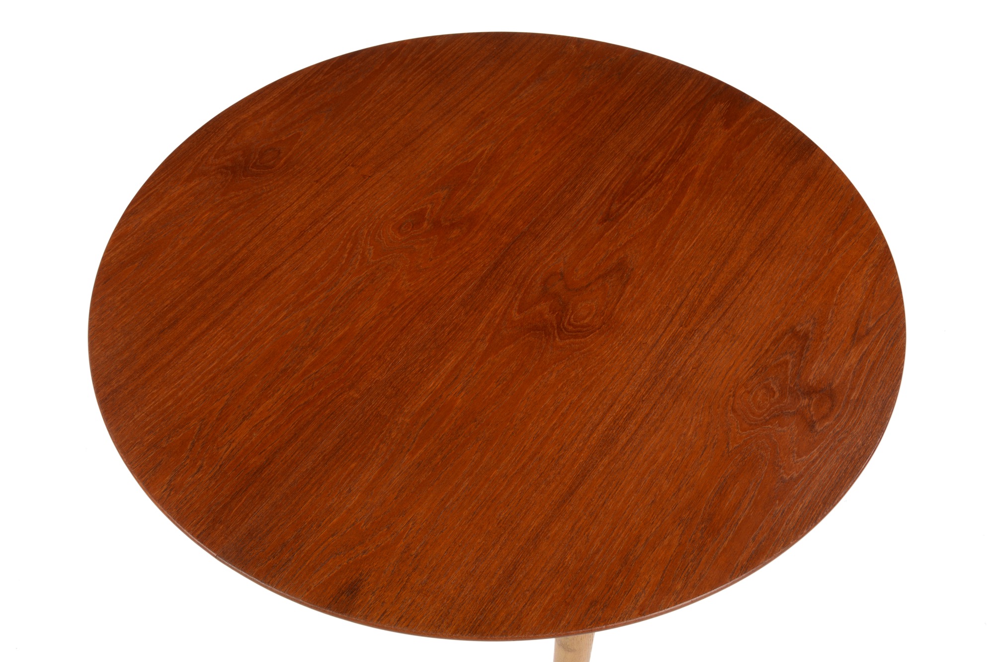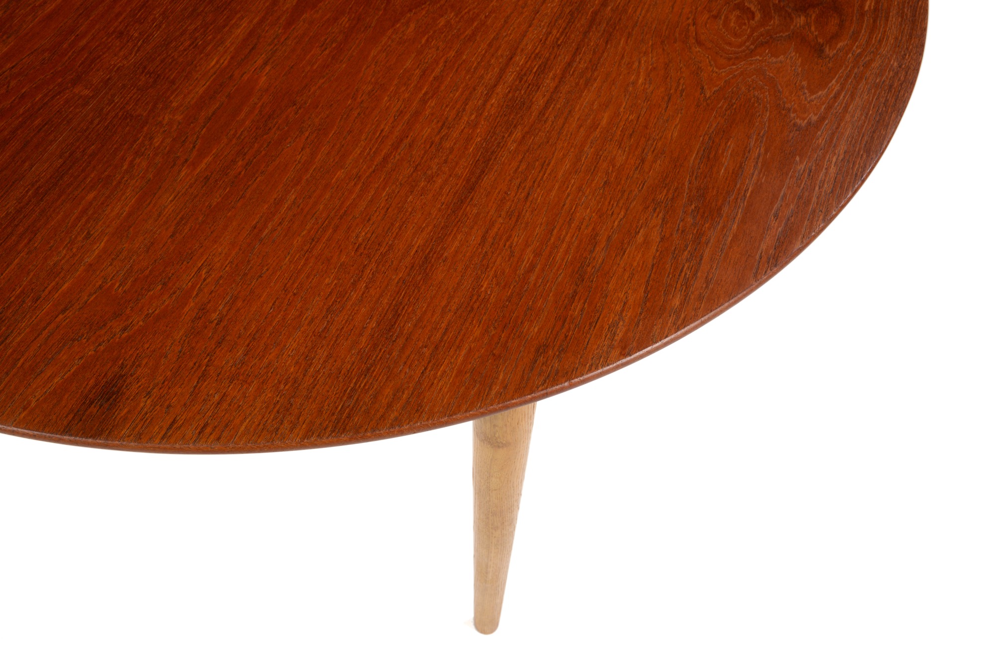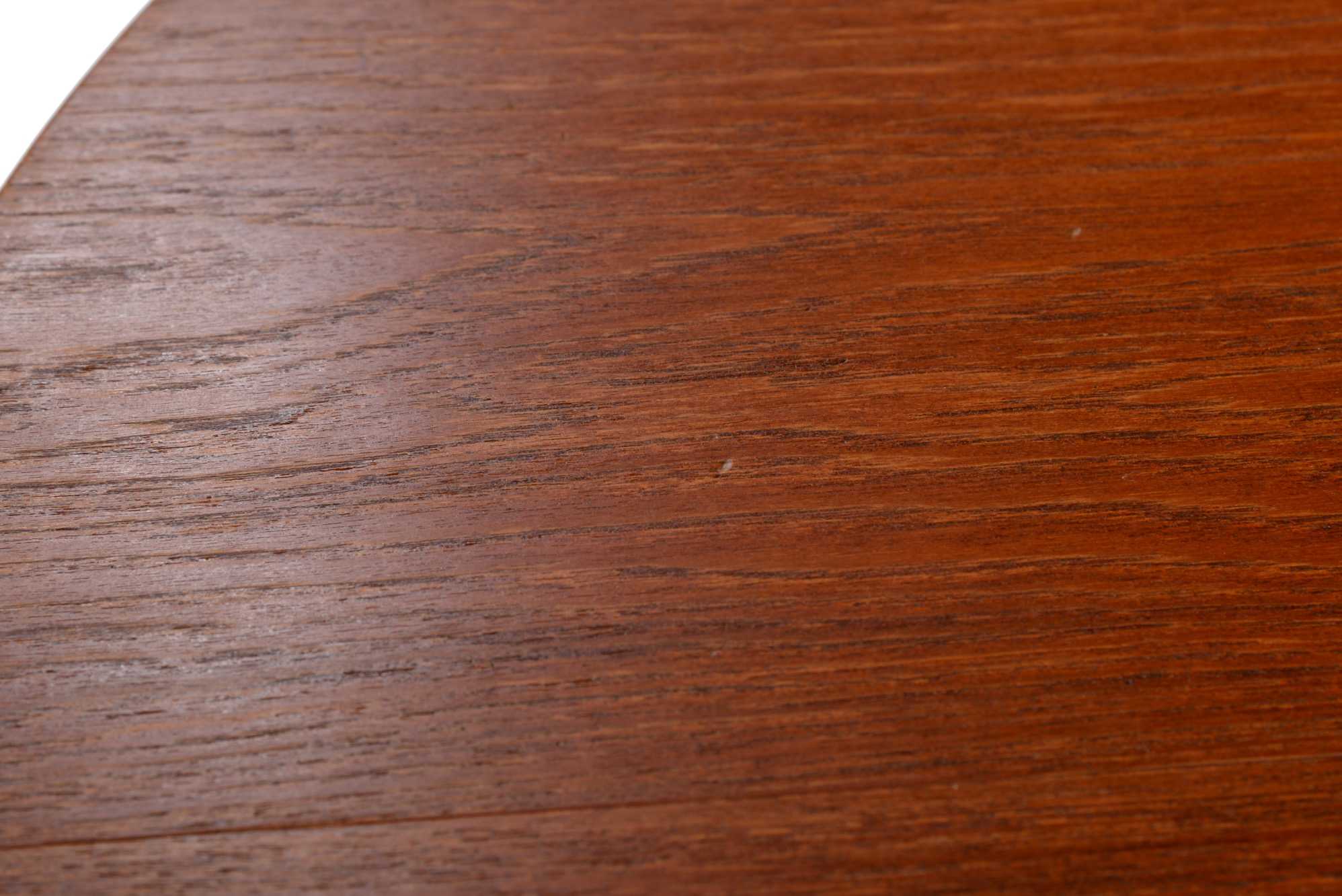 デンマークのデザイナー、Poul M. Volther/ポール・M・ヴォルザーによるものと思われますが、資料等に乏しく詳細はわかっておりません。作行きはしっかりとしており何れにしても遜色のないものです。1950年代頃に作られたもので、天板にチーク材、脚部にはオーク材を用いており、時代の様式が反映されています。伸張板が二枚付属し天板の面積が拡張できます。
