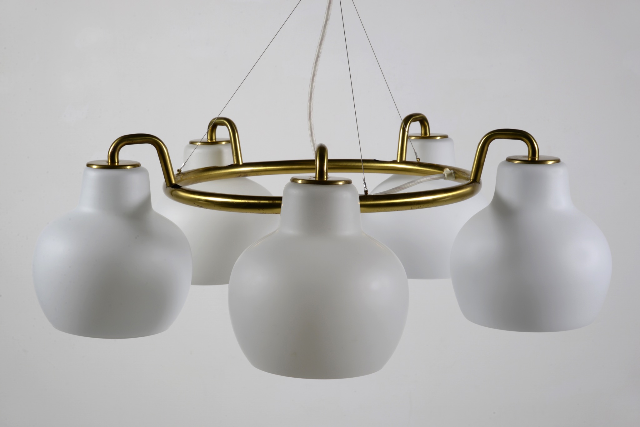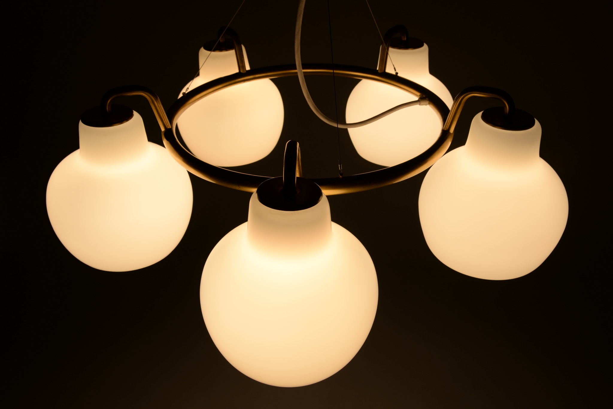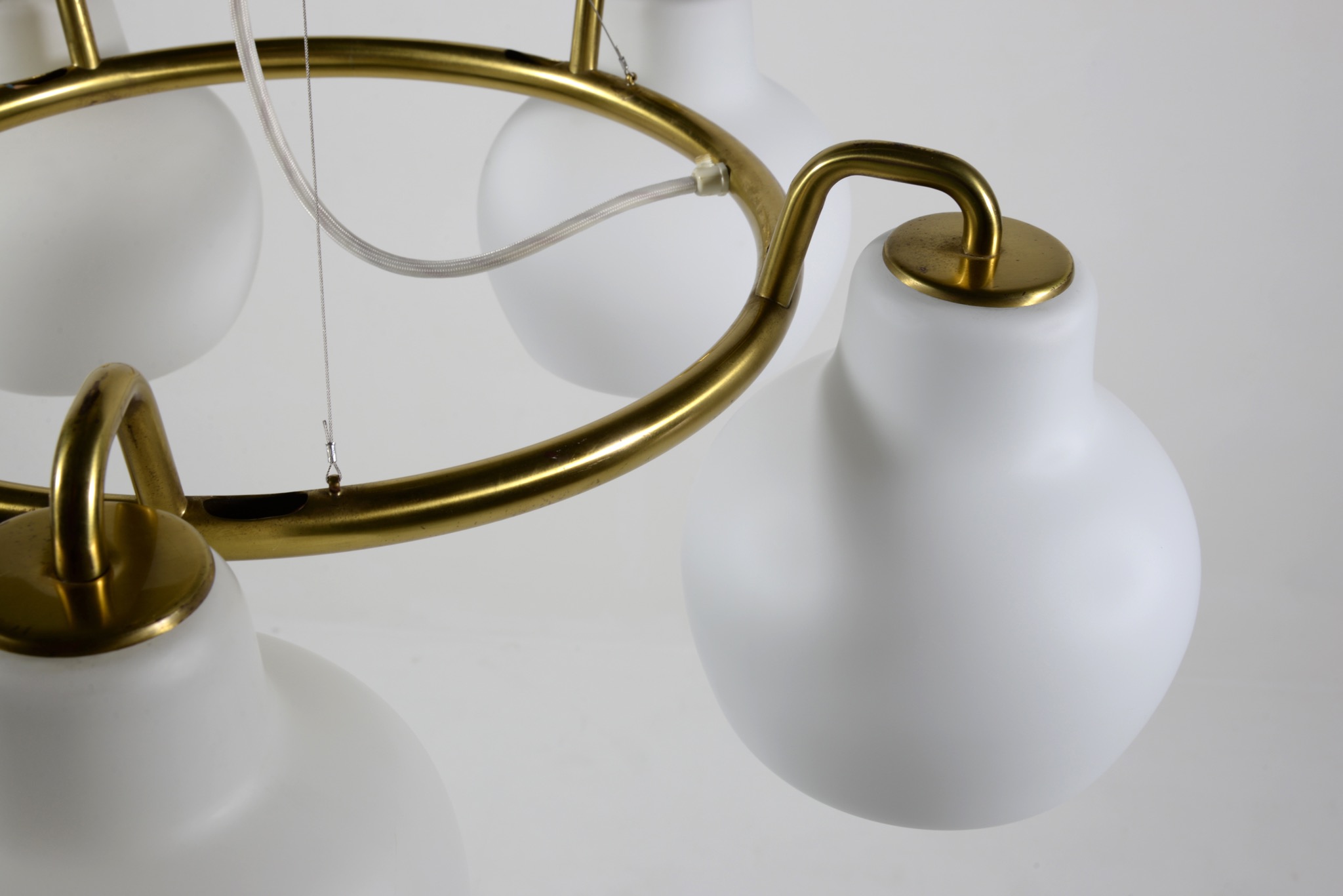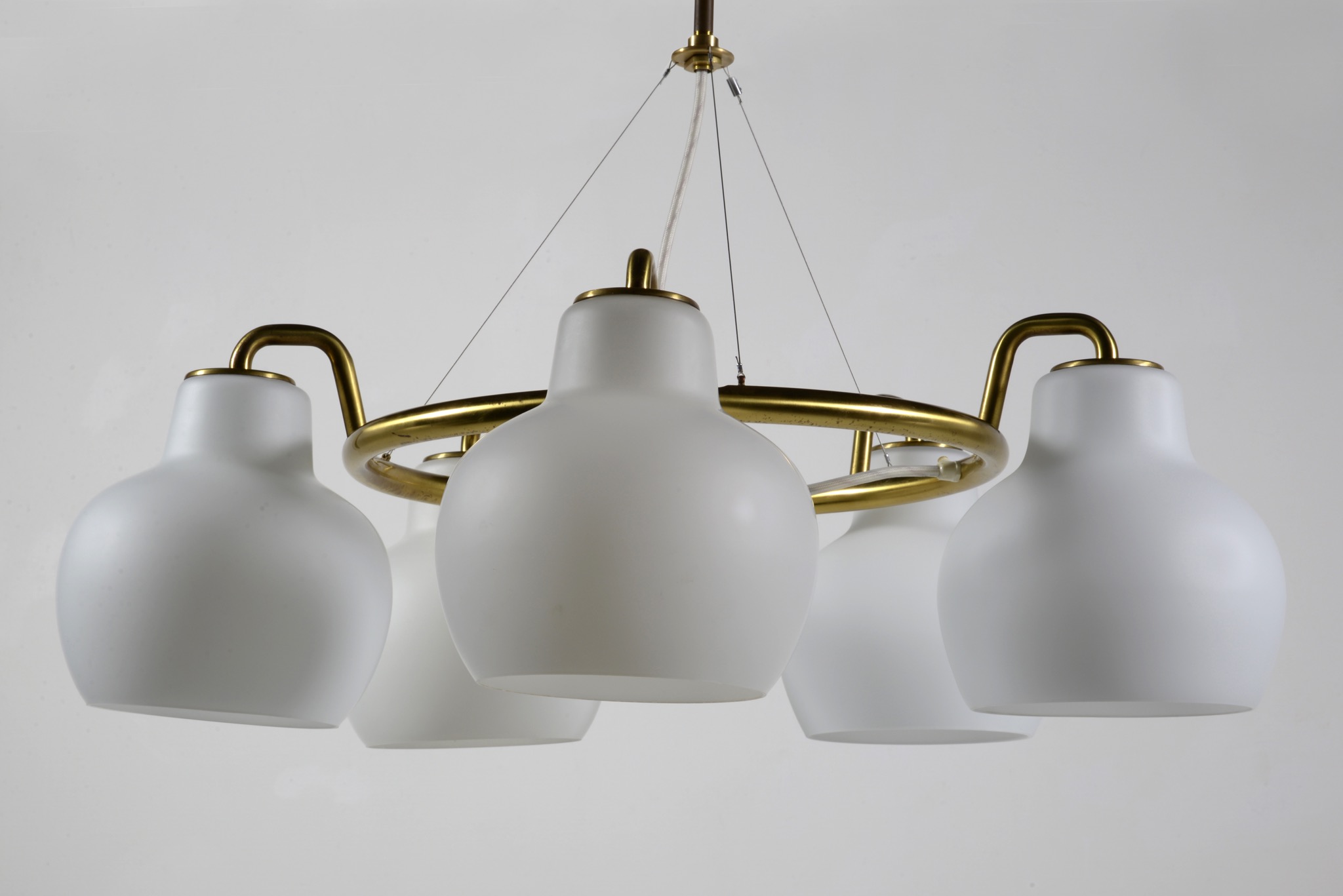 デンマークの建築家、Vilhelm Lauritzen/ヴィルヘルム・ラウリッツェンによる、Christiansborg/クリスチャンボー・シャンデリアです。シェードはつや消しのフロストタイプです。真鍮フレーム部分に経年による腐食が若干見られます。
