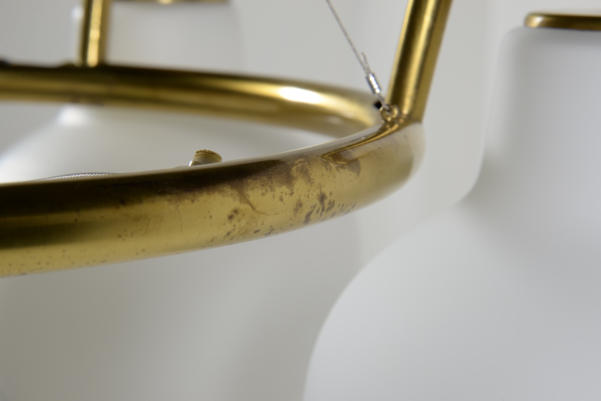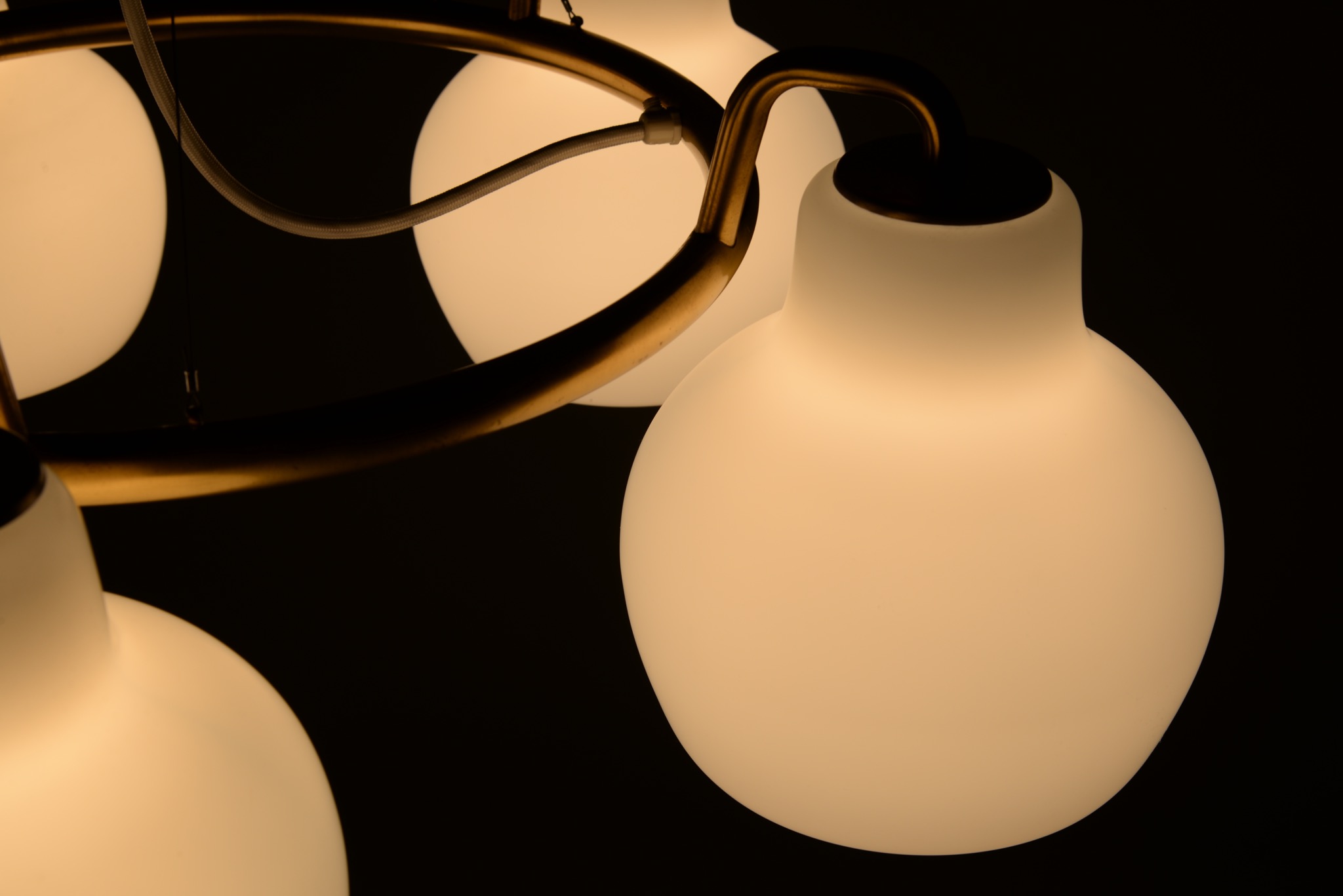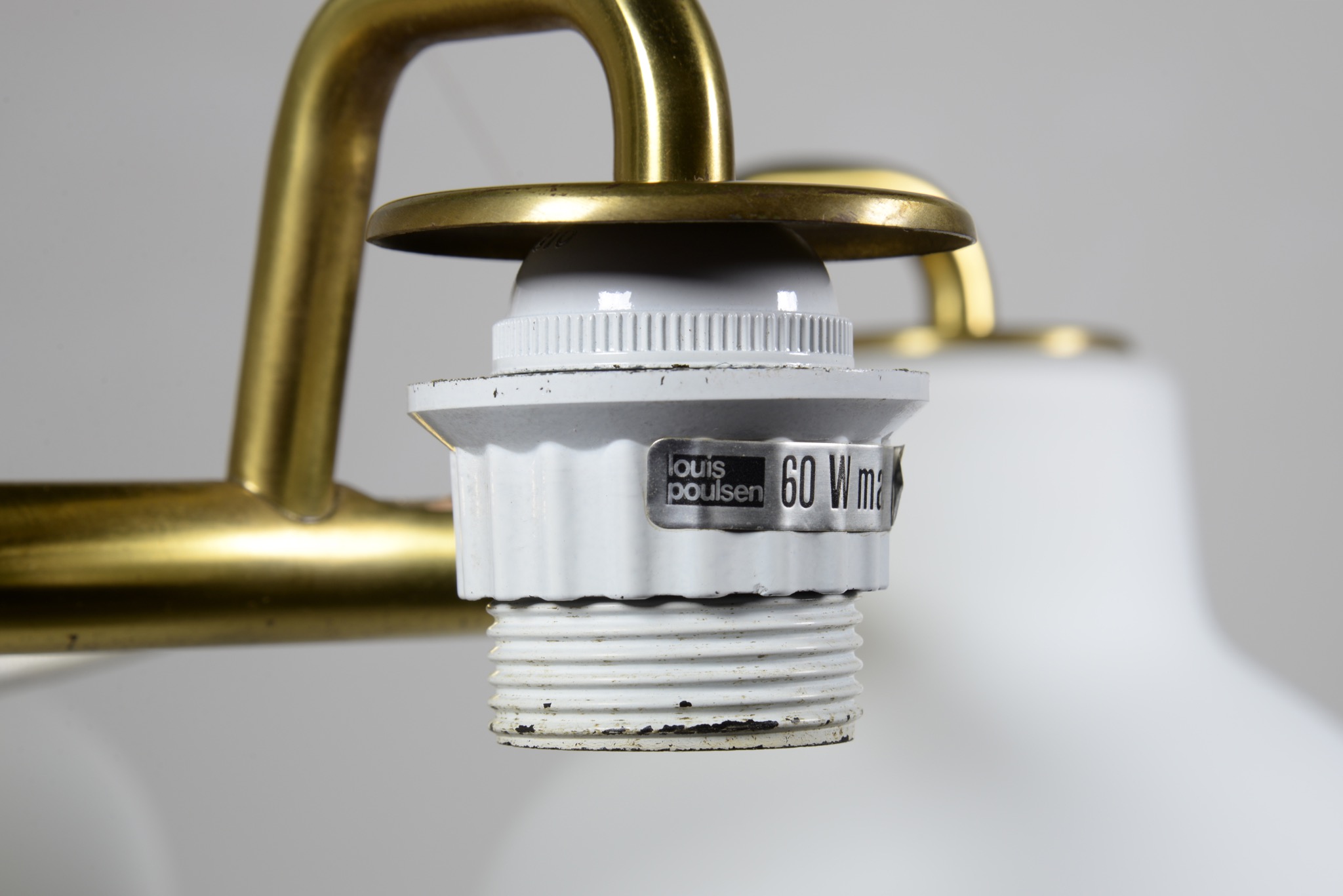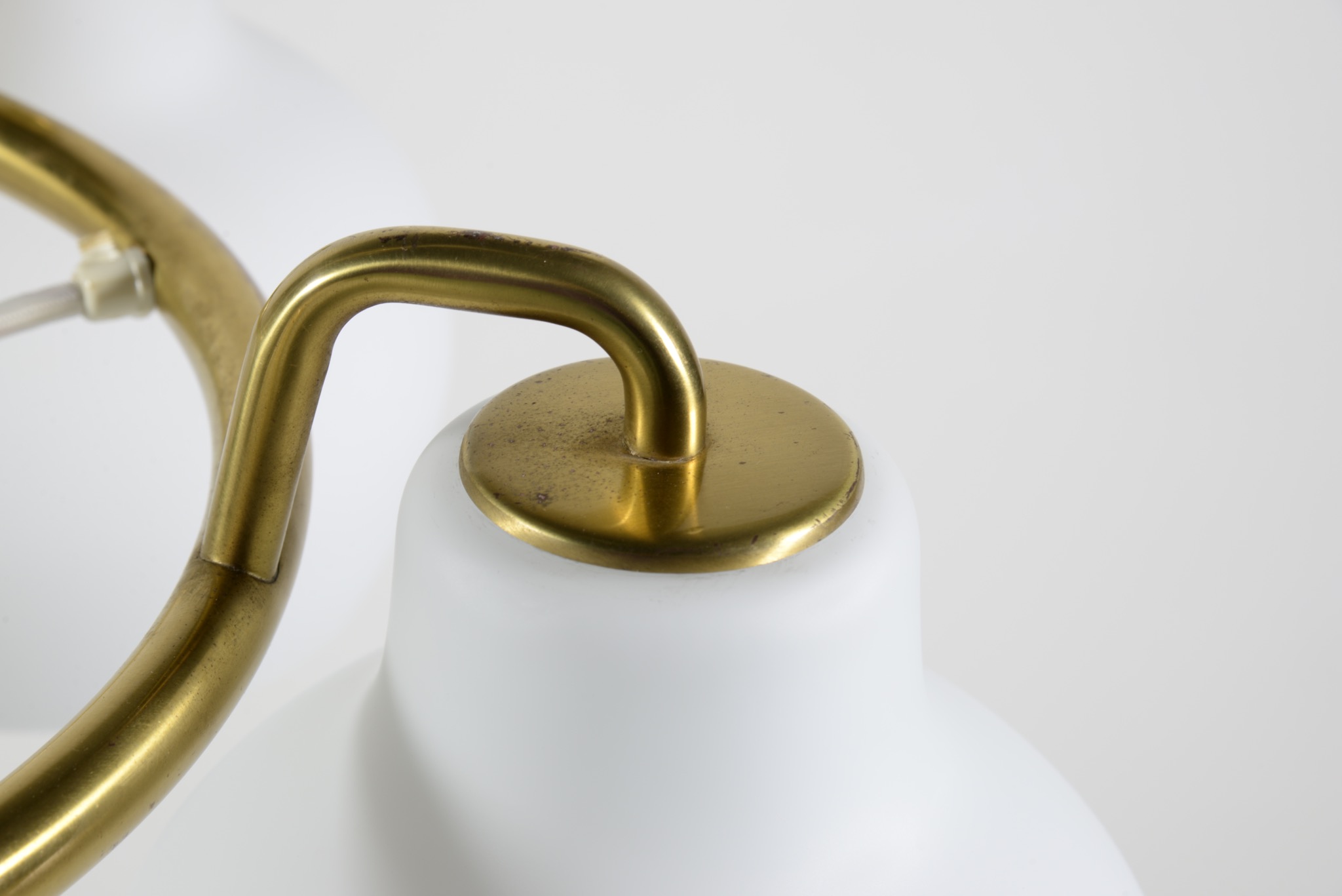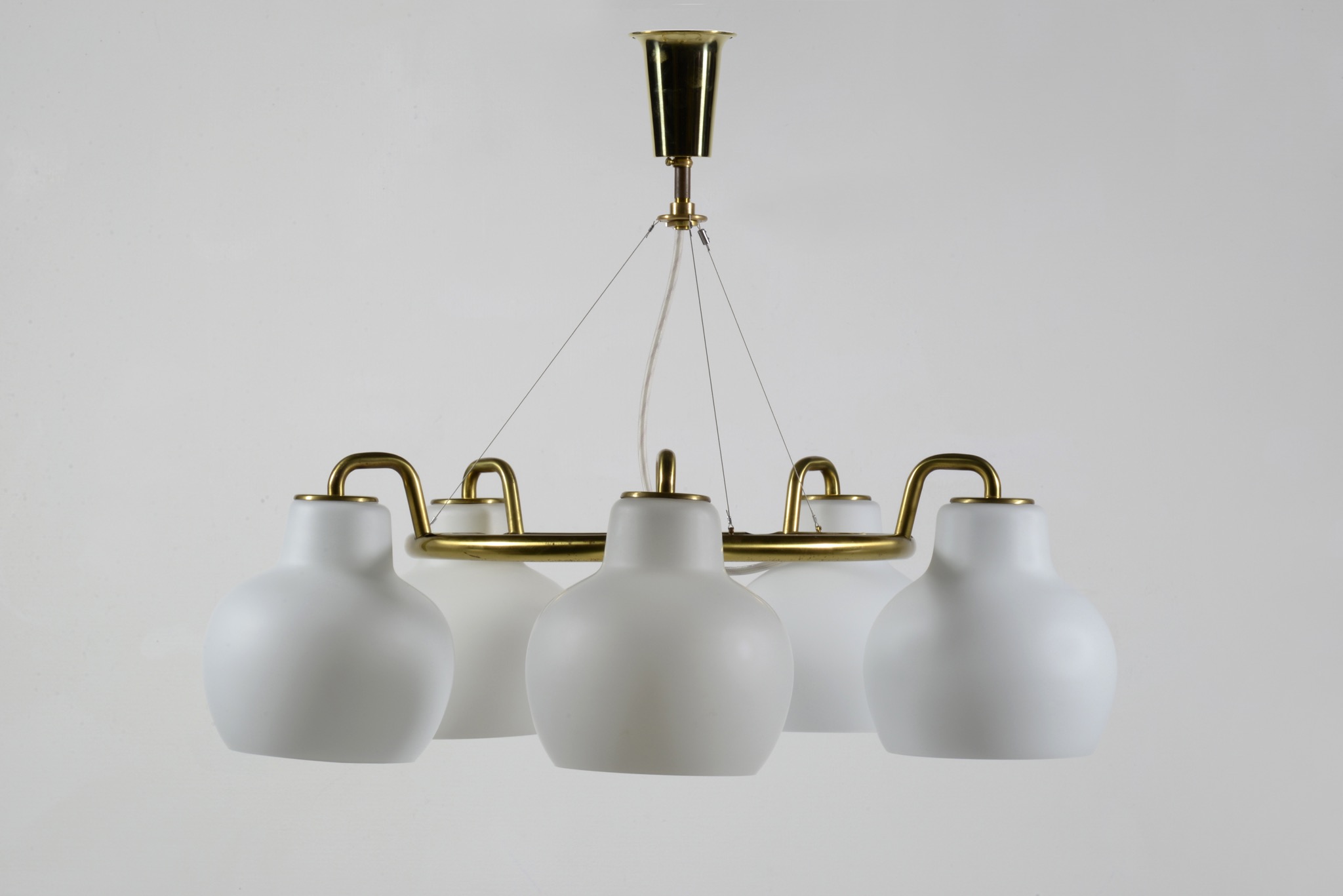 デンマークの建築家、Vilhelm Lauritzen/ヴィルヘルム・ラウリッツェンによる、Christiansborg/クリスチャンボー・シャンデリアです。シェードはつや消しのフロストタイプです。真鍮フレーム部分に経年による腐食が若干見られます。