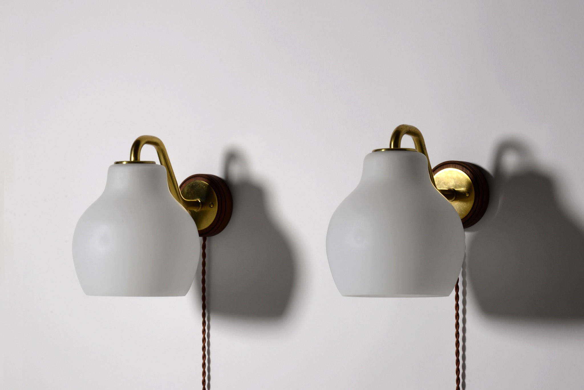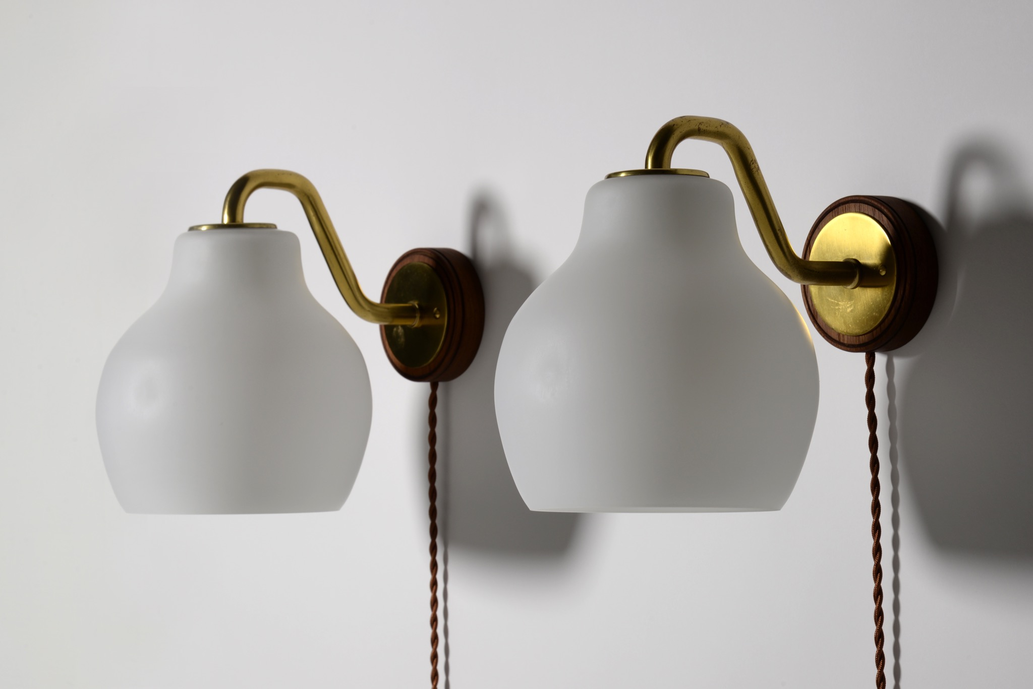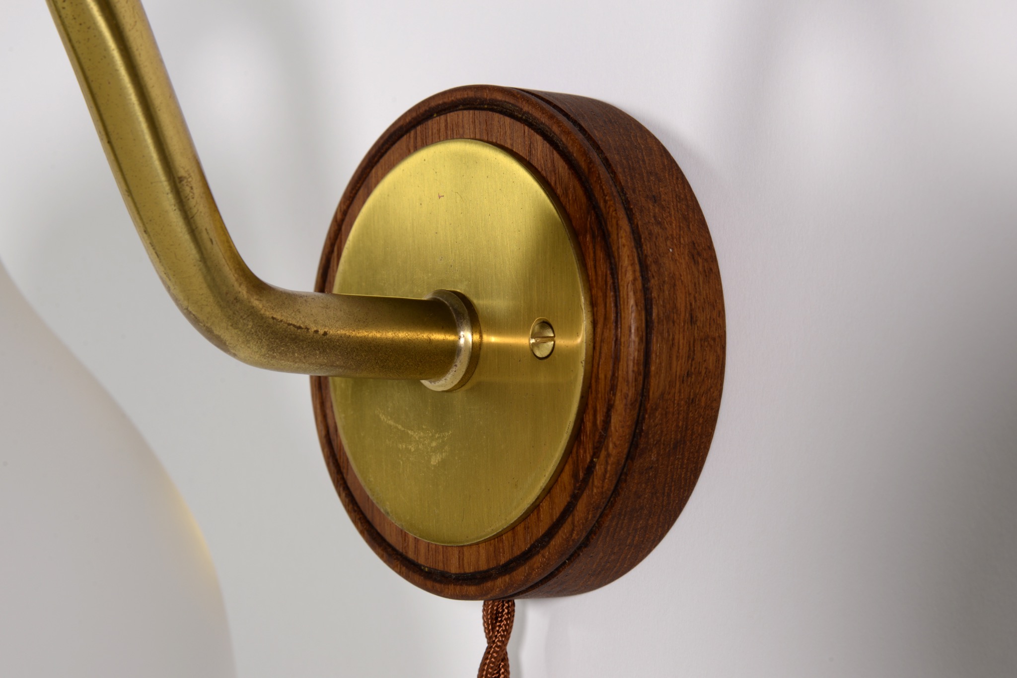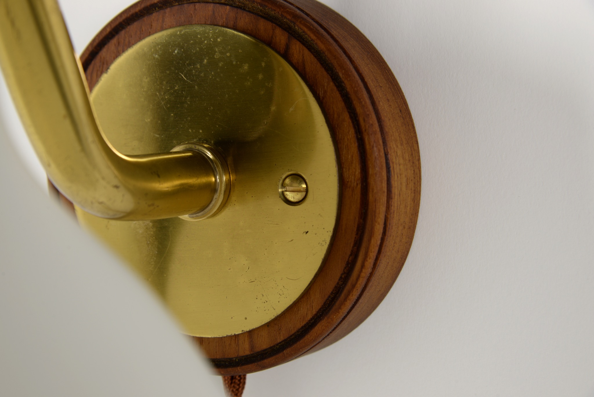 デンマークの建築家、Vilhelm Lauritzen/ヴィルヘルム・ラウリッツェンによるウォールランプ、一対です。真鍮のフレームにフロストガラスのシェードが備わりますが、シェードはよく見かけるものと少し異なる形状で、くぼみは緩くおおらかなデザインとなります。ガラスの状態は良好ですが、真鍮のフレームに若干の腐食が見られます。チーク材の台座は専門職にて製作したもので、キーホールフックで壁面に固定でき、壁埋め配線にも対応可能です。
