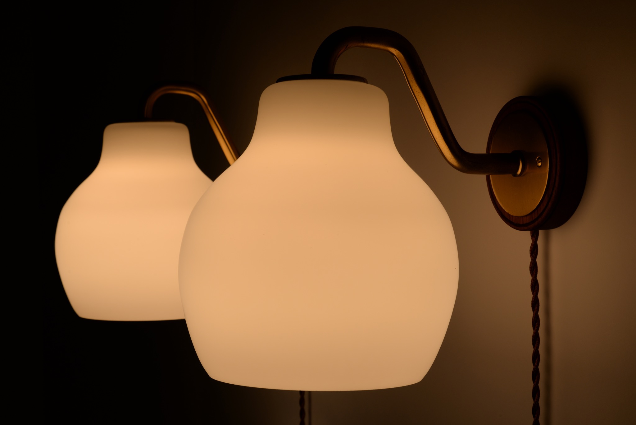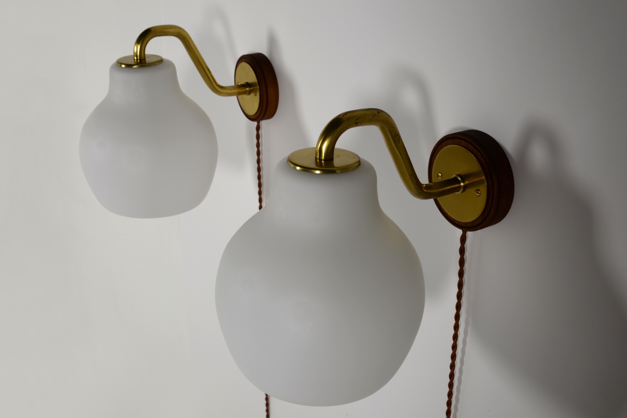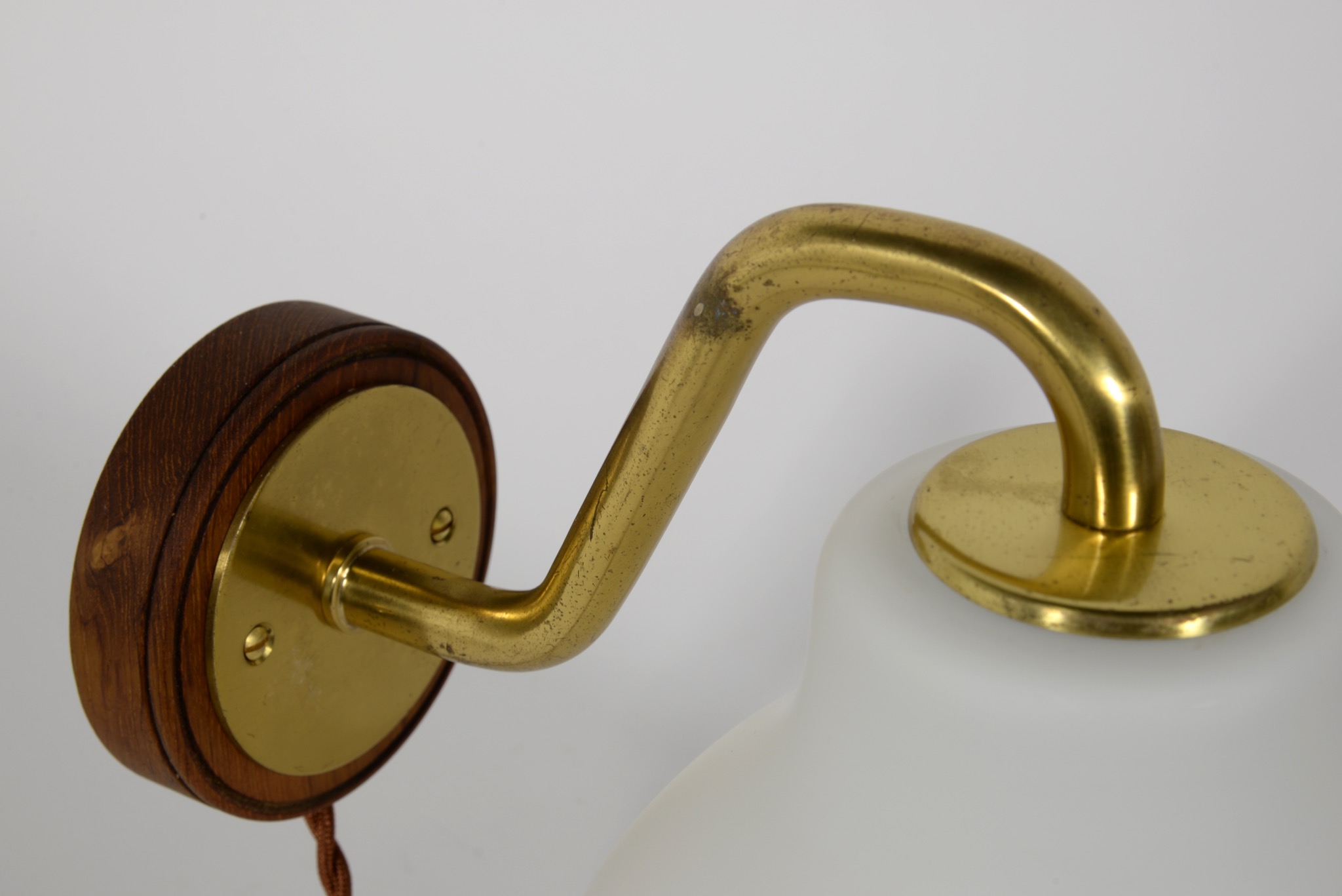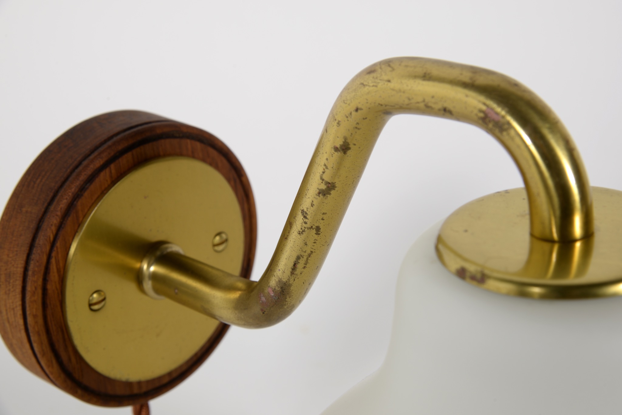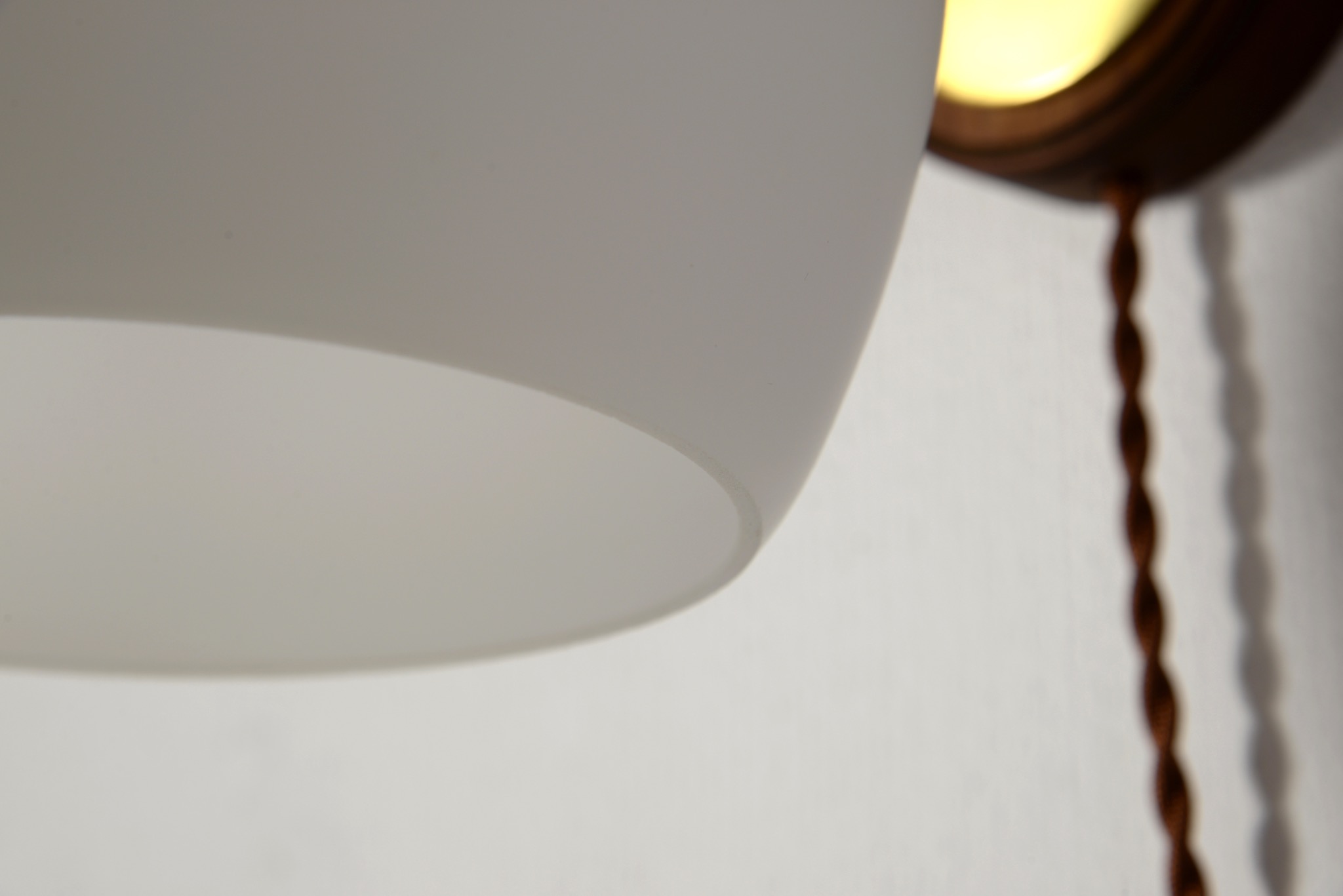 デンマークの建築家、Vilhelm Lauritzen/ヴィルヘルム・ラウリッツェンによるウォールランプ、一対です。真鍮のフレームにフロストガラスのシェードが備わりますが、シェードはよく見かけるものと少し異なる形状で、くぼみは緩くおおらかなデザインとなります。ガラスの状態は良好ですが、真鍮のフレームに若干の腐食が見られます。チーク材の台座は専門職にて製作したもので、キーホールフックで壁面に固定でき、壁埋め配線にも対応可能です。
