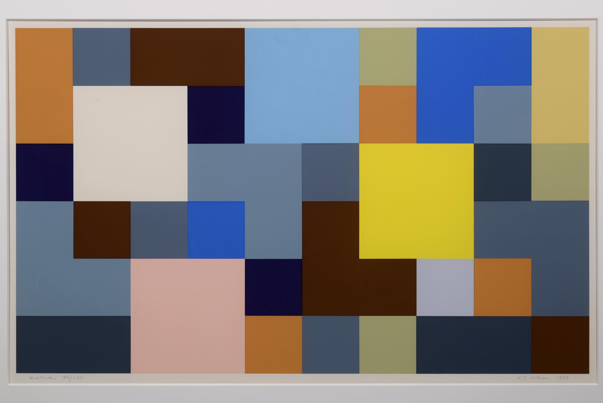 スウェーデンの美術家で、色彩論理を提唱した、KG Nilson/ケージー・ニルソンによる ”Kvadrater/クウァドレーター” 1983年のリトグラフ作品です。オリジナルのアルミ額装はそのままに、マットを新たに整えました。