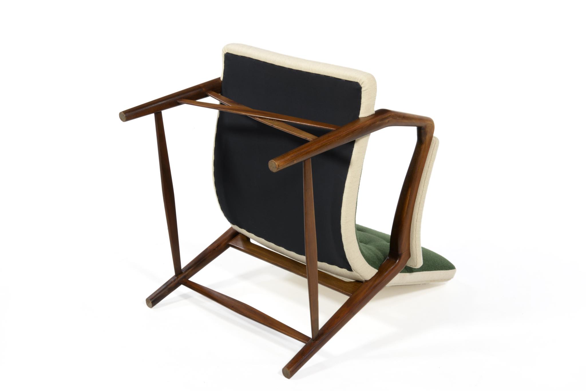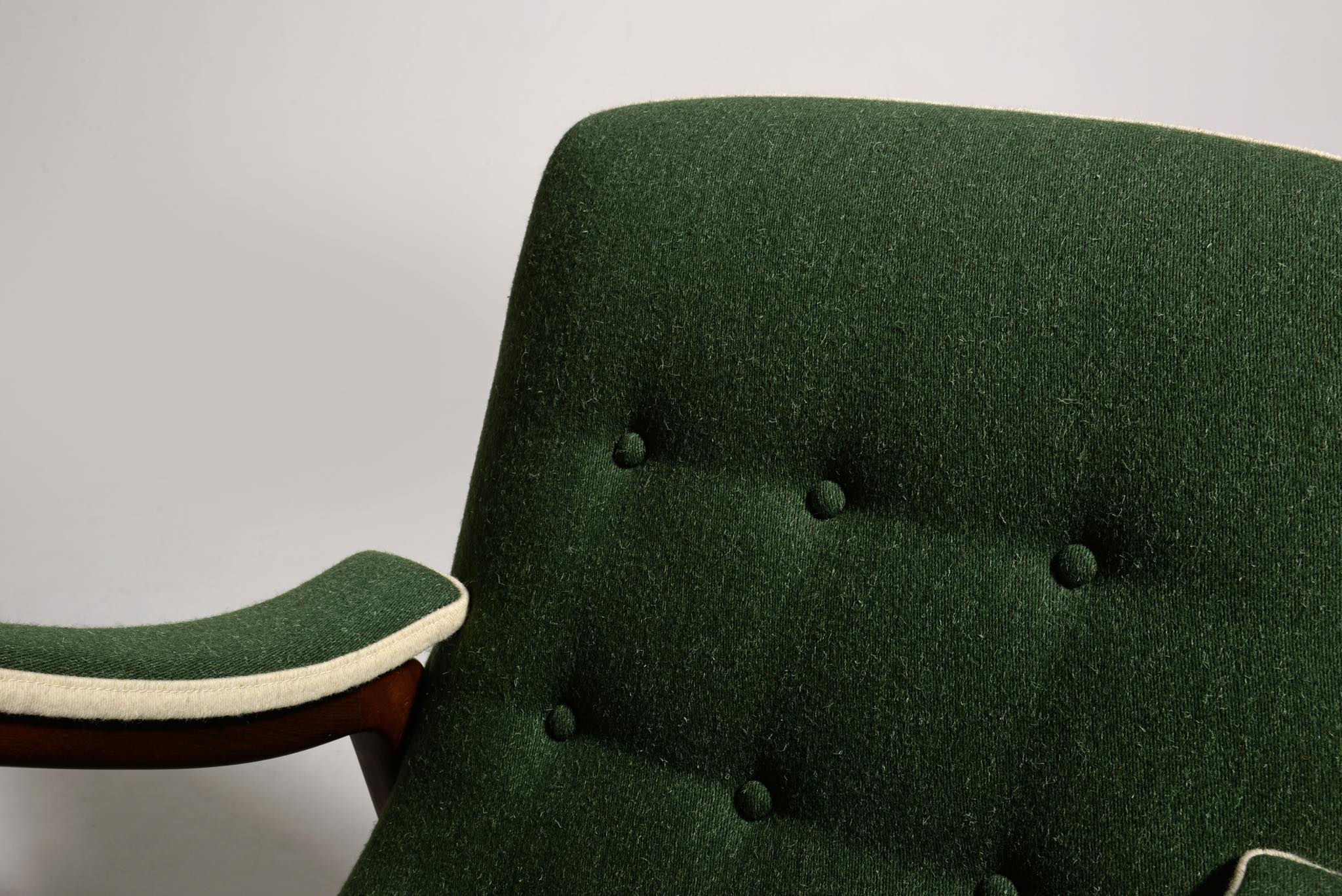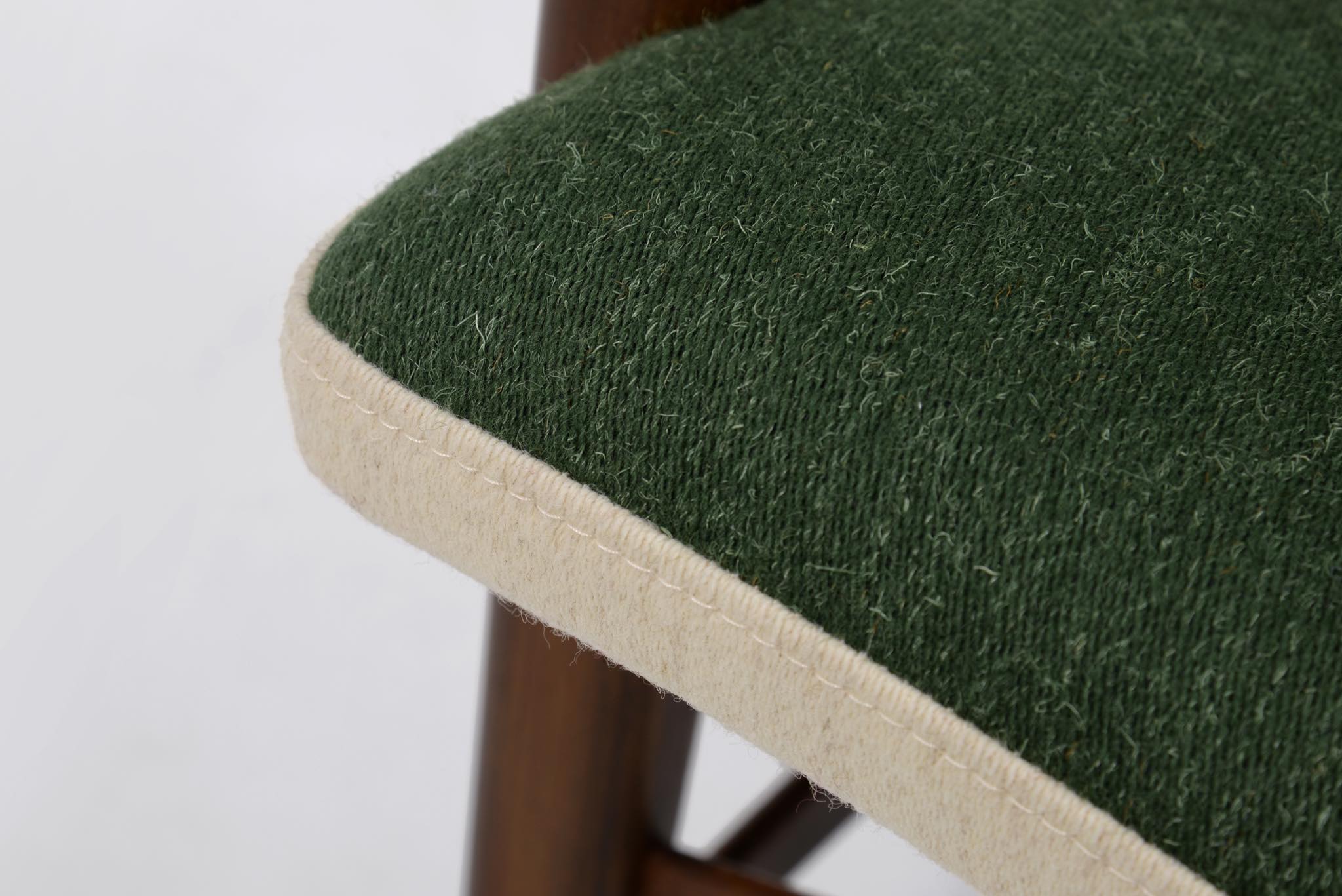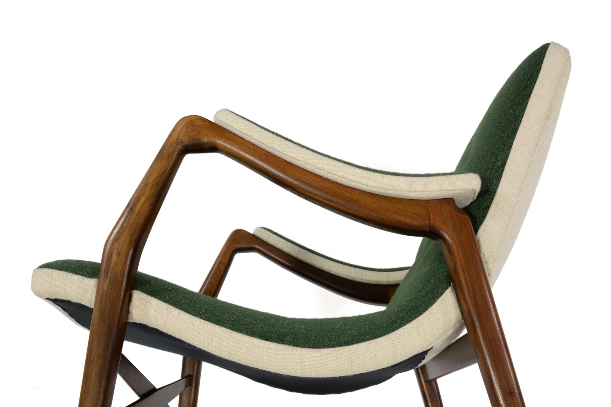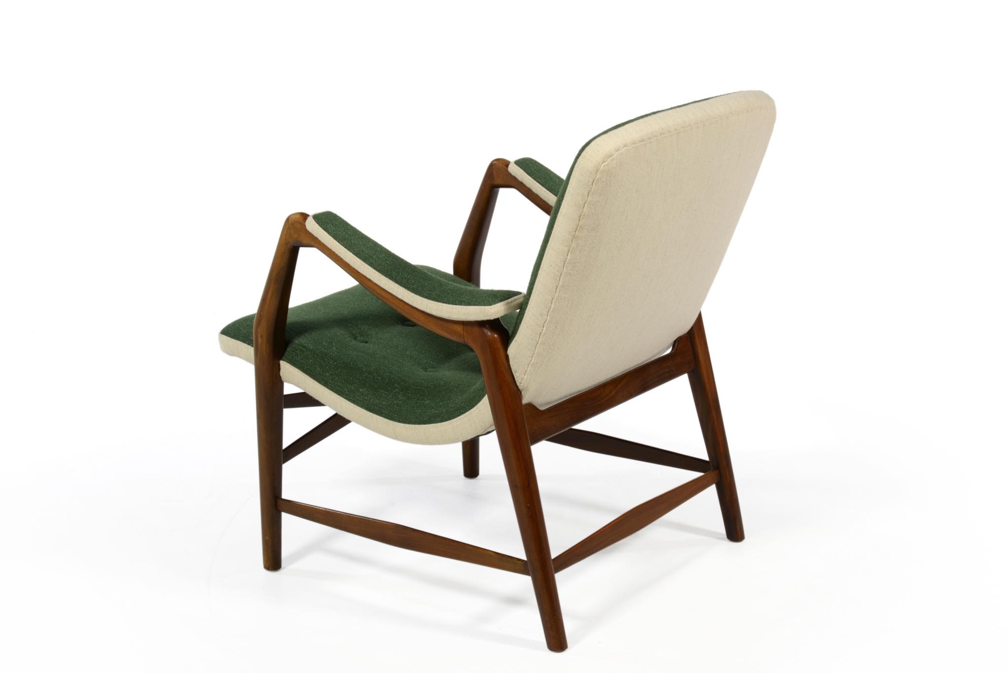 デンマークのデザイナー、Arne Hovmand Olsen/アルネ・ホフマンド・オルセンによるイージーチェアです。身体がすっぽりと収まり座りやすい構造が魅力の小振りな椅子です。フレームはエルム材、生地は新たに張り替えました。