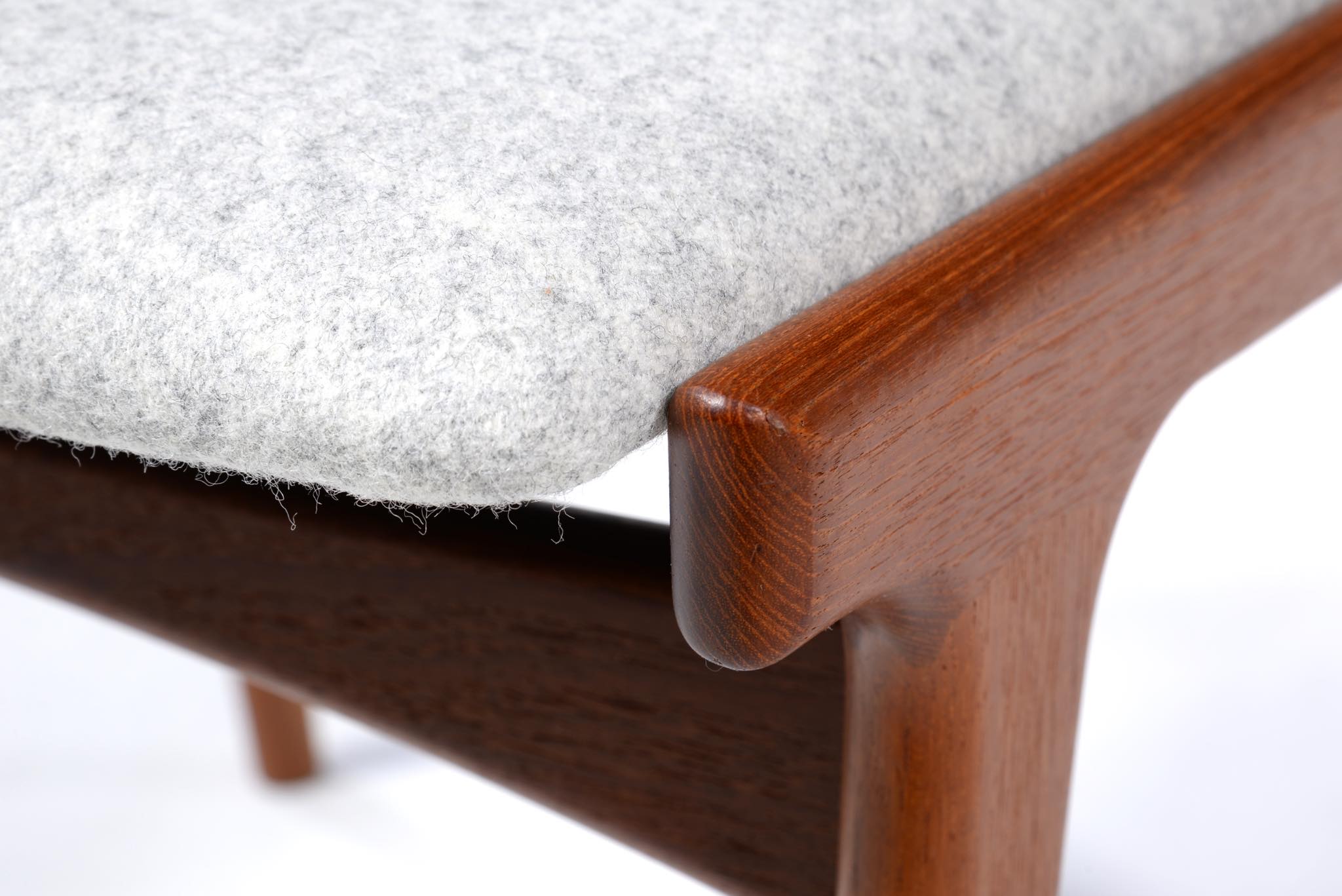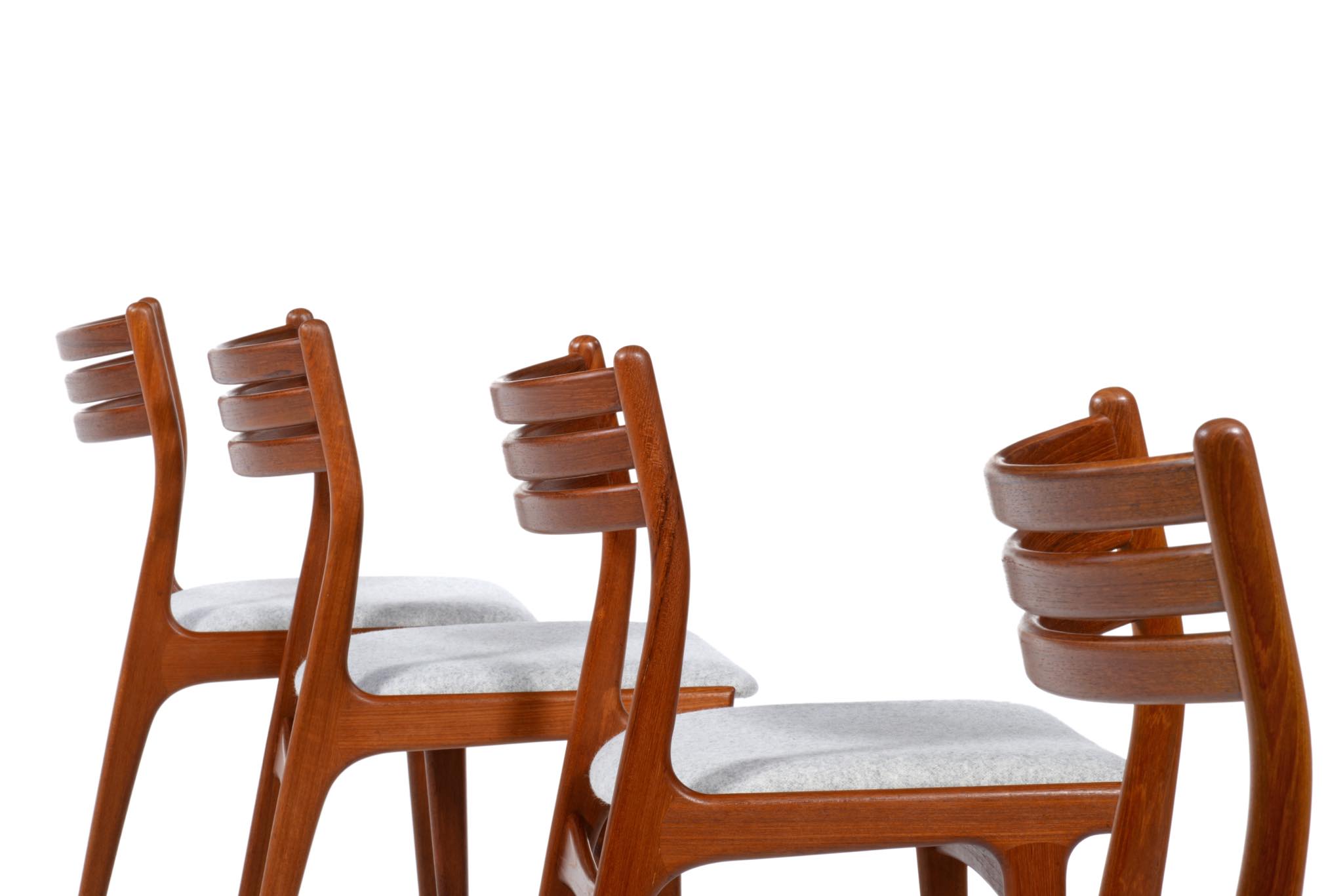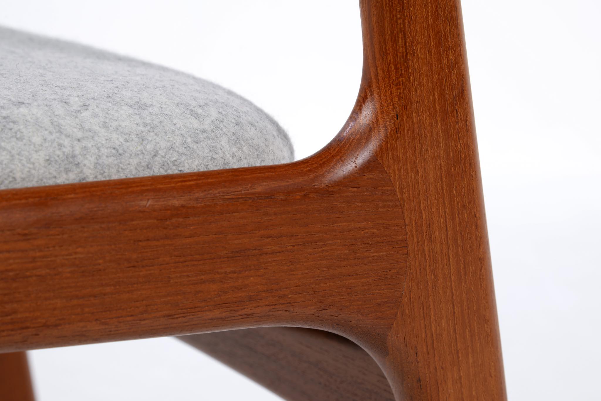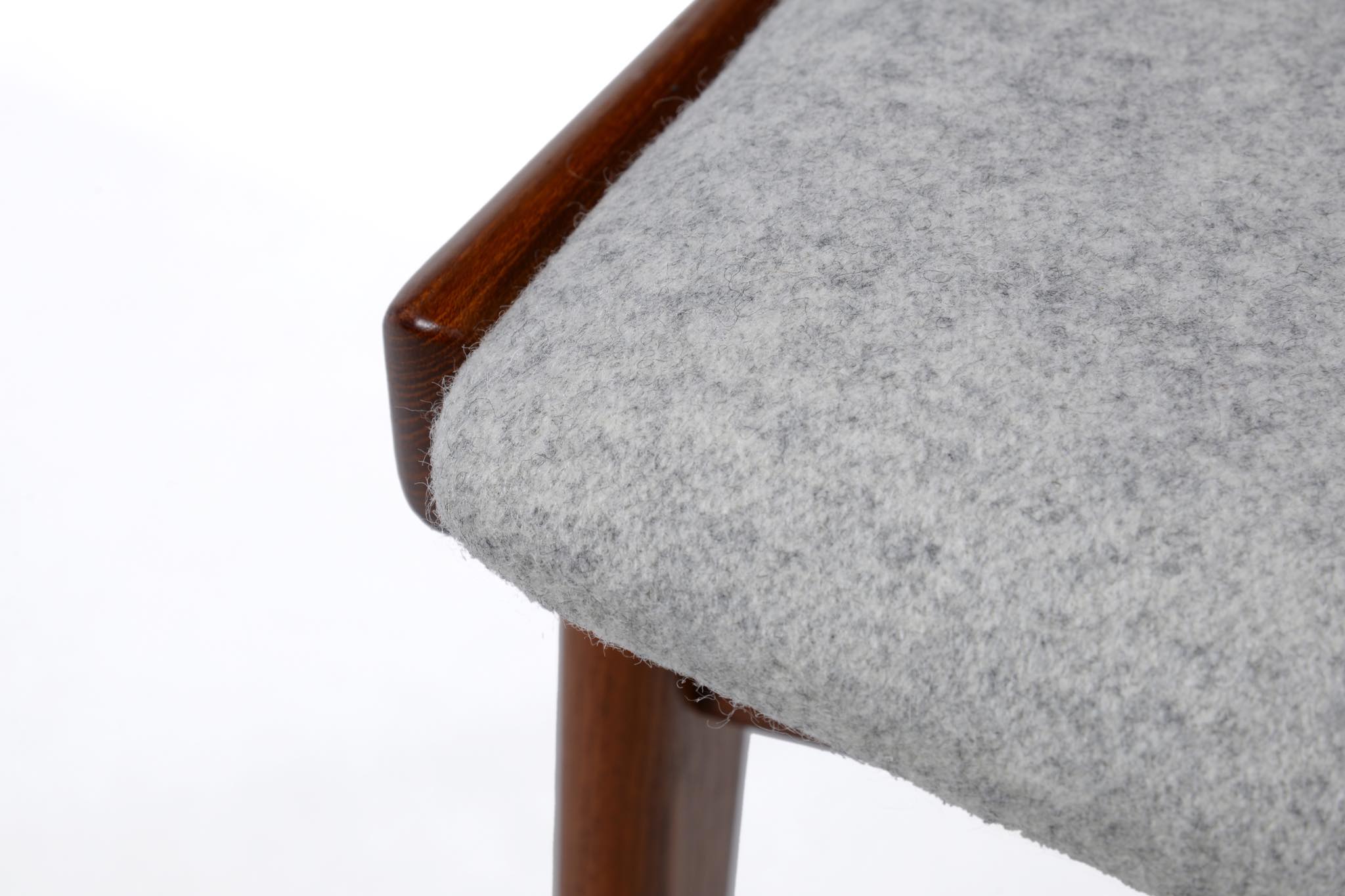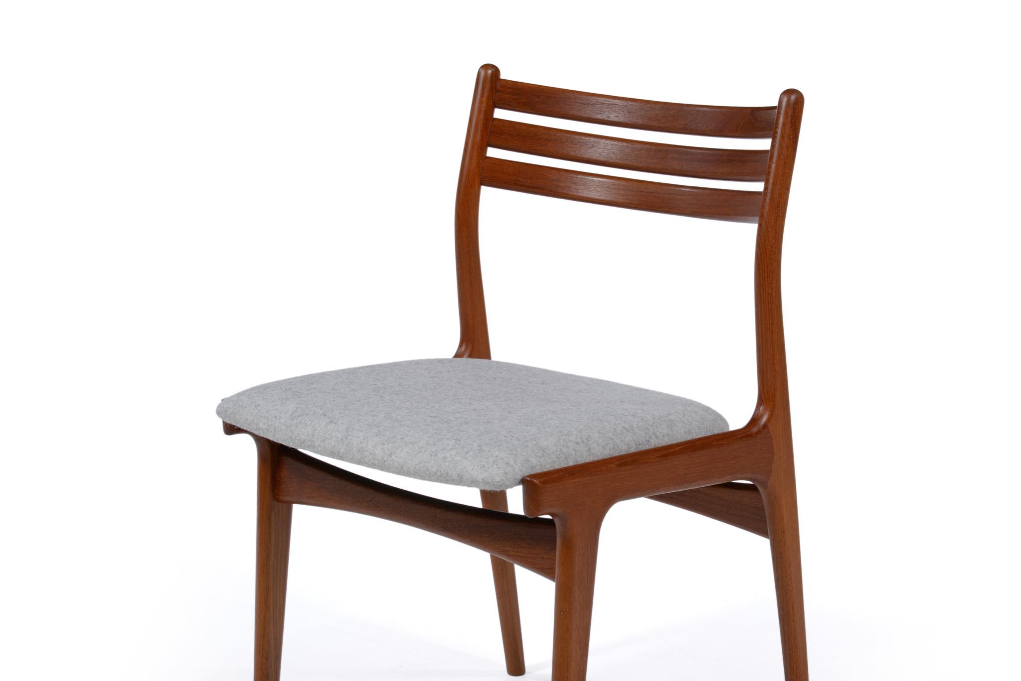デンマークのデザイナー、Johannes Andersen/ヨハネス・アナセンによるダイニングチェア、4脚組です。1960年代頃に作られたものでしょう。湾曲した笠木はゆったりと腰掛けることができ、食後も居続けられるでしょう。貫の接合部を突き出させて削り出すなど構造的な強度を確保するために、とても手の込んだ造りをしています。本体のチーク材も目の詰まった良質な材から木取りしています。シートは薄灰色のウール生地にて張り替えました。