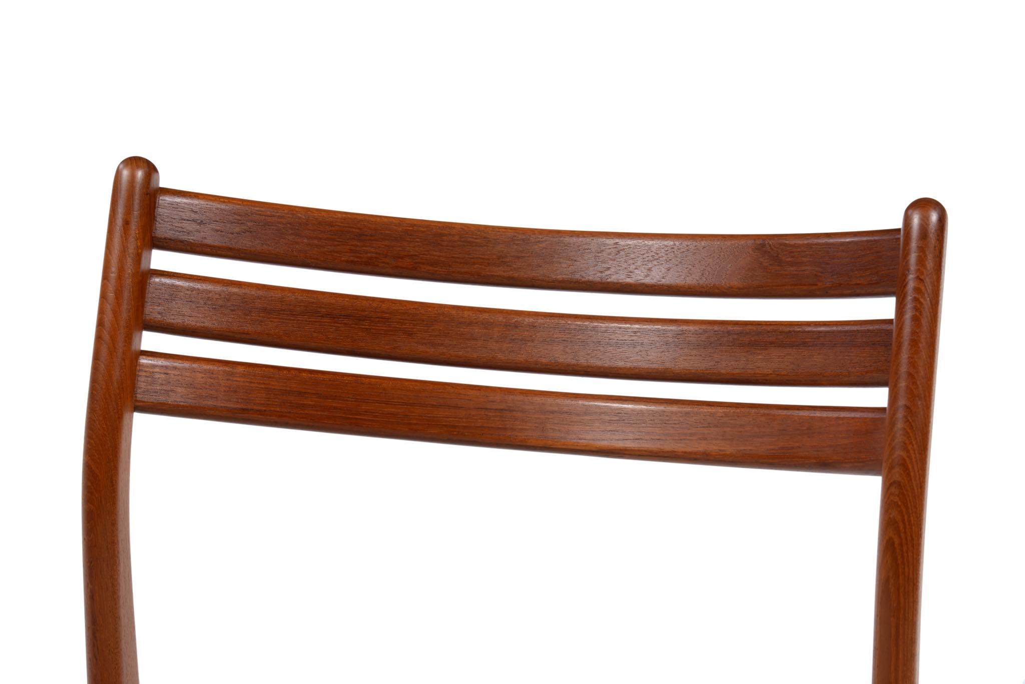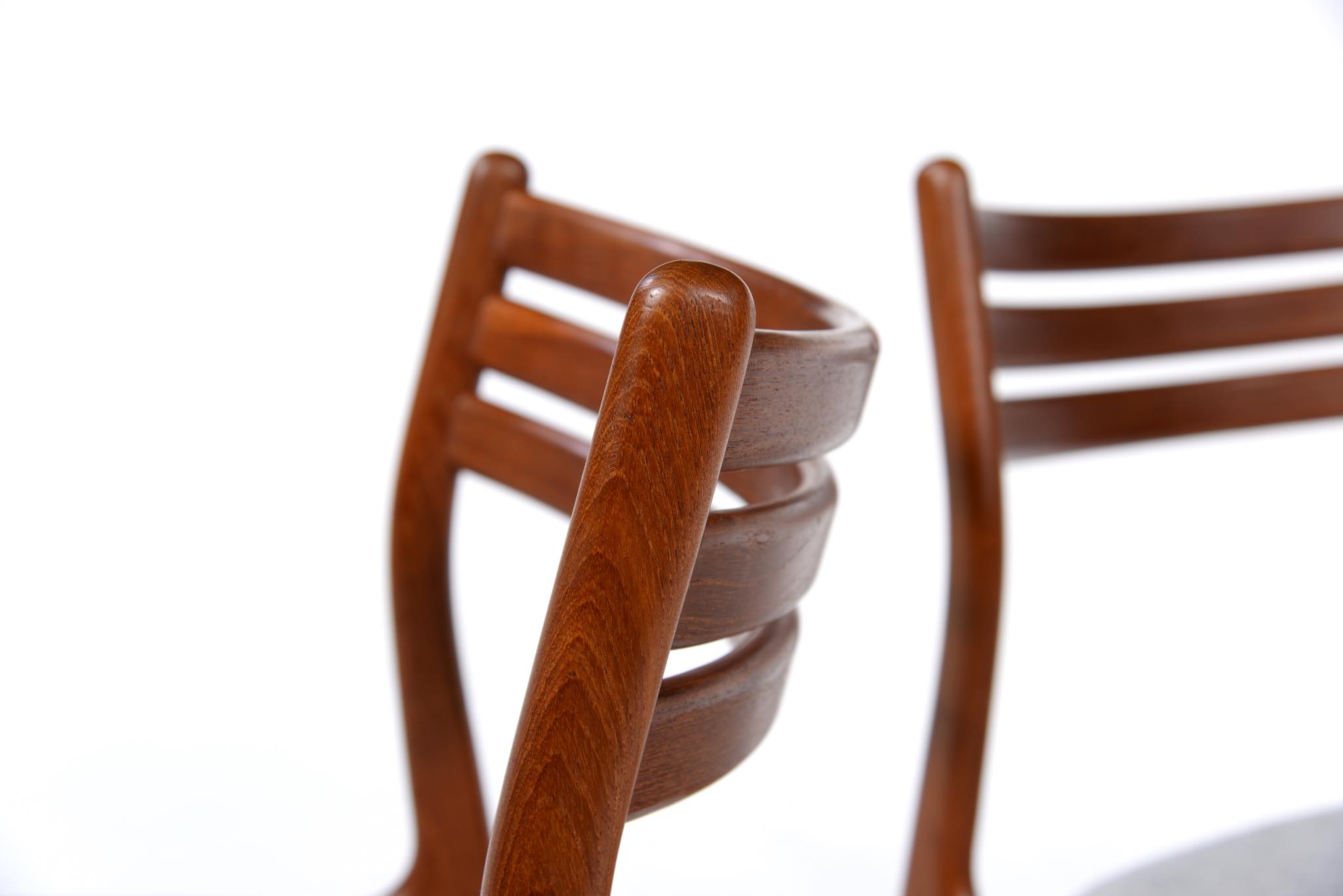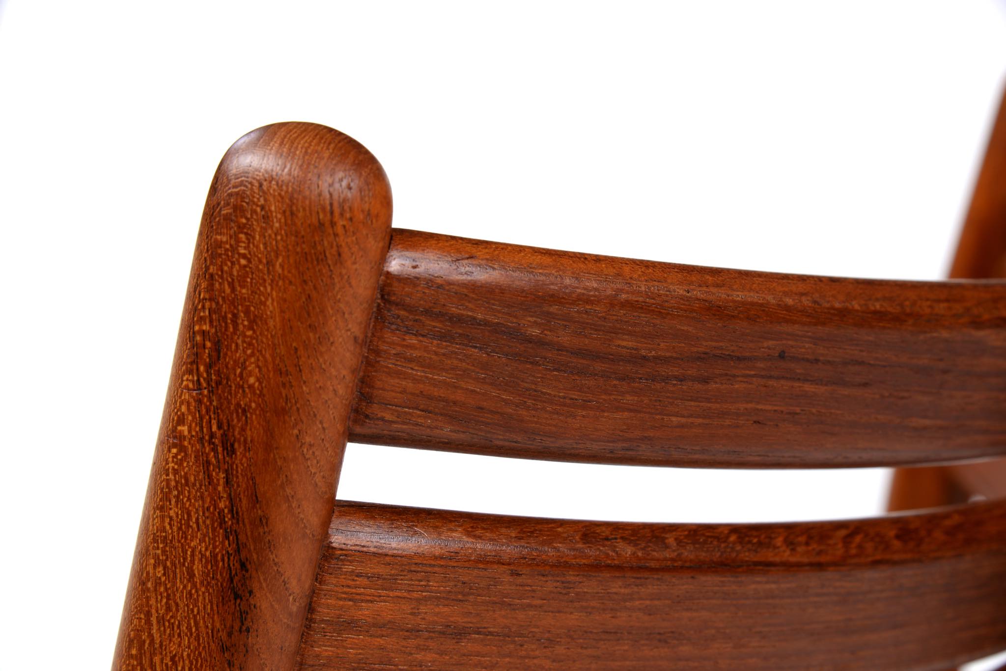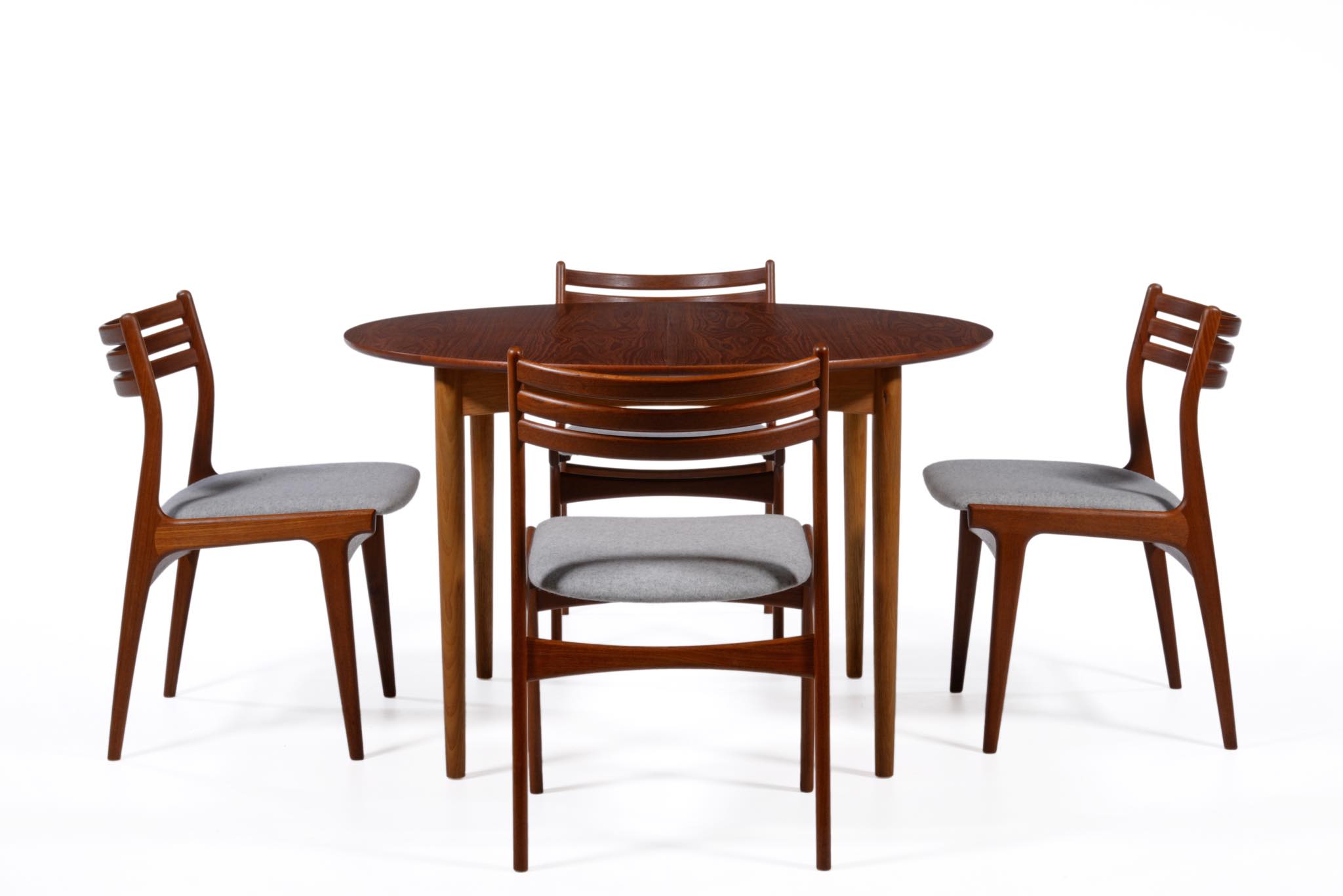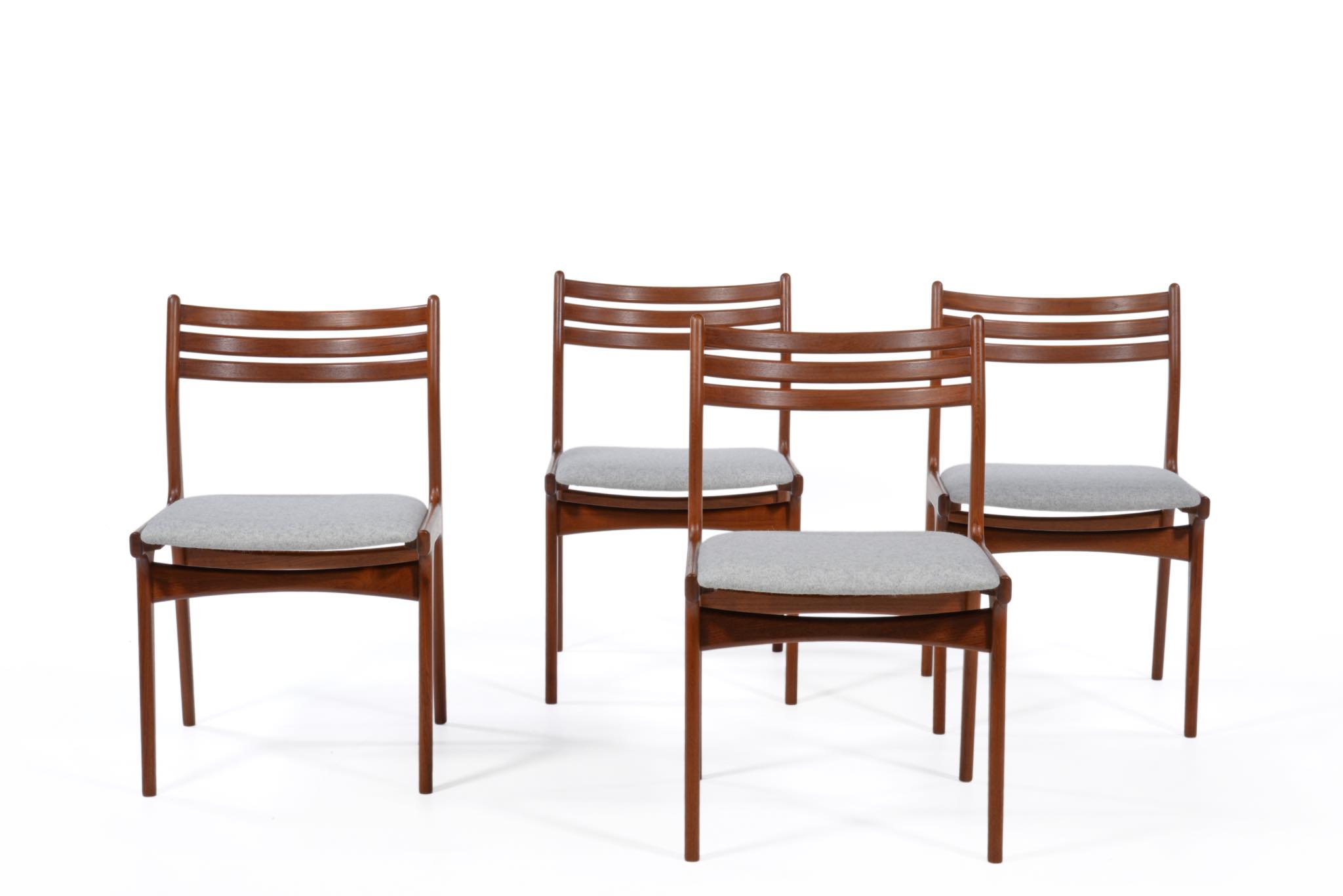 デンマークのデザイナー、Johannes Andersen/ヨハネス・アナセンによるダイニングチェア、4脚組です。1960年代頃に作られたものでしょう。湾曲した笠木はゆったりと腰掛けることができ、食後も居続けられるでしょう。貫の接合部を突き出させて削り出すなど構造的な強度を確保するために、とても手の込んだ造りをしています。本体のチーク材も目の詰まった良質な材から木取りしています。シートは薄灰色のウール生地にて張り替えました。