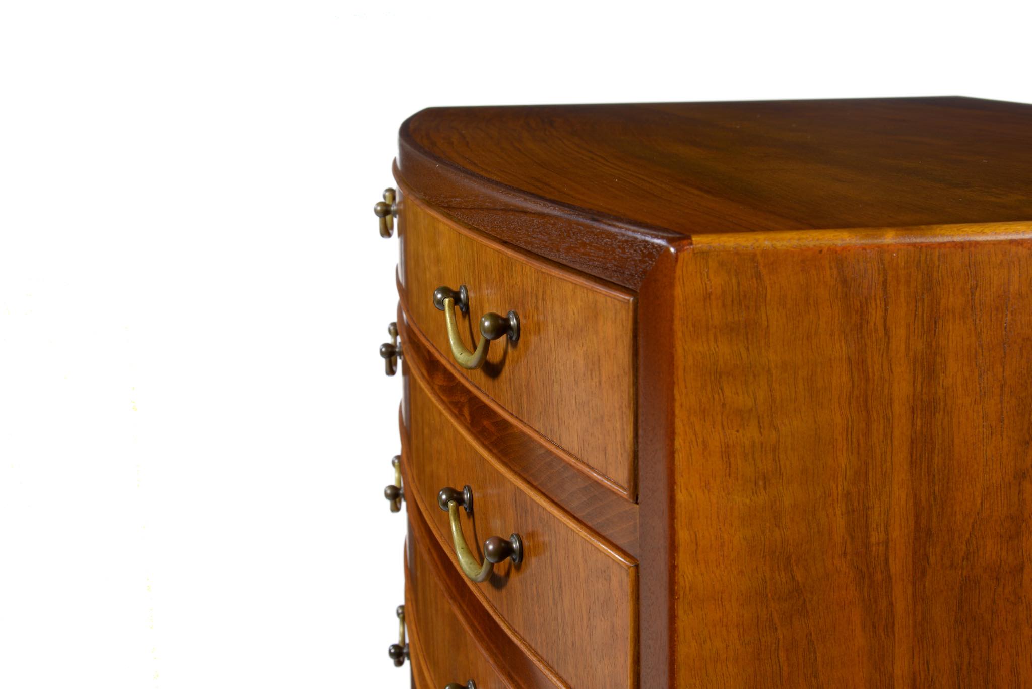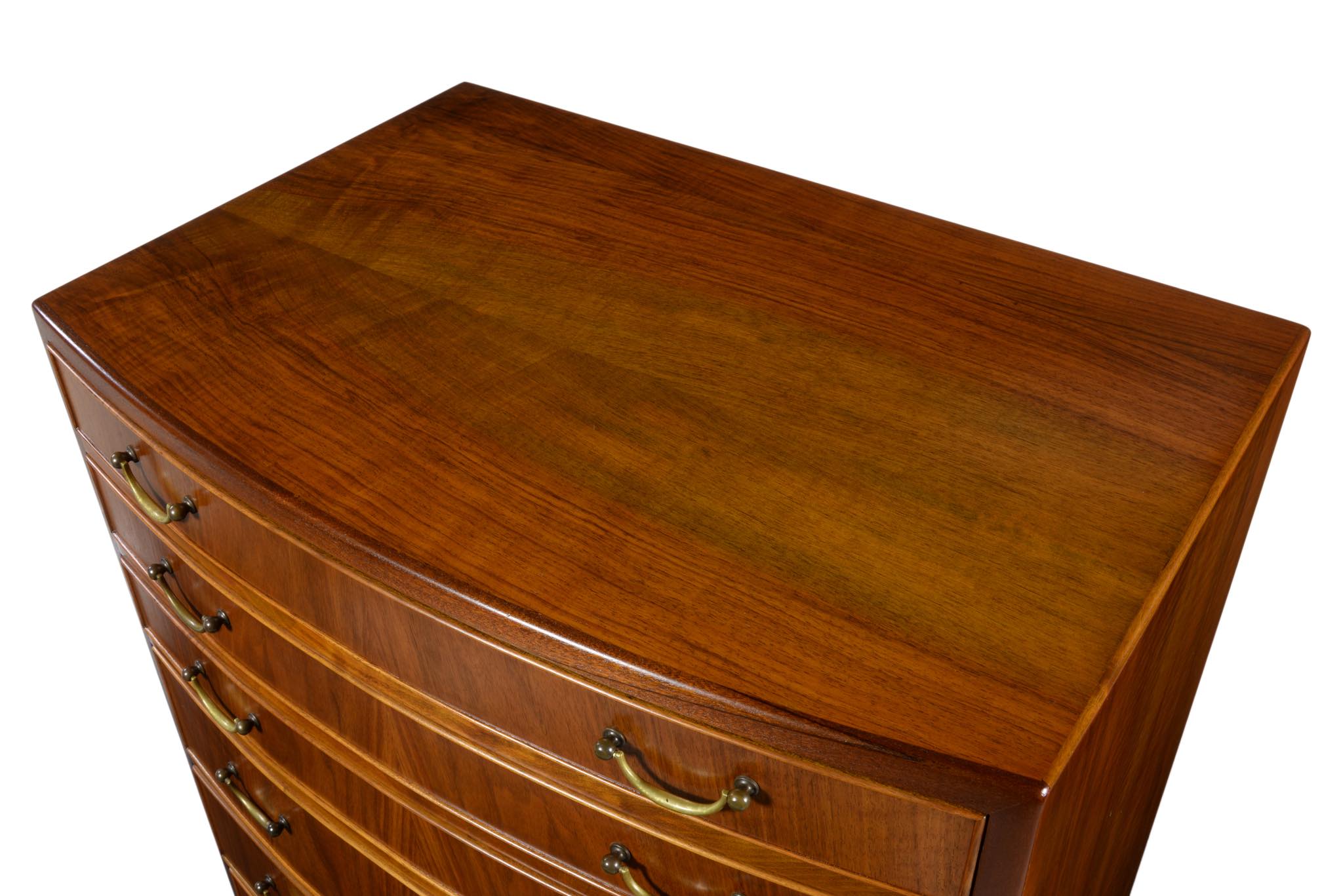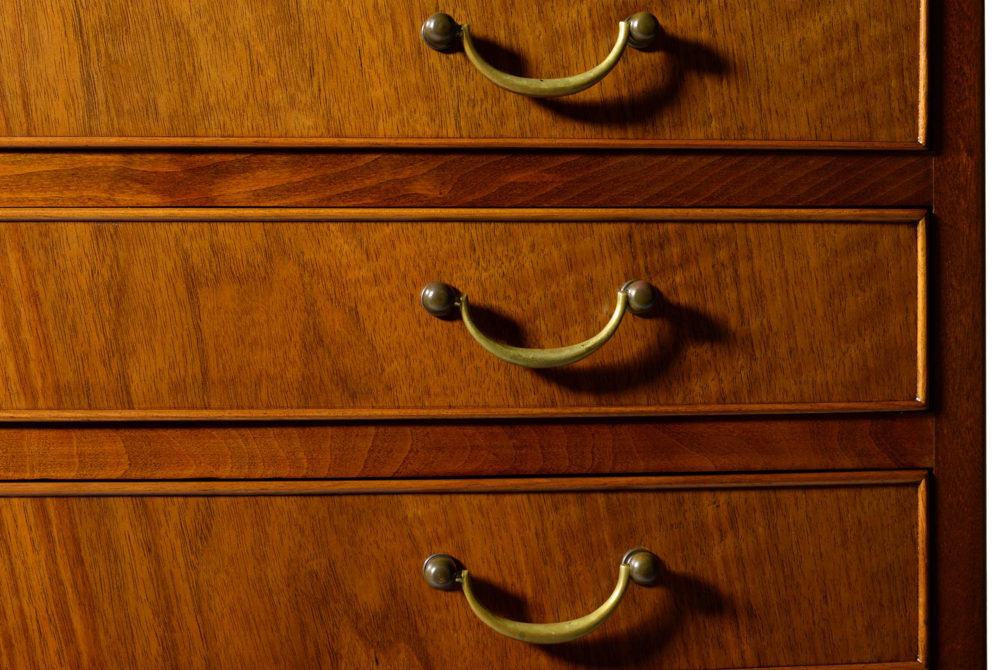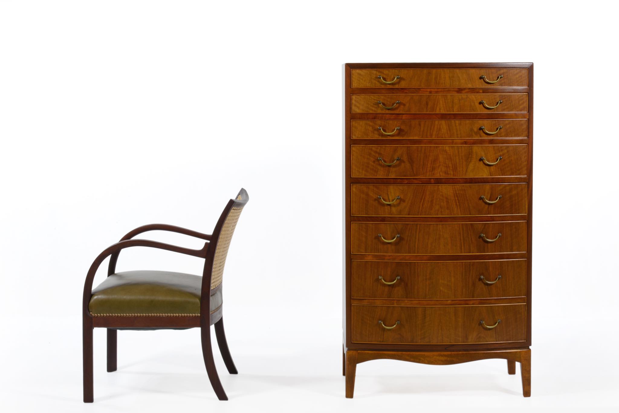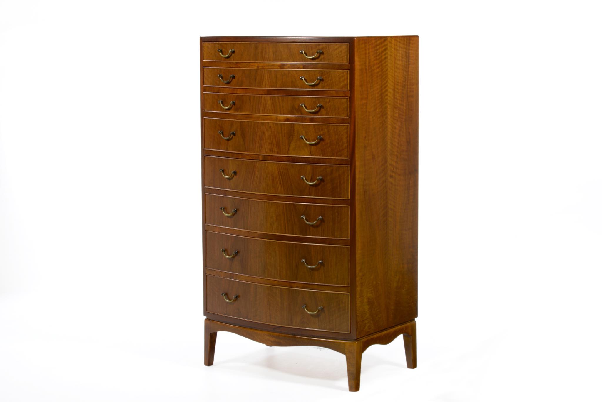 20世紀のデンマークを代表する家具デザイナーで、王立アカデミー家具科の教授を務めたOle Wanscher/オーレ・ヴァンシャーによるトールボーイチェストです。コペンハーゲン、ストロイエの百貨店、イルムスボリフスにて1950〜60年代頃に販売されたもので、製作はA.J. Iversen工房が携わったようですが、当時イルムスではメーカーを公表しない方針だったようです。真鍮ハンドルの備わるクラシックな趣のもので、コーカサスウォールナットと思しき縞模様の現れた材が用いられています。抽斗や本体の縁に沿って加飾された玉縁は通称「Cock-Bead/コックビーズ」と呼ばれ、抽斗の面に深さを表し、本体との隙間を隠すために用いられた技法で、古くは1760年代の英国家具様式にそのルーツが見られます。