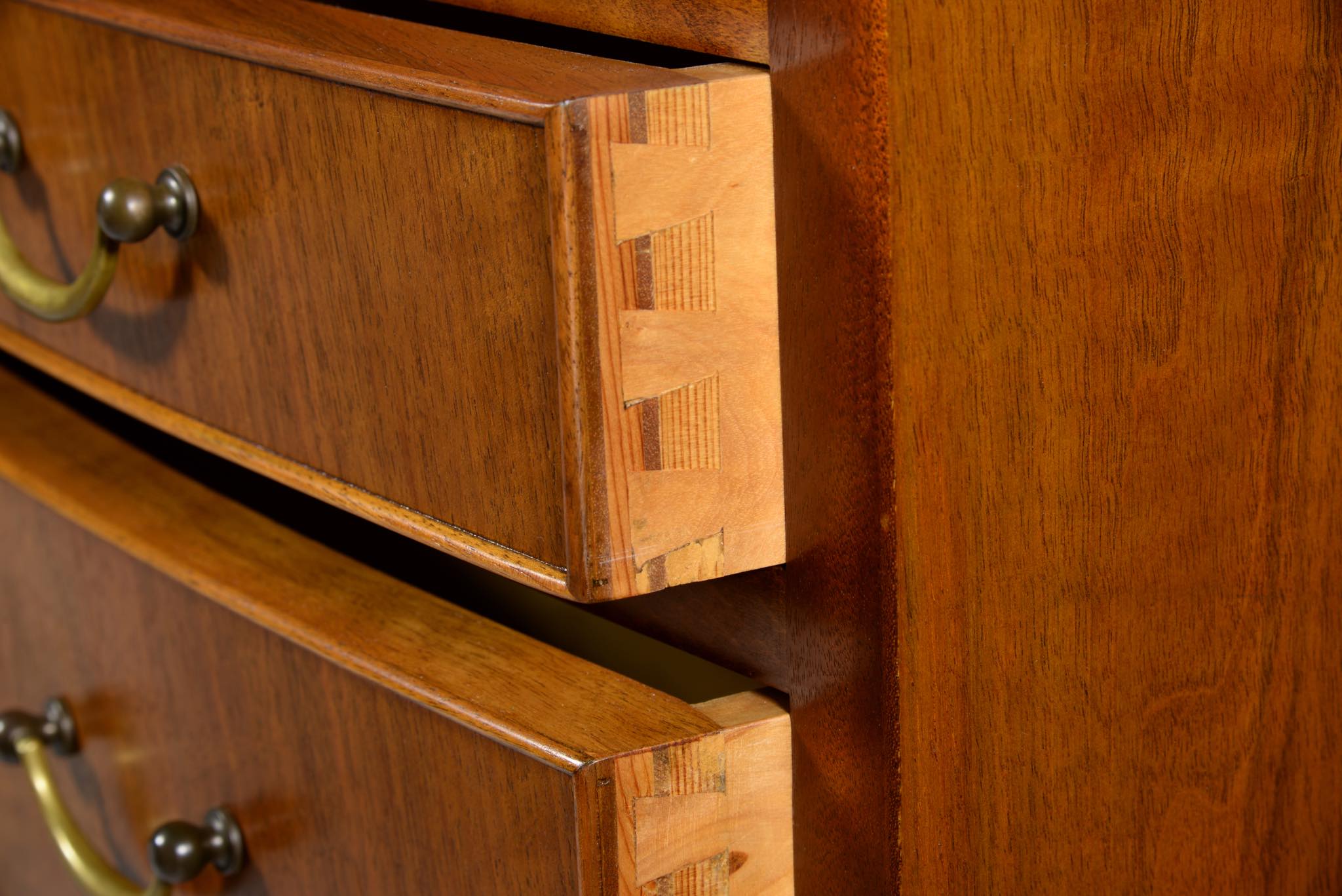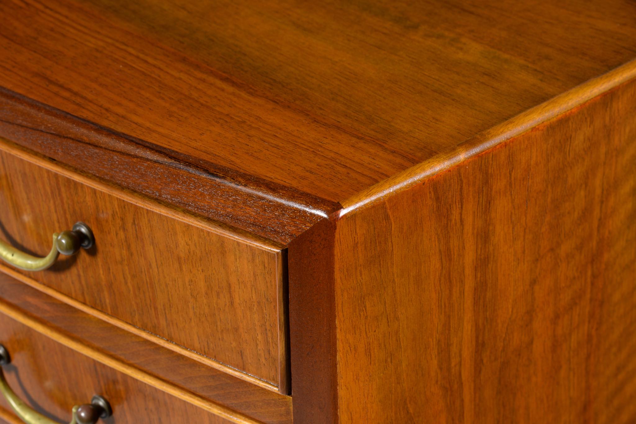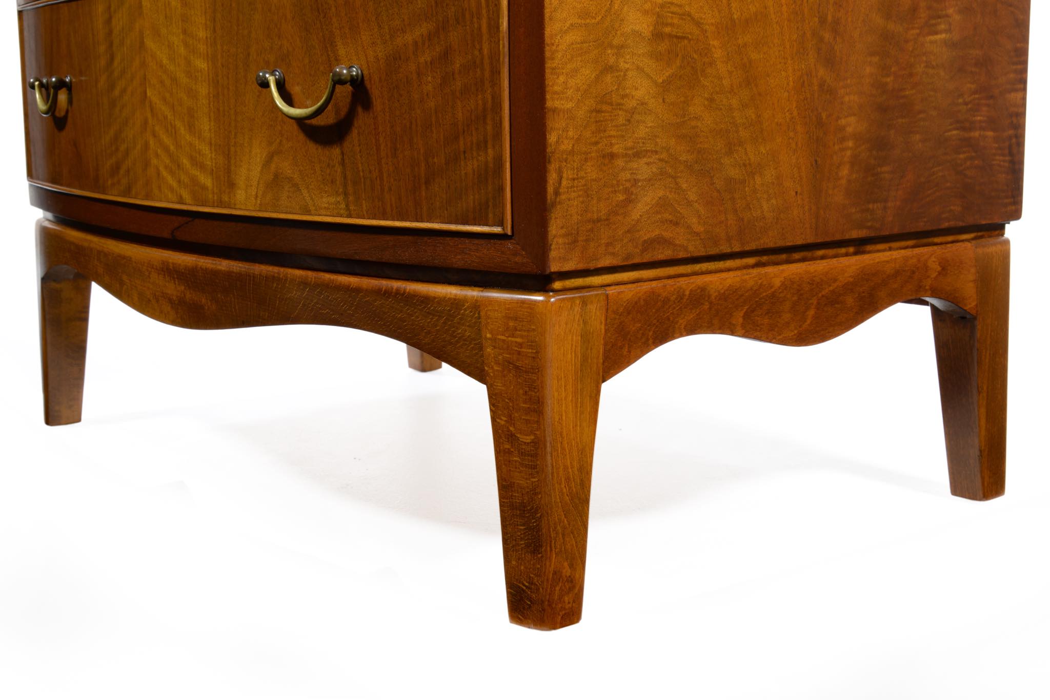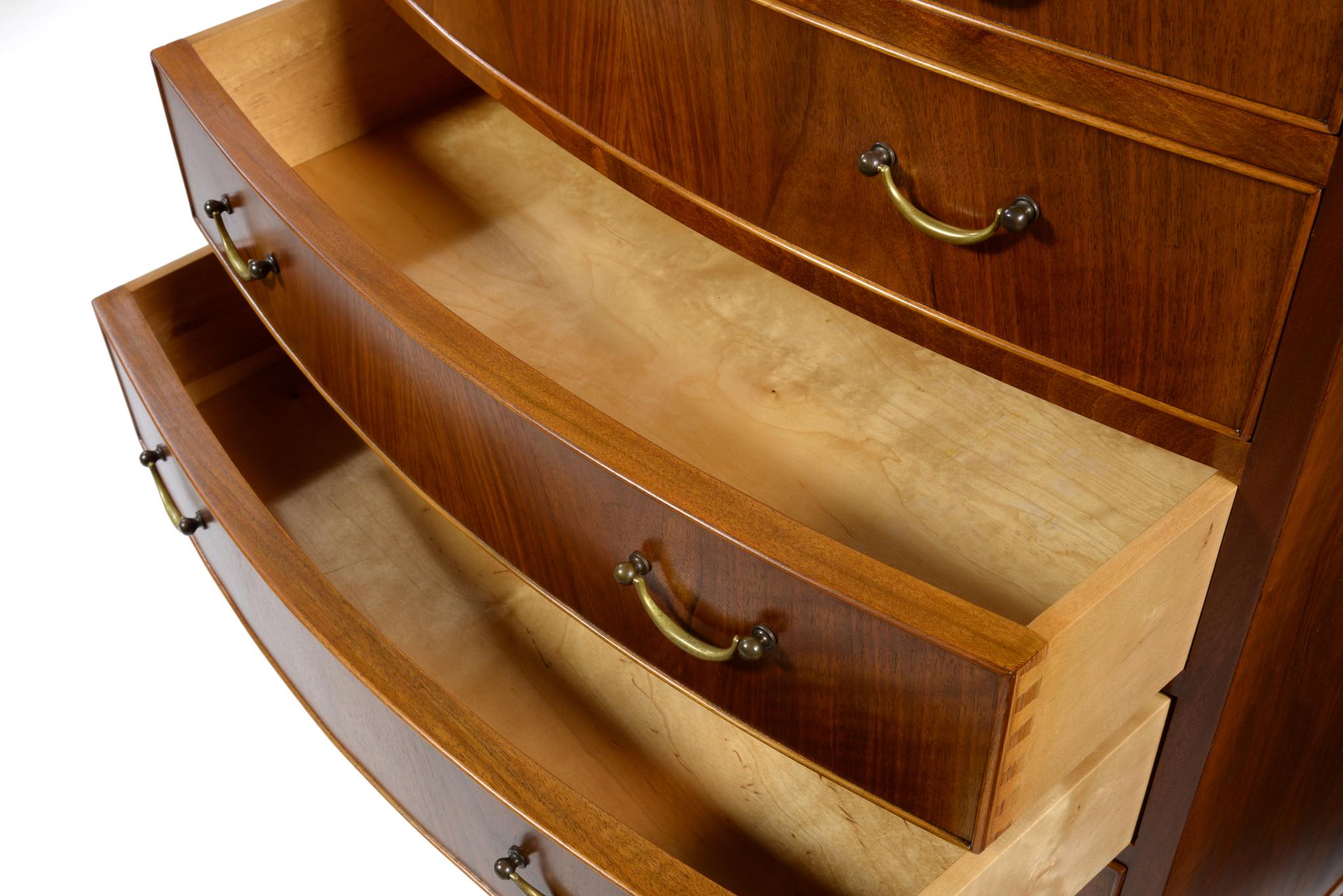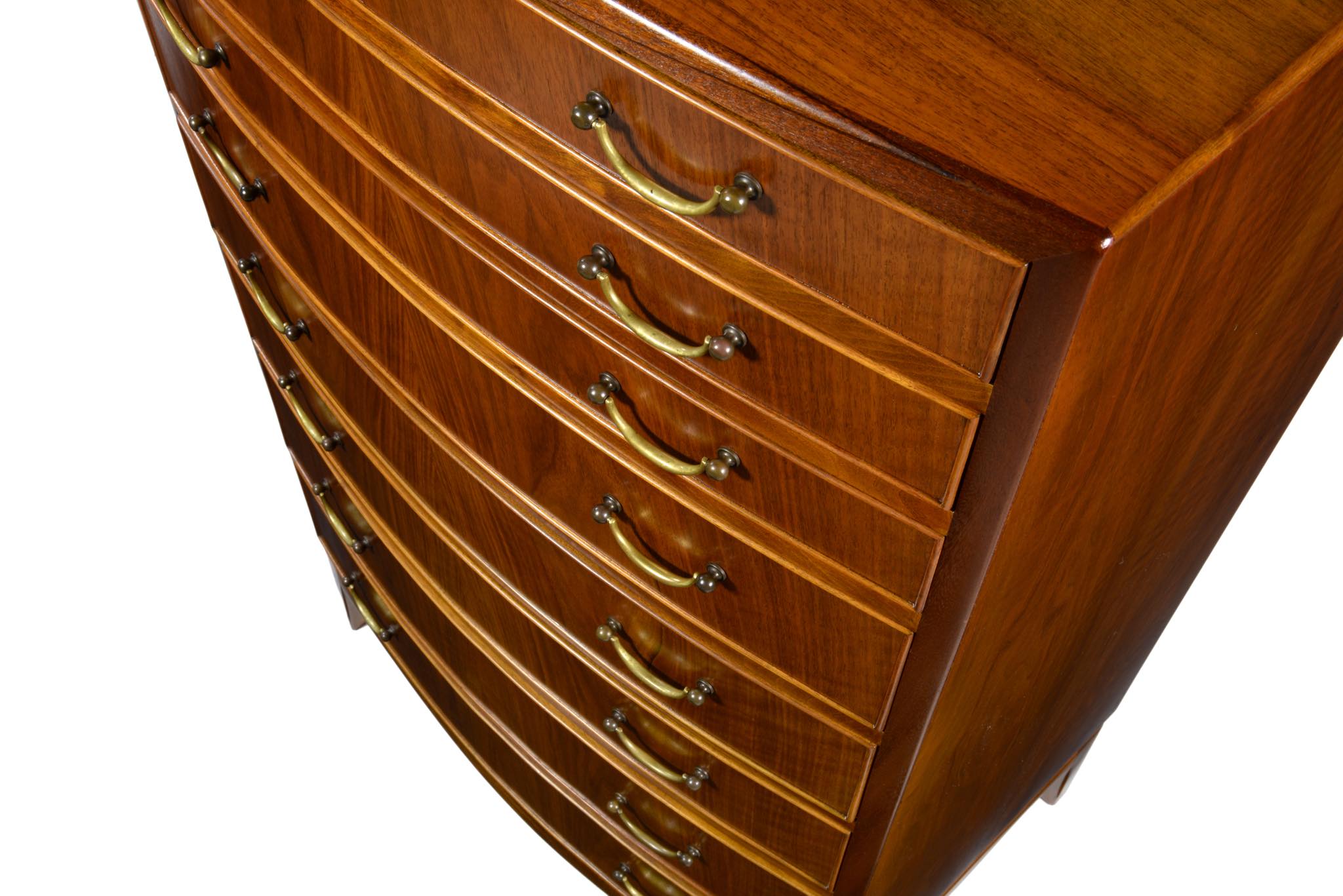 20世紀のデンマークを代表する家具デザイナーで、王立アカデミー家具科の教授を務めたOle Wanscher/オーレ・ヴァンシャーによるトールボーイチェストです。コペンハーゲン、ストロイエの百貨店、イルムスボリフスにて1950〜60年代頃に販売されたもので、製作はA.J. Iversen工房が携わったようですが、当時イルムスではメーカーを公表しない方針だったようです。真鍮ハンドルの備わるクラシックな趣のもので、コーカサスウォールナットと思しき縞模様の現れた材が用いられています。抽斗や本体の縁に沿って加飾された玉縁は通称「Cock-Bead/コックビーズ」と呼ばれ、抽斗の面に深さを表し、本体との隙間を隠すために用いられた技法で、古くは1760年代の英国家具様式にそのルーツが見られます。