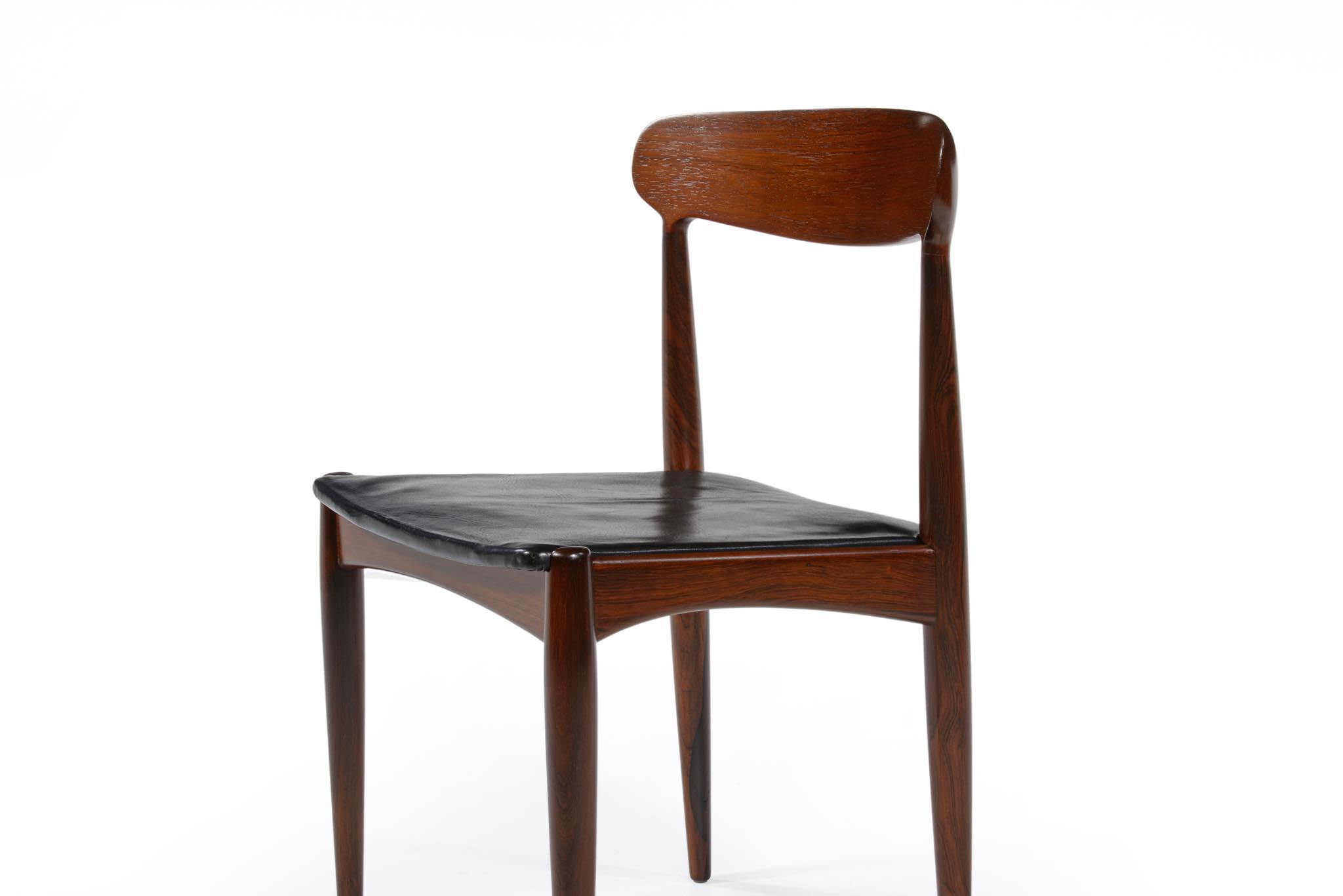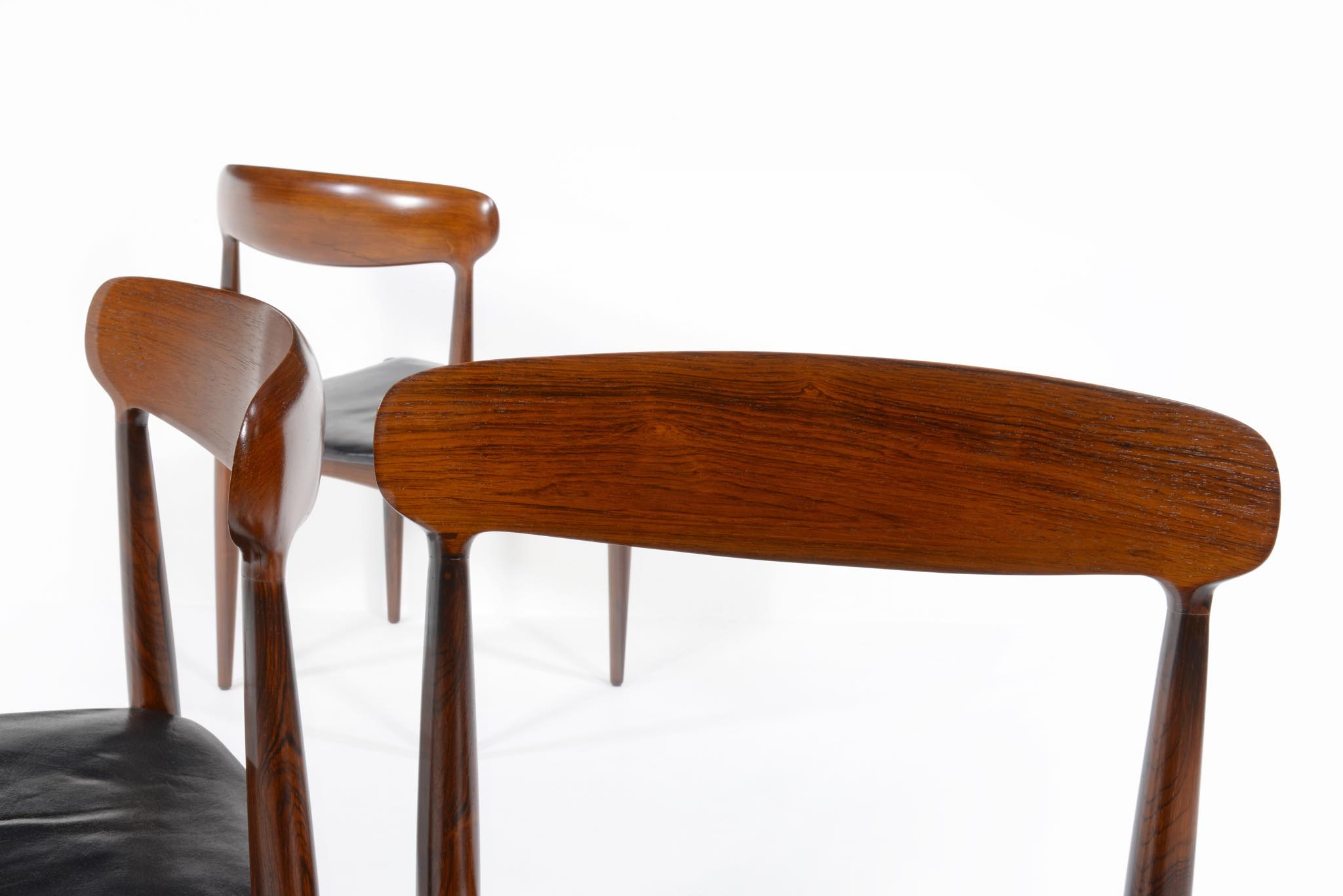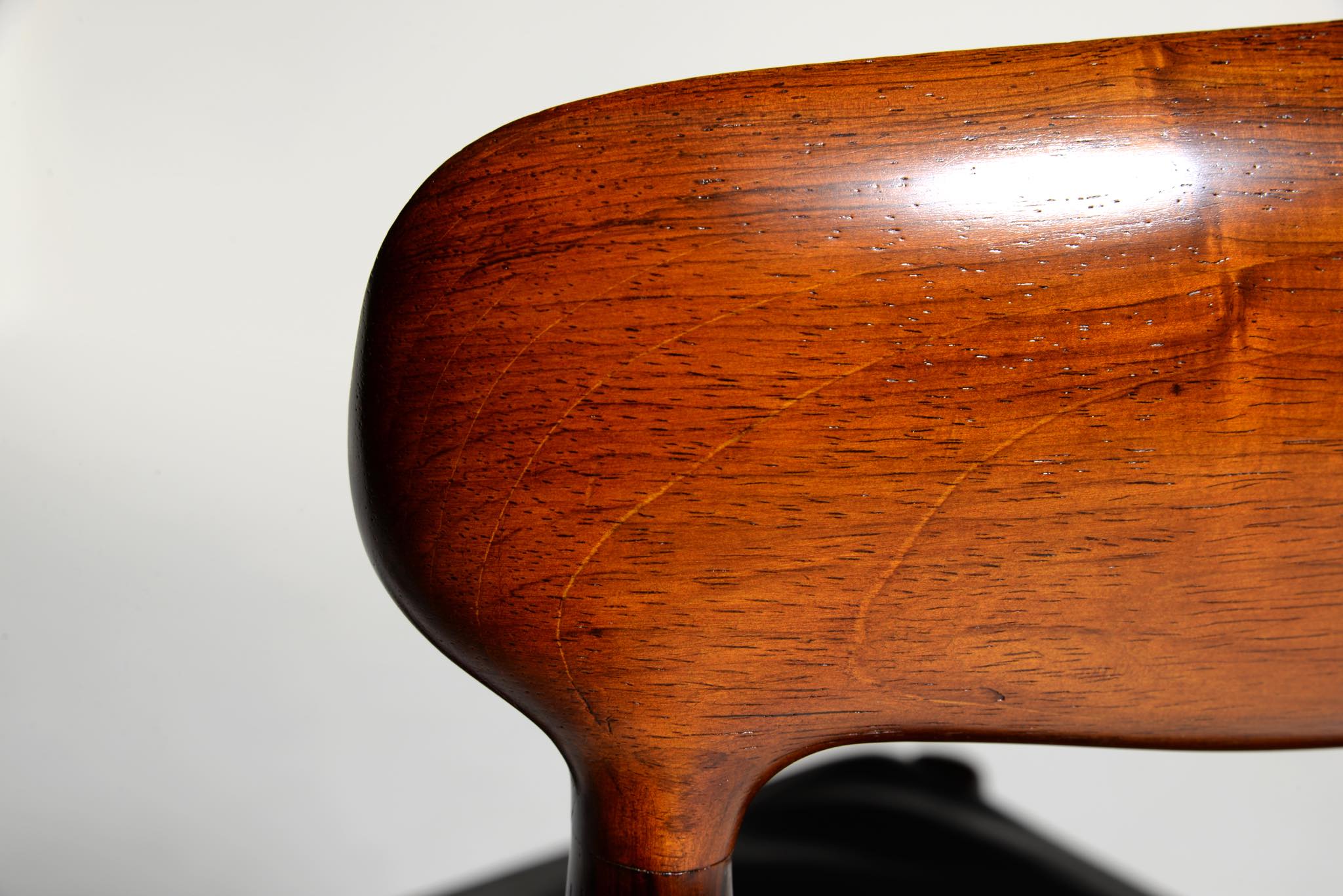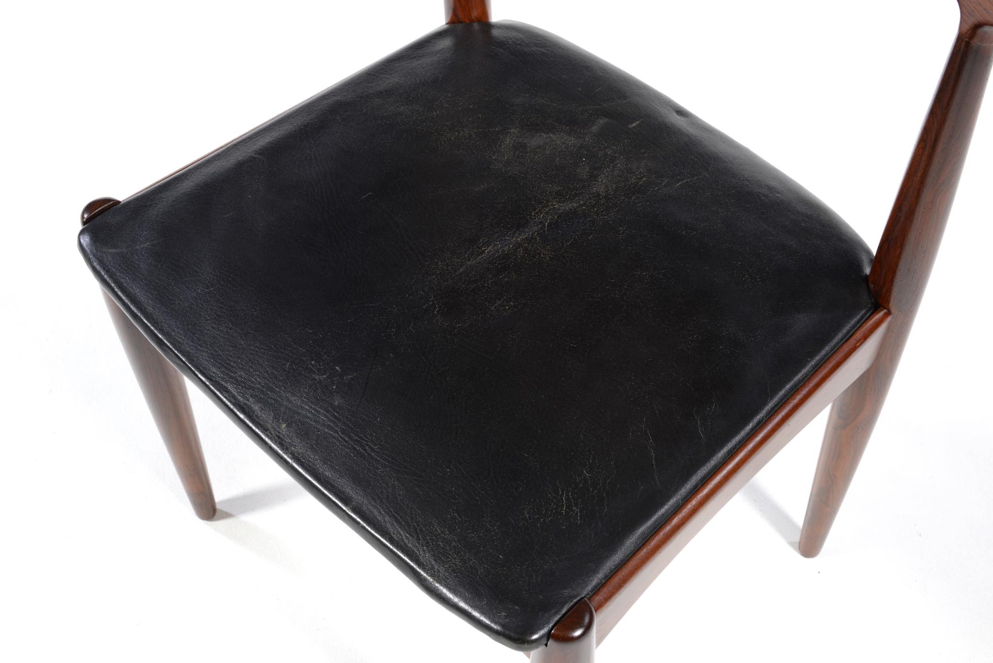 デンマークのデザイナー、Johannes Andersen/ヨハネス・アナセンによるダイニングチェアです。1960年代に作られたものでしょう。落ち着いたデザインでありながら精度の高い作りをしています。上質なローズウッドを用いており、弧を描く笠木は座りやすく設計されています。シートの使い込まれた皮革が経年の風味を醸していますが、内部のウレタンは劣化しており、クッション性を得るためには張り替えが必要です。お好みの皮革で張り替える費用を含んだ価格です。納品前に張り替えを承ることも可能ですが、現状の経年感を楽しんでいただき数年後に張り替えをご検討いただいても良いでしょう。例え、現状でのお届けから5年後の張り替えであっても、その費用はこちらに含まれます。詳しくはお問い合わせください。