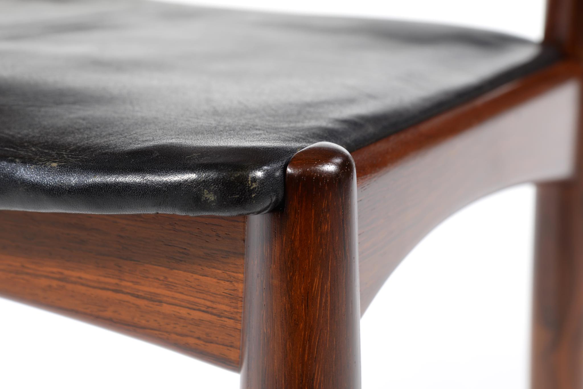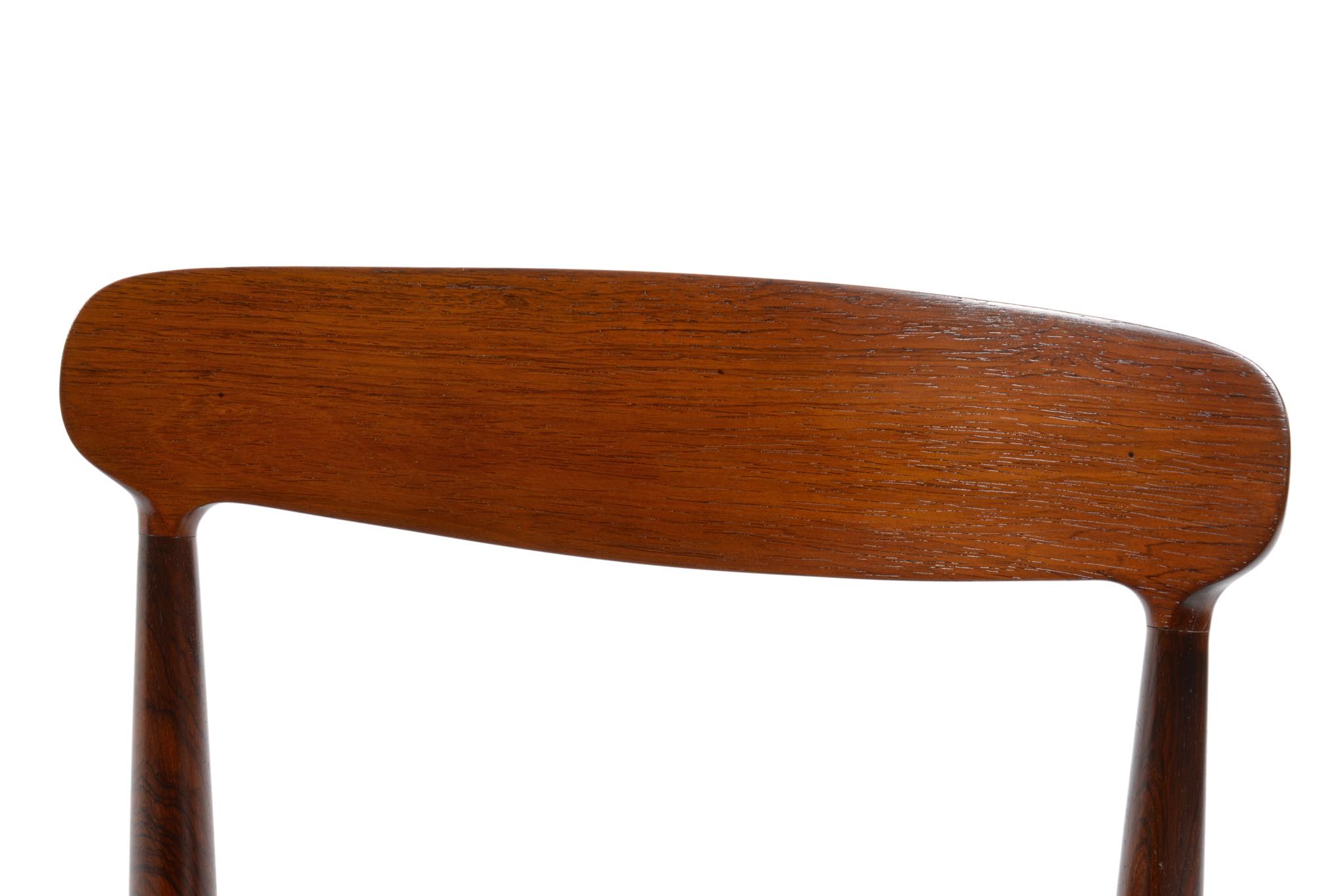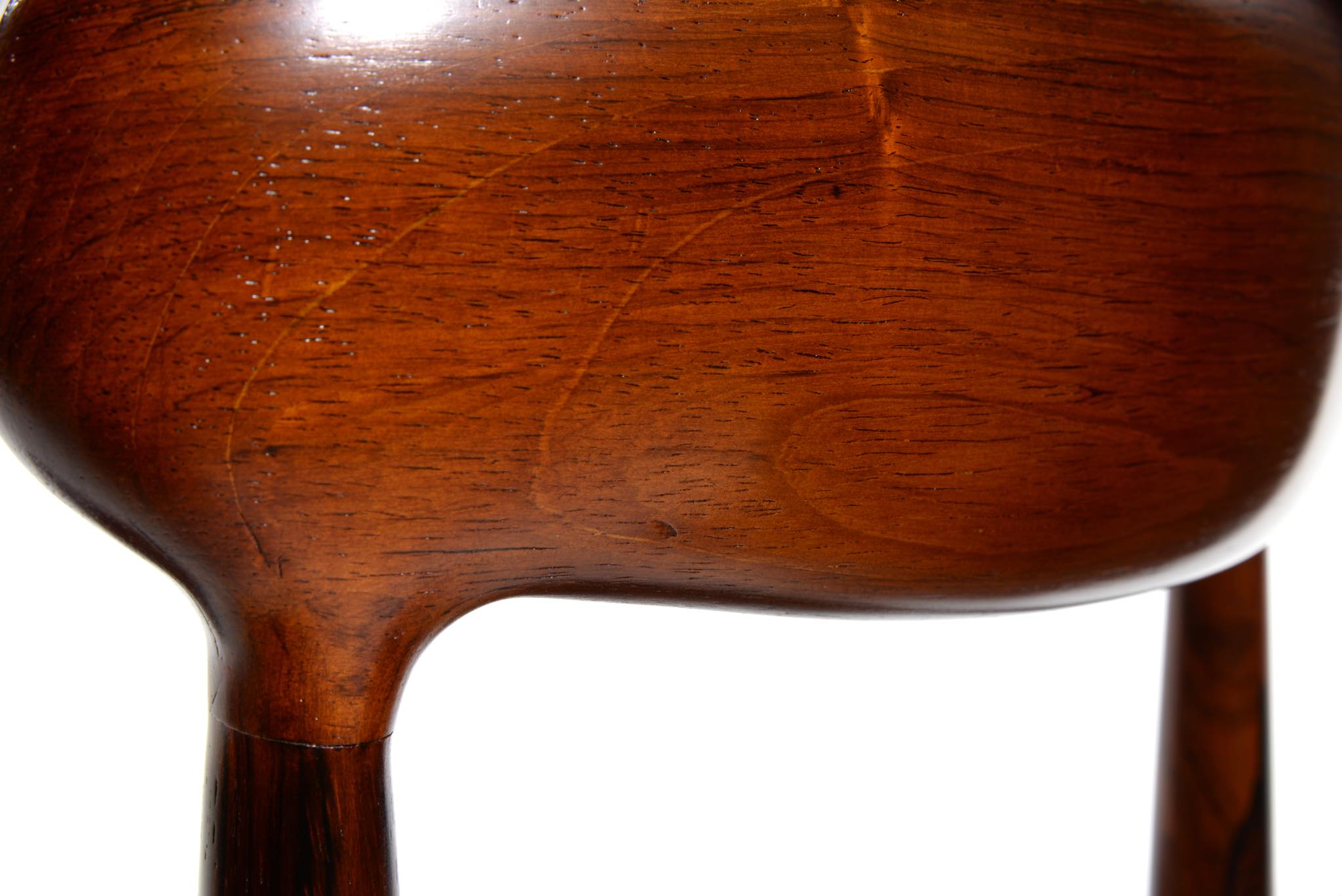 デンマークのデザイナー、Johannes Andersen/ヨハネス・アナセンによるダイニングチェアです。1960年代に作られたものでしょう。落ち着いたデザインでありながら精度の高い作りをしています。上質なローズウッドを用いており、弧を描く笠木は座りやすく設計されています。シートの使い込まれた皮革が経年の風味を醸していますが、内部のウレタンは劣化しており、クッション性を得るためには張り替えが必要です。お好みの皮革で張り替える費用を含んだ価格です。納品前に張り替えを承ることも可能ですが、現状の経年感を楽しんでいただき数年後に張り替えをご検討いただいても良いでしょう。例え、現状でのお届けから5年後の張り替えであっても、その費用はこちらに含まれます。詳しくはお問い合わせください。