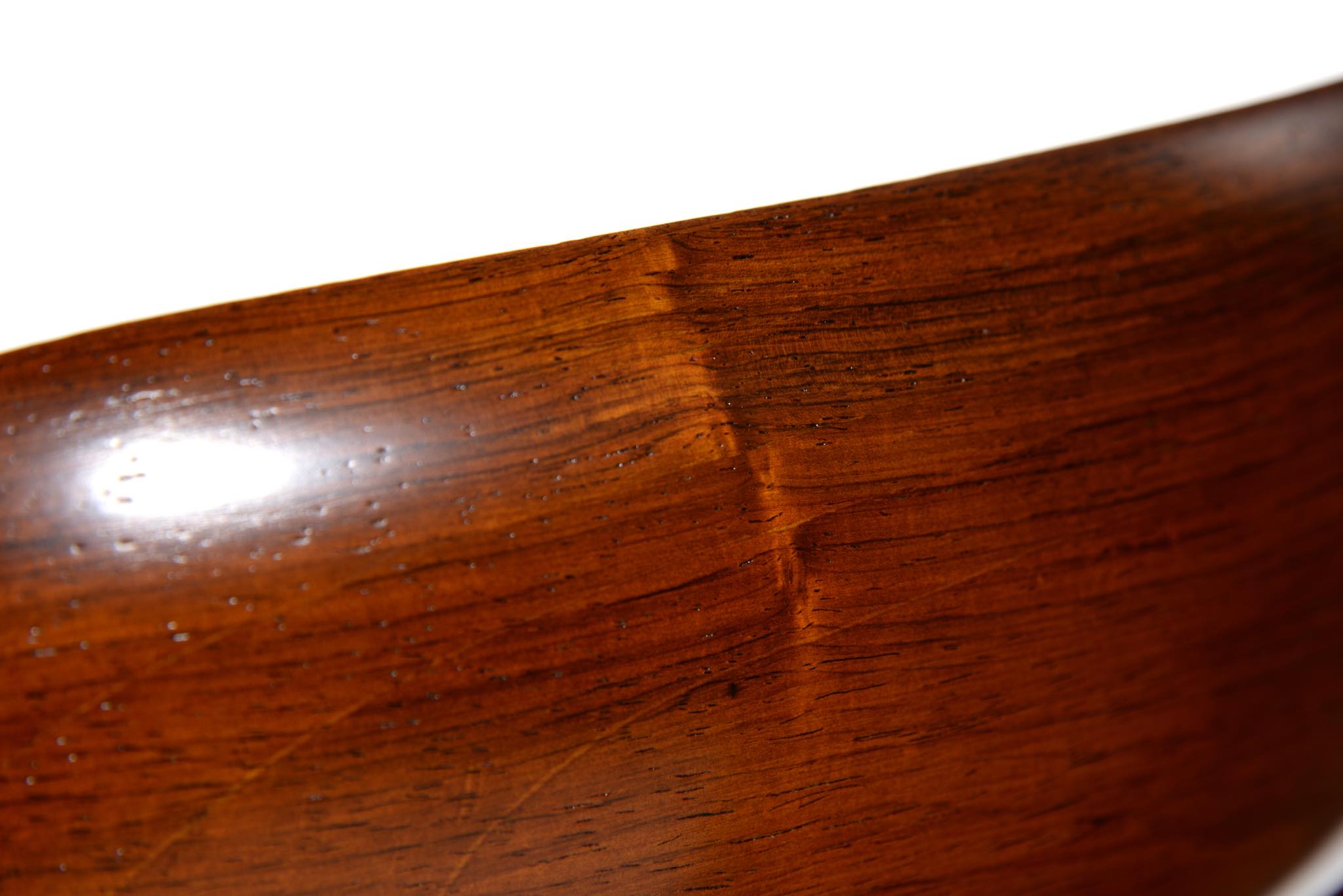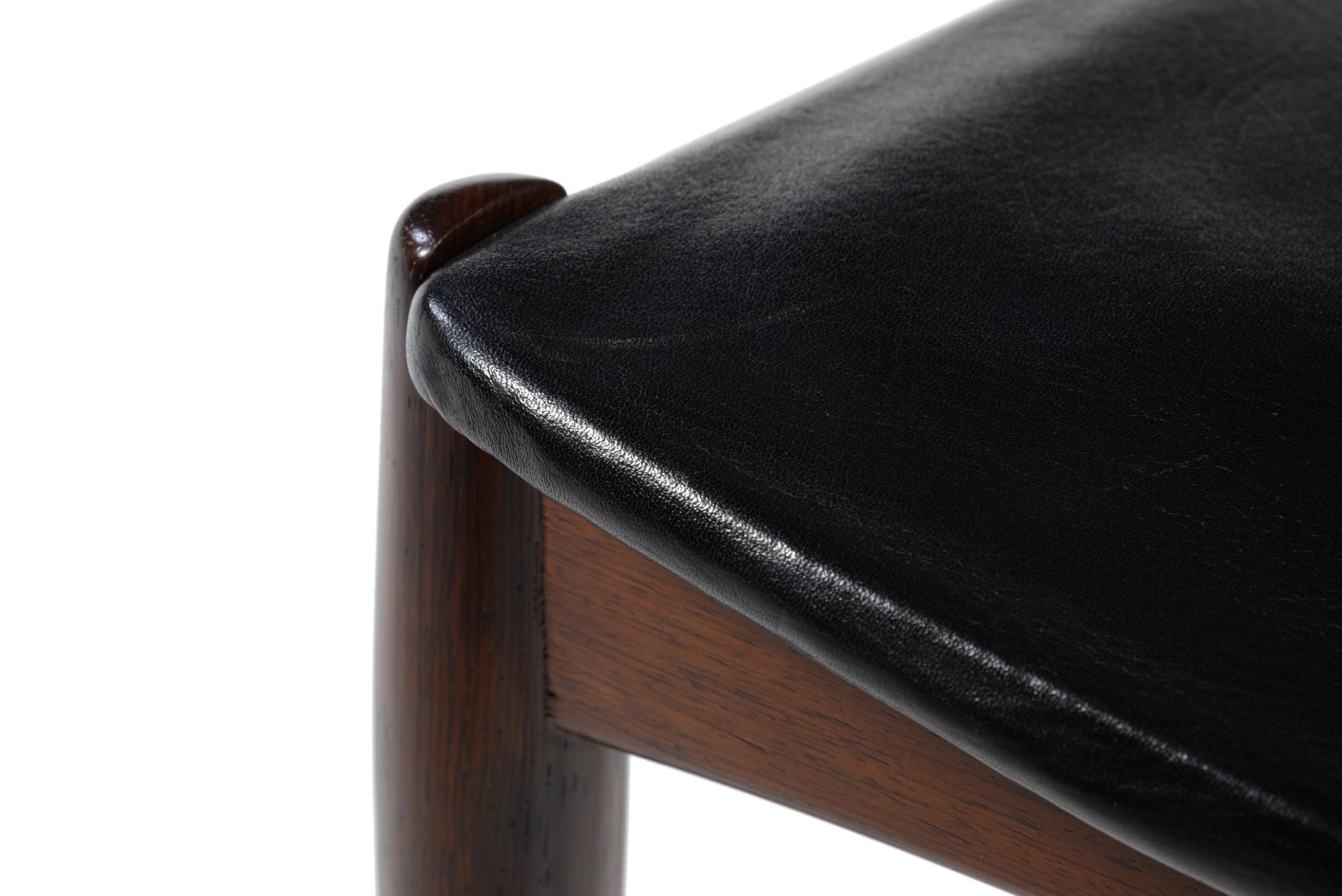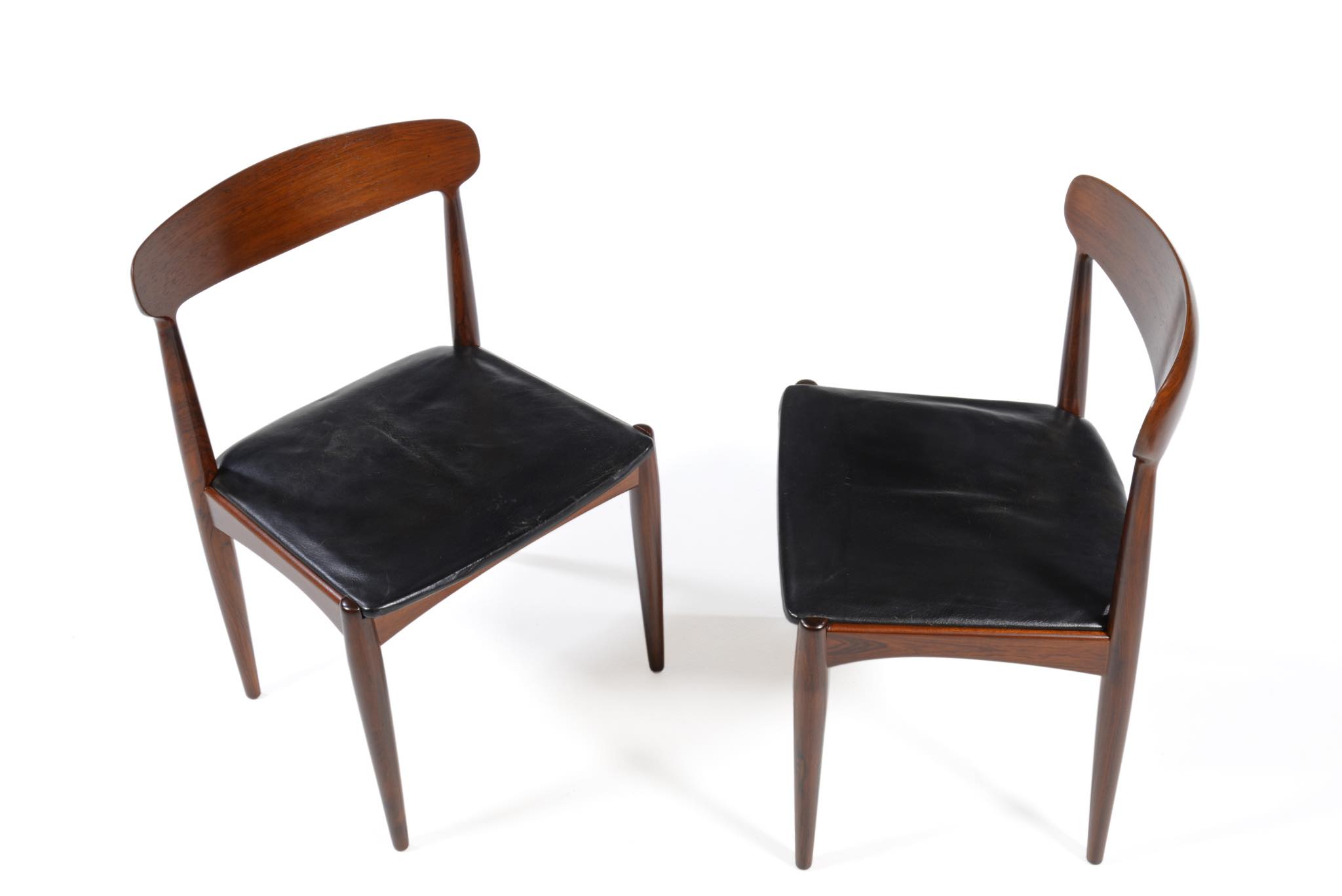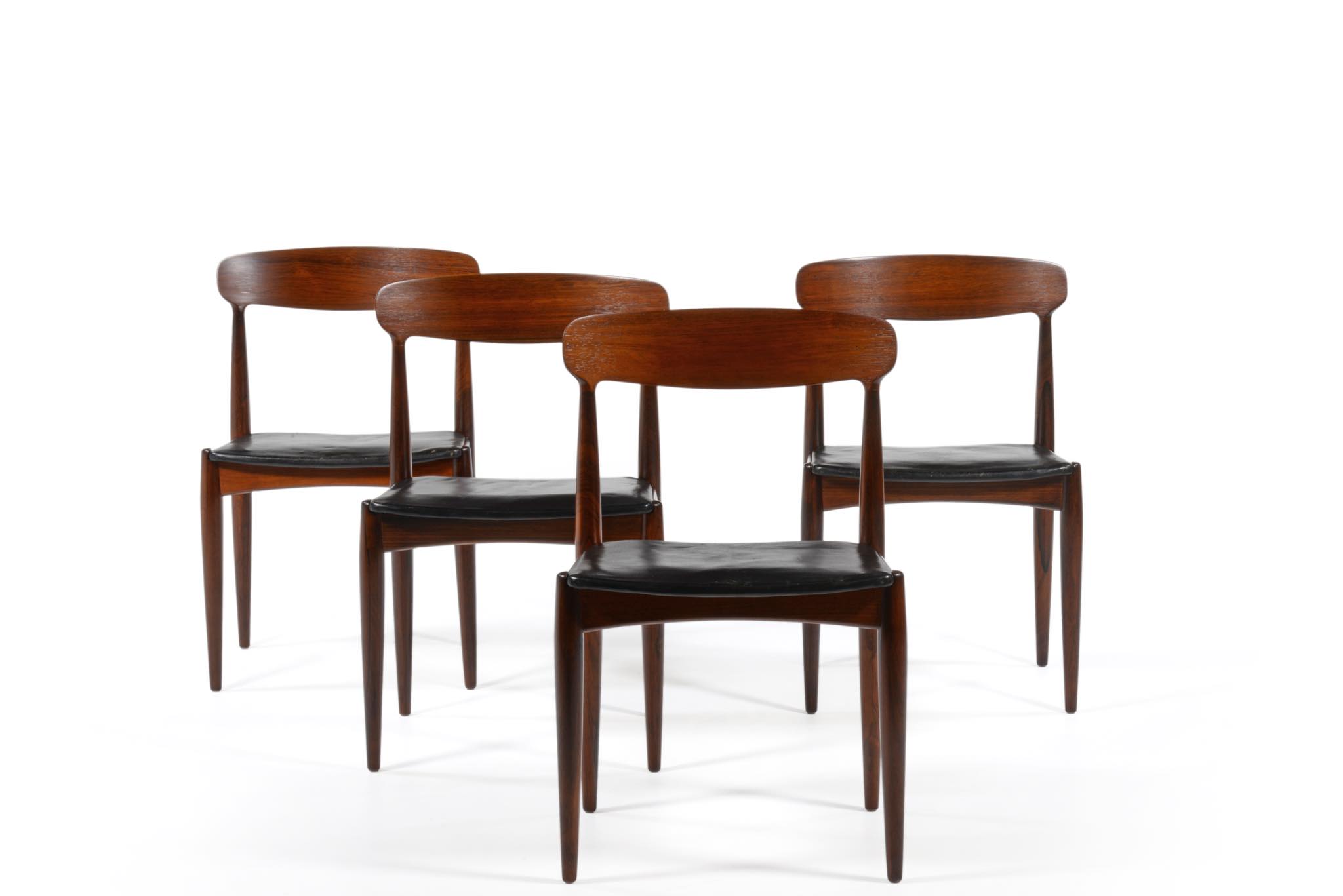 デンマークのデザイナー、Johannes Andersen/ヨハネス・アナセンによるダイニングチェアです。1960年代に作られたものでしょう。落ち着いたデザインでありながら精度の高い作りをしています。上質なローズウッドを用いており、弧を描く笠木は座りやすく設計されています。シートの使い込まれた皮革が経年の風味を醸していますが、内部のウレタンは劣化しており、クッション性を得るためには張り替えが必要です。お好みの皮革で張り替える費用を含んだ価格です。納品前に張り替えを承ることも可能ですが、現状の経年感を楽しんでいただき数年後に張り替えをご検討いただいても良いでしょう。例え、現状でのお届けから5年後の張り替えであっても、その費用はこちらに含まれます。詳しくはお問い合わせください。
