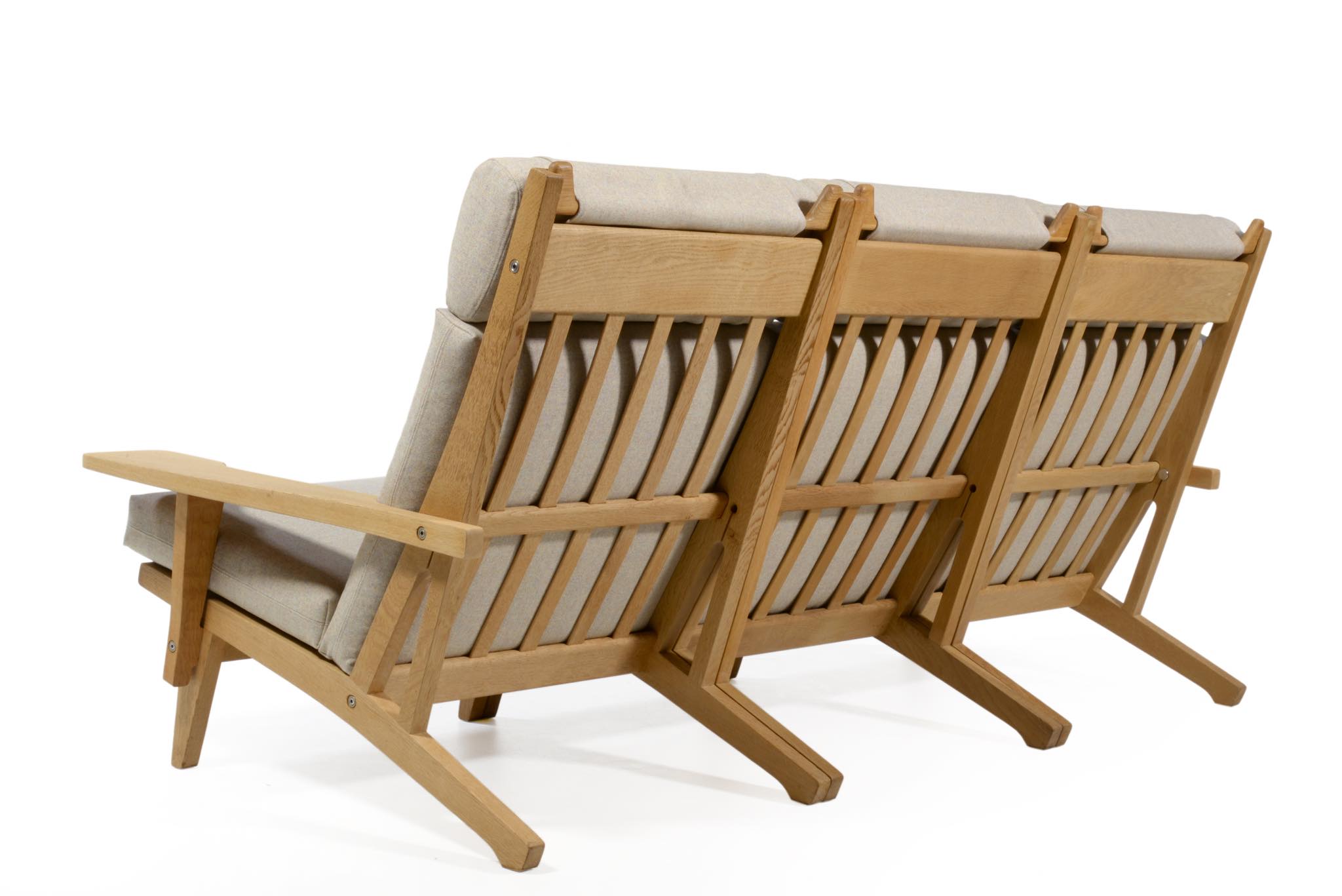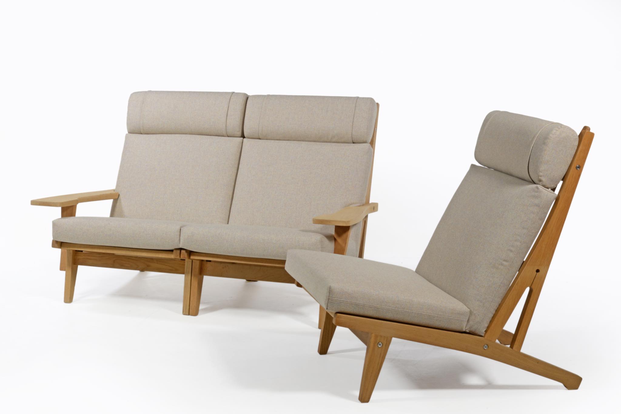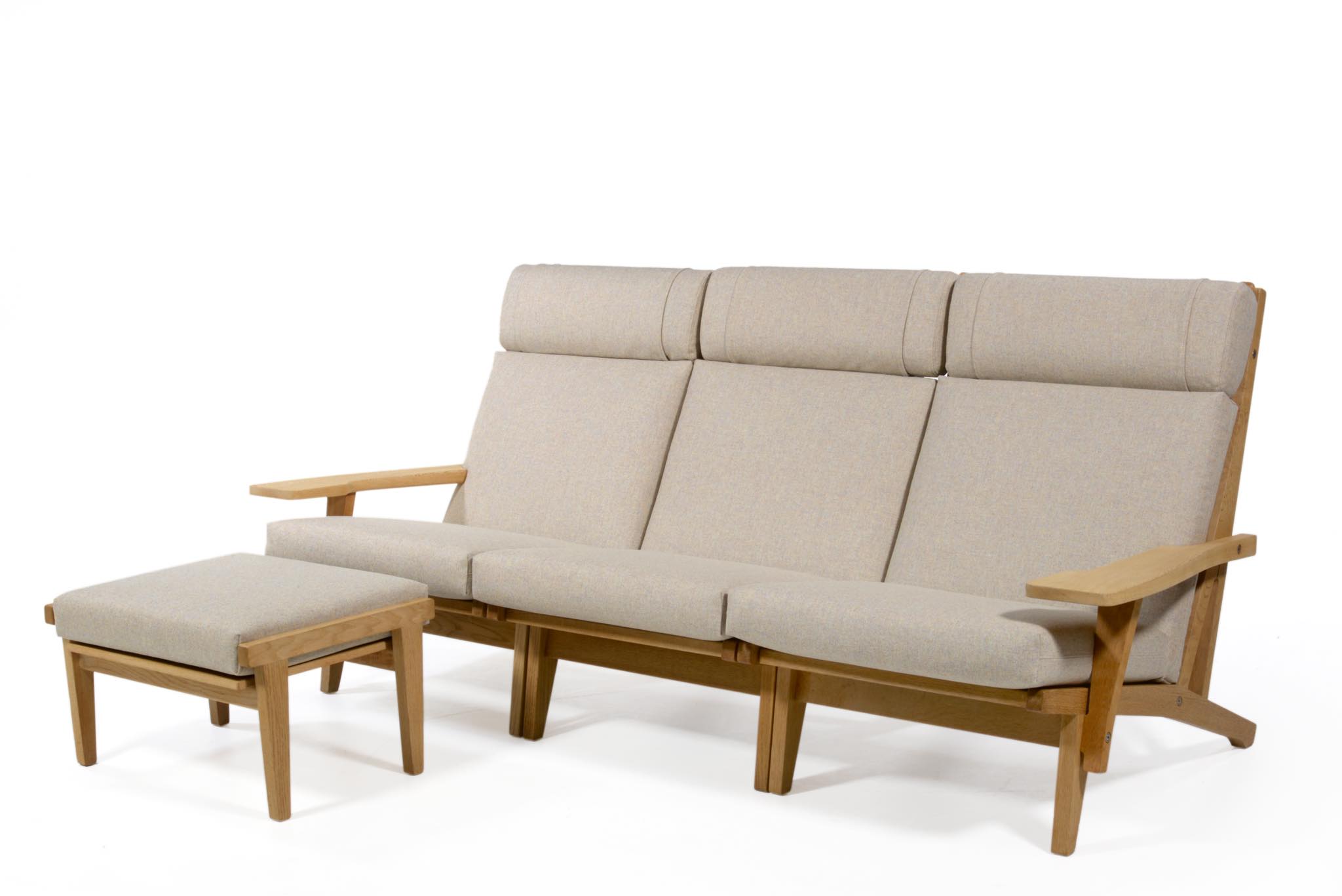 Hans J. Wegner/ハンス・ウェグナーによるGE375ソファです。大振りな本体に高さの変えられるヘッドレスト、カップを載せられる幅広のアームが特長です。テーブルにもなるフットスツールが備わります。