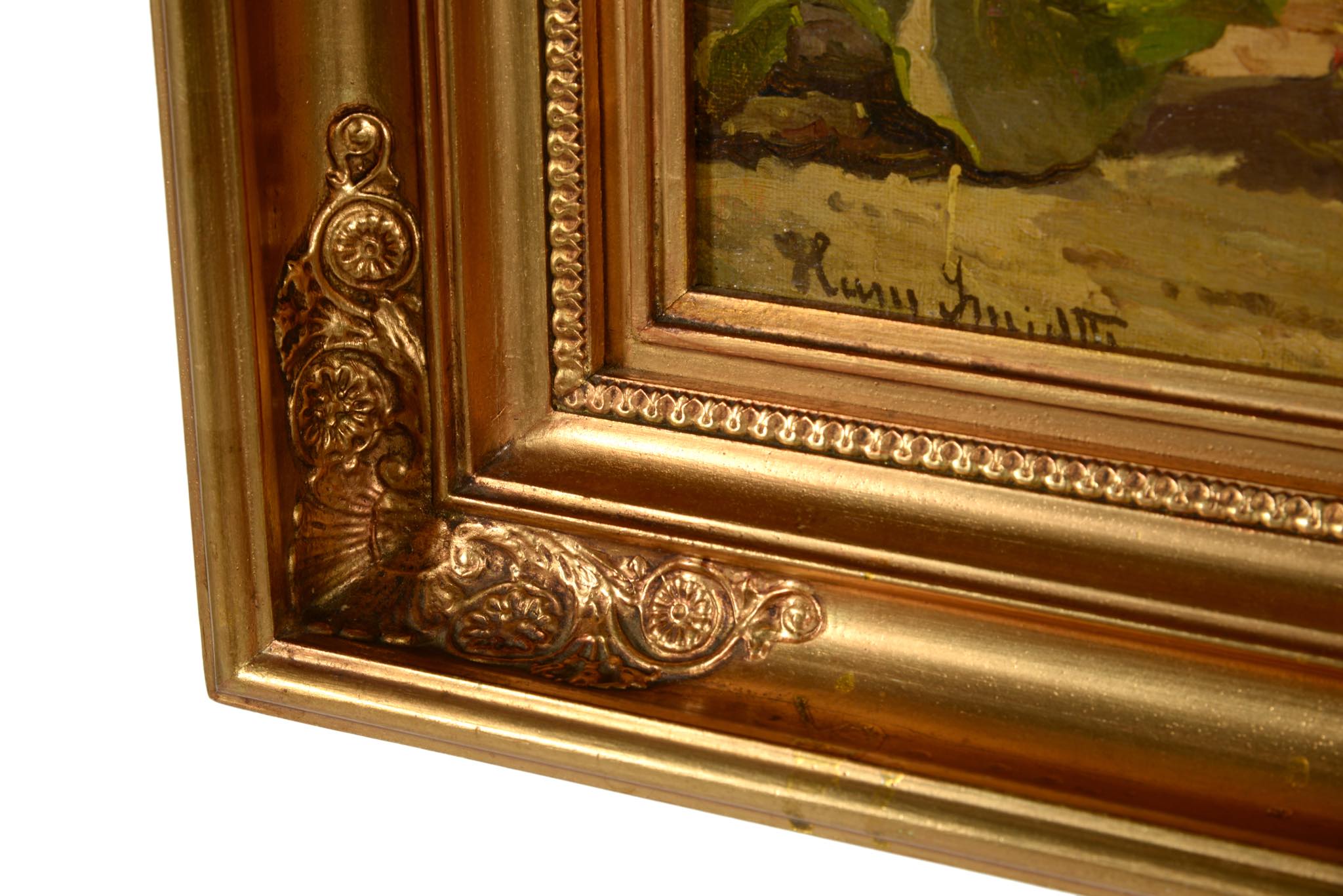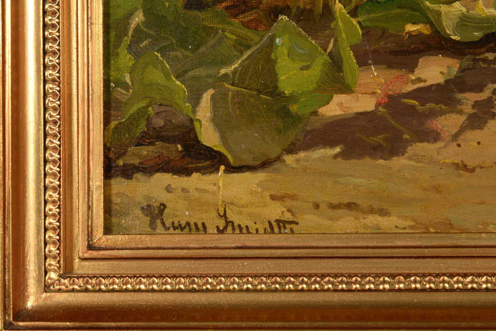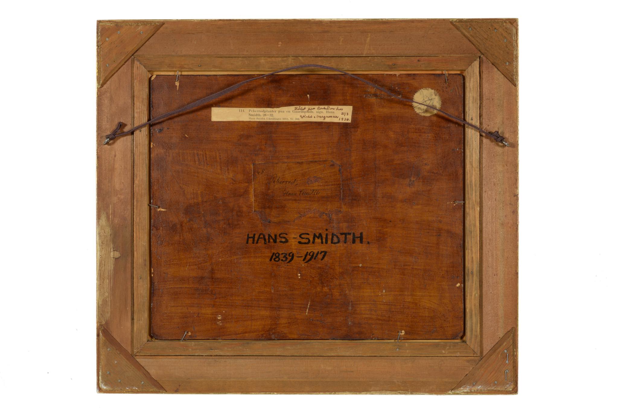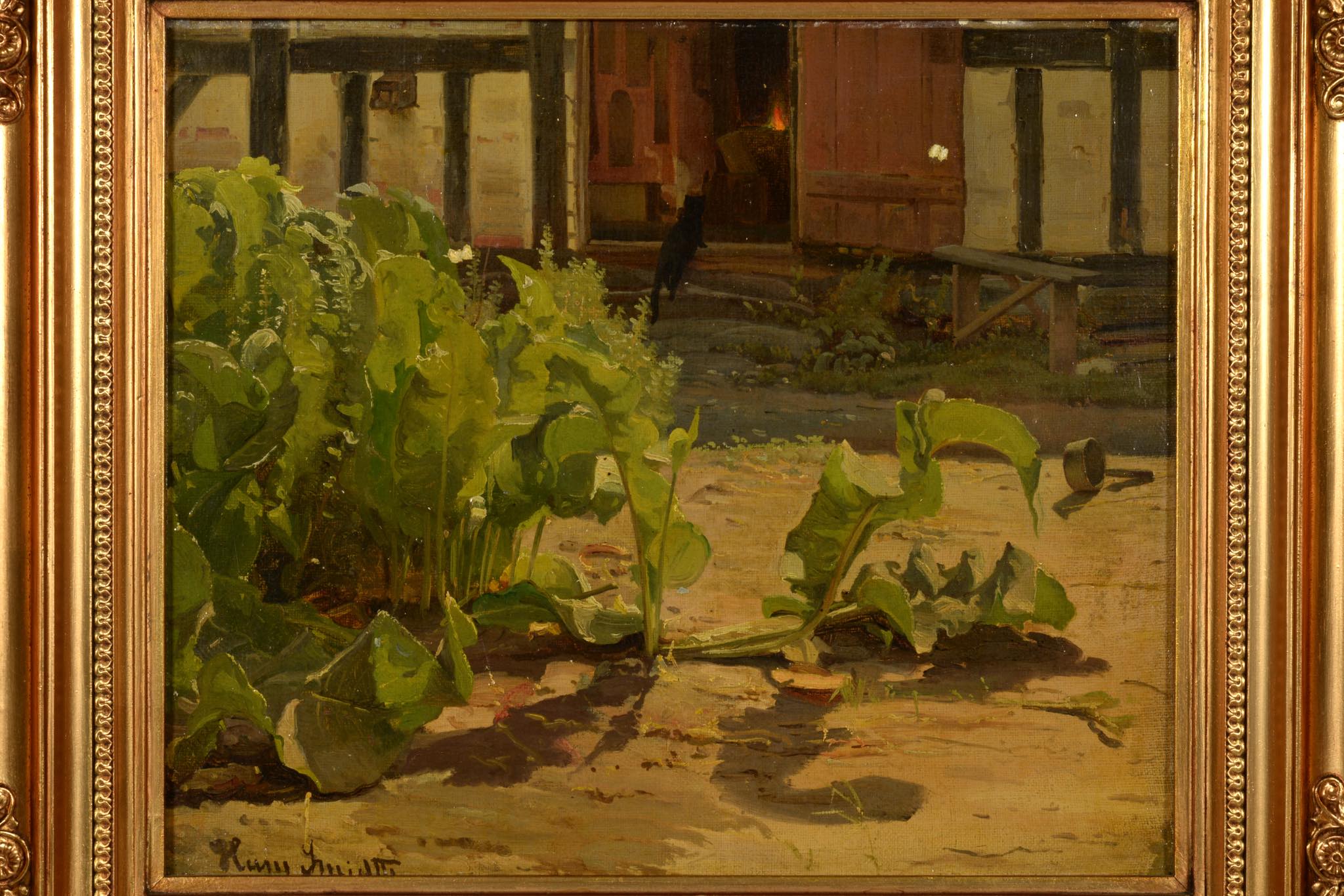 19世紀のデンマーク、ユトランド半島で活躍した画家、Hans Smidth/ハンス・スミスによる風景画作品です。農家の中庭の様子が描かれており、ドアの隙間から台所を覗き込む黒猫や、宙を舞う蝶、そして乾いた大地にたくましく育つ Peberrod/西洋山葵の様子が写実的に描かれています。こちらはキャンバスではなく板に描かれたもので、伝世してきた額縁を伴います。裏板の後年に貼られたラベルには1918年に行われた展覧会への出展品とされており、描かれた年は判りませんが、氏が逝去した翌年に展示出展された作品と思われます。