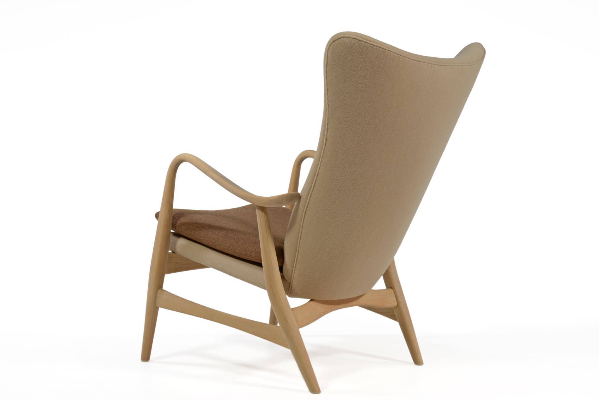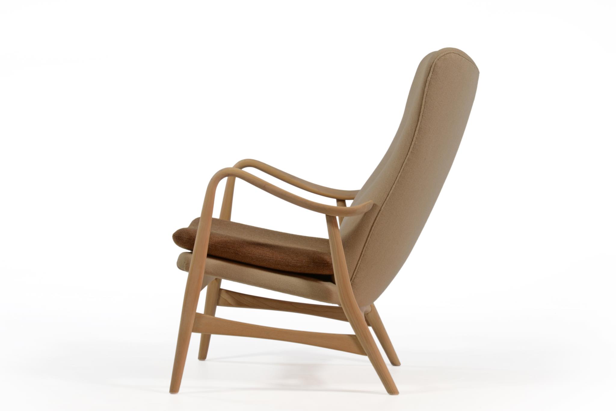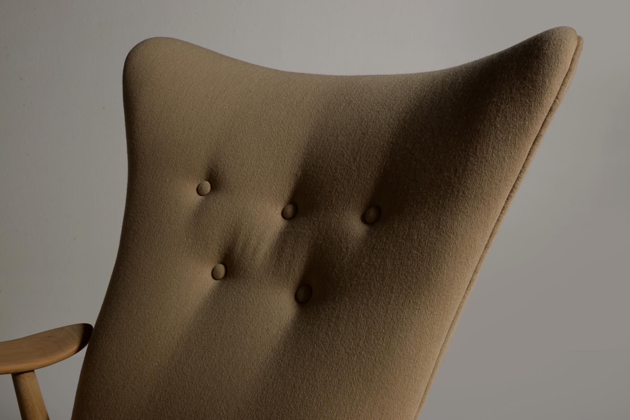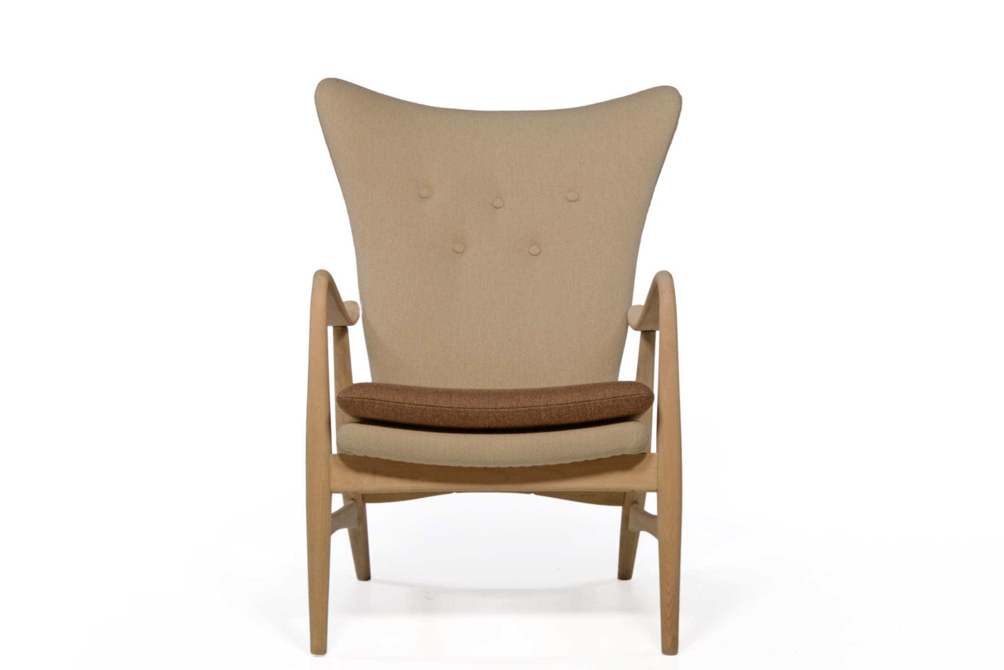 デンマークの家具デザイナー兼キャビネットメーカーの、Ib Madsen/イブ・マドセンとActon Schubell/アクトン・シュベルによるイージーチェアです。1950年代に作られたものでしょう。パワーナップ(仮眠)のための大きなウイングや、彫刻的に削り出されたアームレストなど、おおらかな曲線が時代を反映しています。ファブリックは張り替え済みです。