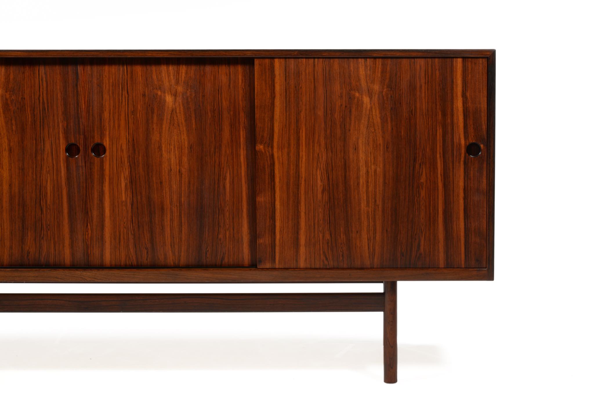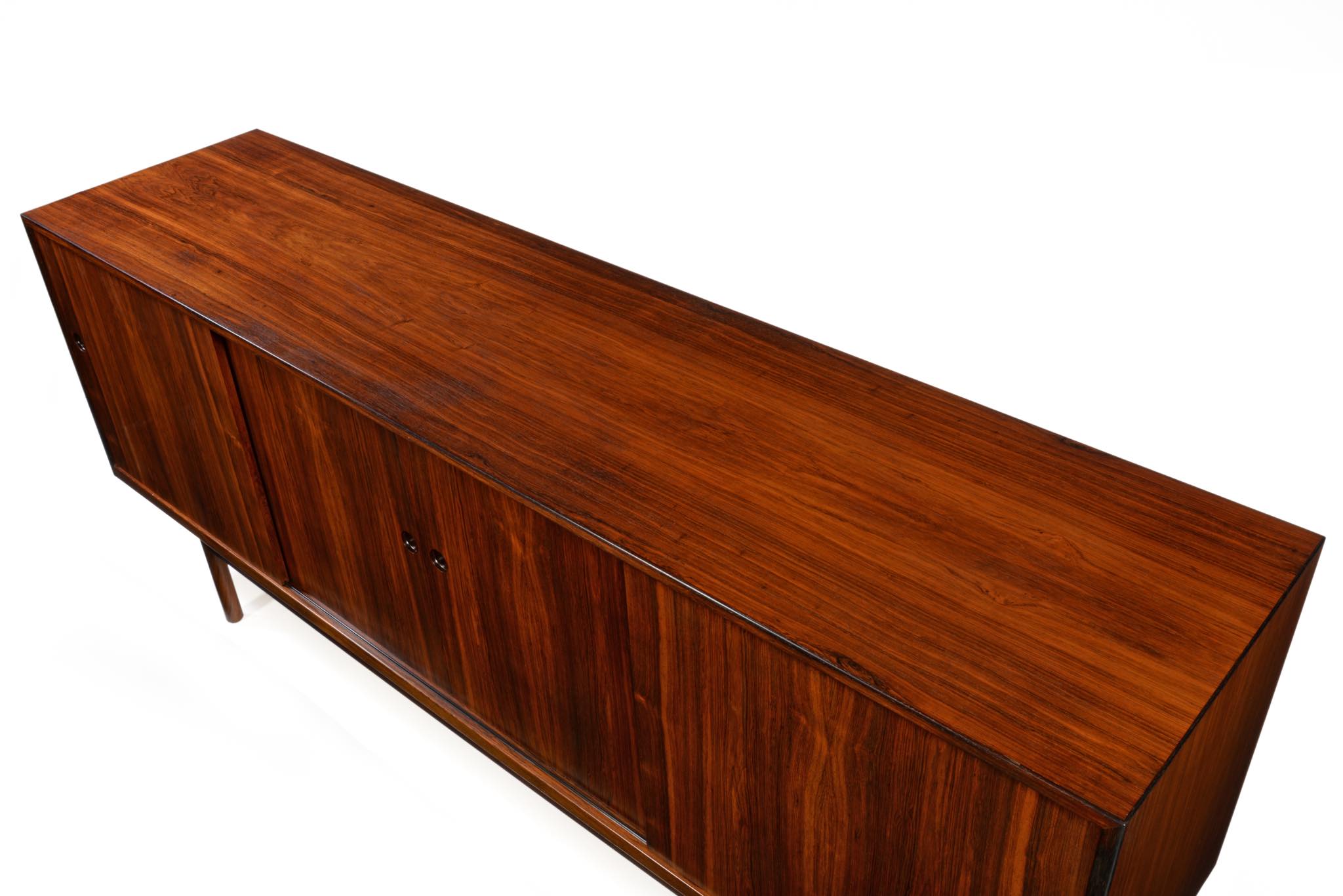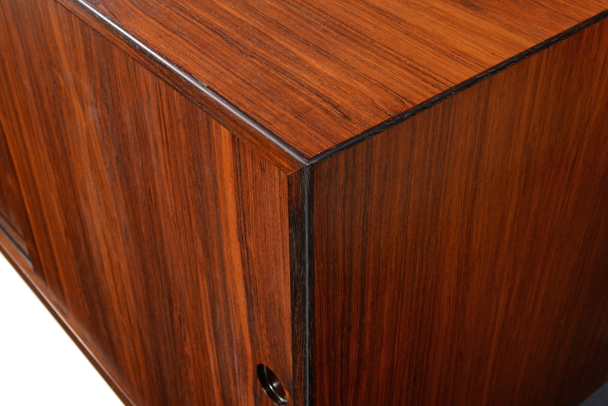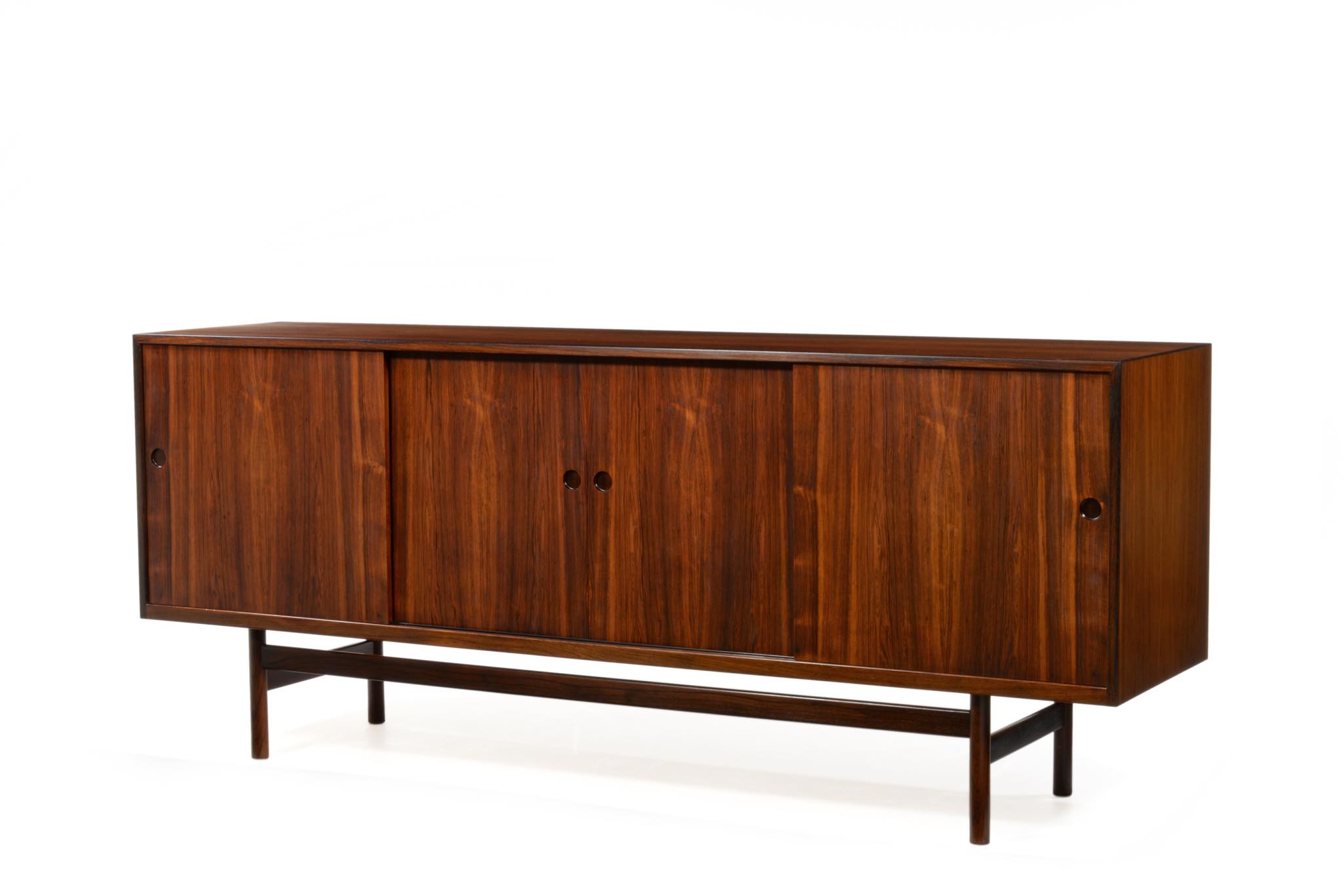 デンマーク製、1960年代頃に作られた大振りなサイドボードです。デザイナーや工房など詳しいことはわかっておりませんが、上質なローズウッドを用いて丁寧に作られたものです。