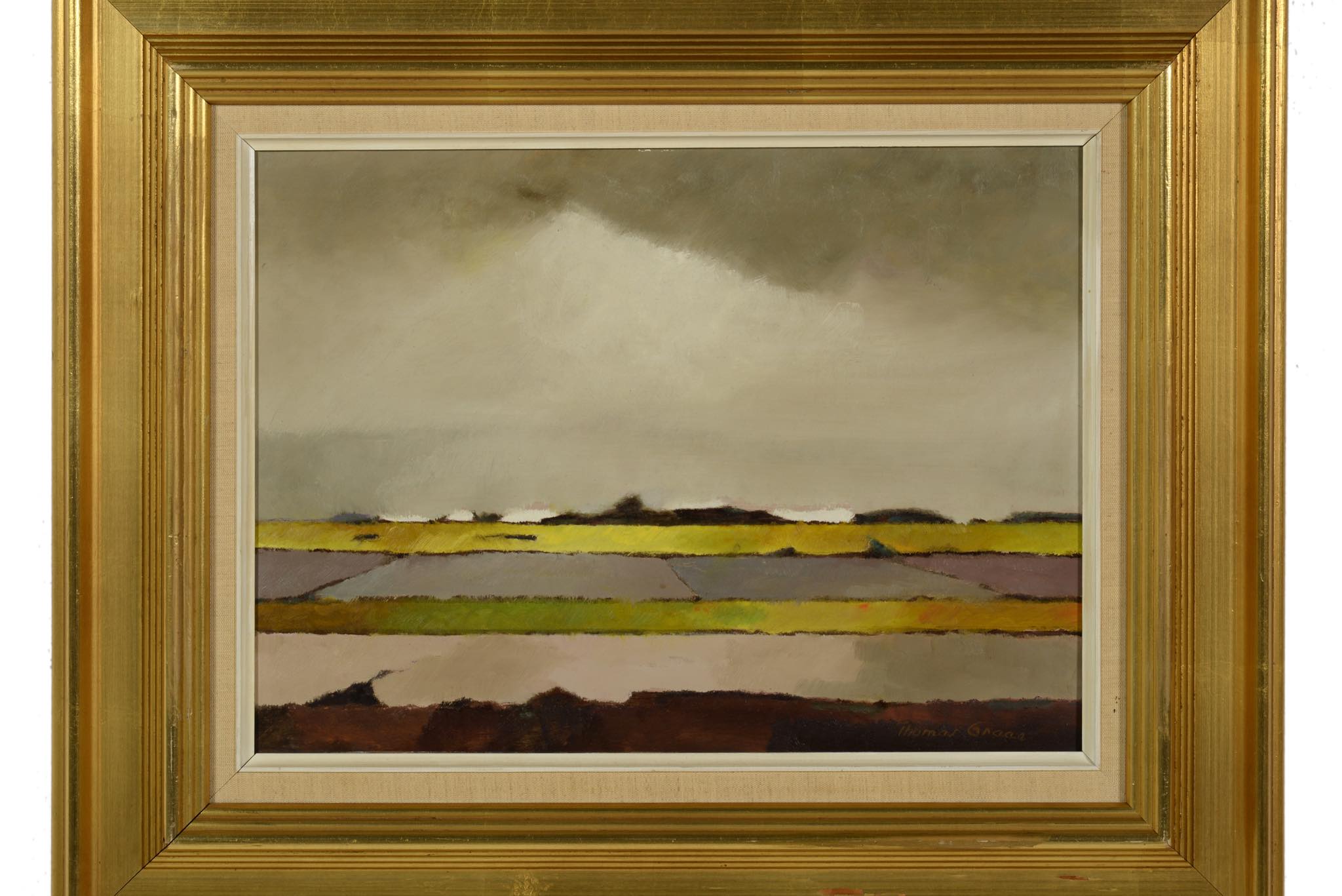 デンマークの画家、Thomas Graae/トーマス・グラーエによる風景画作品です。長閑な田園風景が描かれており、雲の上から湿った大気に差し込む陽の光がなかば観察的に描かれています。
