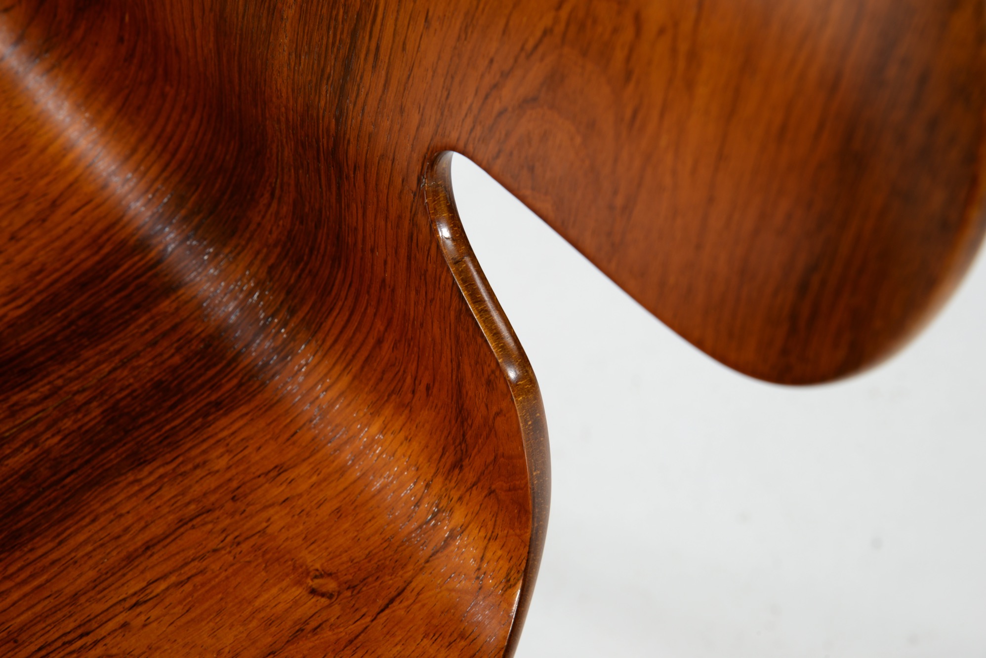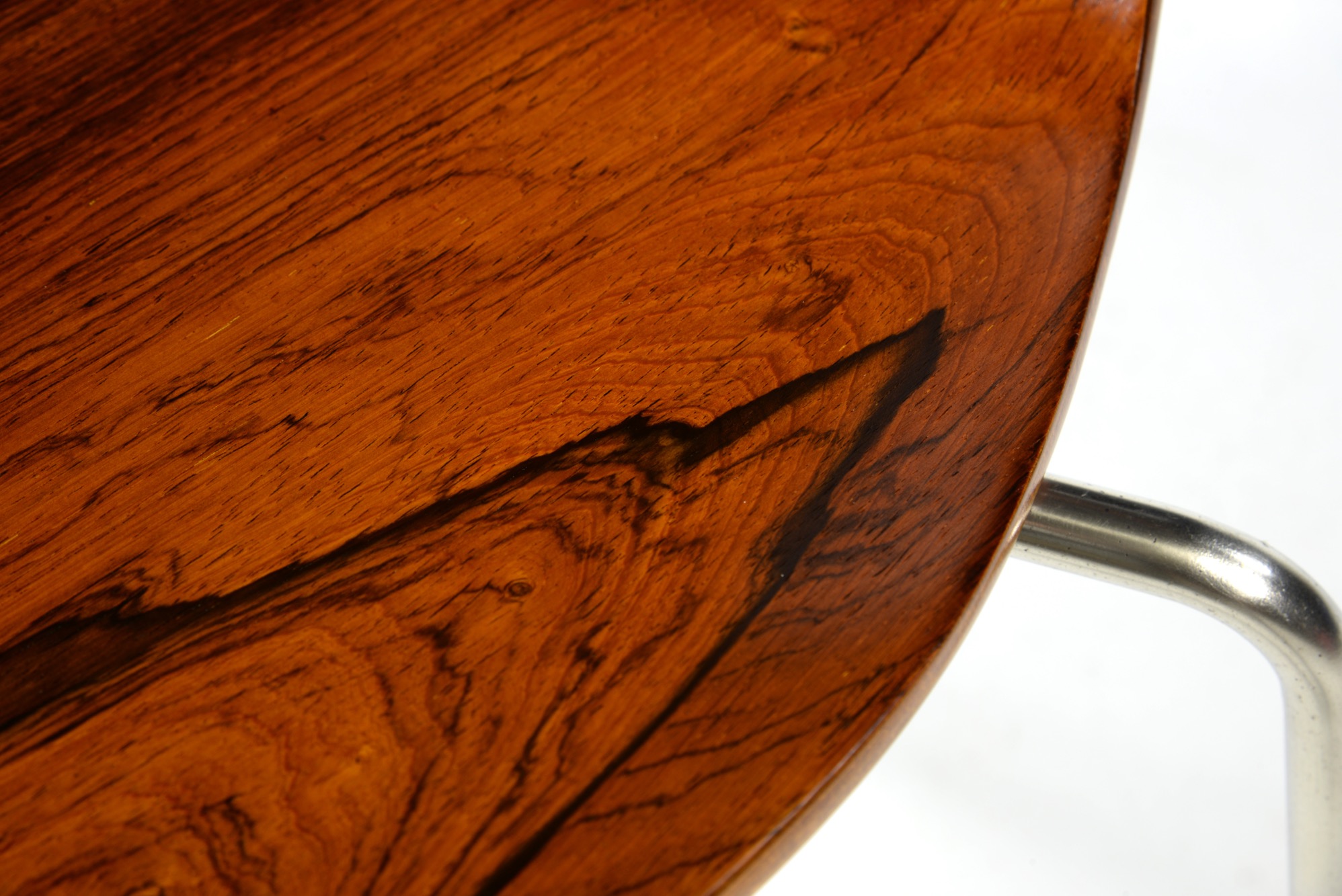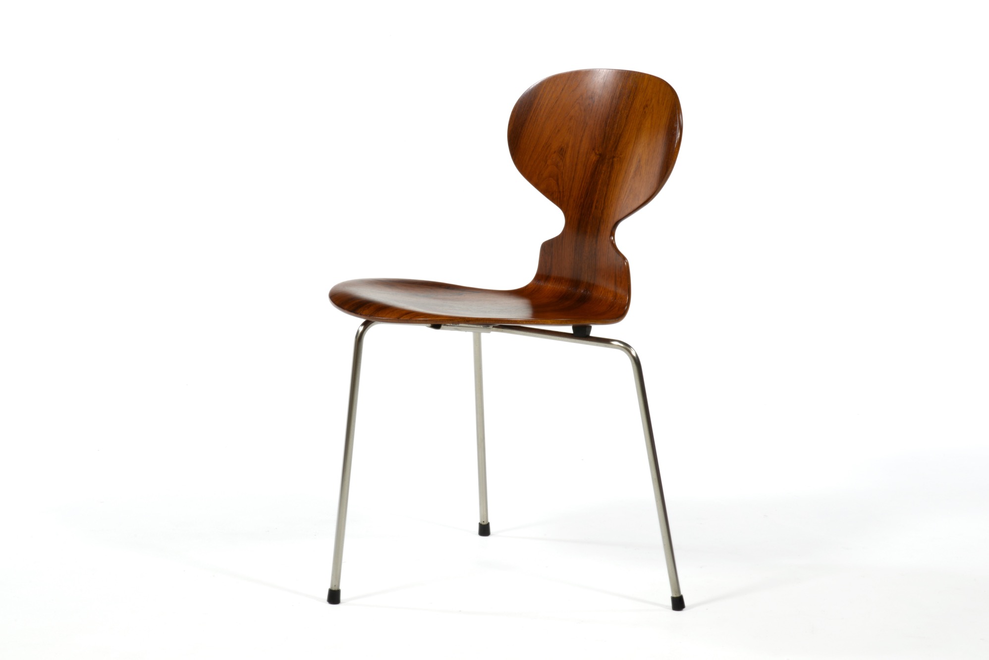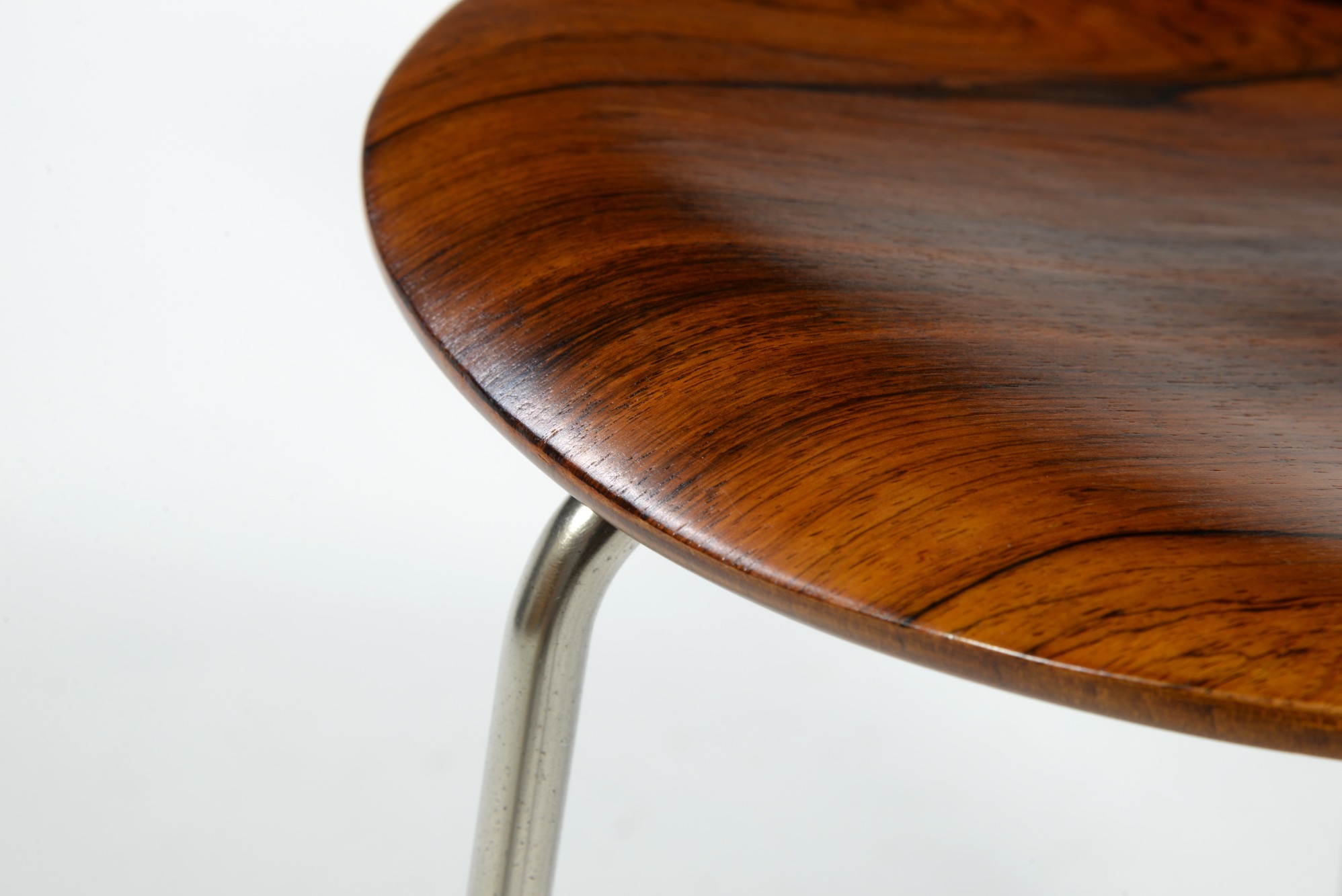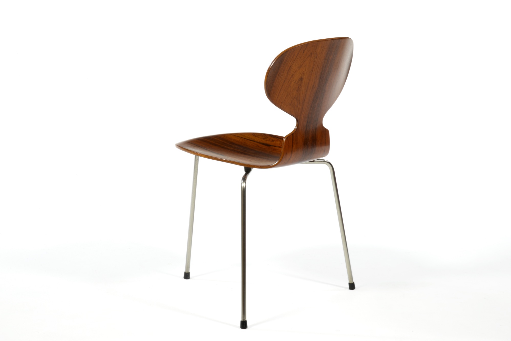 Arne Jacobsen/アルネ・ヤコブセンによってデザインされた”アント”チェア、ブラジリアンローズウッドの仕様です。1955〜63年までの期間に作られたもので、木目文様に見応えがあります。傷みやすい腰の突き板部分も問題なく、これまで大切に使われてきたことが伺えます。