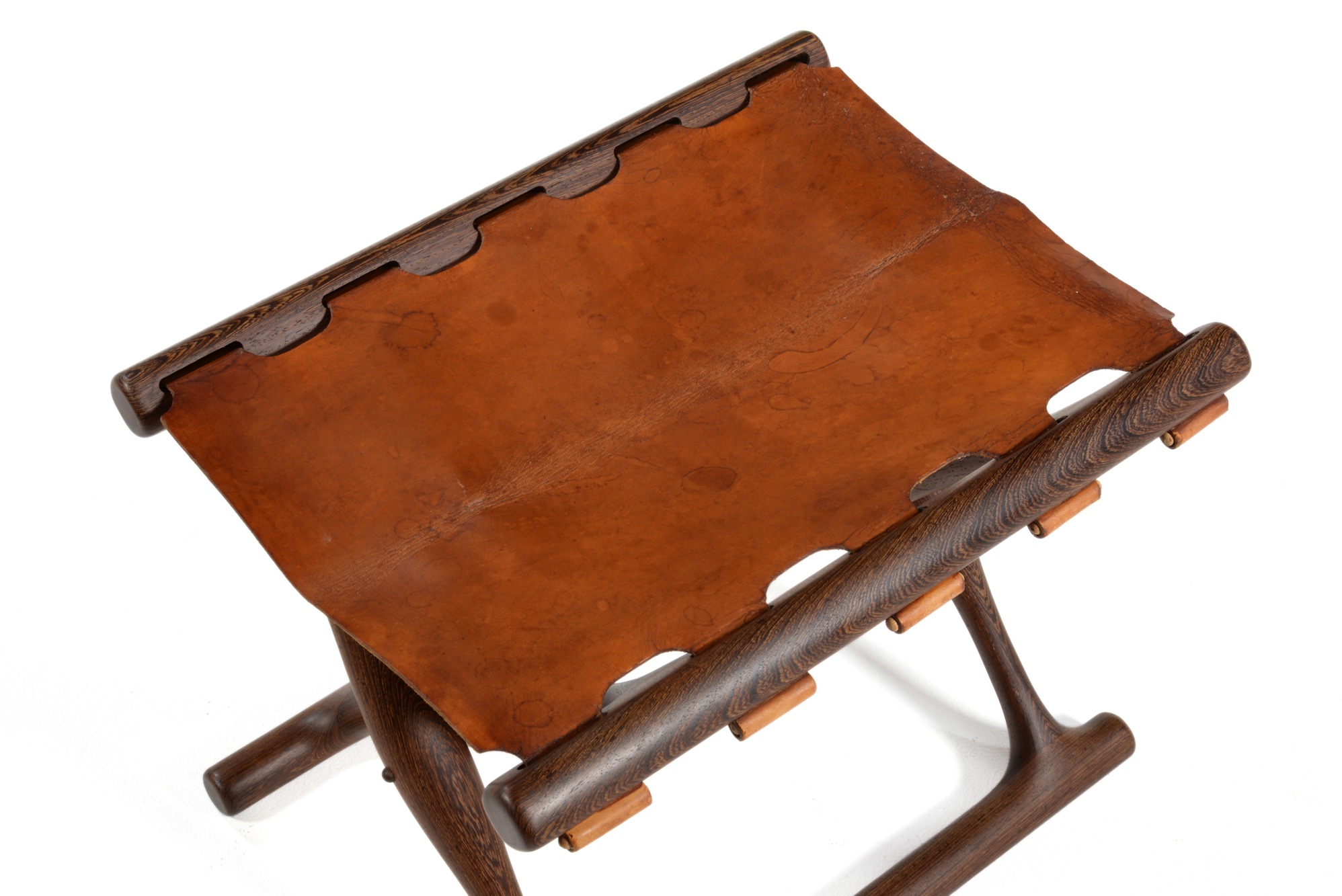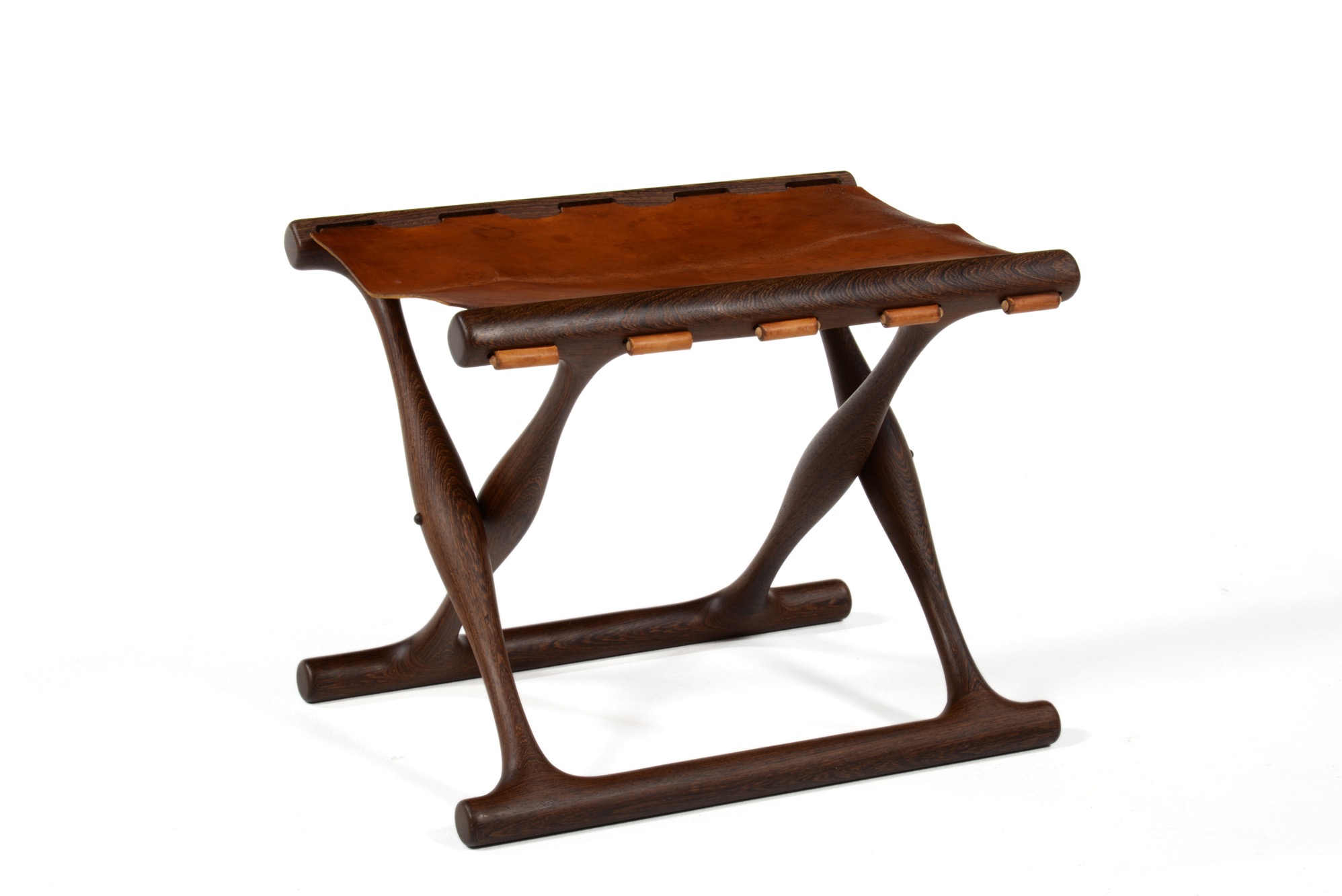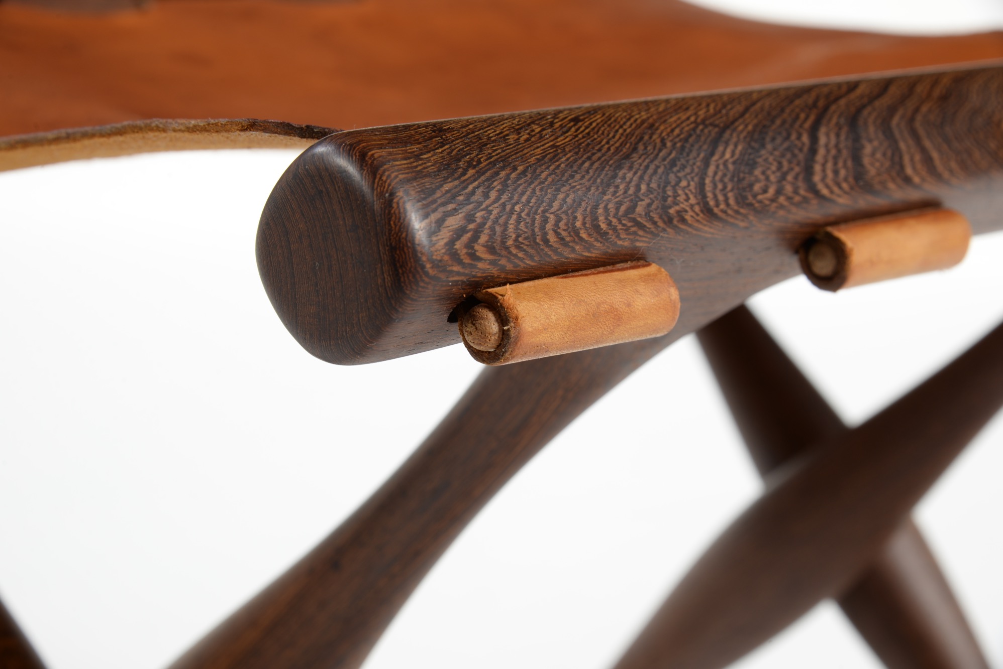 デンマークのデザイナー兼キャビネットメーカーのPoul Hundevad/ポール・フンネヴァッドによるフォルディングスツールです。ユトランド半島のVamdrupで発見された青銅器時代、紀元前1300年頃の椅子をもとにリ・デザインしたもので、鉄刀木の持つ独特の材質と長年使い込まれたヌメ革に見応えがあります。