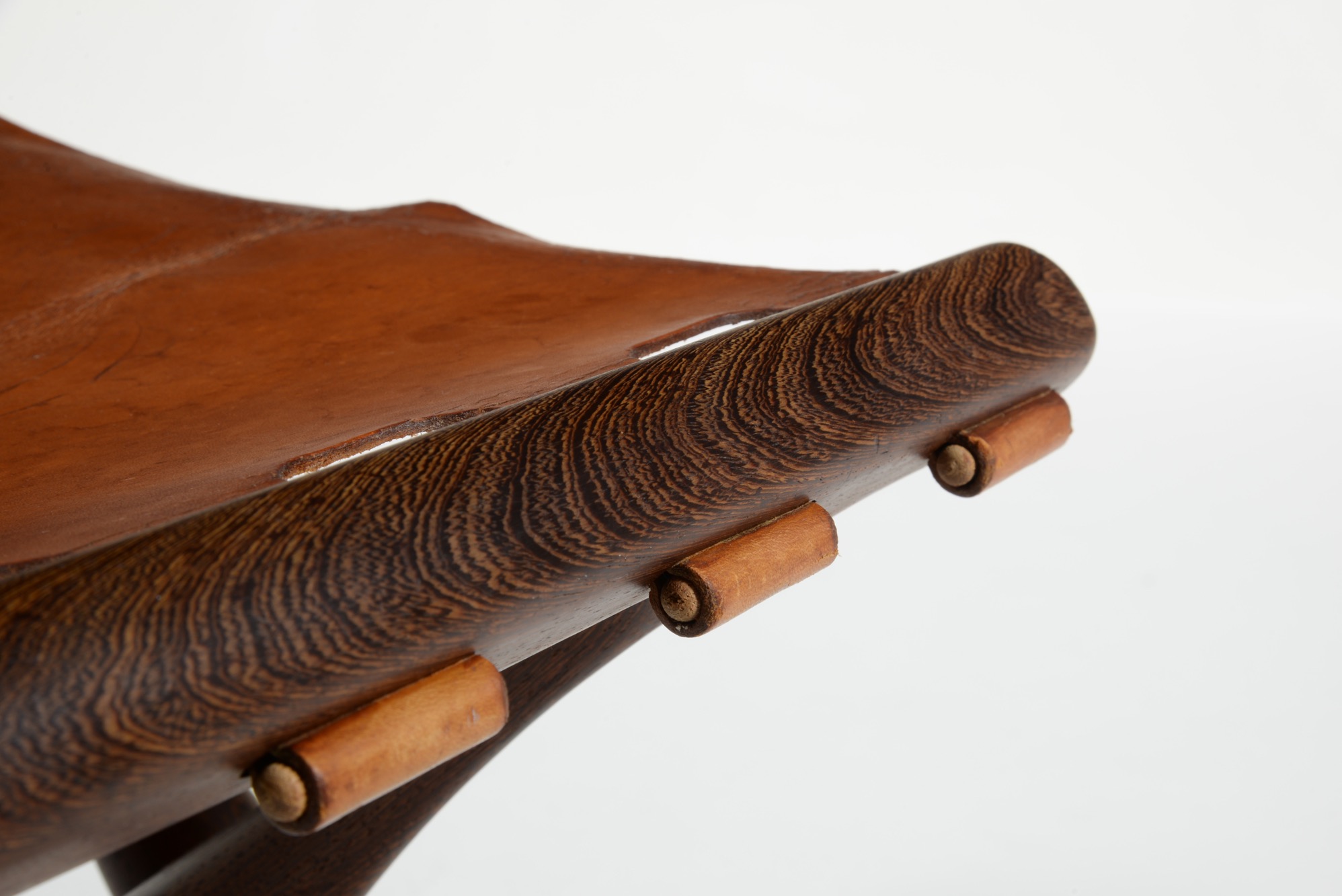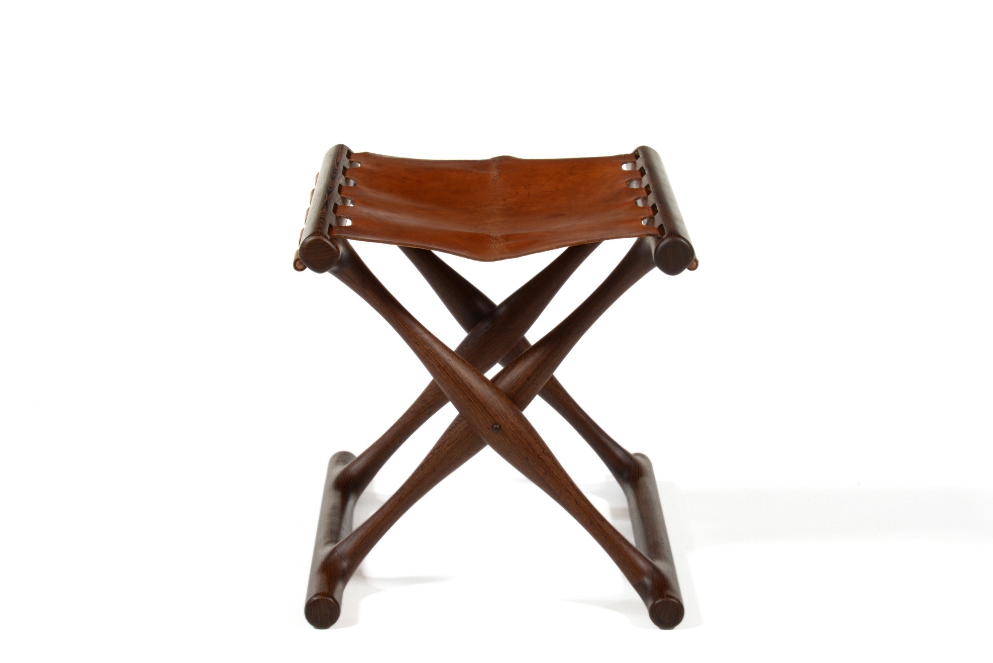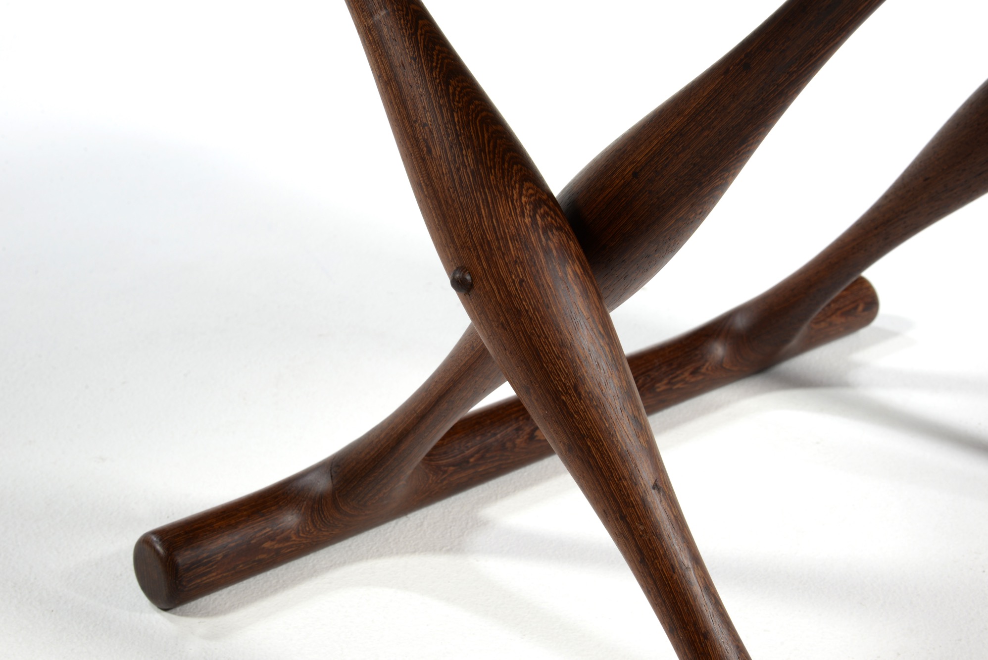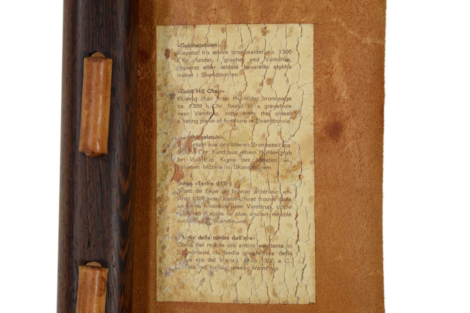 デンマークのデザイナー兼キャビネットメーカーのPoul Hundevad/ポール・フンネヴァッドによるフォルディングスツールです。ユトランド半島のVamdrupで発見された青銅器時代、紀元前1300年頃の椅子をもとにリ・デザインしたもので、鉄刀木の持つ独特の材質と長年使い込まれたヌメ革に見応えがあります。