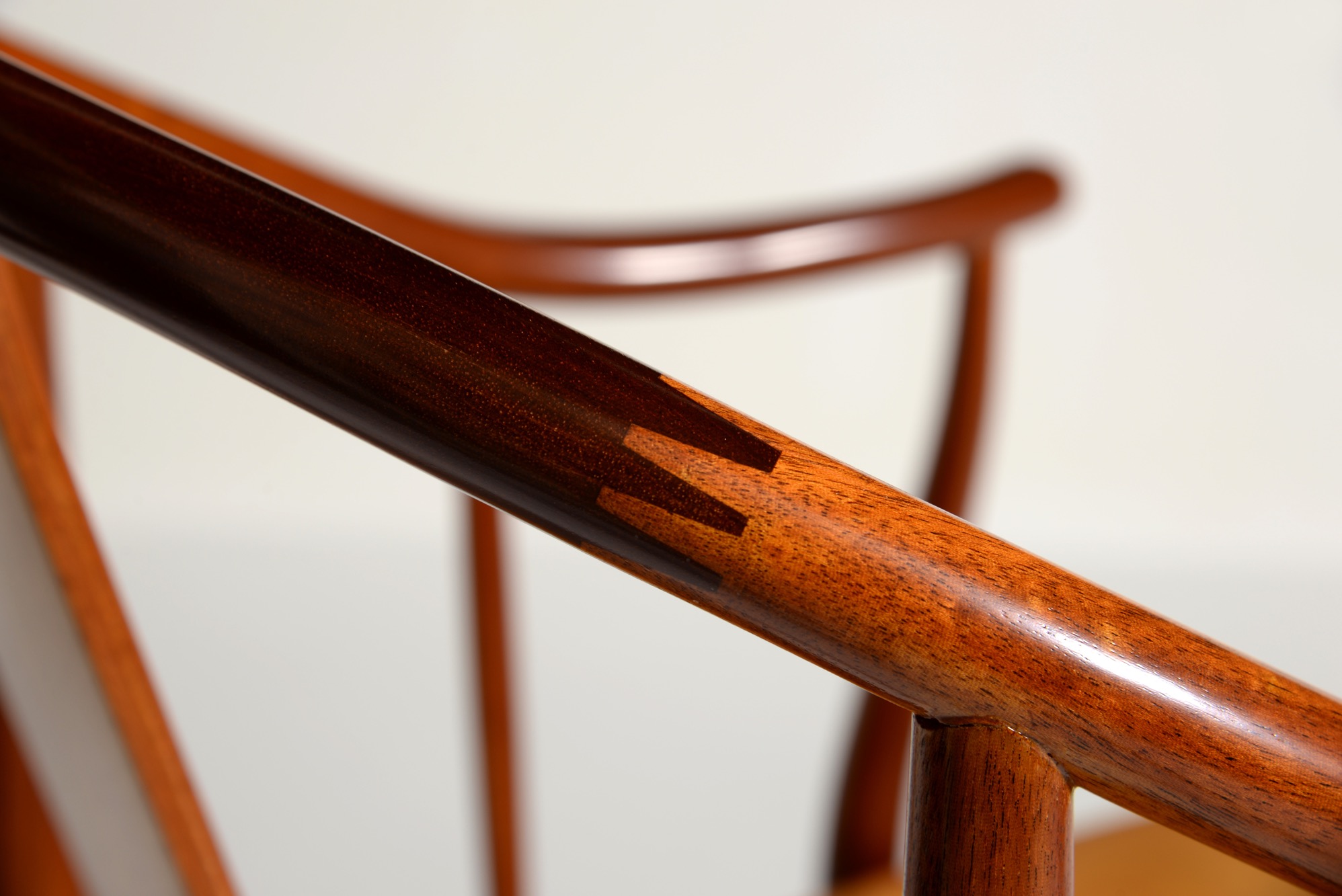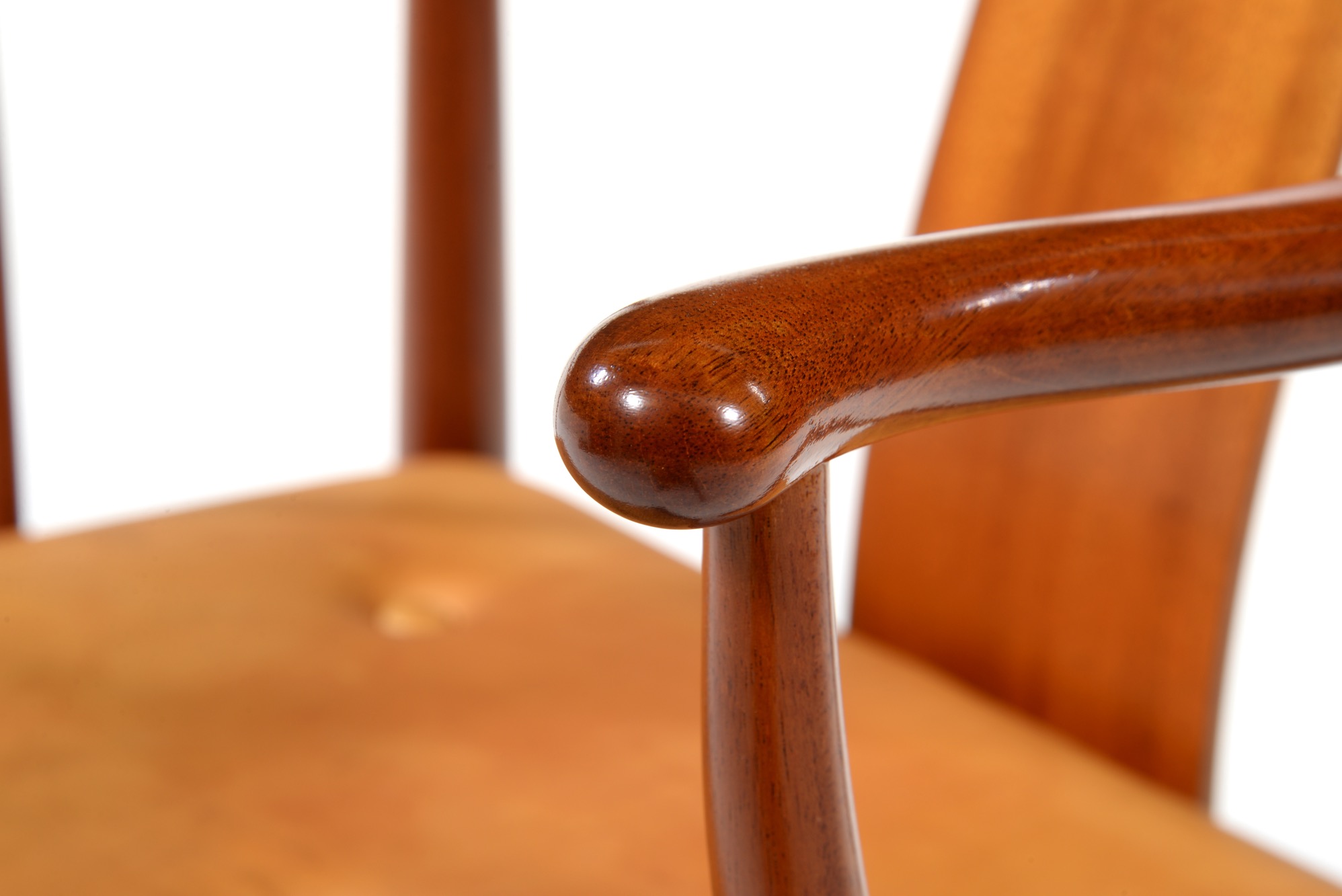 Hans J. Wegner/ハンス・ウェグナーによって1944年に発表された名作椅子 ”チャイナチェア” 、現在では廃番となっているマホガニー材のモデルです。中国明王朝時代の肘付椅子(圏椅/クワン・イ)をリ・デザインしたモデルで、ウェグナーの代表作のひとつとされています。ホンジュラス産と思しきマホガニー材はリボン杢も現れ、奥ゆかしく美しい光沢を放っています。使い込まれた古いクッションは良い雰囲気ですが、傷みもあり長くは持たなそうなので、新たに皮革でのクッションをお作りします。