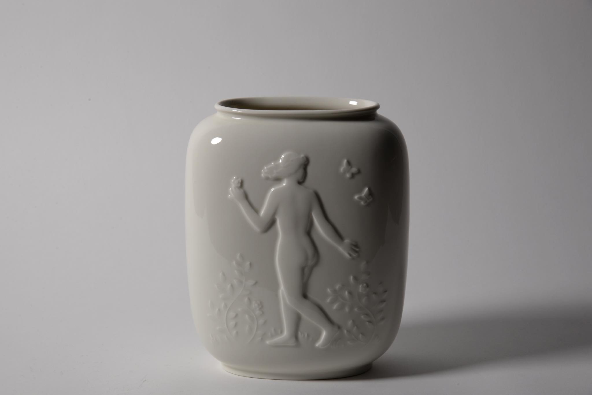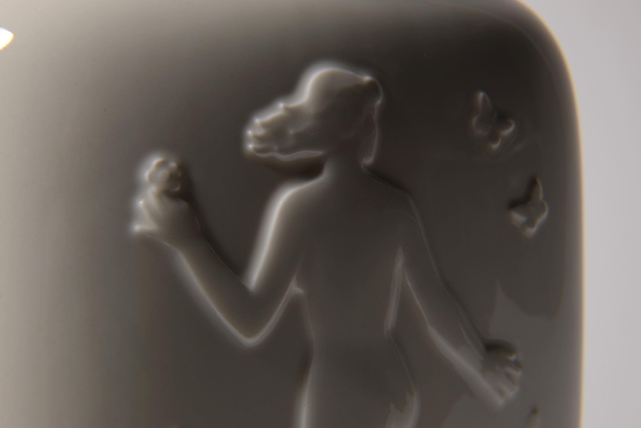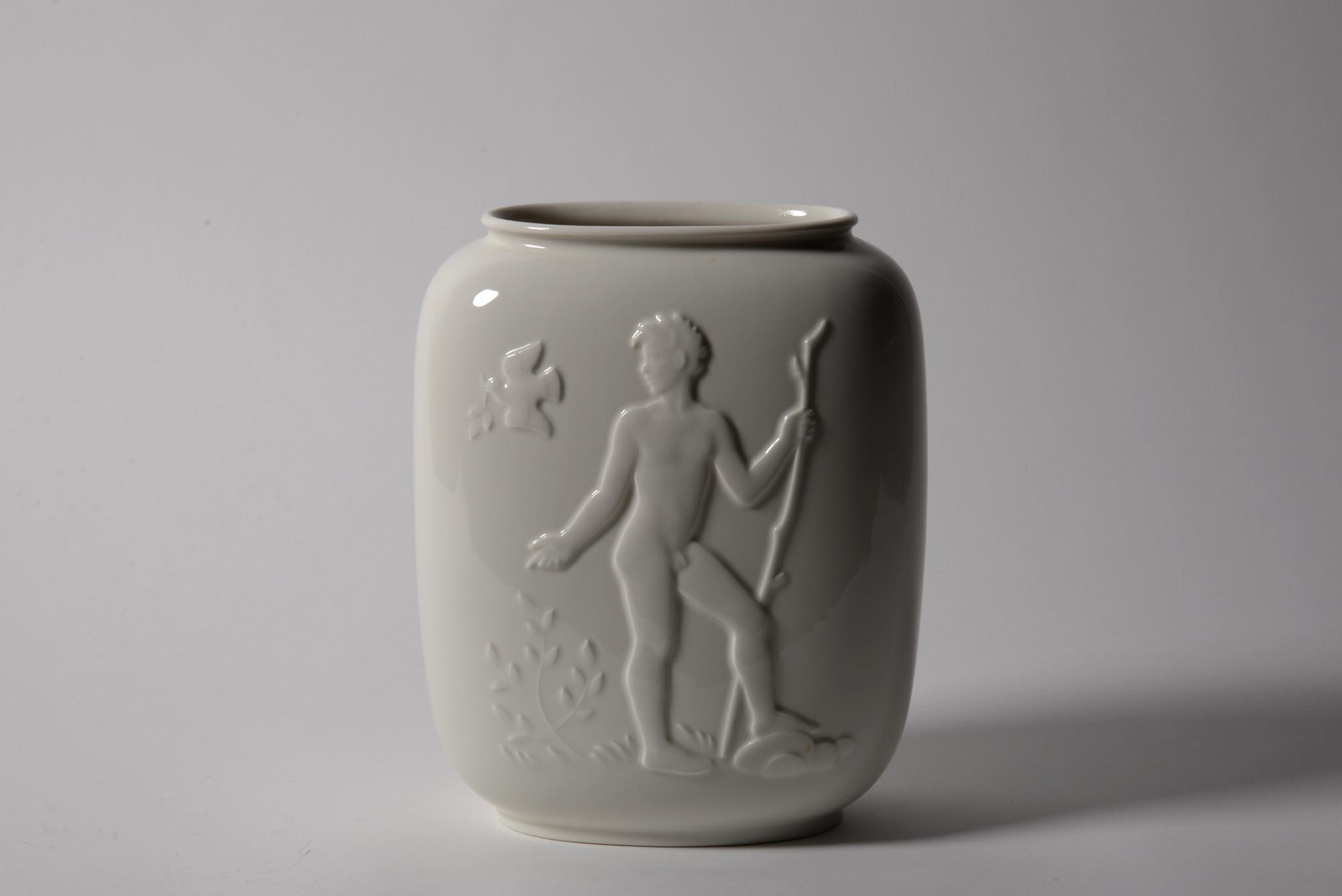 デンマークの陶芸家、Hans Henrik Hansen/ハンス・ヘンリック・ハンセンによる1944年発表のベースで、アダムとイヴのモチーフがレリーフ状に浮き彫りされています。柔らかな風合いが特長の Blanc de Chine/ブランドシーヌ(絵付けや彩色のされていないアイボリーの白磁)と呼ばれる濁手のような陶土で作られており、こちらは後年の1961年に焼成されたものです。