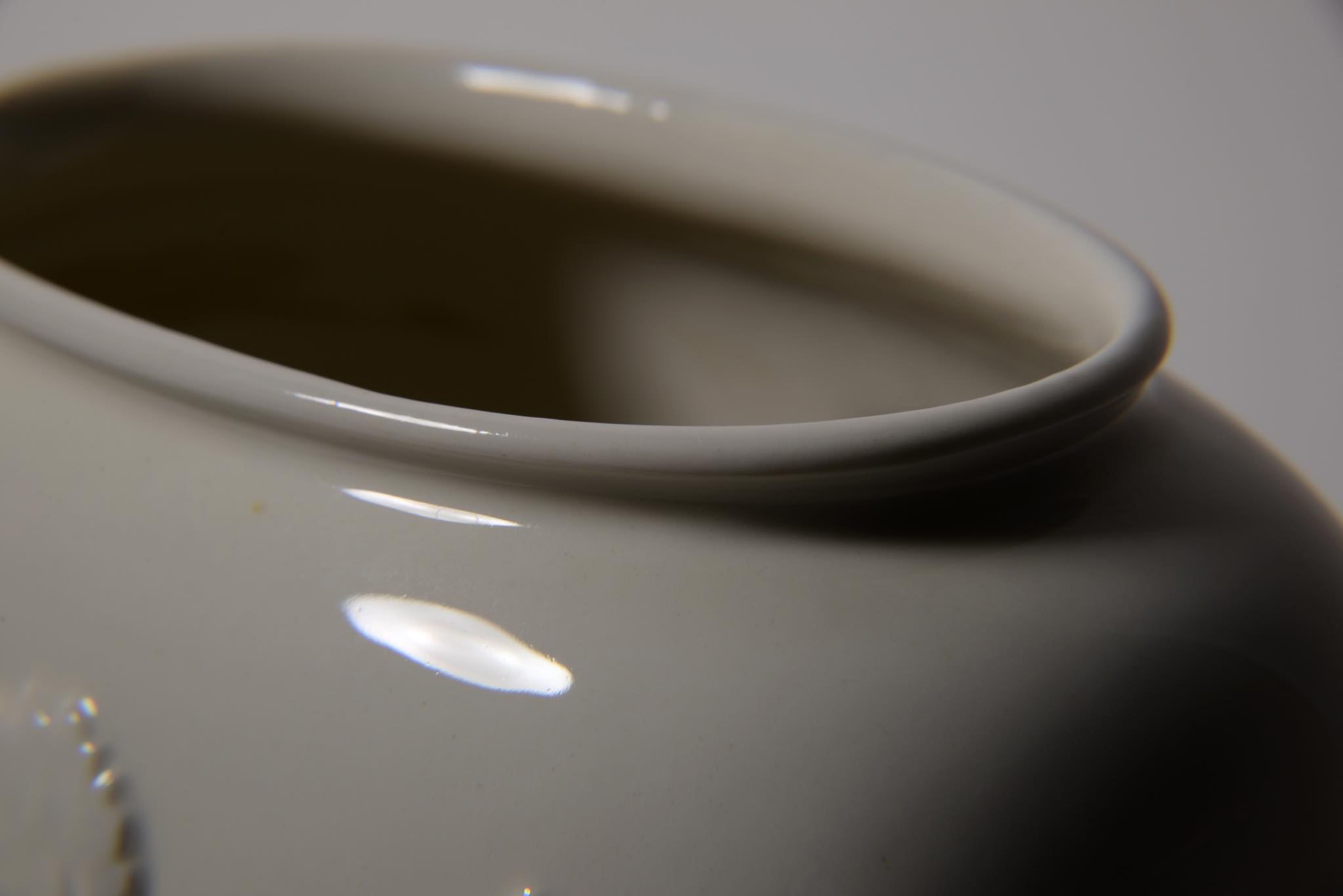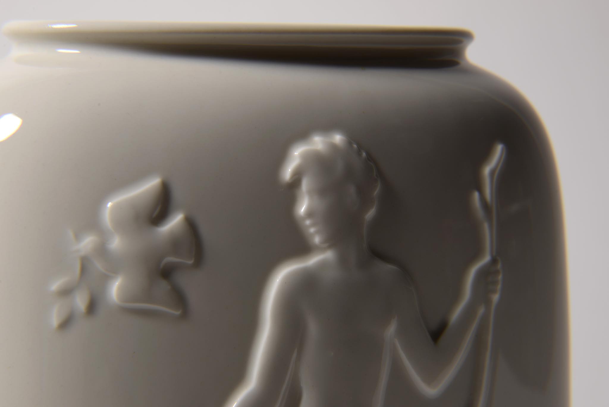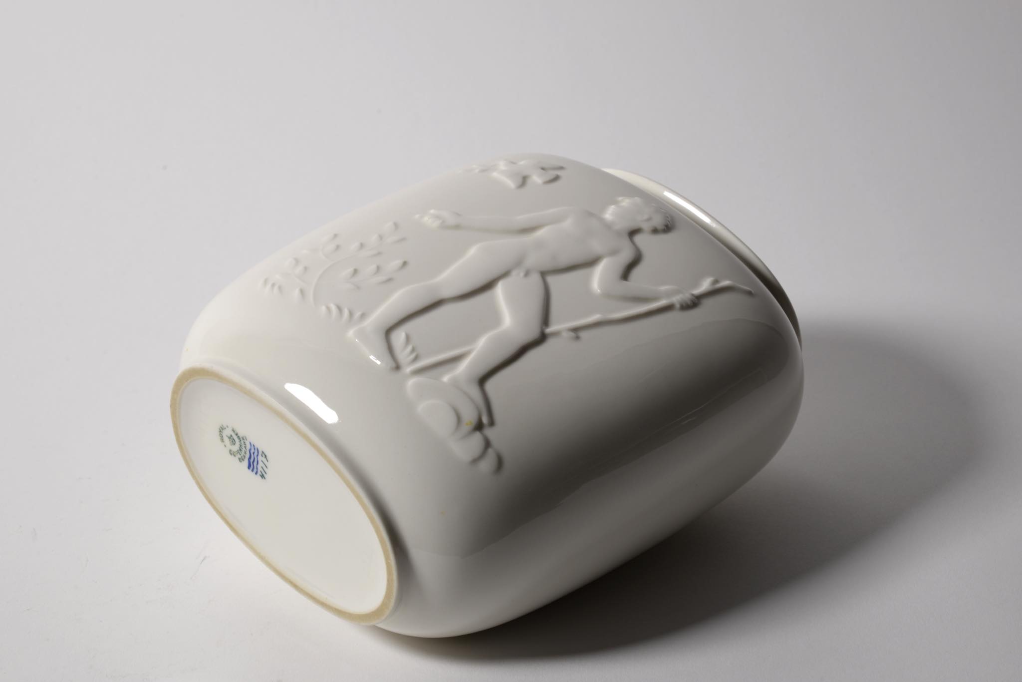 デンマークの陶芸家、Hans Henrik Hansen/ハンス・ヘンリック・ハンセンによる1944年発表のベースで、アダムとイヴのモチーフがレリーフ状に浮き彫りされています。柔らかな風合いが特長の Blanc de Chine/ブランドシーヌ(絵付けや彩色のされていないアイボリーの白磁)と呼ばれる濁手のような陶土で作られており、こちらは後年の1961年に焼成されたものです。