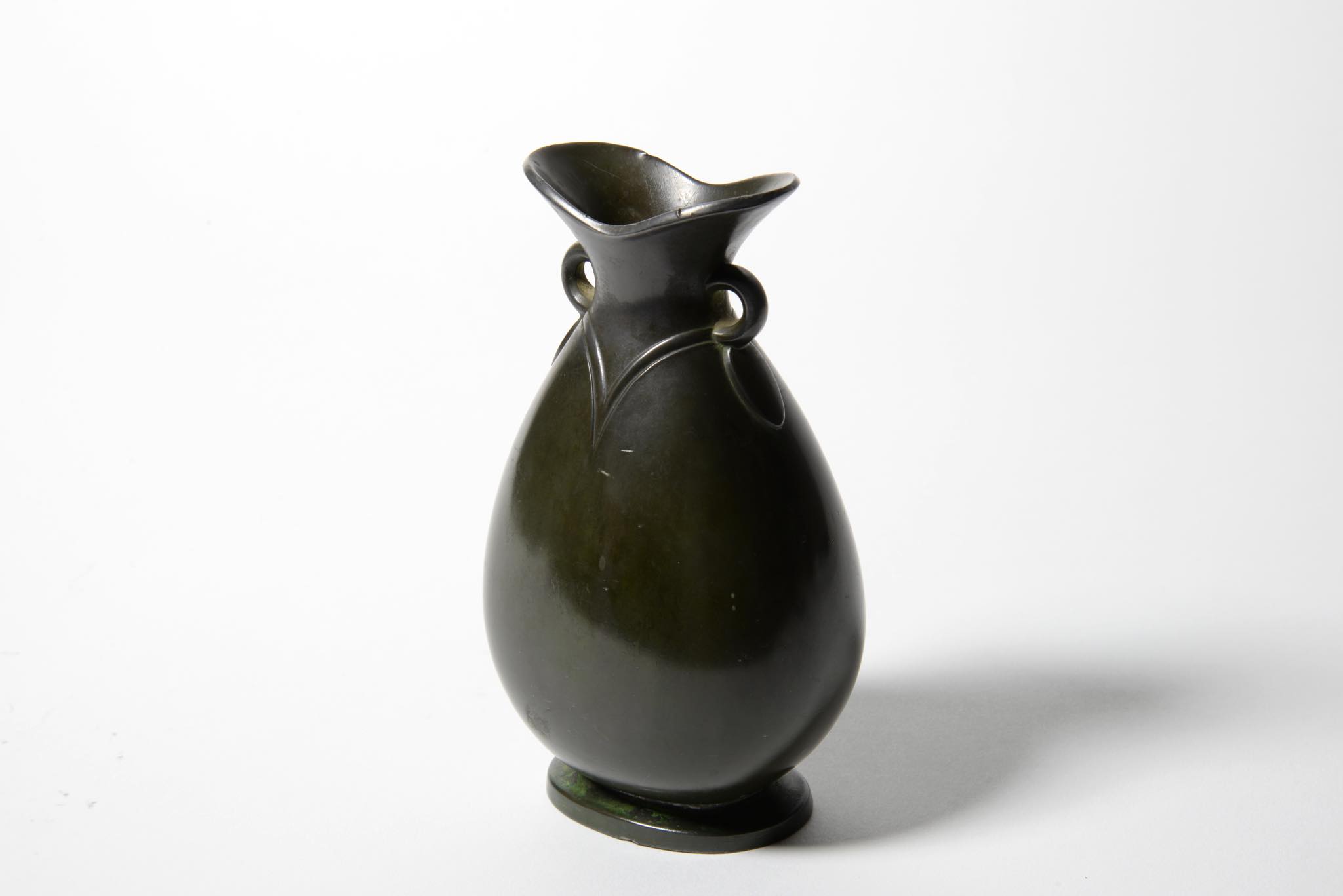 デンマークの金工家、Just Andersen/ユスト・アナセンによるディスコメタル製、アールデコ様式のベースです。口の窄まったかたちは一輪挿しに便利でしょう。ディスコメタル特有の柔らかな質感故の表面的な擦り傷は否めませんが、鑑賞には十分堪えるでしょう。