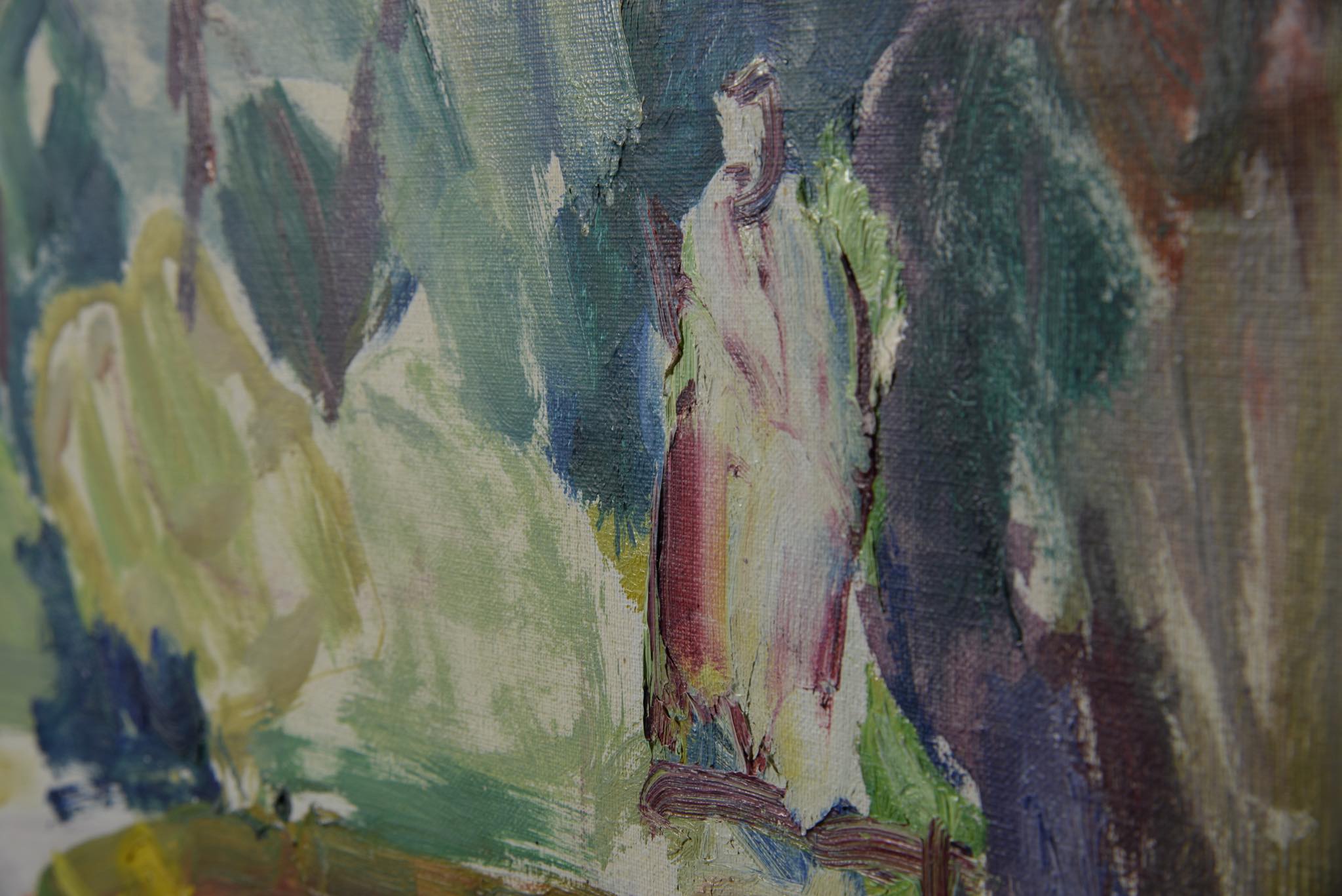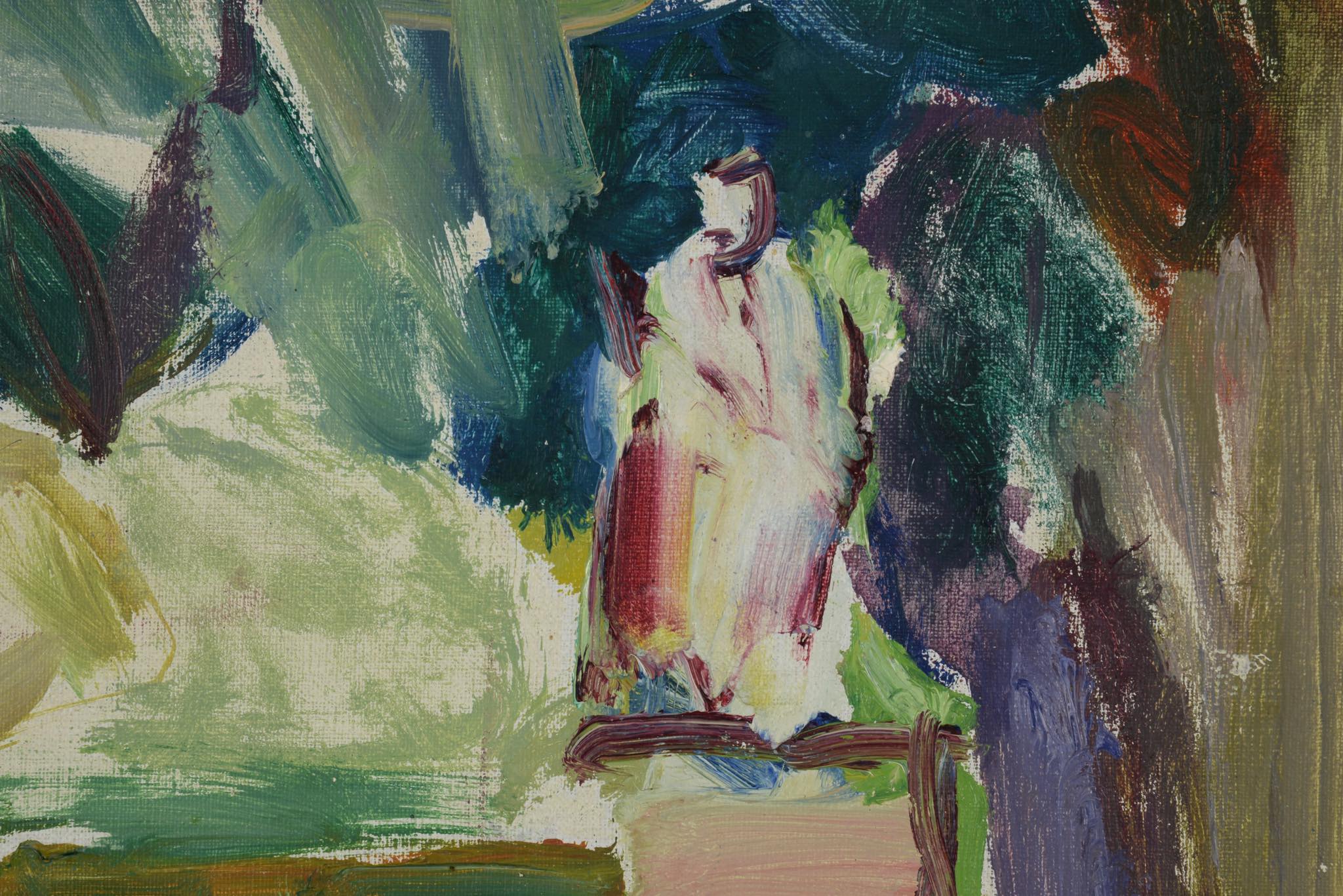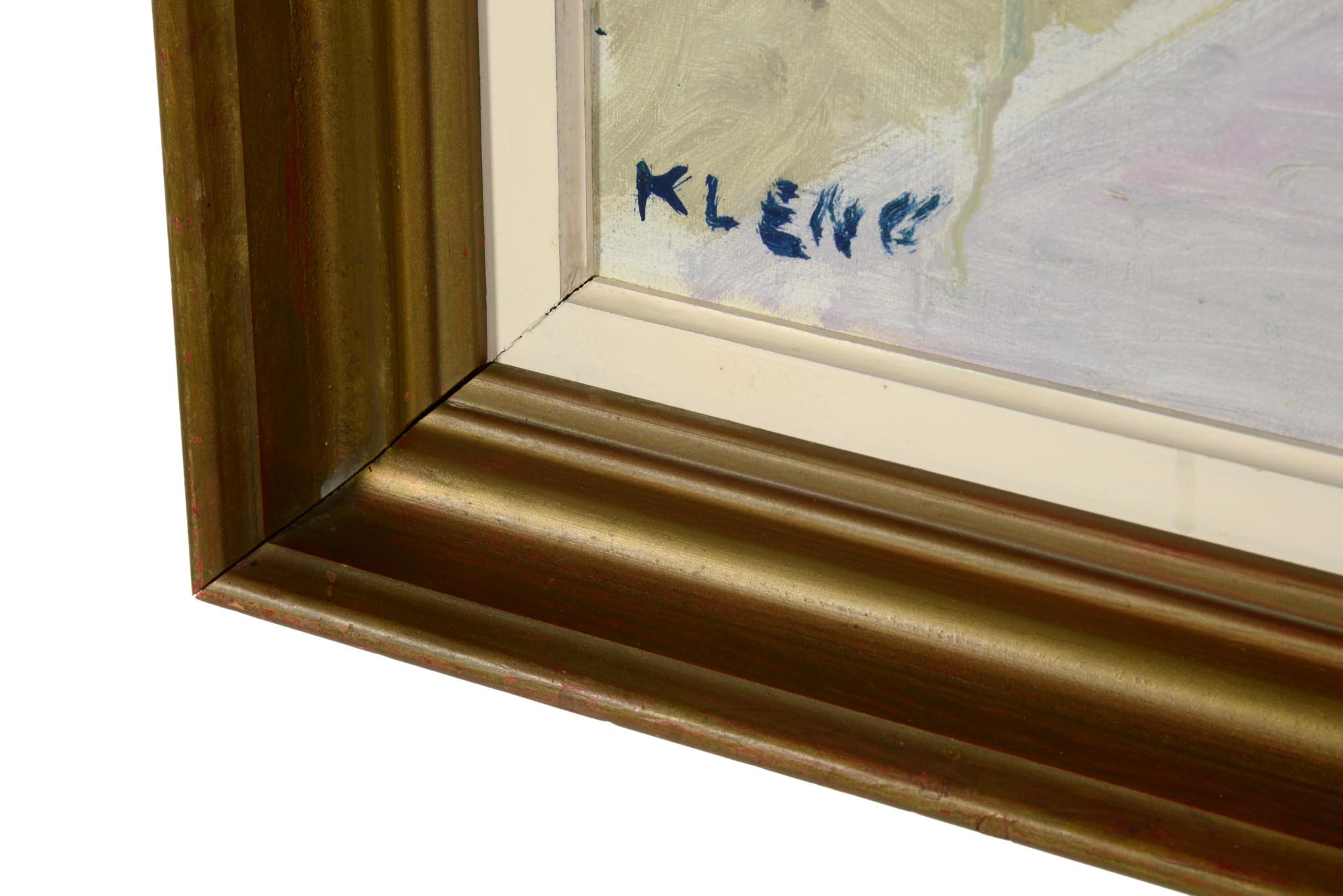 ロシア系デンマーク人で色彩画家のEvgenij Klenø/エヴゲニー・クレノによって描かれた油彩作品で、公園の風景が独特の筆致で描かれています。フレームはオリジナルで接合部分に若干の隙間が見られますが、しっかりしており差し迫った不安はありません。