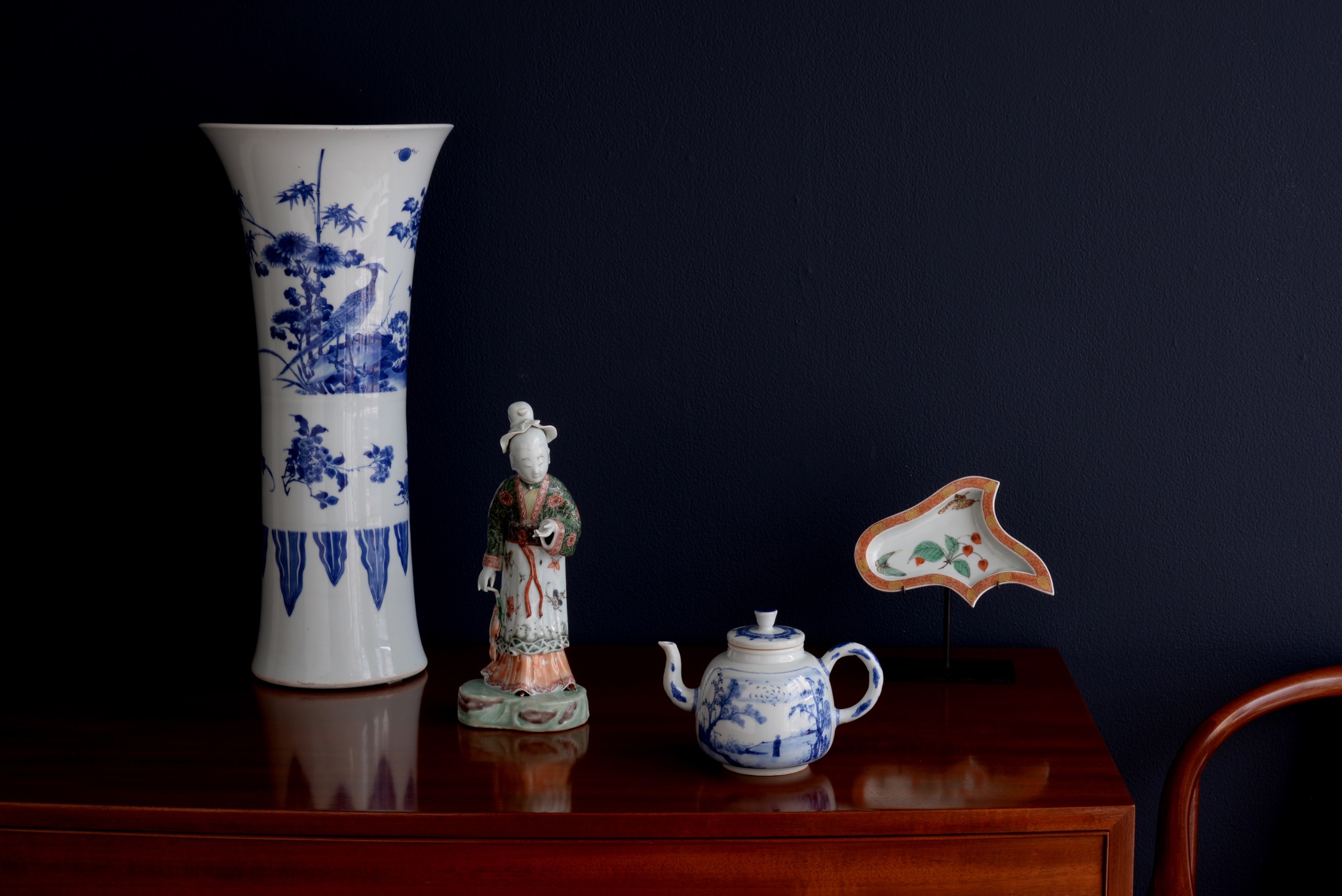 中国清王朝時代に作られた珠玉の古陶磁と、クラシックなテイストのデンマーク家具とのコラボレーション展示を行います。銀座6丁目に店を構え、中国古陶磁を専門に扱う西川さんは、逸品が現れるとそのひとつのためだけにヨーロッパでもどこへでも買い付けへ出かけます。その情熱によって集められた品々は、鮮やかに存在感を放ちながら静かに鎮座します。かつてのデンマークは中国からの工芸品を数多く輸入していた時代もあり、デンマーク人にとって中国様式は馴染みのあるテイストでもあります。この度、クラシックでモダンなデンマーク家具と中国古陶磁との、時空を超えて響き合うコラボレーション展示販売会を開催します。是非お出かけください。