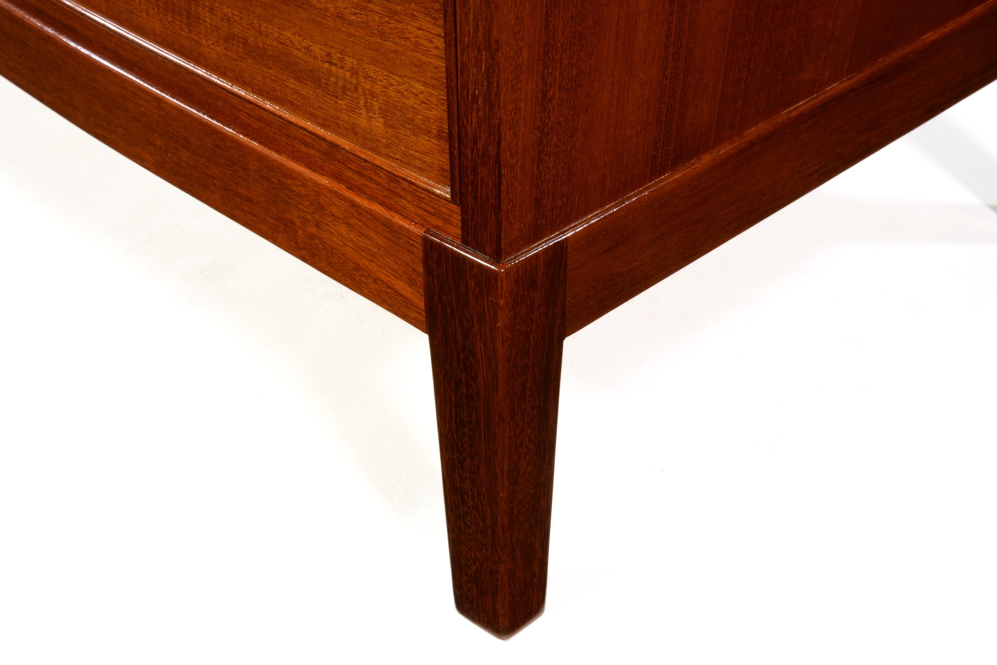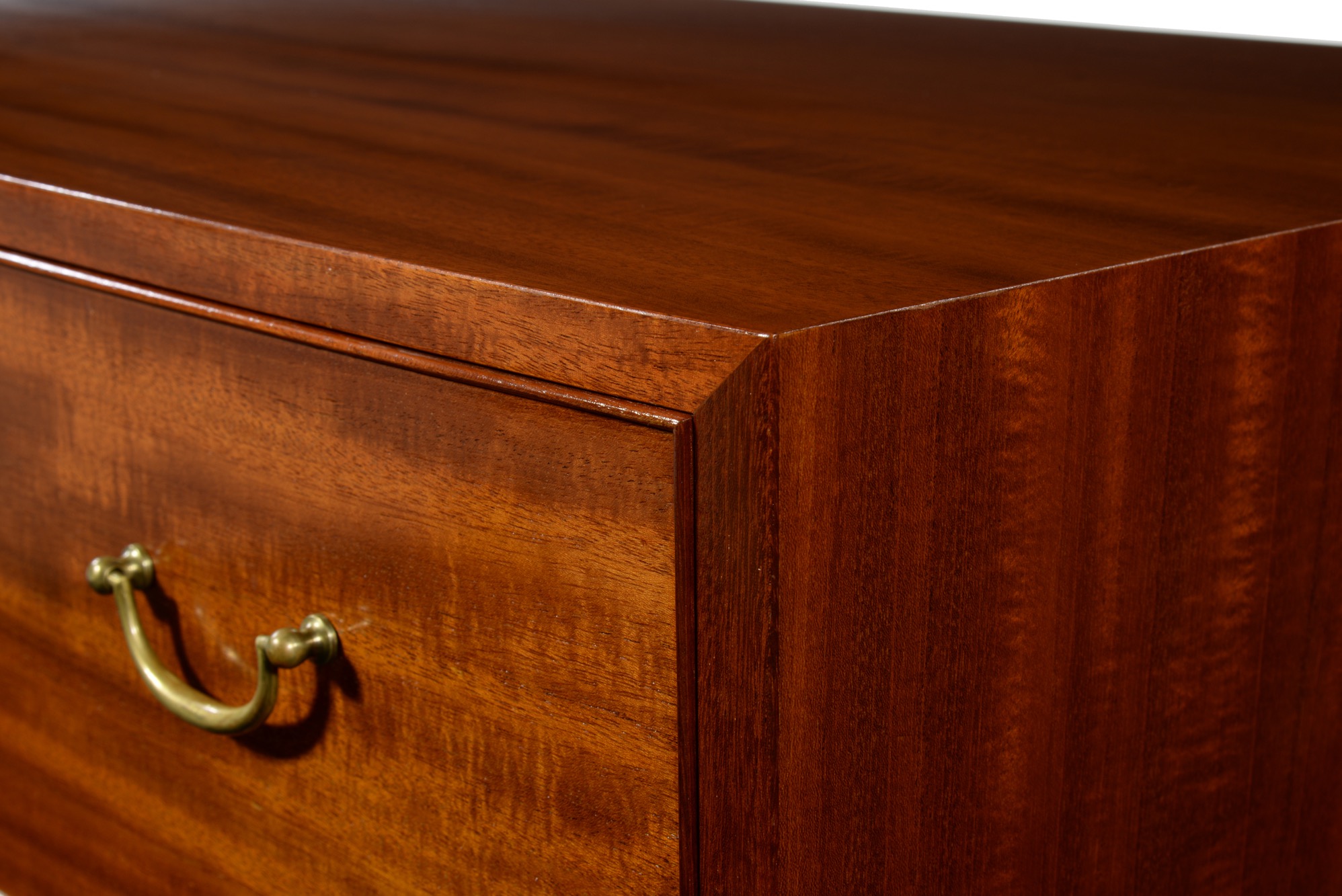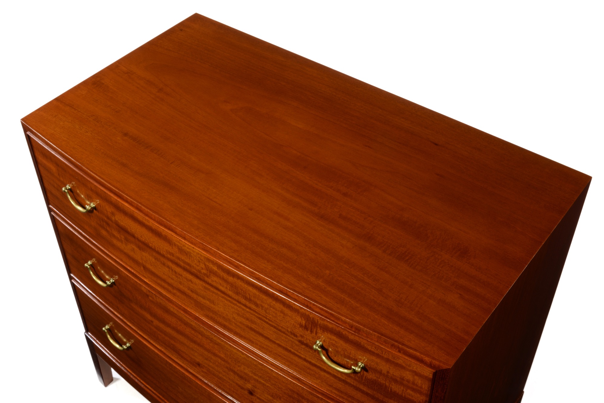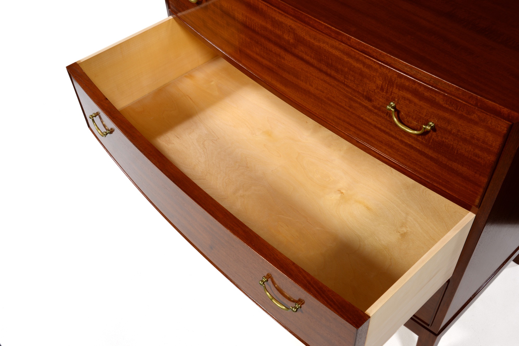 オーレ・ヴァンシャーによるボウフロントチェスト、名工 A.J.イヴァーセンによるものです。1965年に製作されたもので、ホンジュラス産と思しきリボン杢の現れた良質な材が使われています。ハンドルは真鍮製、前面が弓なり(Bow front)に象られた優雅な趣のチェストです。