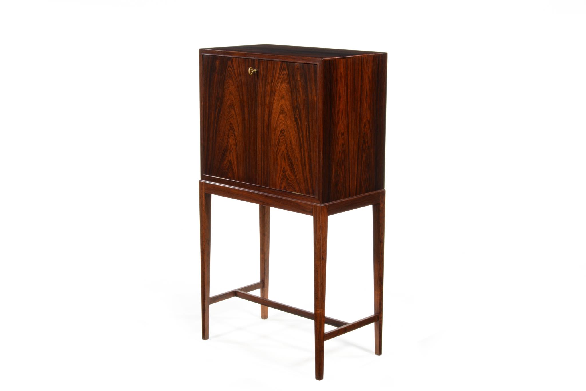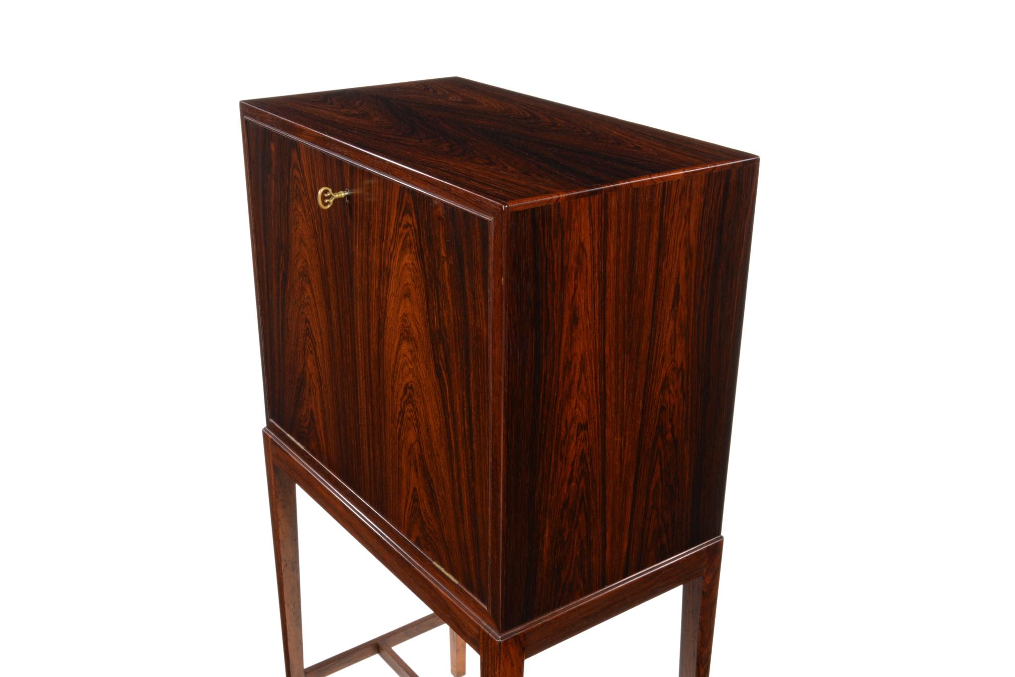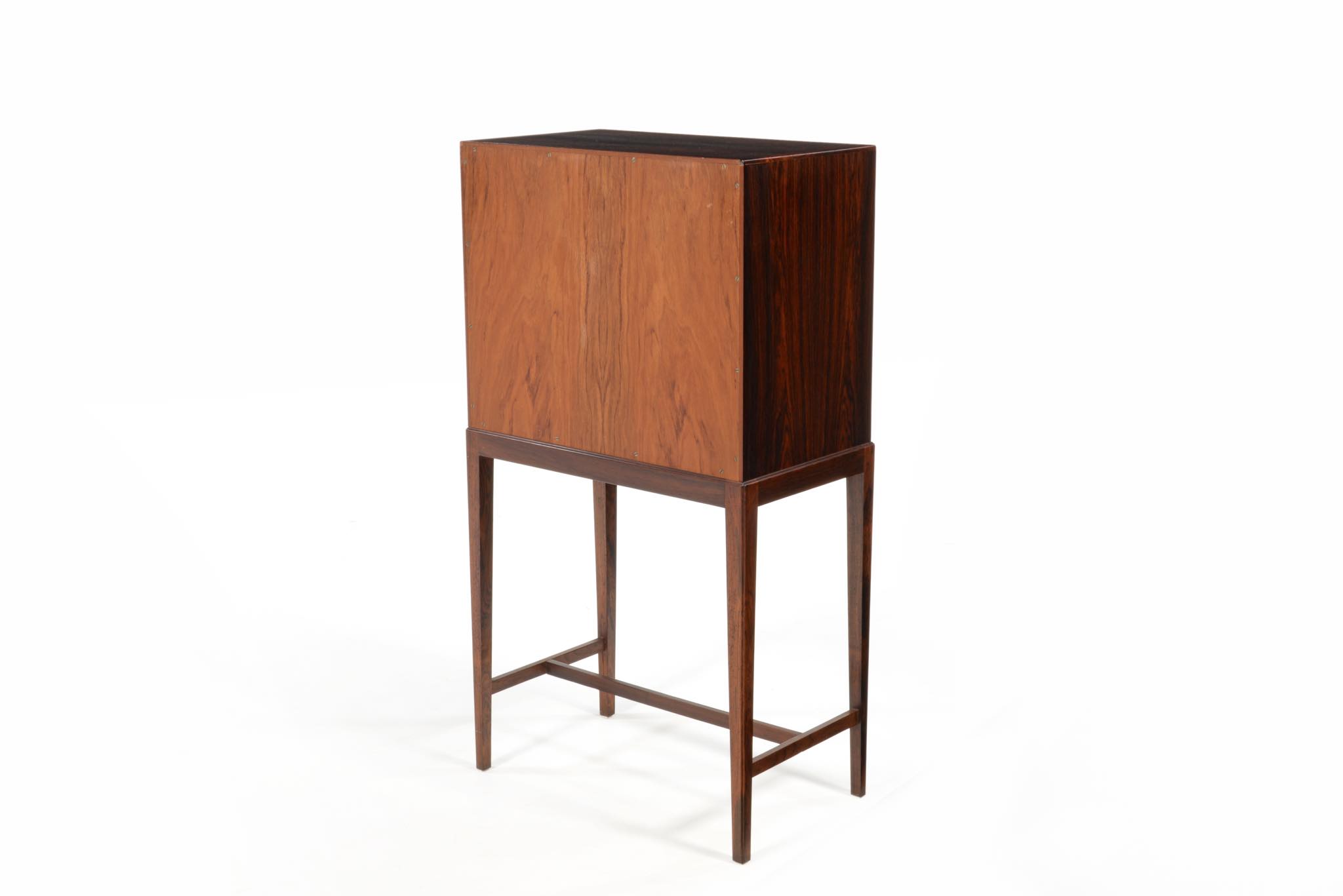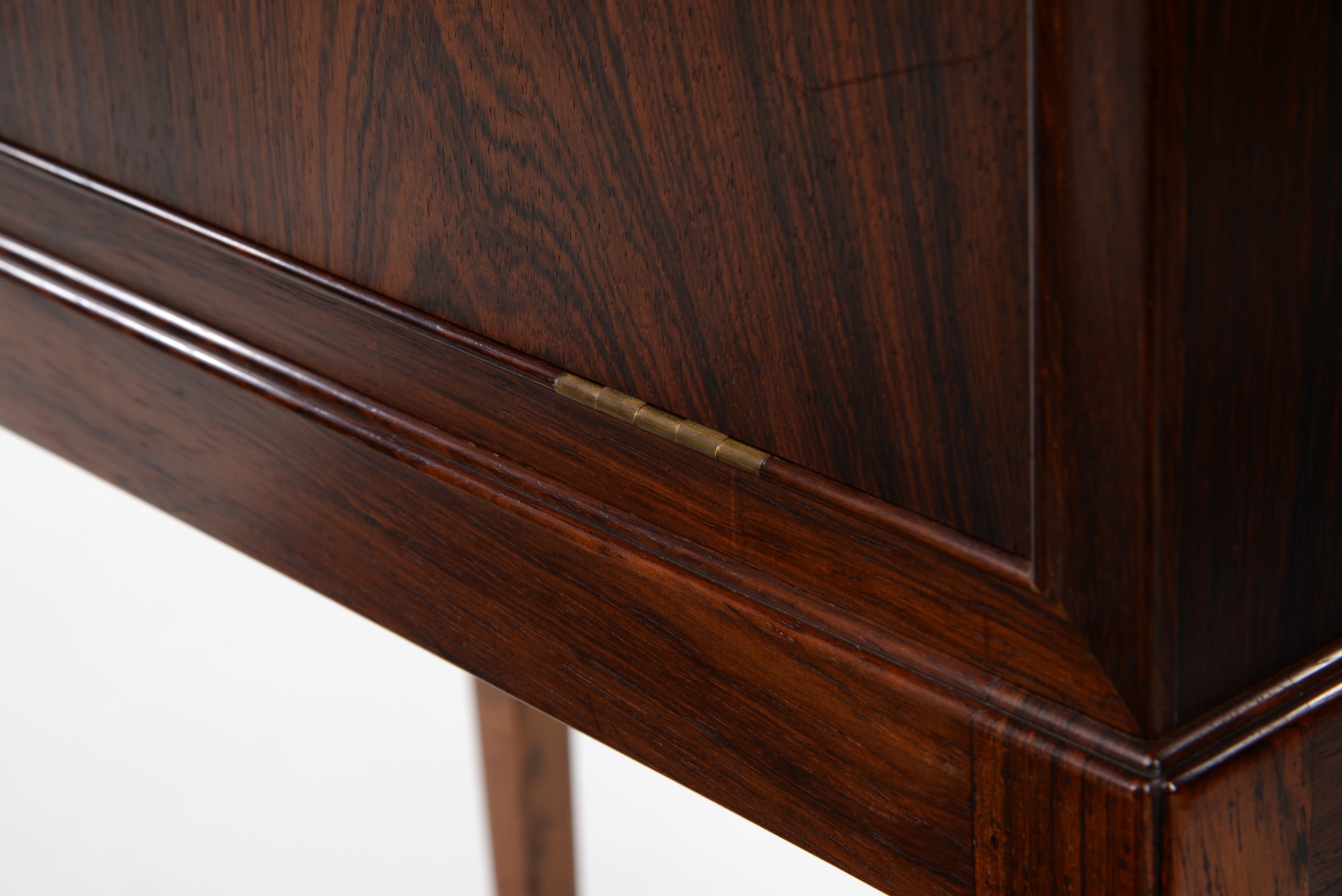 20世紀デンマーク家具デザイン界の礎を築いたデザイナー兼キャビネットメーカーのFrits Henningsen/フリッツ・ヘニングセンによる小さなキャビネットです。具体的な用途はわかりません。ブラジル原産と思しき良質なローズウッド材を用いており、内部はマホガニー材が使われています。棚板は3枚付属し、位置を変えることができます。オリジナルのキーが備わり、コンディションは良好です。
