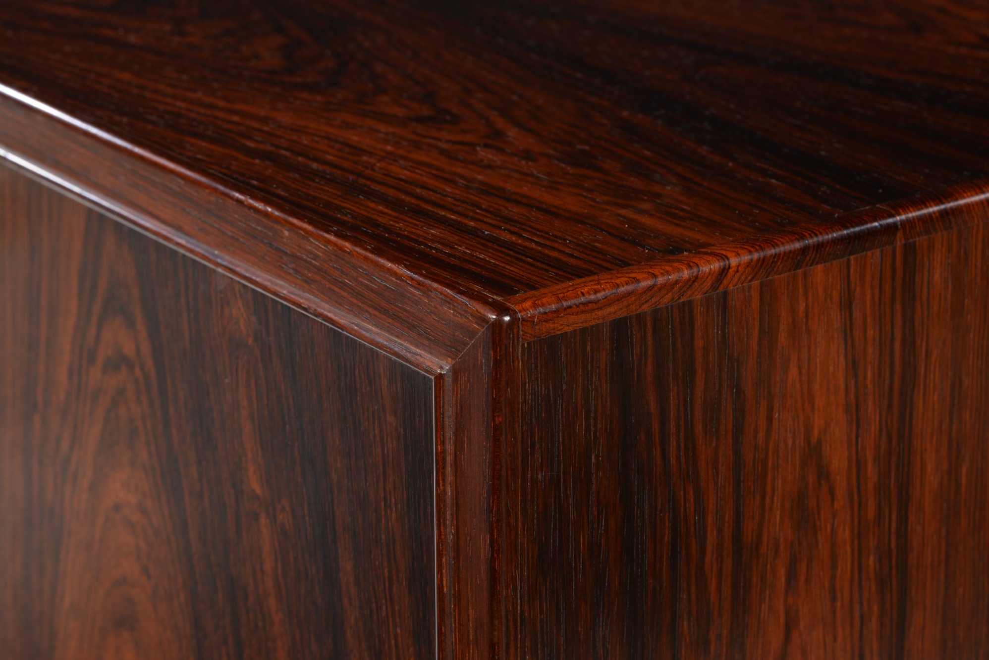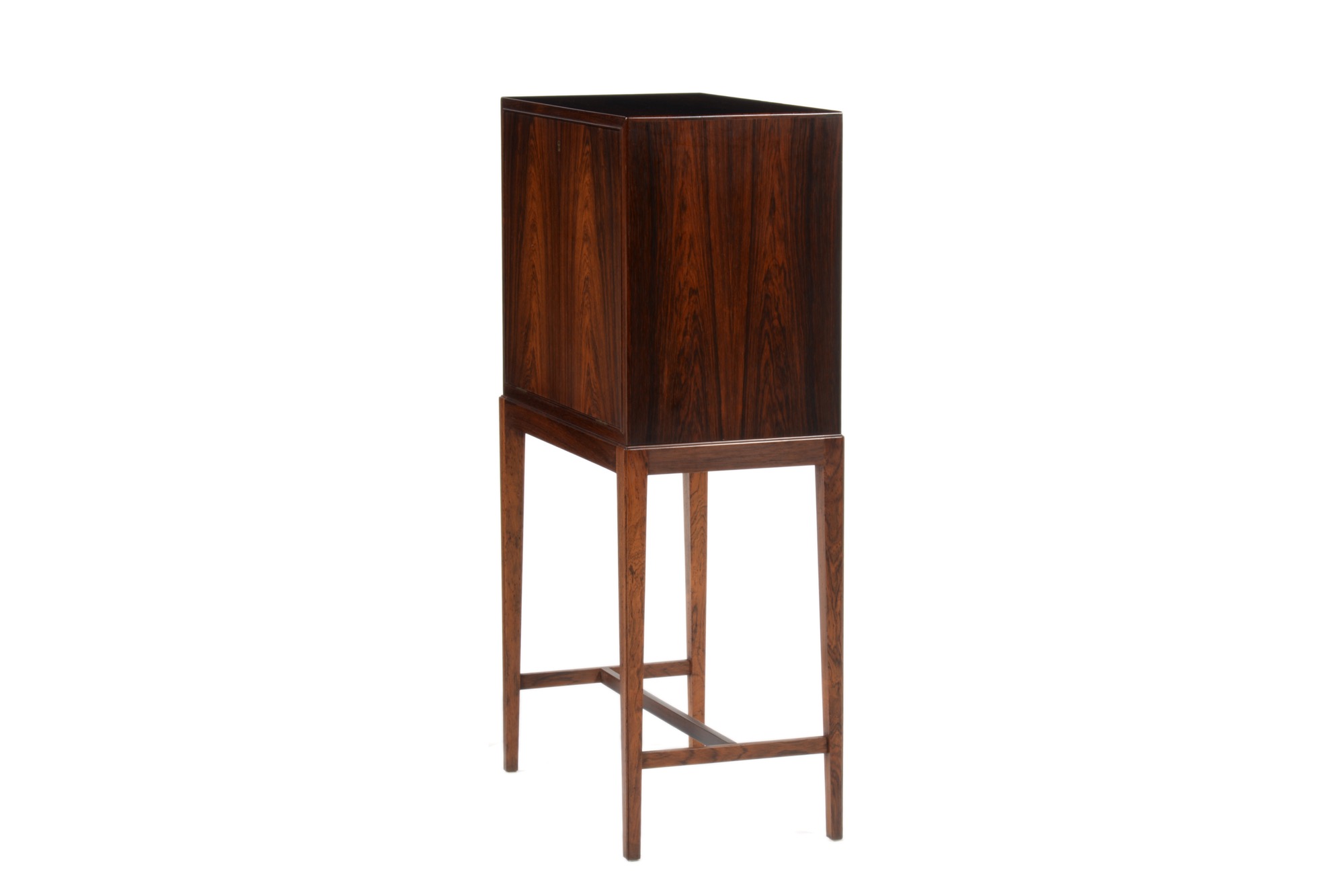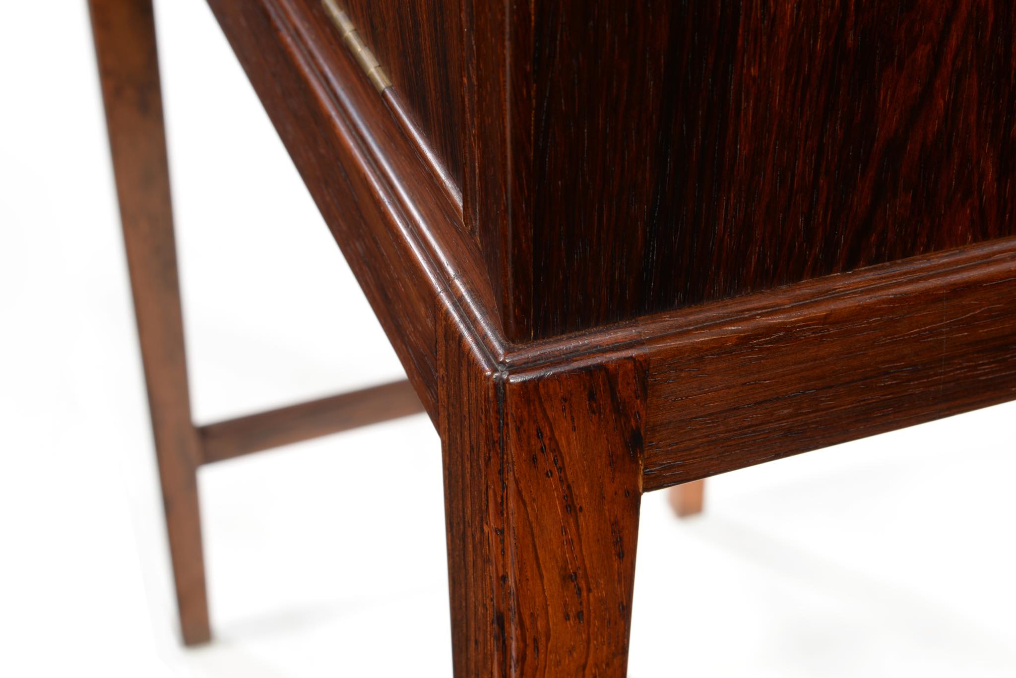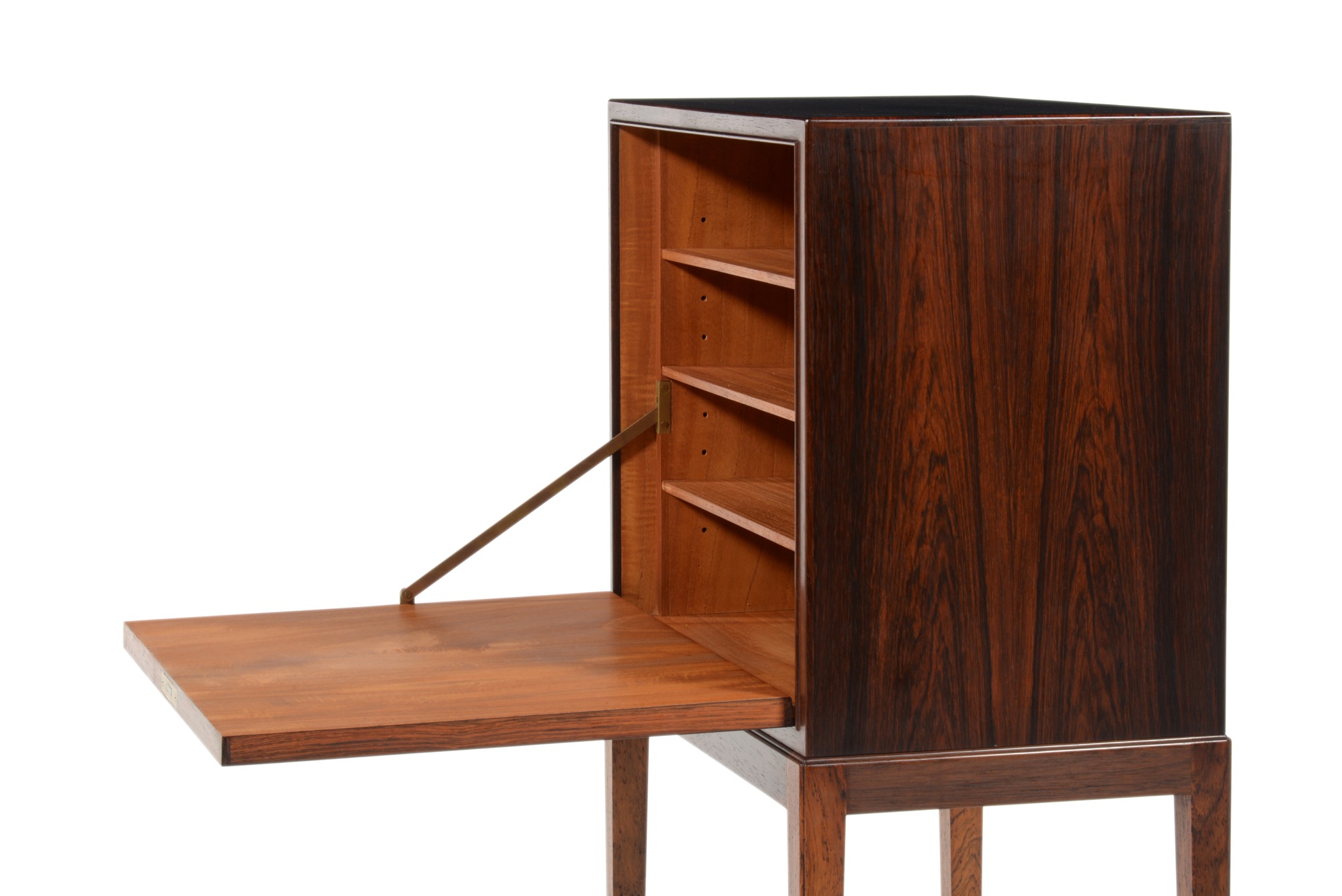 20世紀デンマーク家具デザイン界の礎を築いたデザイナー兼キャビネットメーカーのFrits Henningsen/フリッツ・ヘニングセンによる小さなキャビネットです。具体的な用途はわかりません。ブラジル原産と思しき良質なローズウッド材を用いており、内部はマホガニー材が使われています。棚板は3枚付属し、位置を変えることができます。オリジナルのキーが備わり、コンディションは良好です。
