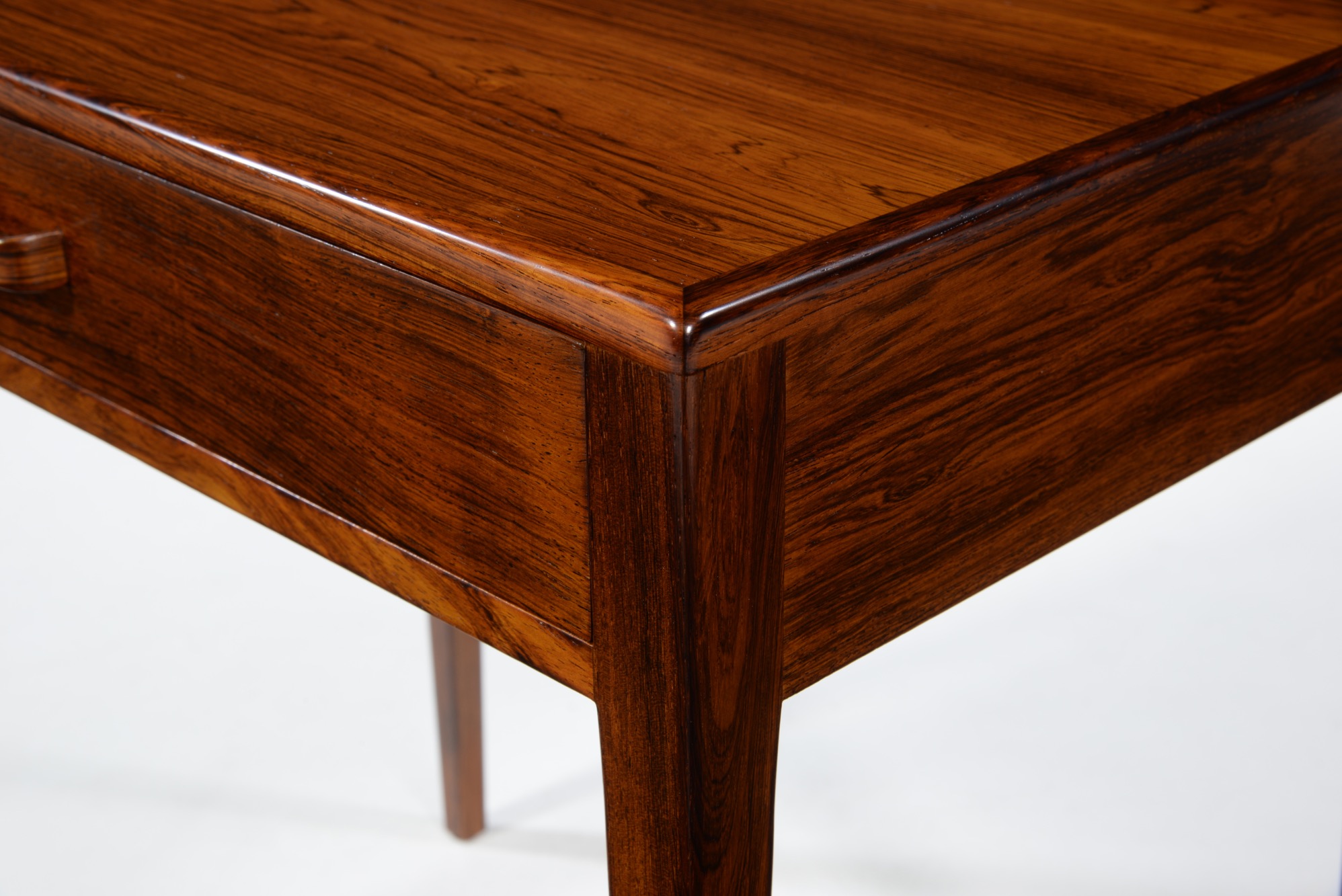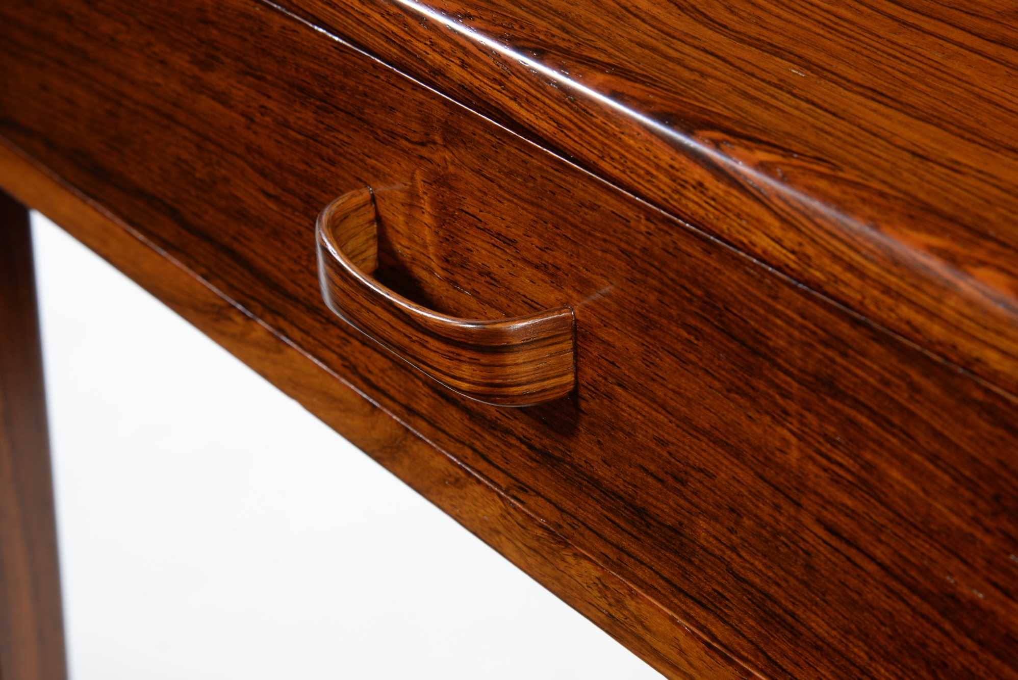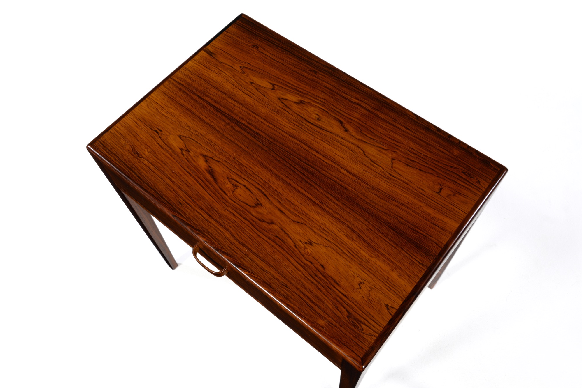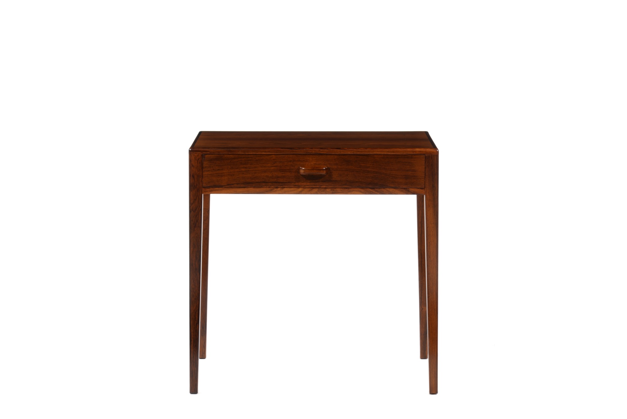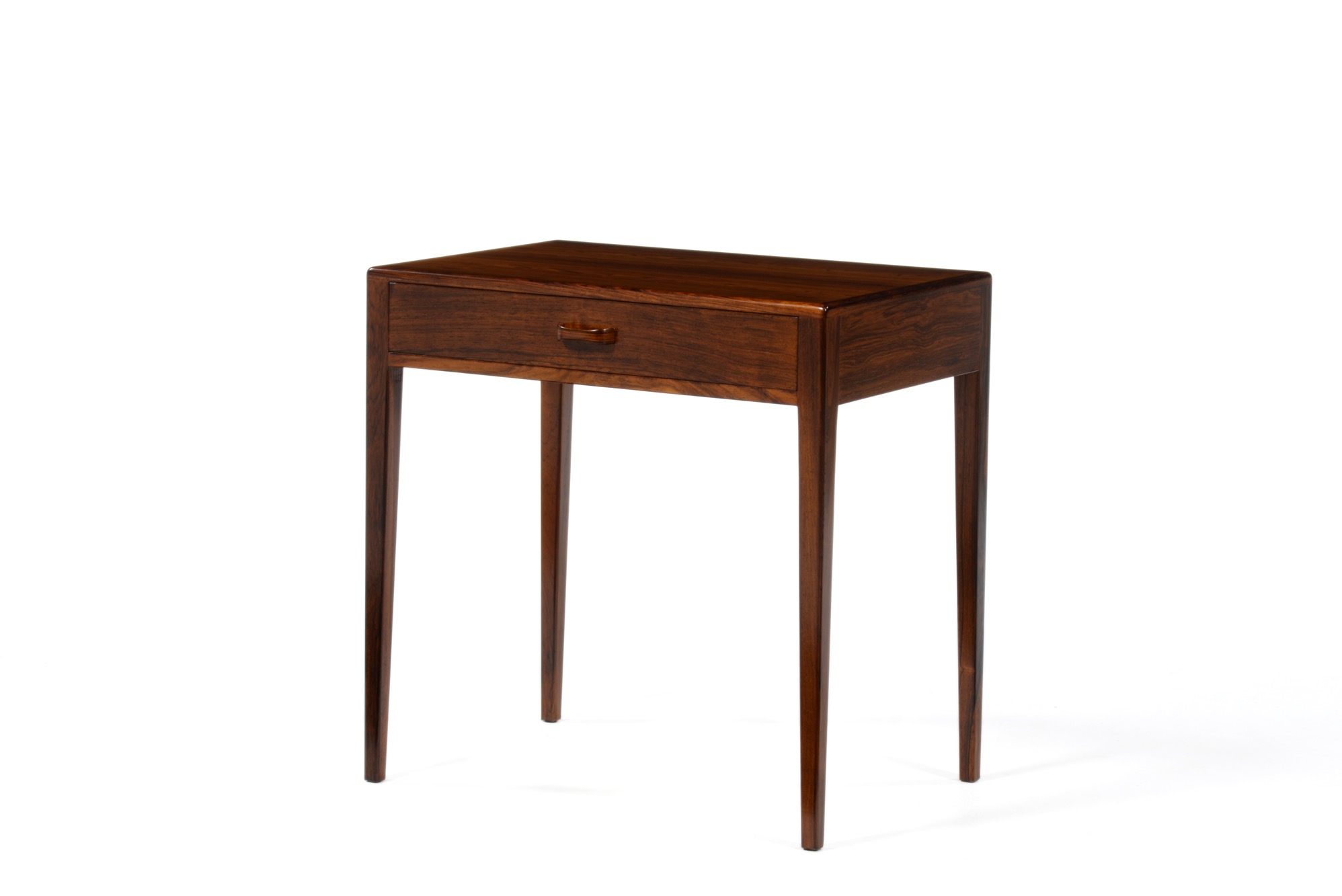 デンマークの家具デザイナー、Poul Hundevad/ポール・フンネヴァッドによる抽斗付きのサイドテーブルです。薄く削ったローズウッドを曲げた引手はとても繊細に作られています。