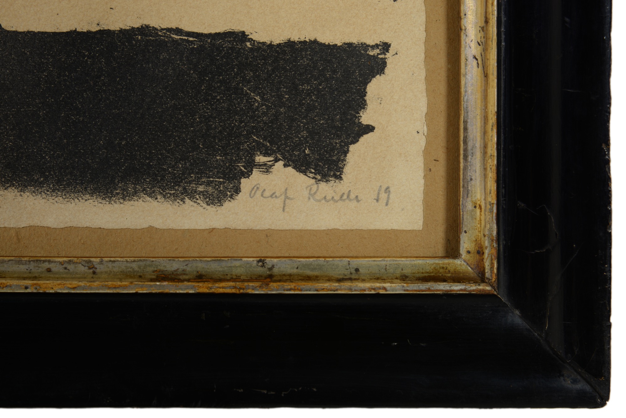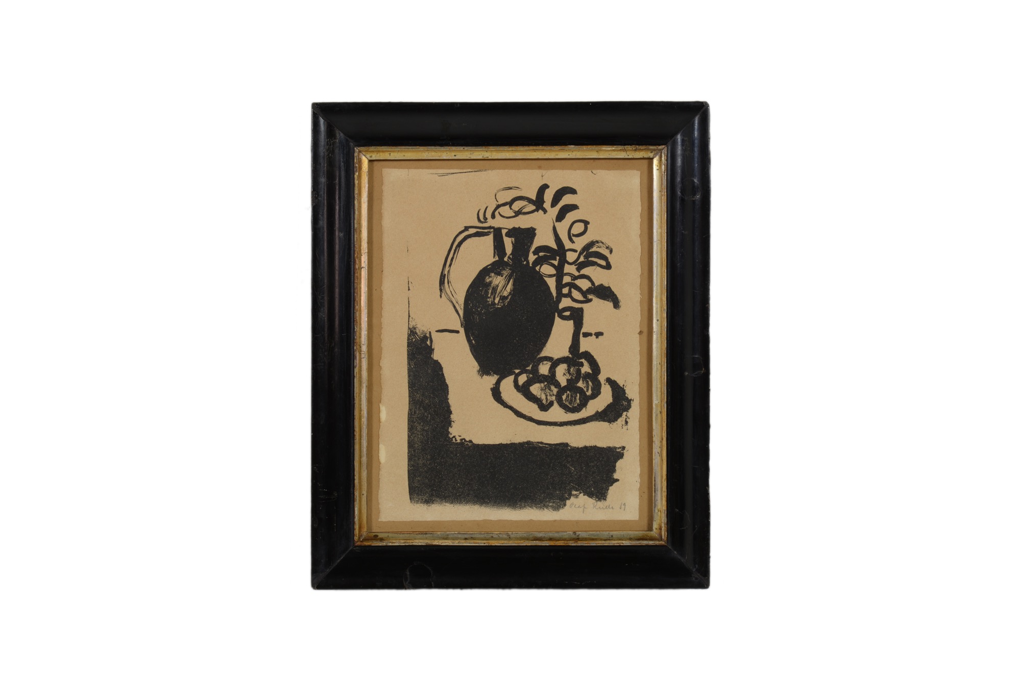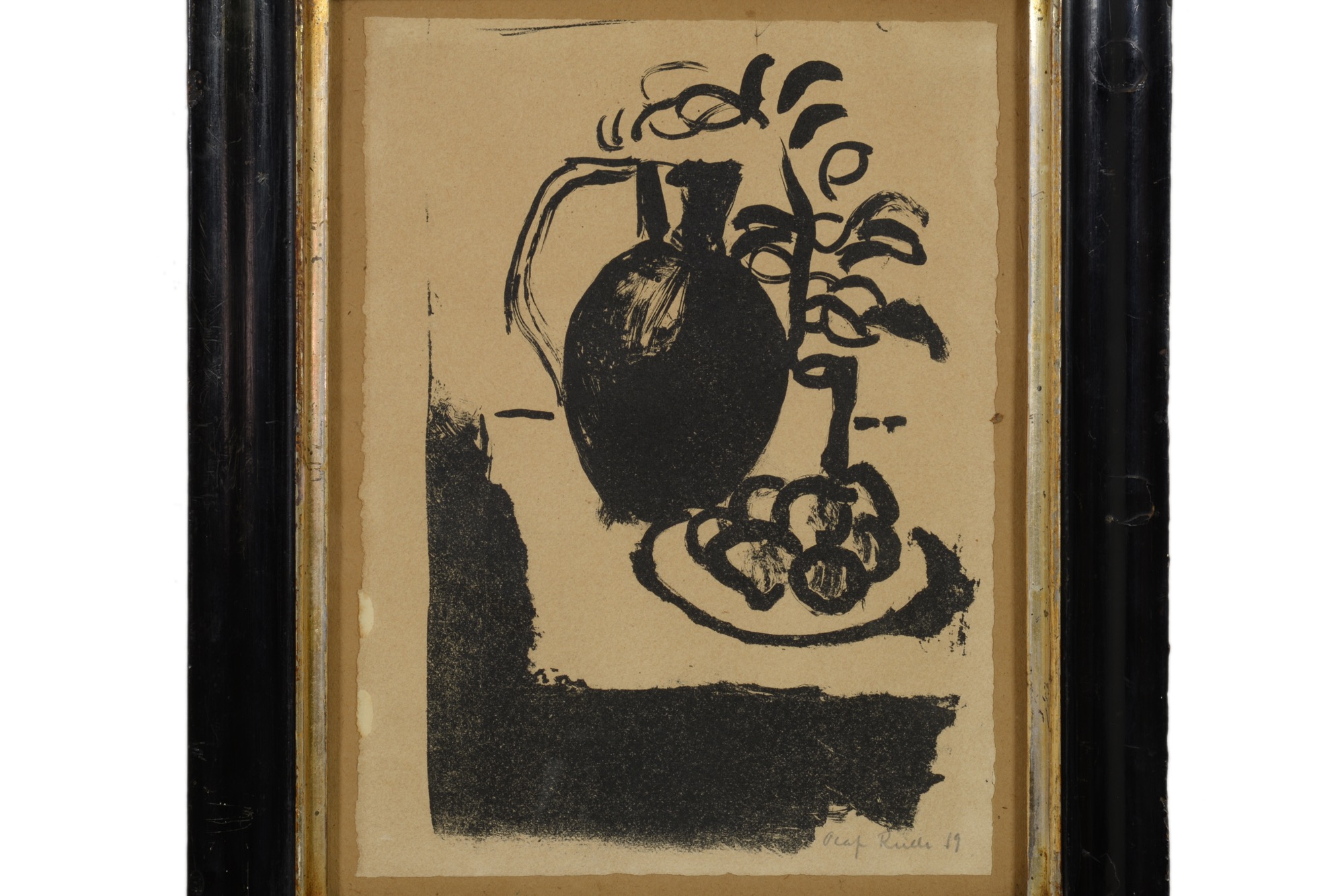 エストニア出身、デンマークの巨匠、Olaf Rude/オラフ・ルードによる静物画リトグラフ作品、氏がボーンホルム島へ渡った1919年に制作されたものです。オリジナルと思しきフレームはそのままに、裏板を外しクリーニングを行いました。